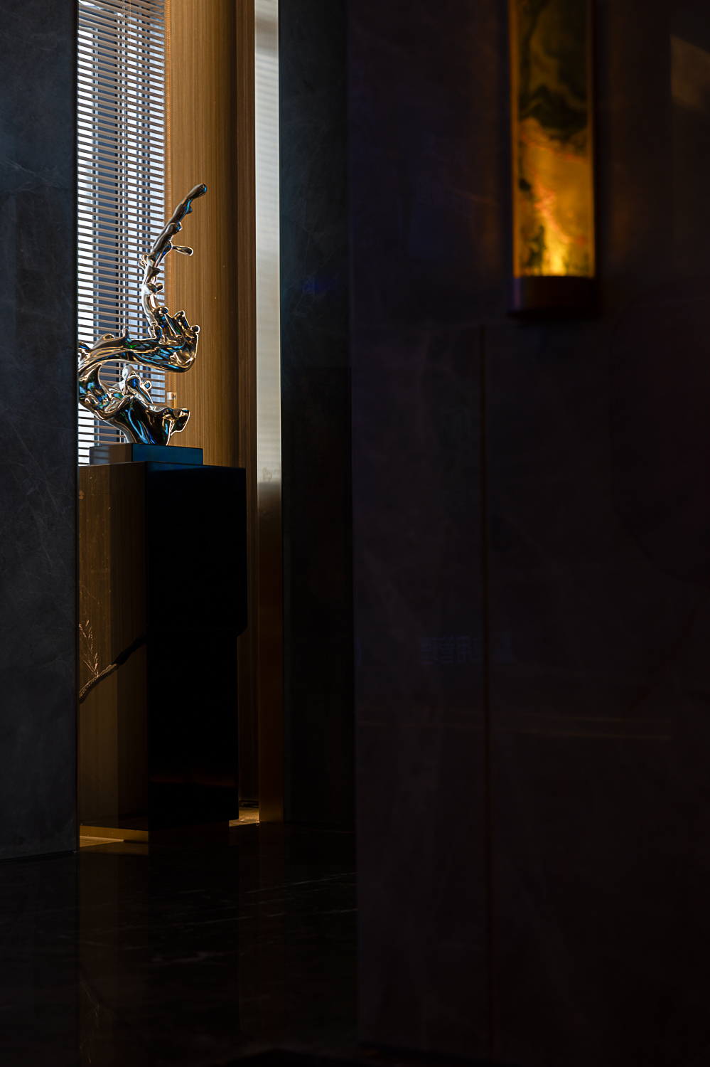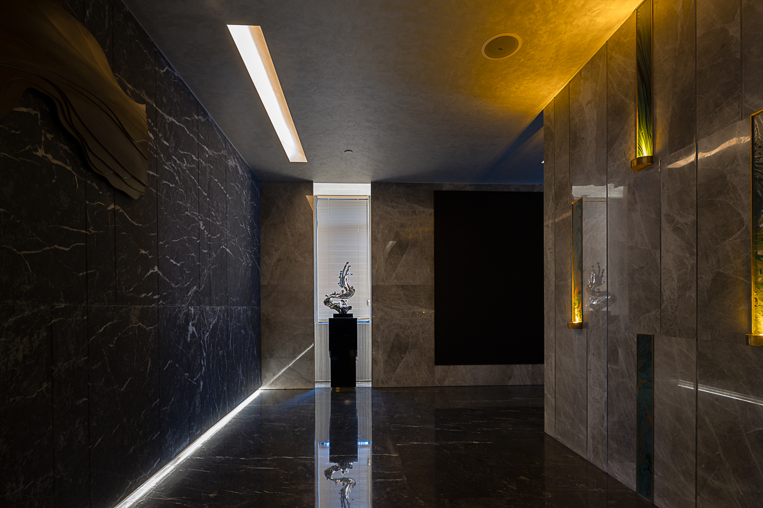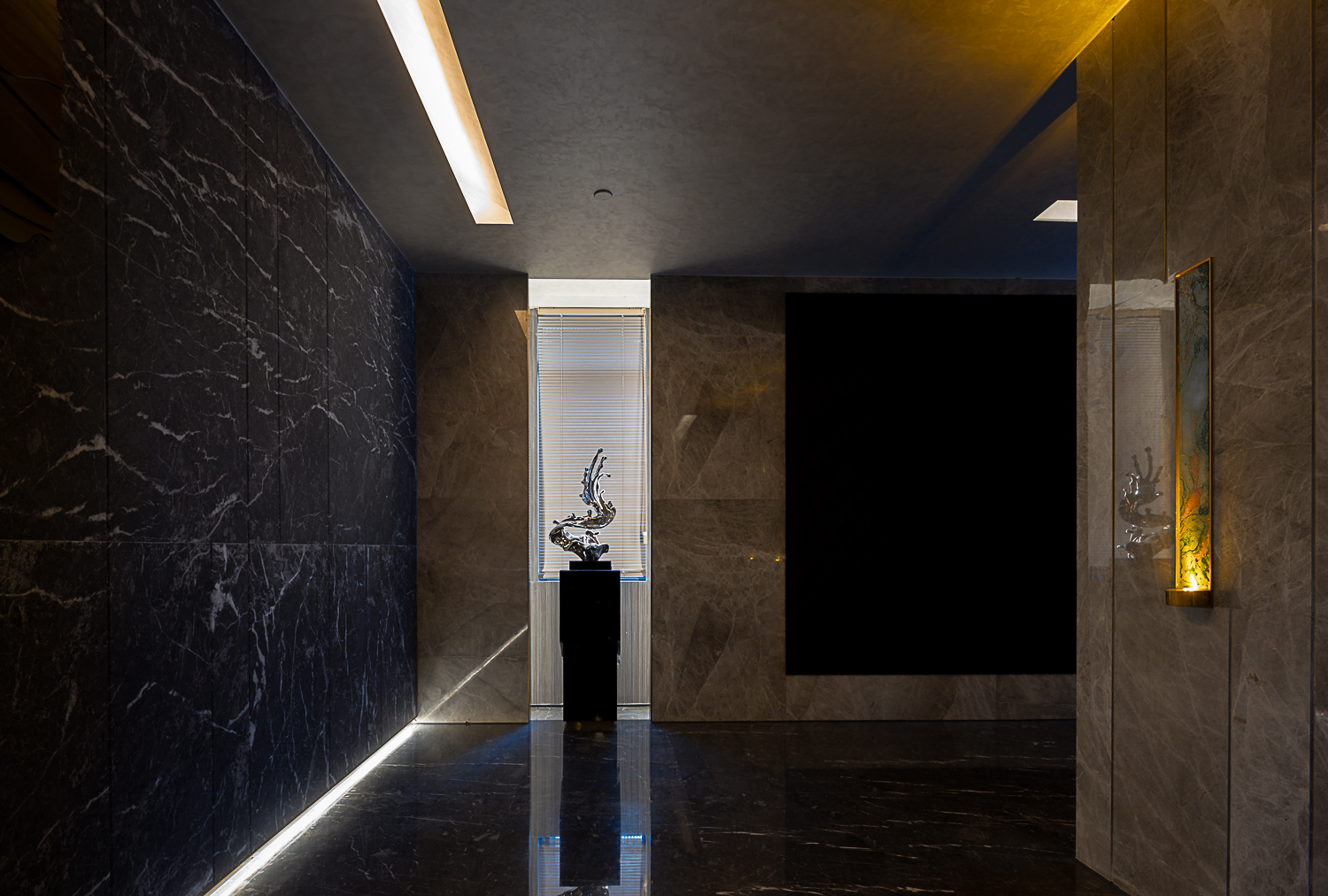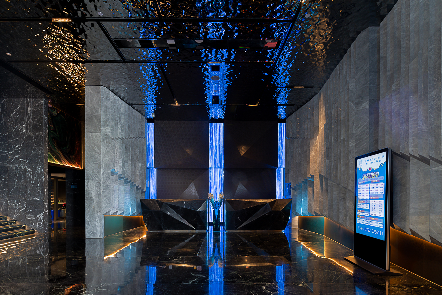 空间意境:挑高的接待大堂,石材分割的大理石墙面,水波纹天花映射墙面的LED屏。整个空间灵动奢华,加上双峰造型的背景墙以及呼应的休闲区皮革石材墙面,项目的高级感不言而喻!