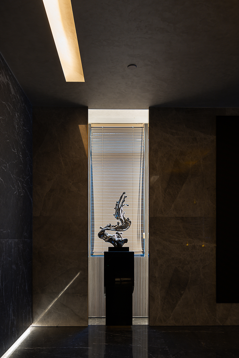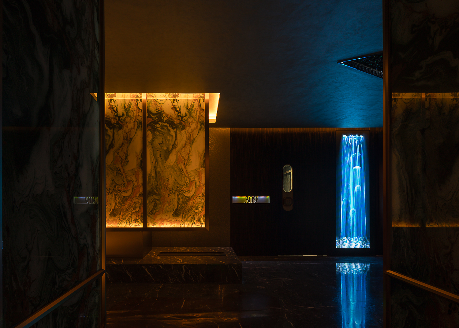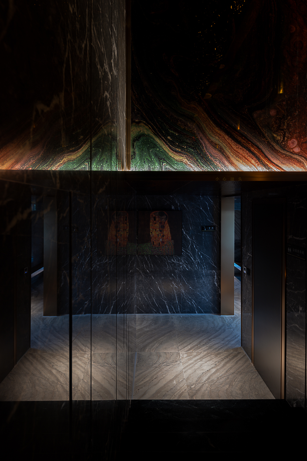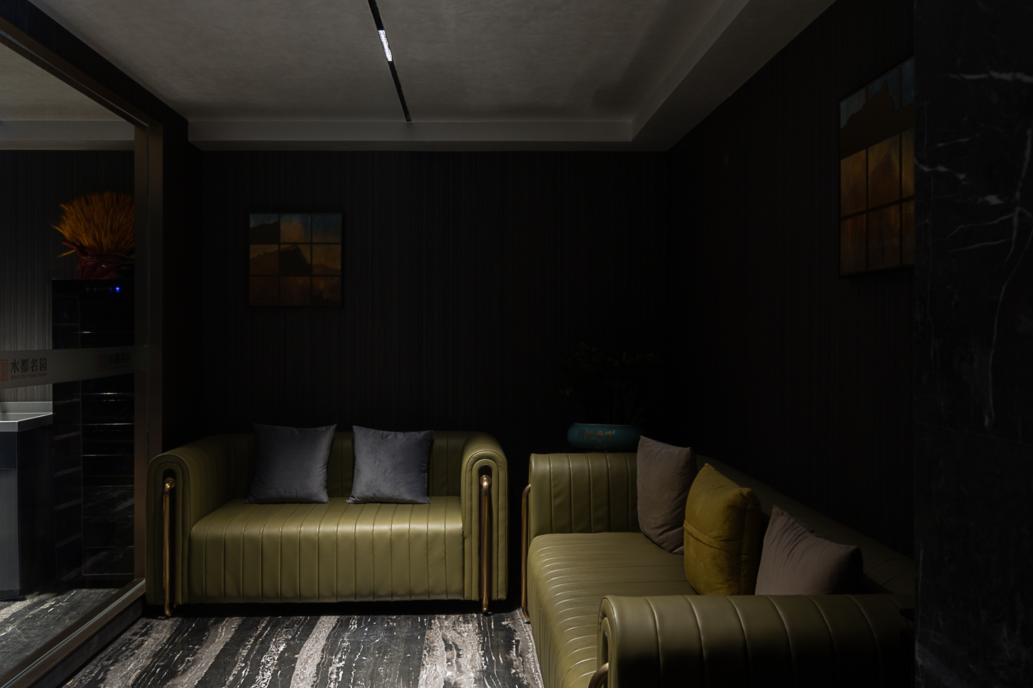 空间意境:挑高的接待大堂,石材分割的大理石墙面,水波纹天花映射墙面的LED屏。整个空间灵动奢华,加上双峰造型的背景墙以及呼应的休闲区皮革石材墙面,项目的高级感不言而喻!