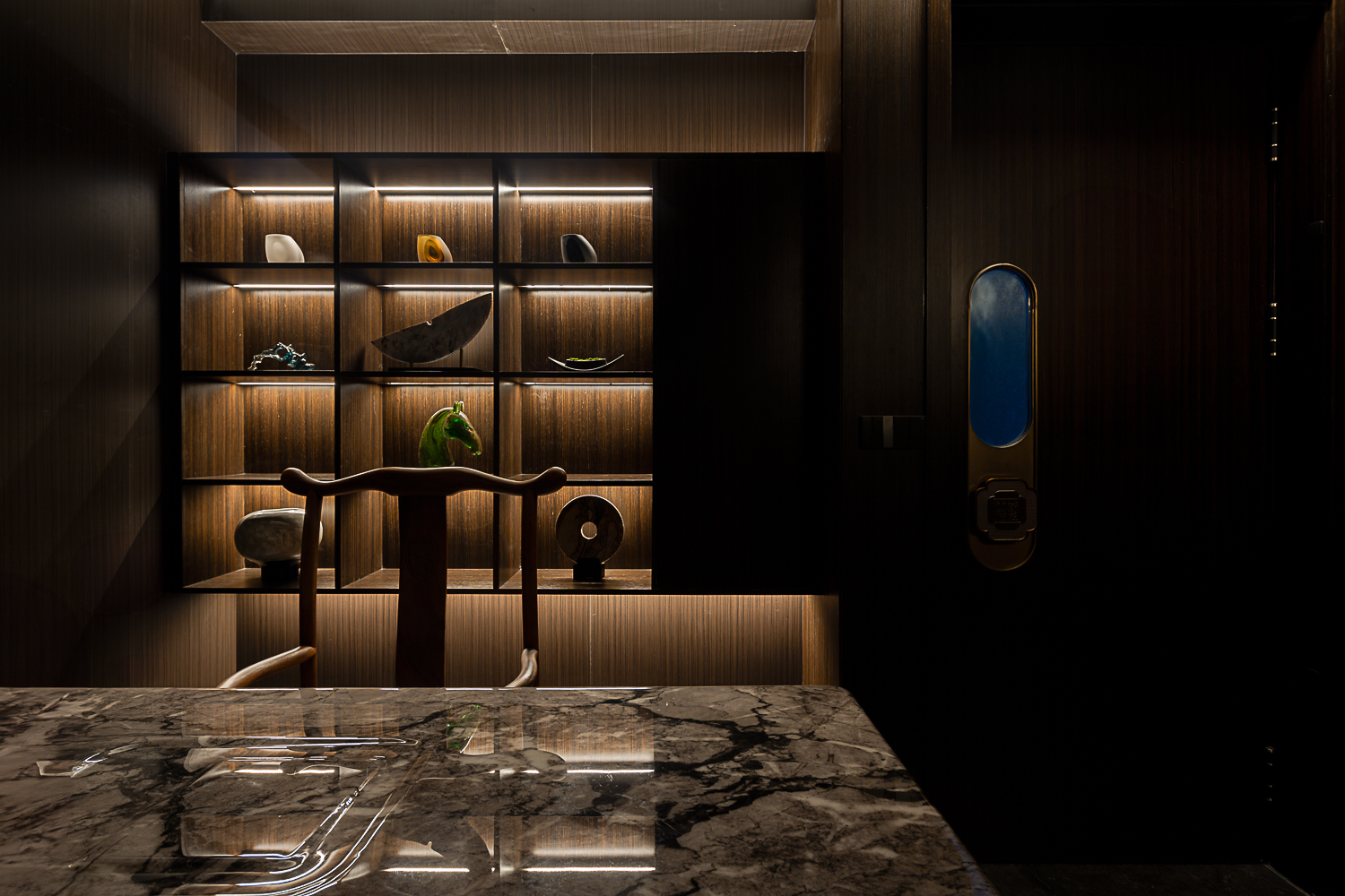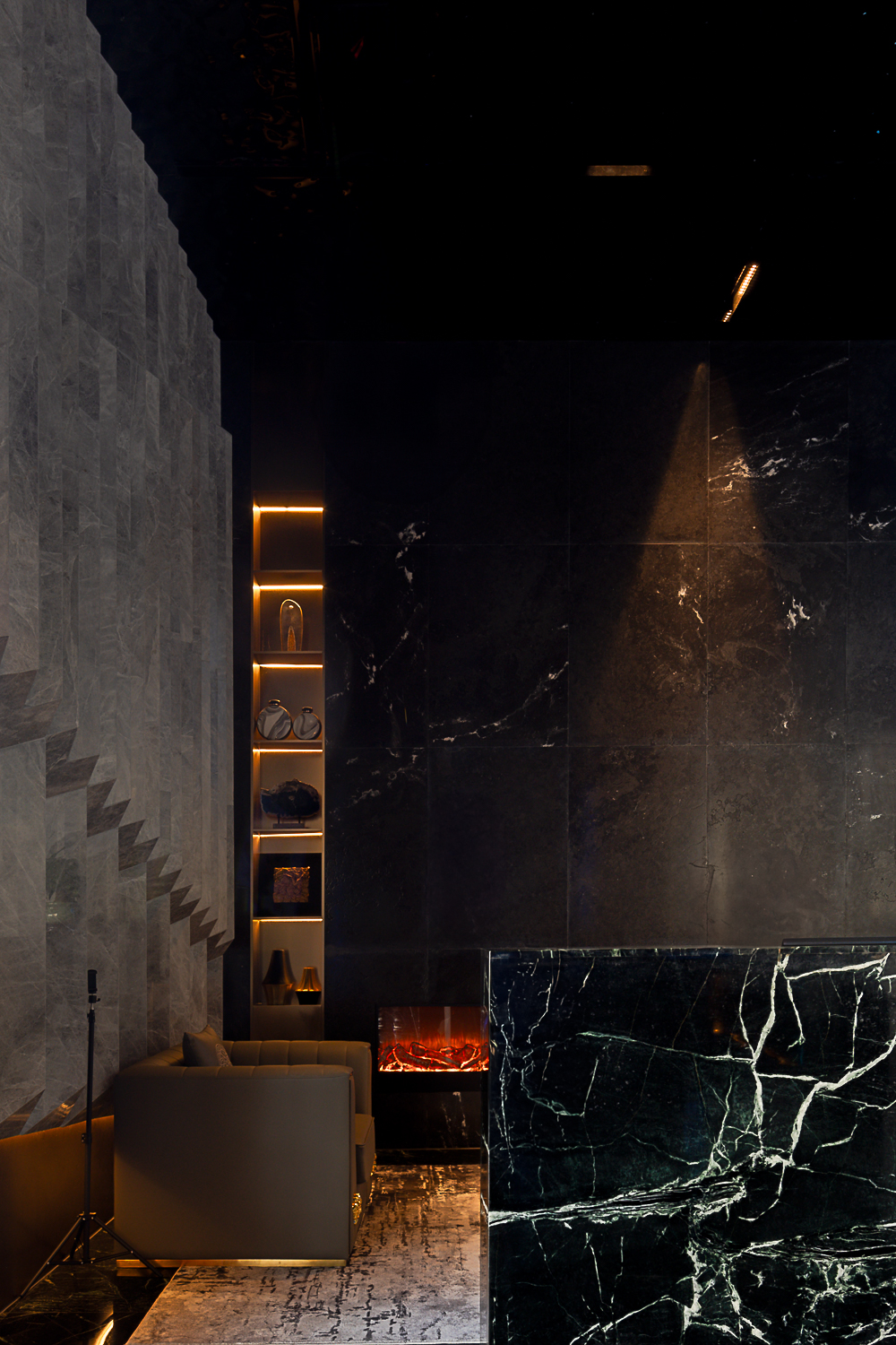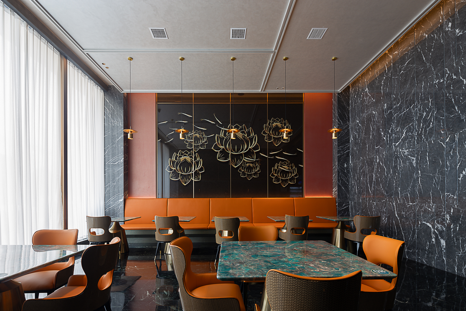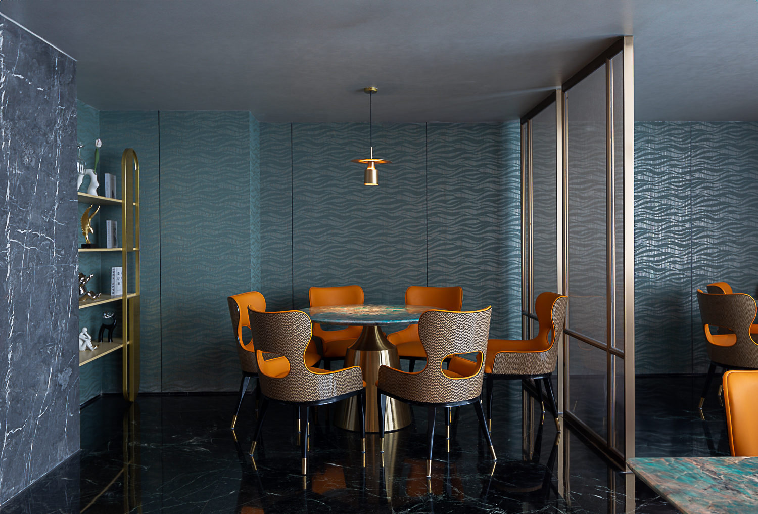 空间意境:挑高的接待大堂,石材分割的大理石墙面,水波纹天花映射墙面的LED屏。整个空间灵动奢华,加上双峰造型的背景墙以及呼应的休闲区皮革石材墙面,项目的高级感不言而喻!