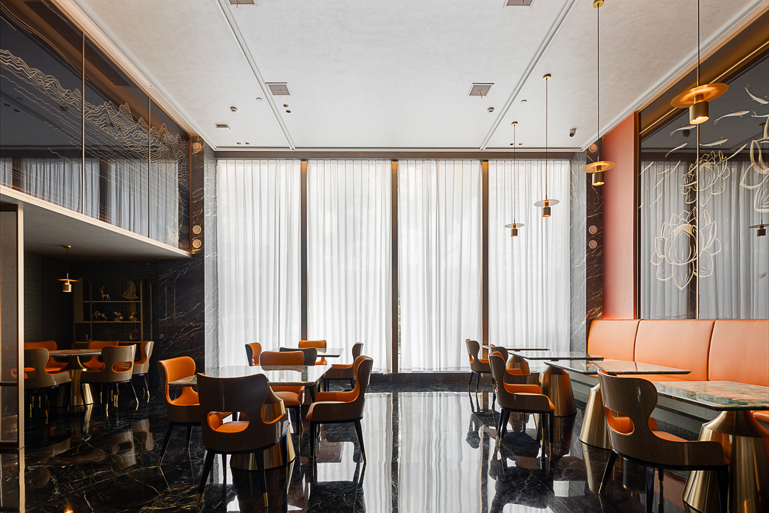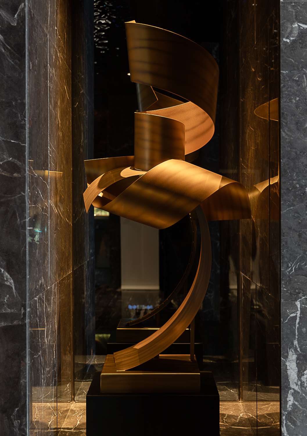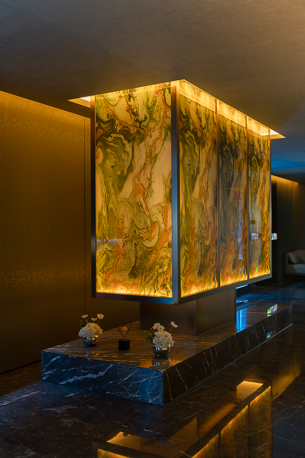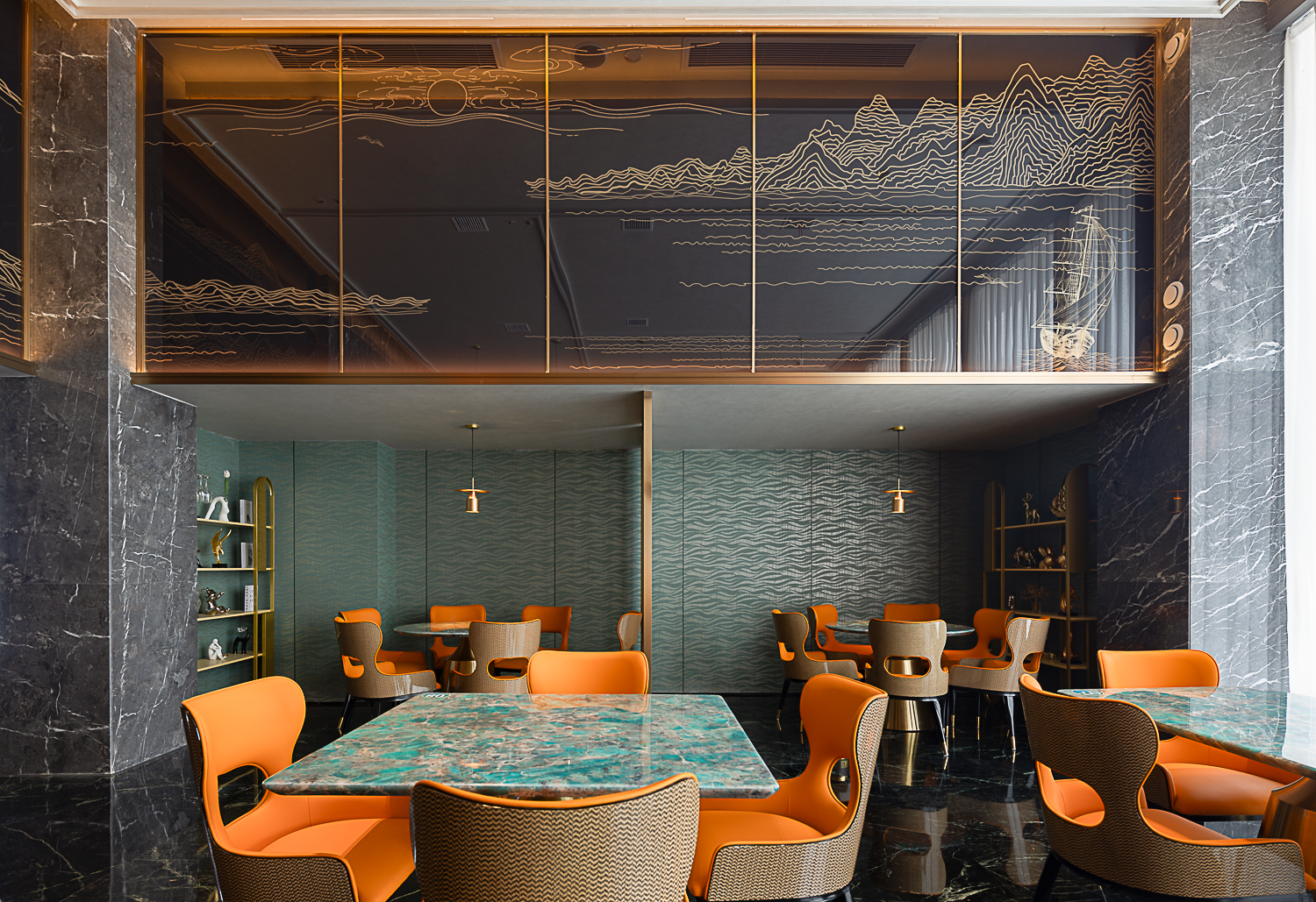 空间意境:挑高的接待大堂,石材分割的大理石墙面,水波纹天花映射墙面的LED屏。整个空间灵动奢华,加上双峰造型的背景墙以及呼应的休闲区皮革石材墙面,项目的高级感不言而喻!