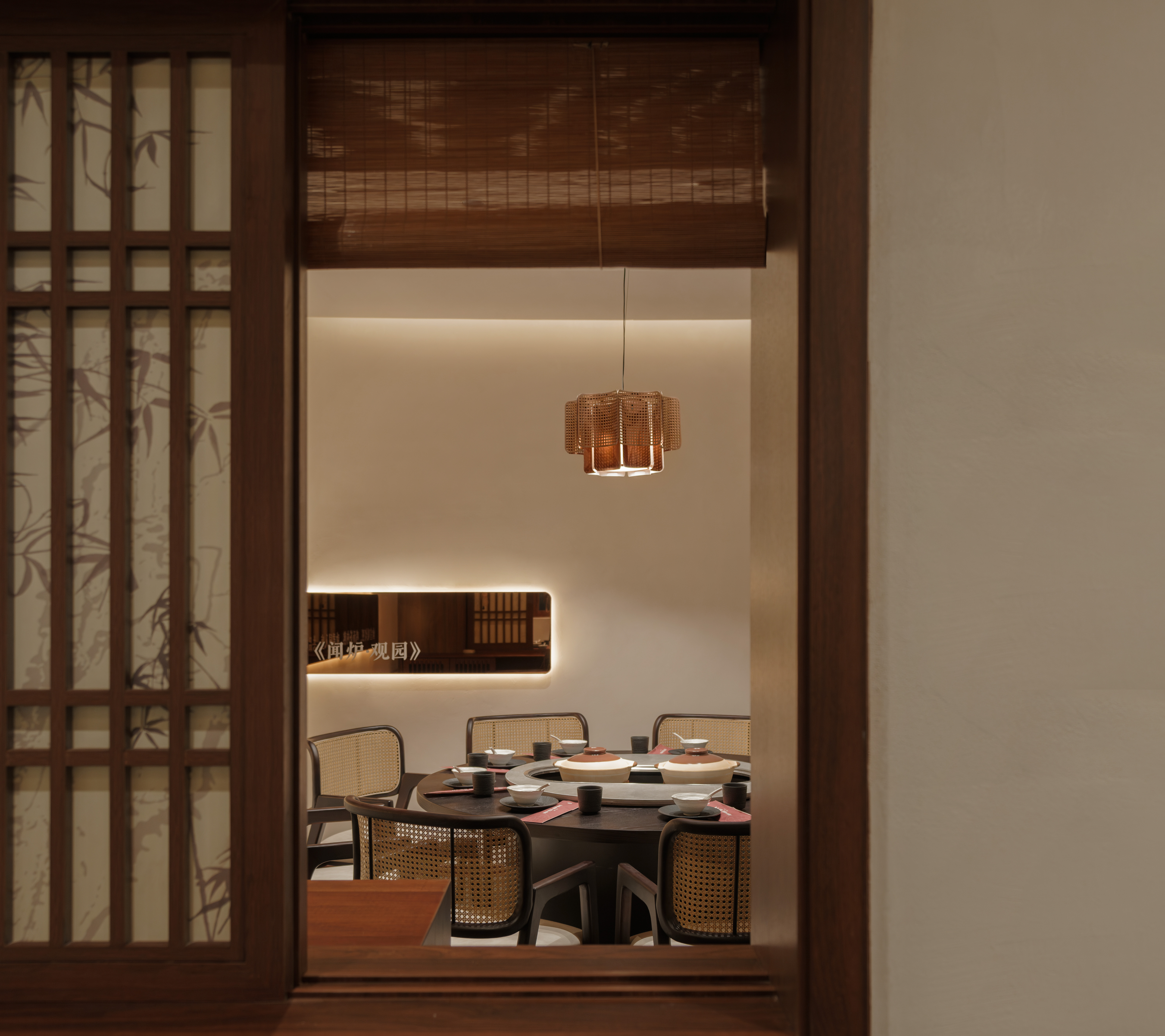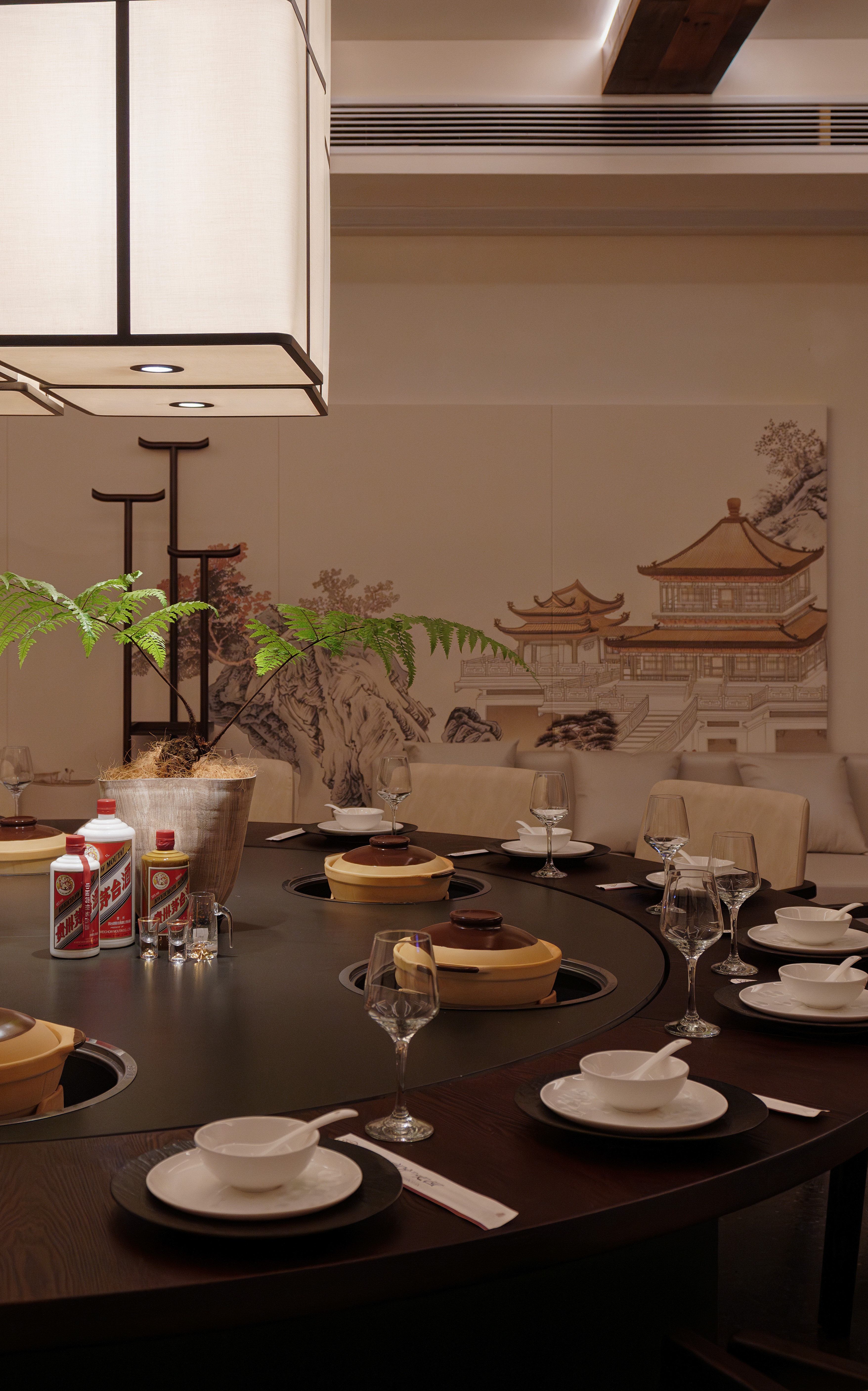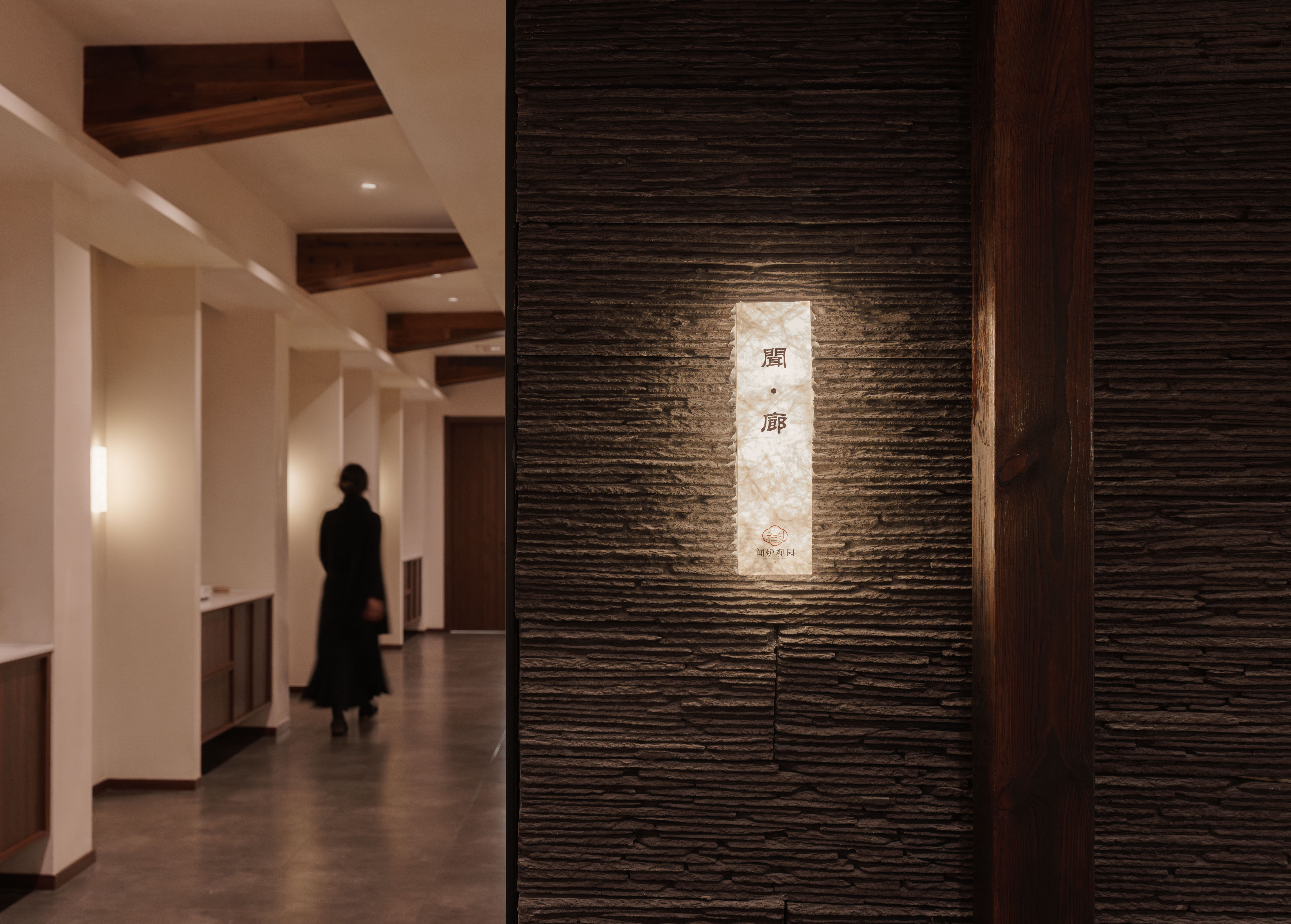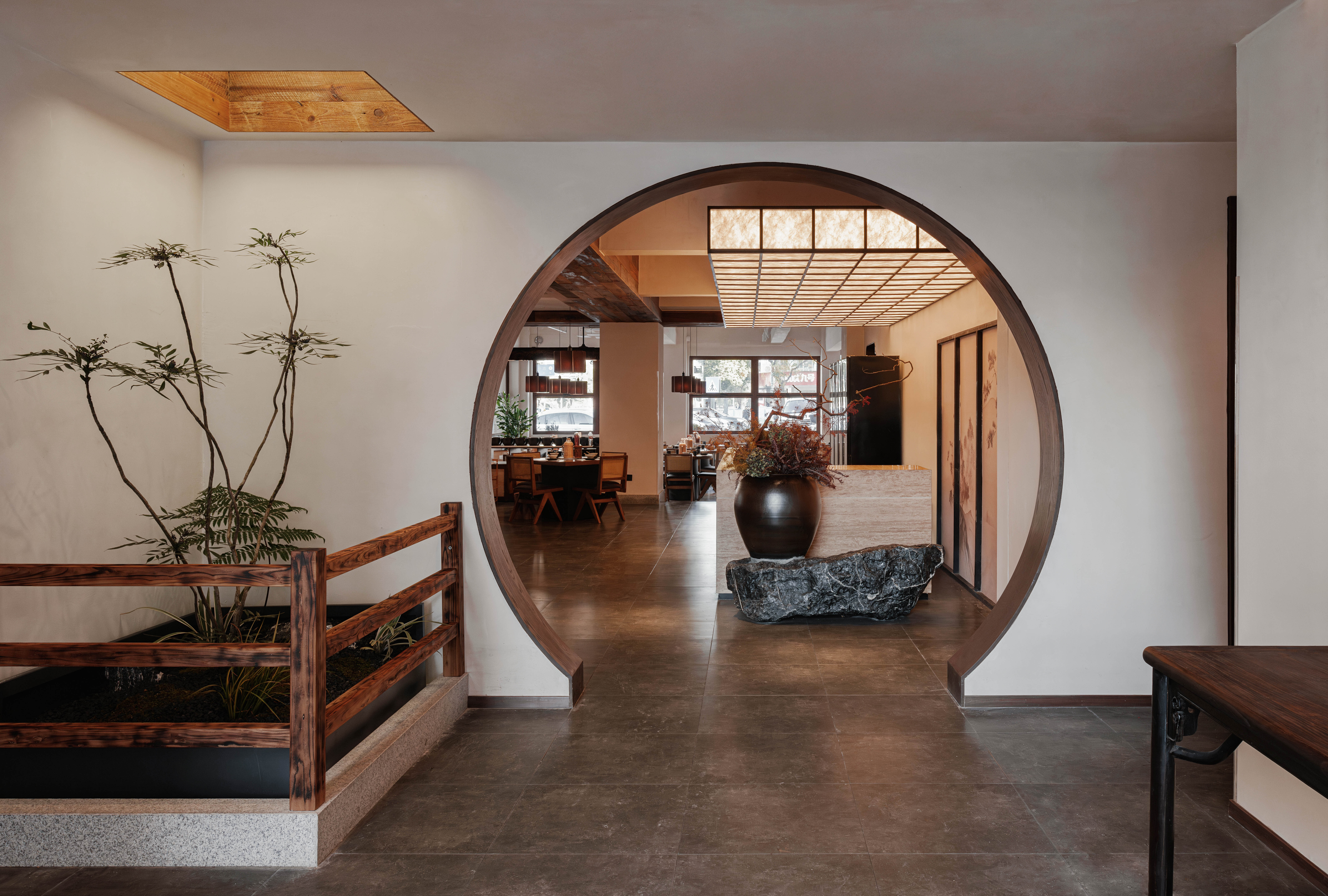 空间意境:门头采用中式园林经典的“花窗、漏窗和桥廊”手法,其设计精巧,与自然景观和谐相融,让食客能够跟随规划的动线逐步沉浸到餐厅的场景氛围之中。“观园”的尽头则是以月洞门构造的餐厅入口,结合中式禅意造景,设计风格以古典中式与现代建筑技法结合将空间表达至新的高度。