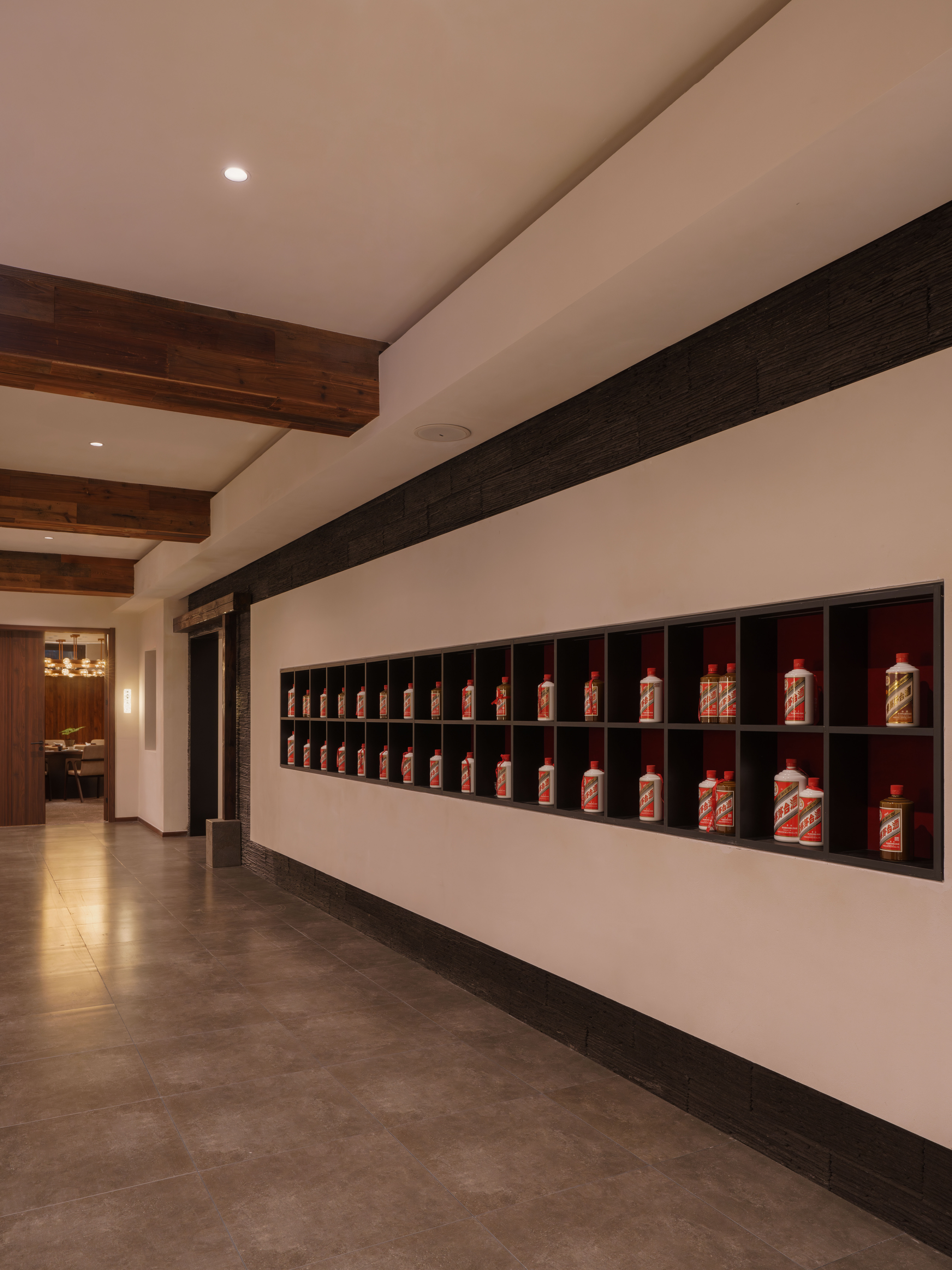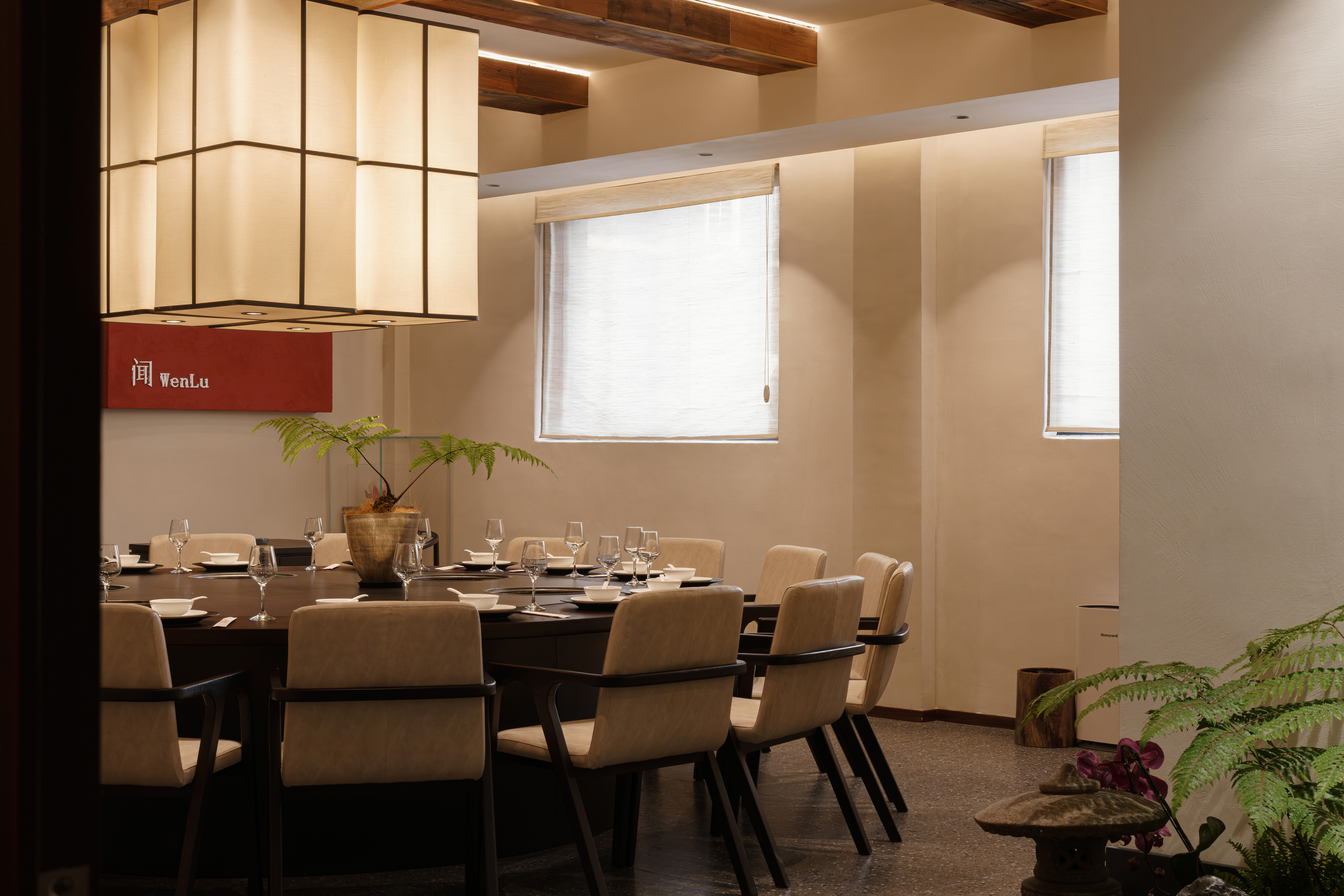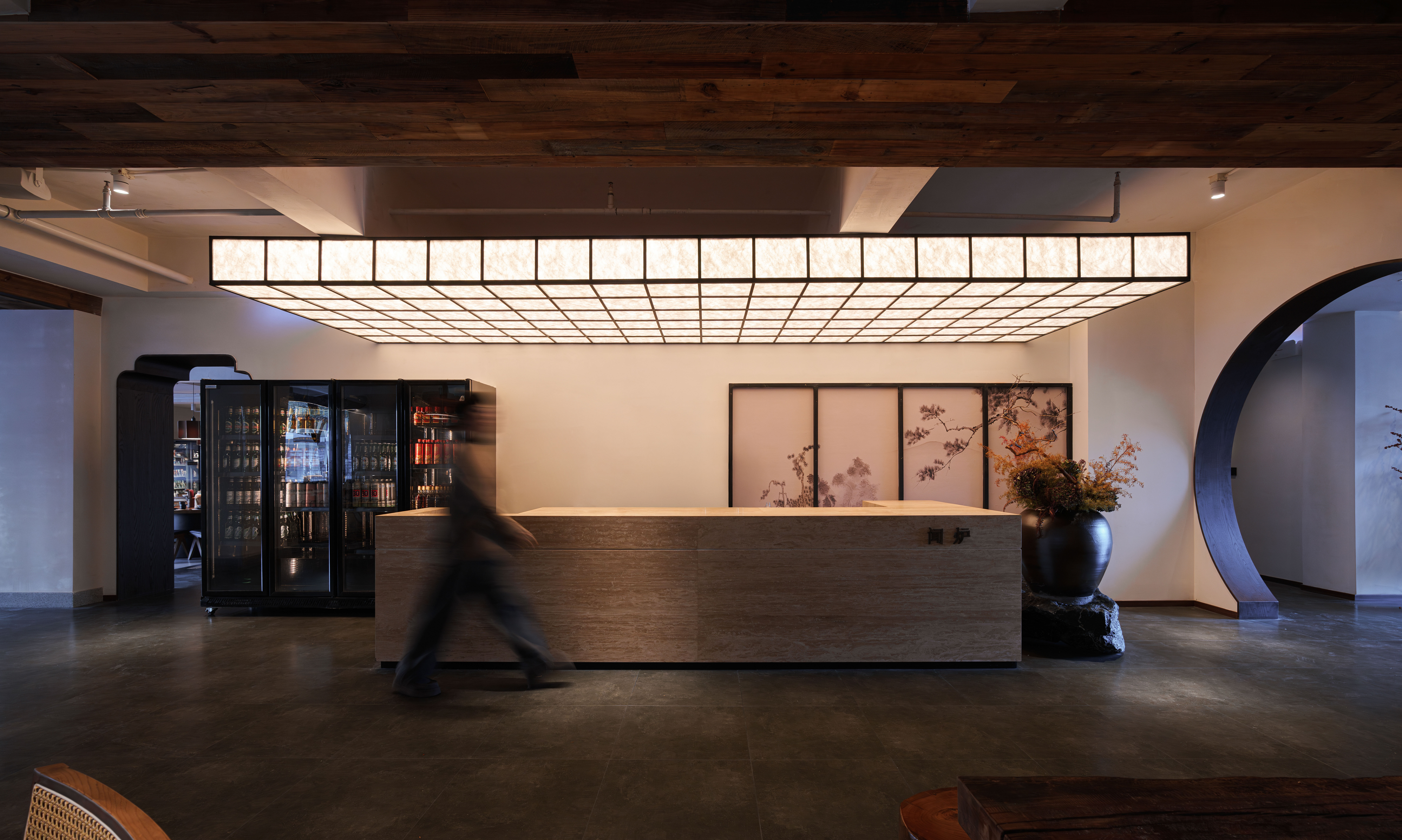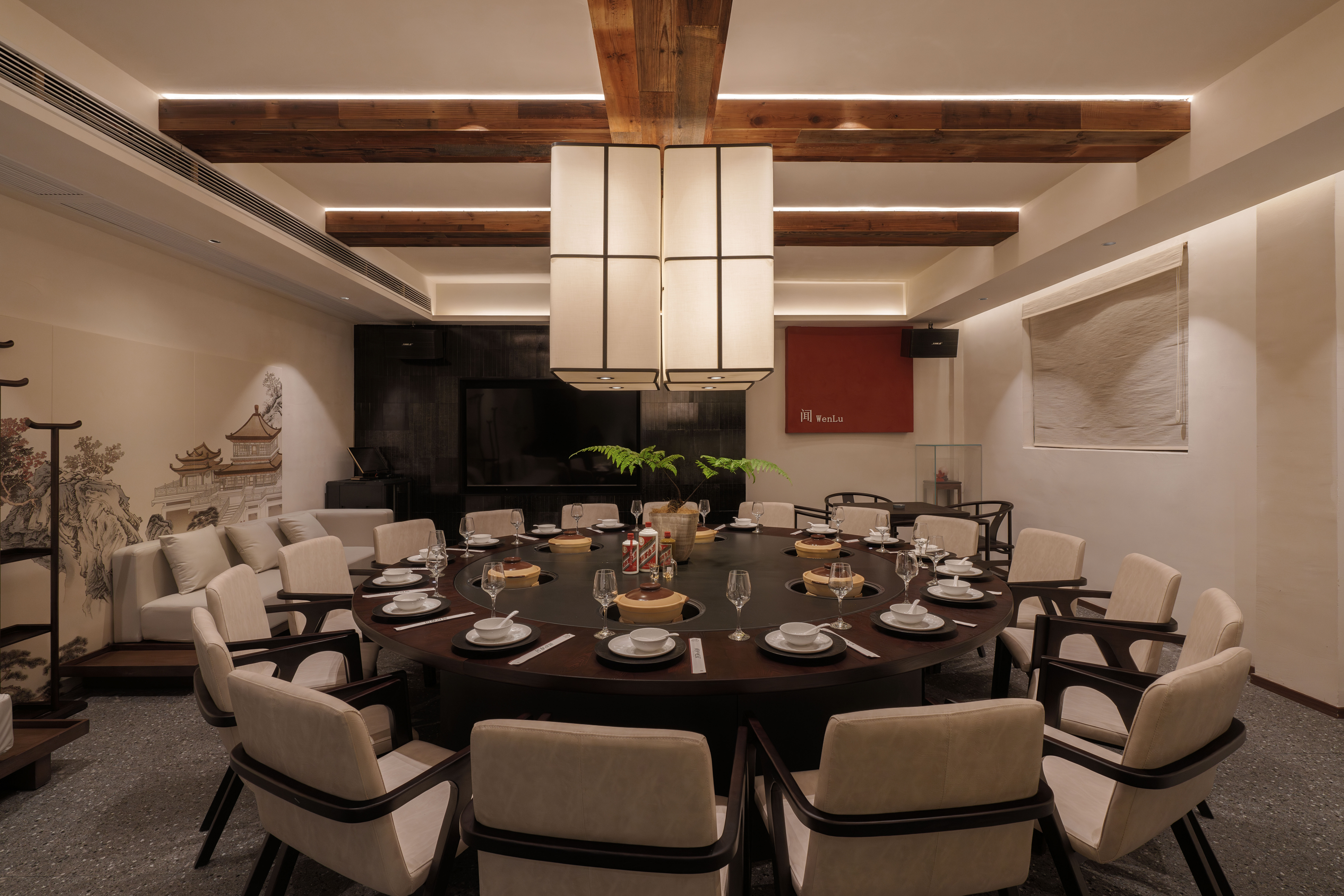 空间意境:门头采用中式园林经典的“花窗、漏窗和桥廊”手法,其设计精巧,与自然景观和谐相融,让食客能够跟随规划的动线逐步沉浸到餐厅的场景氛围之中。“观园”的尽头则是以月洞门构造的餐厅入口,结合中式禅意造景,设计风格以古典中式与现代建筑技法结合将空间表达至新的高度。