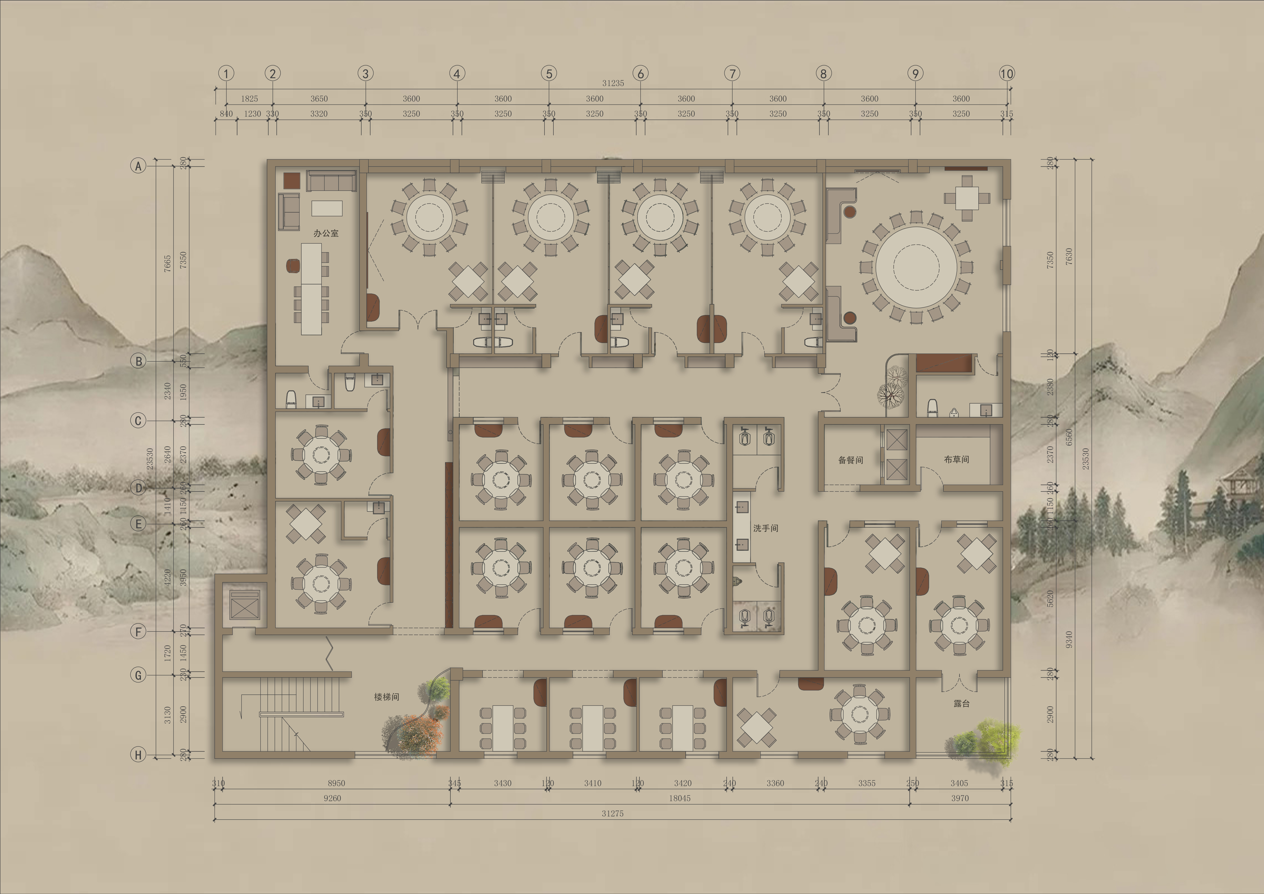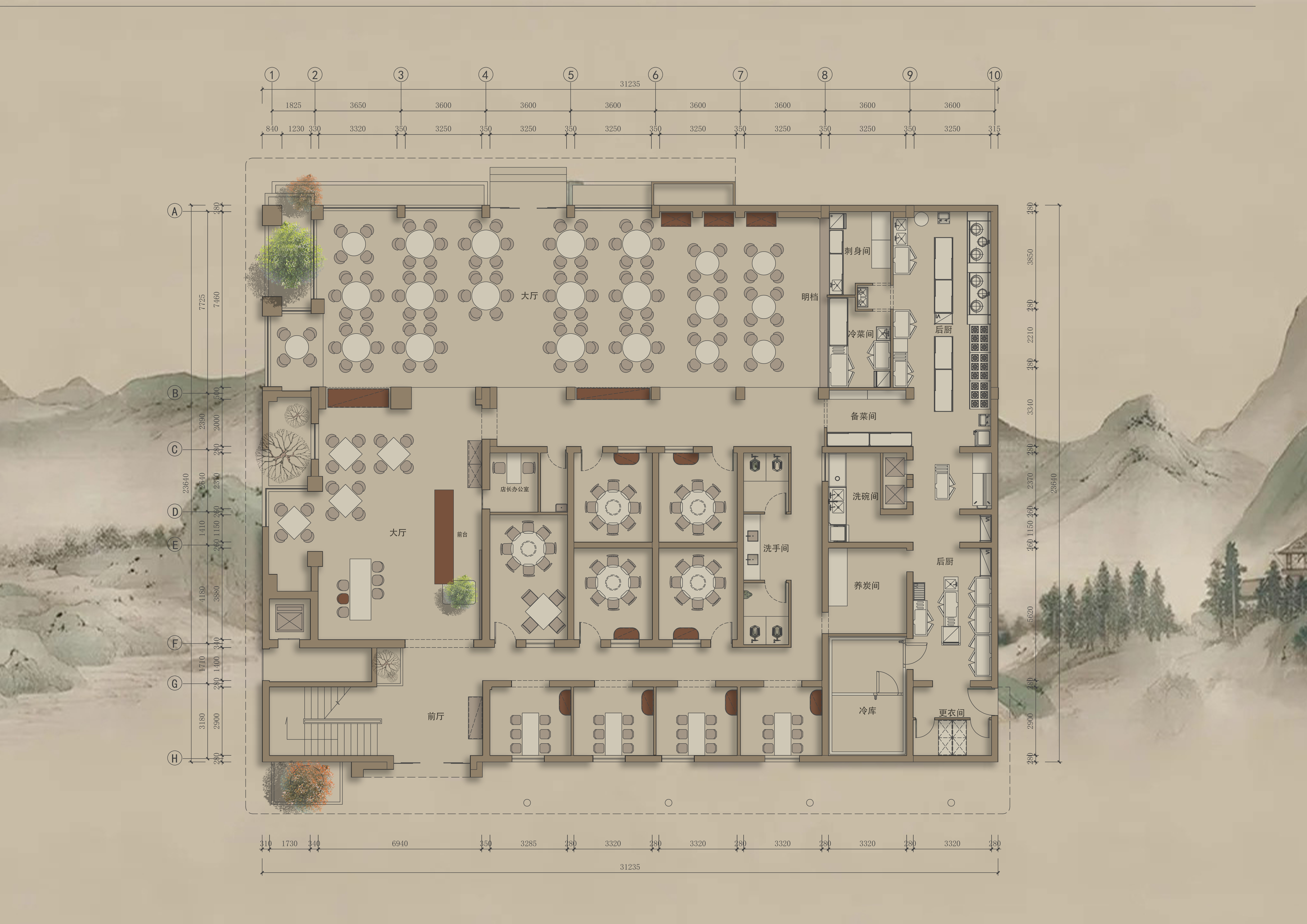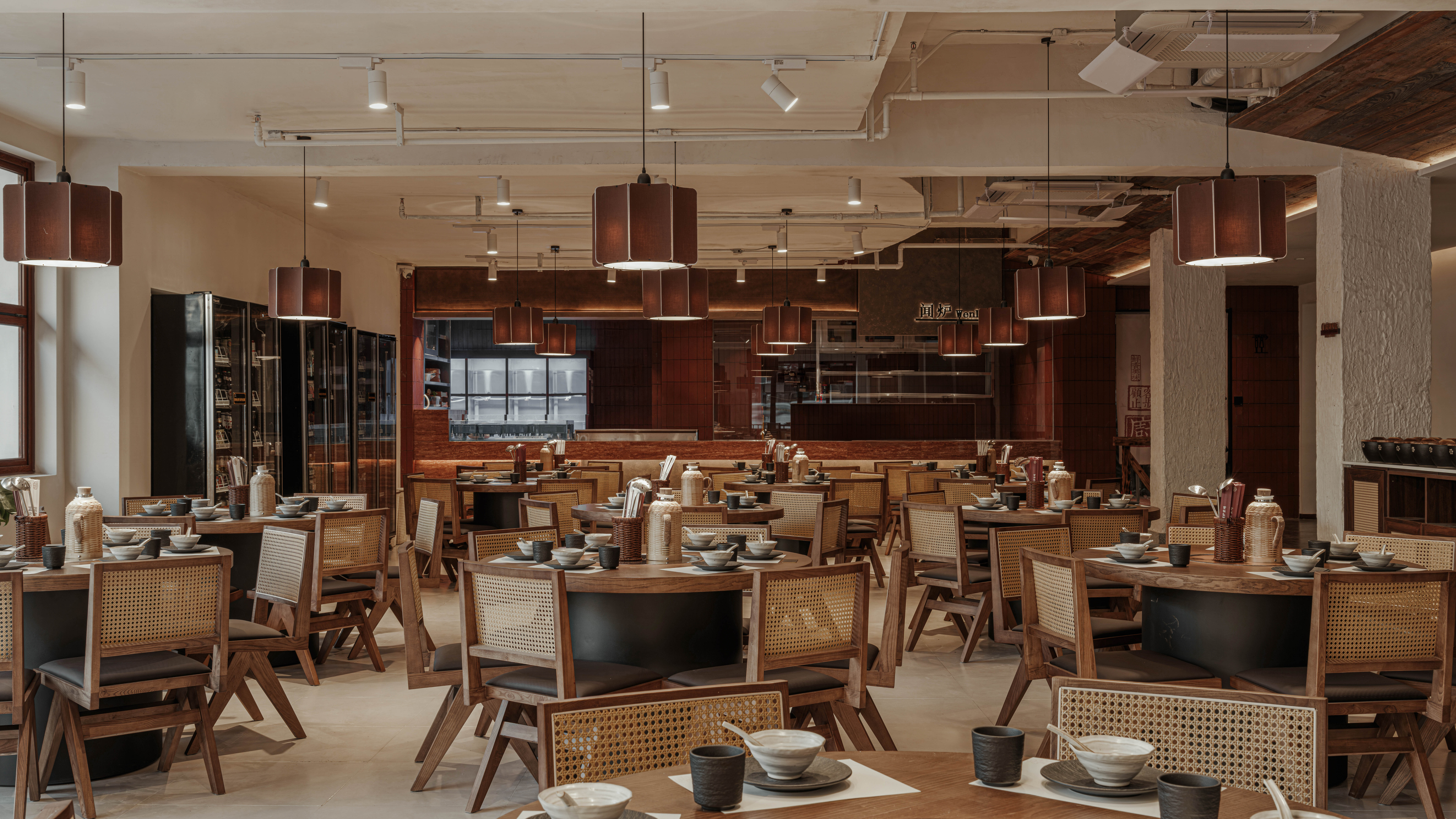 空间布局:1.空间布局:设计将充分考虑到功能分区和顾客流动的合理性,确保舒适且高效的服务体验。空间中会设置不同大小的就餐区域,以适应不同规模的聚会需求。
