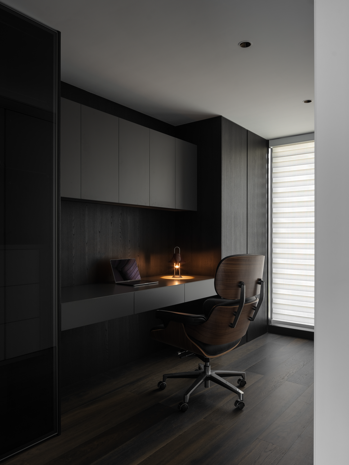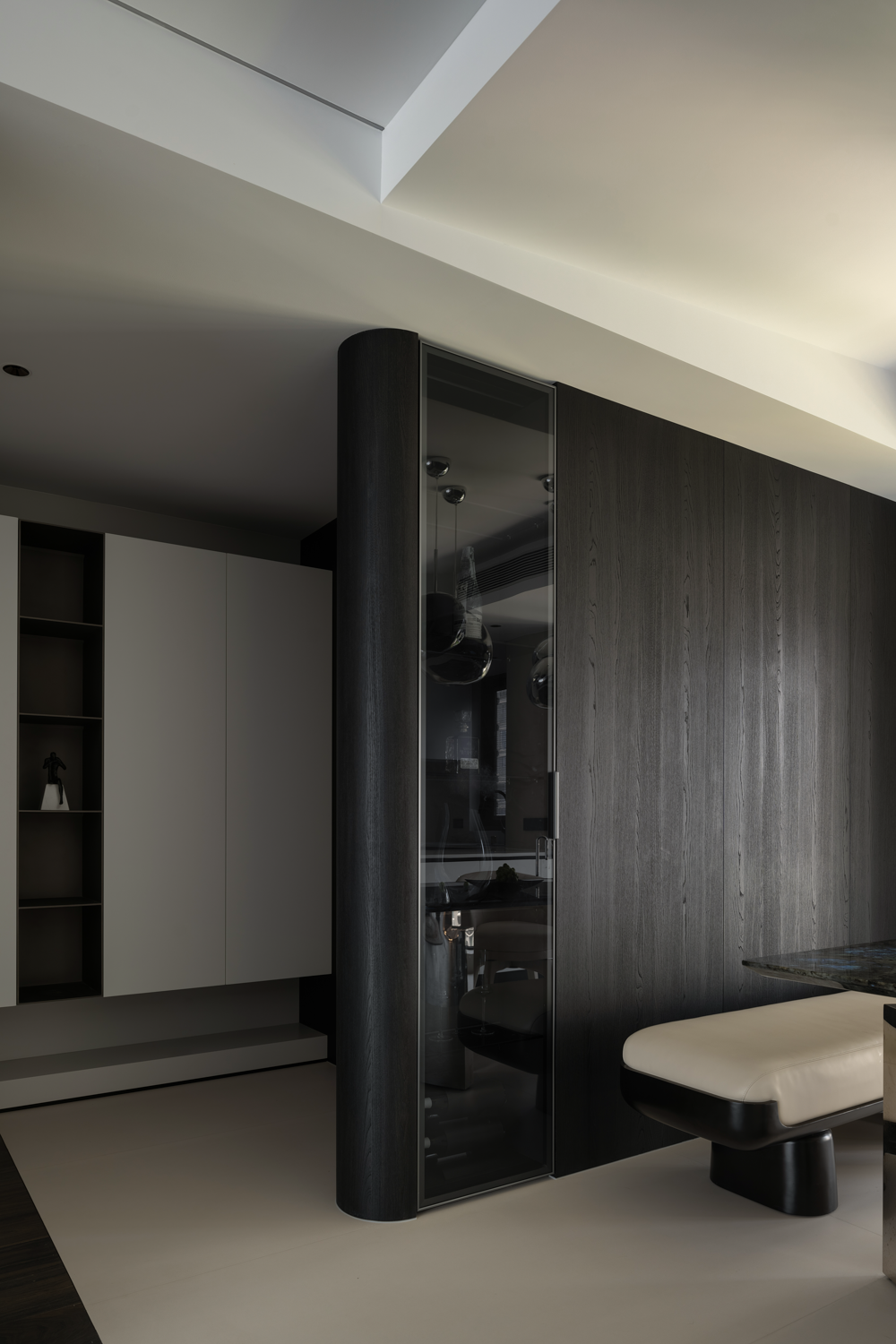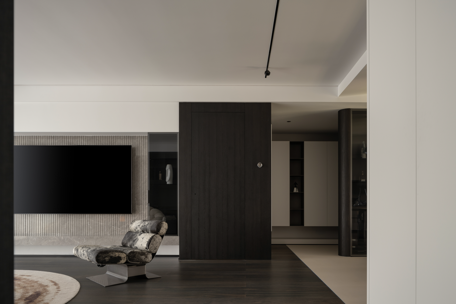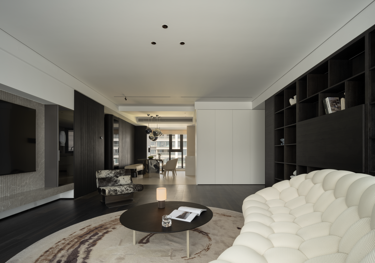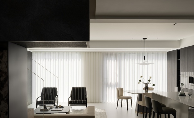 空间意境:暗色物质压低空间明度,于是外来的自然光源更显充沛。设计师希望打造明亮富有质感的生活情景,同时尊重业主对暗色场域的喜好,揉合明与暗间的调和比例,打造一个年轻自由且具有思考深度的感性空间。