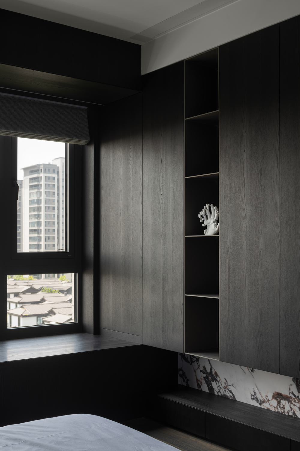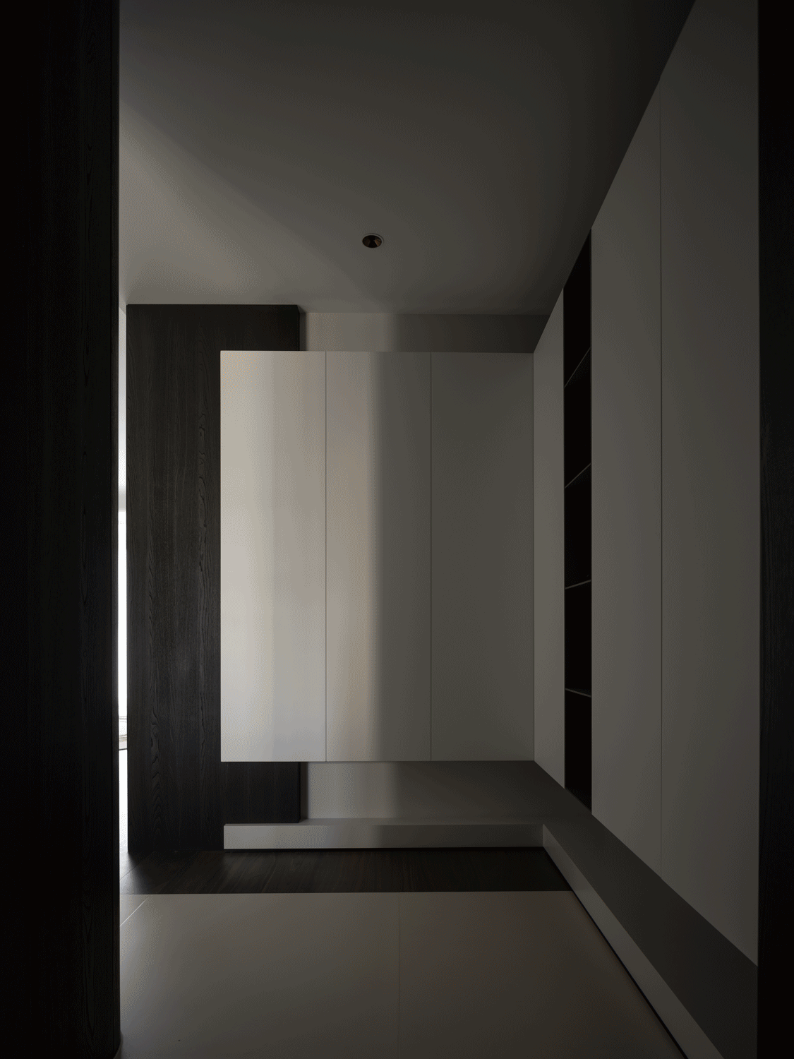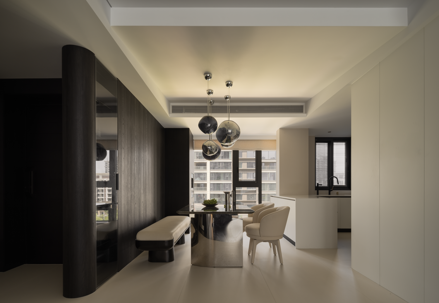 空间意境:暗色物质压低空间明度,于是外来的自然光源更显充沛。设计师希望打造明亮富有质感的生活情景,同时尊重业主对暗色场域的喜好,揉合明与暗间的调和比例,打造一个年轻自由且具有思考深度的感性空间。