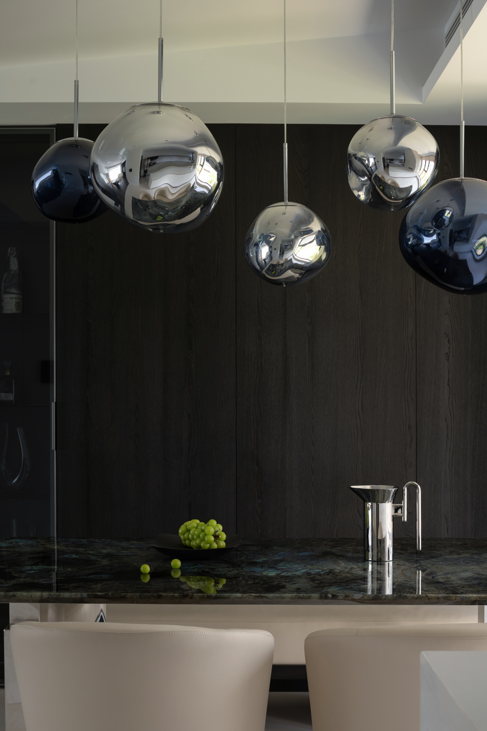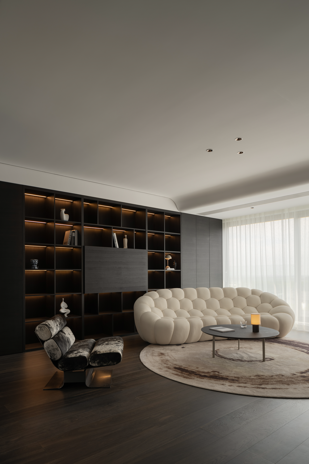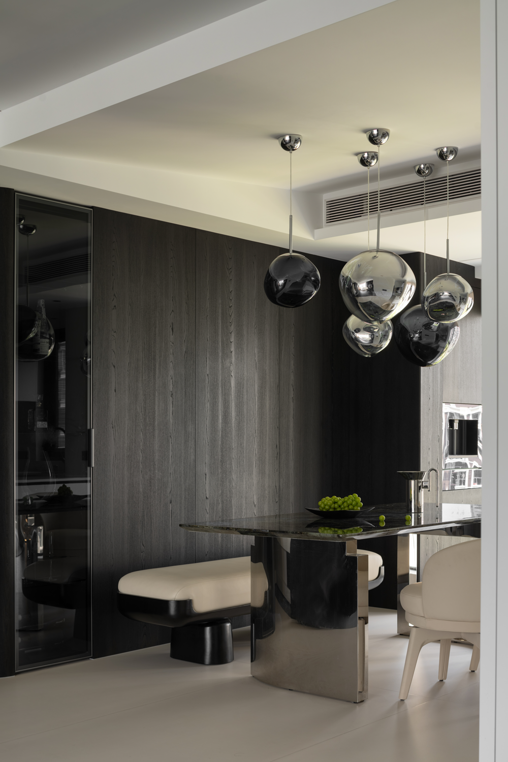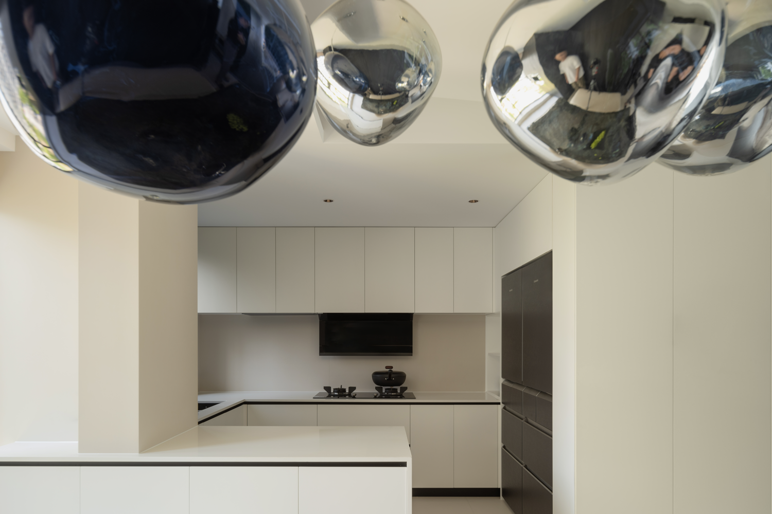 空间意境:暗色物质压低空间明度,于是外来的自然光源更显充沛。设计师希望打造明亮富有质感的生活情景,同时尊重业主对暗色场域的喜好,揉合明与暗间的调和比例,打造一个年轻自由且具有思考深度的感性空间。