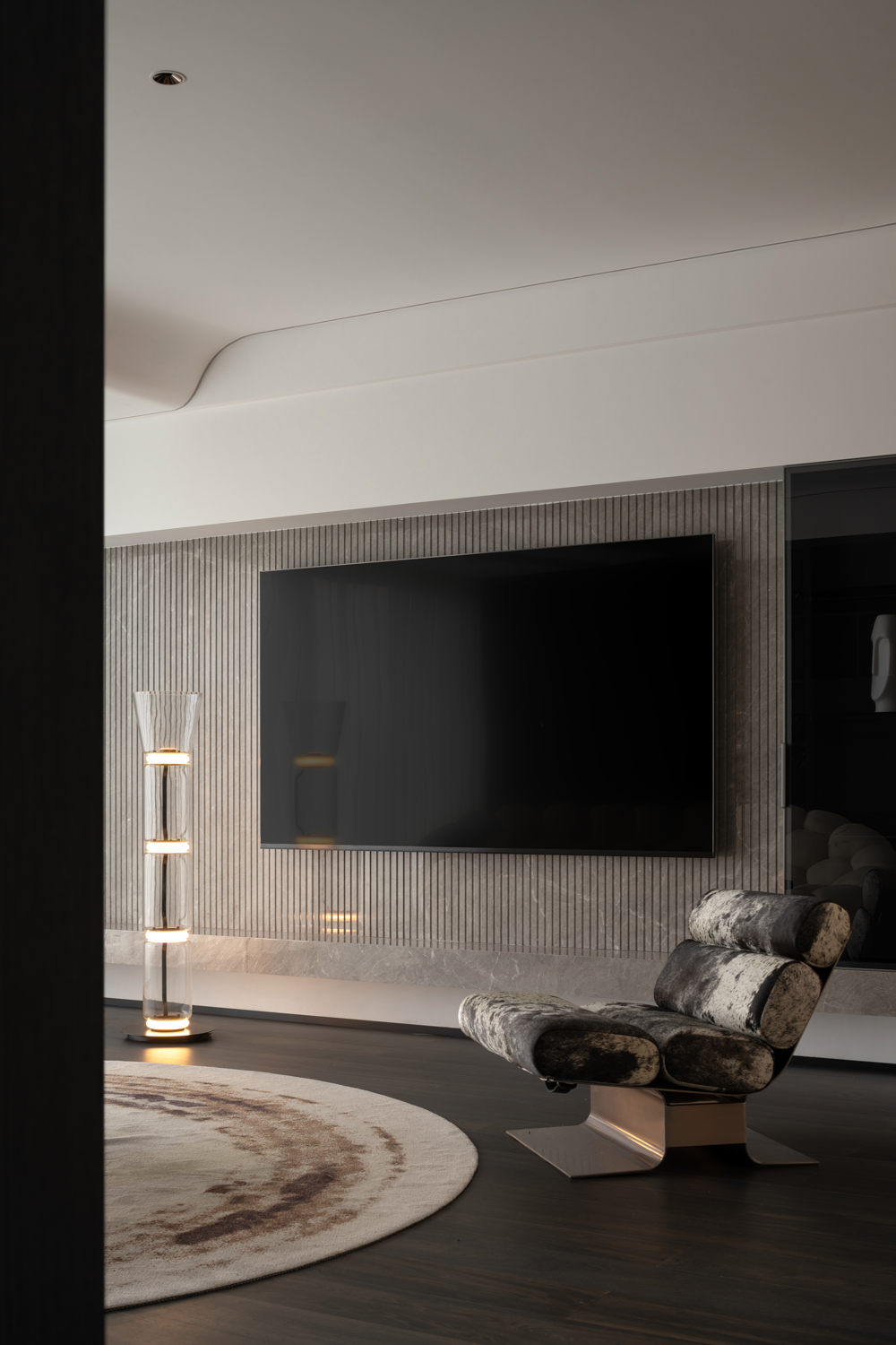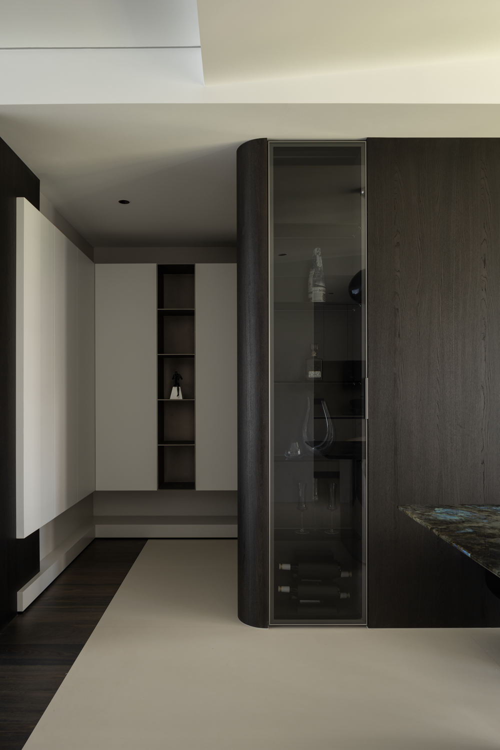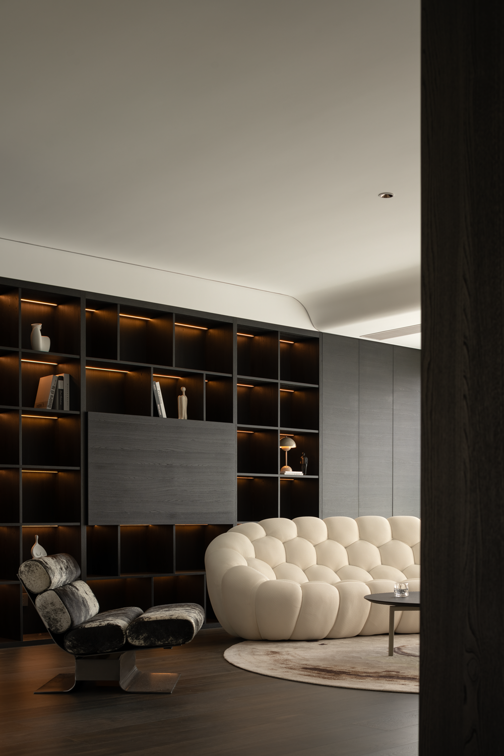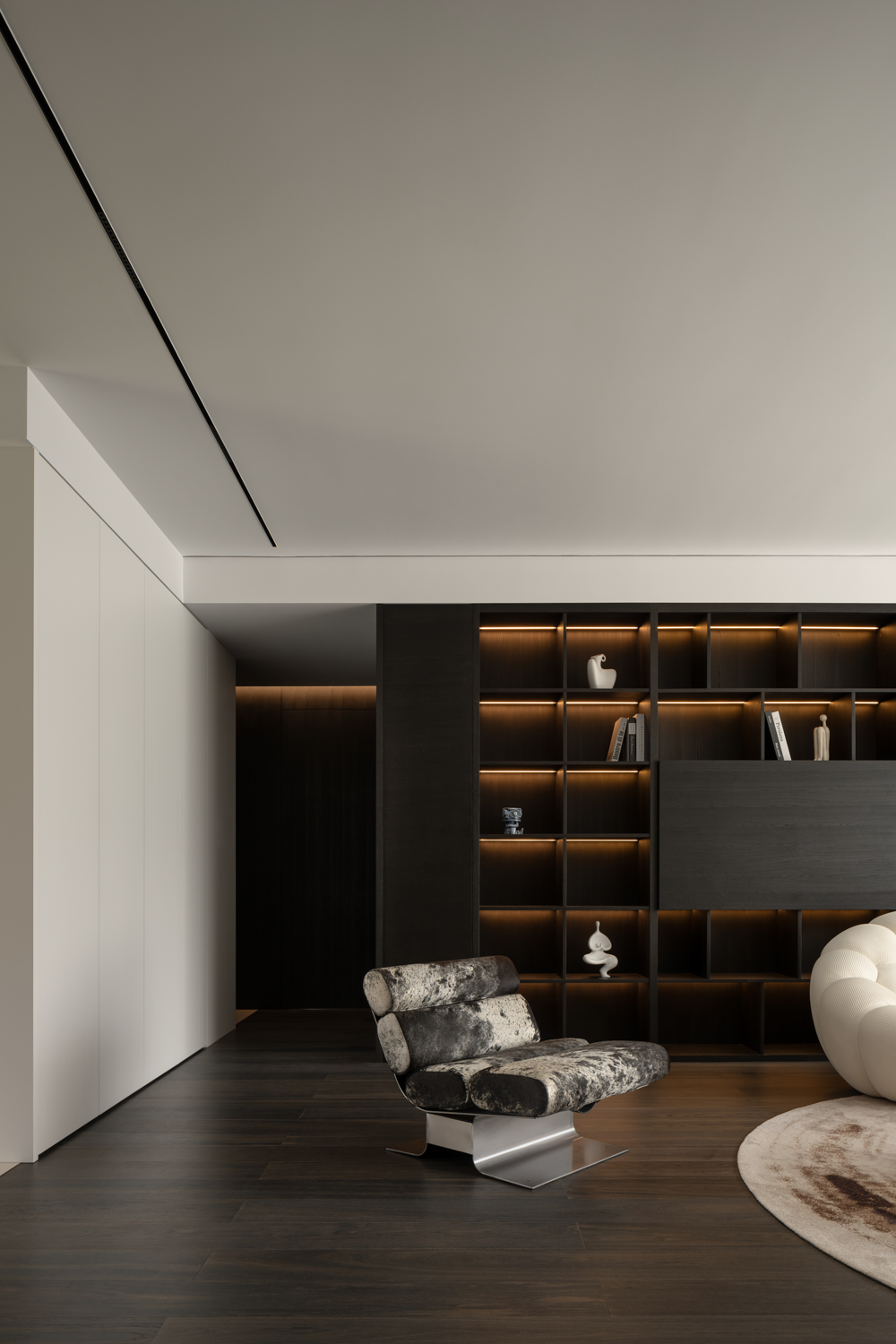 空间布局:纳入阳台,串联餐厅区域后,客厅汲取到来自两边的丰沛光照,但在设计看来,顶面无法避免的梁结构割裂了视觉关系,下一步要做的,是重建场域间的分离结构。设计通过弧形的线条,以及斜面的处理,带来自然的过渡效果,弱化梁柱的存在感,形成统一开放,明亮宽敞的布局。深色木饰面与白色墙体间形成分明的落差,一明一暗,一侧代表指引,一侧暗示转折,场景间不断穿插交替,却从未打断视线的延展,随着灯光亮起,归家的仪式感,在此刻形成完美闭环。设计,是让世界更接近我们的梦想。