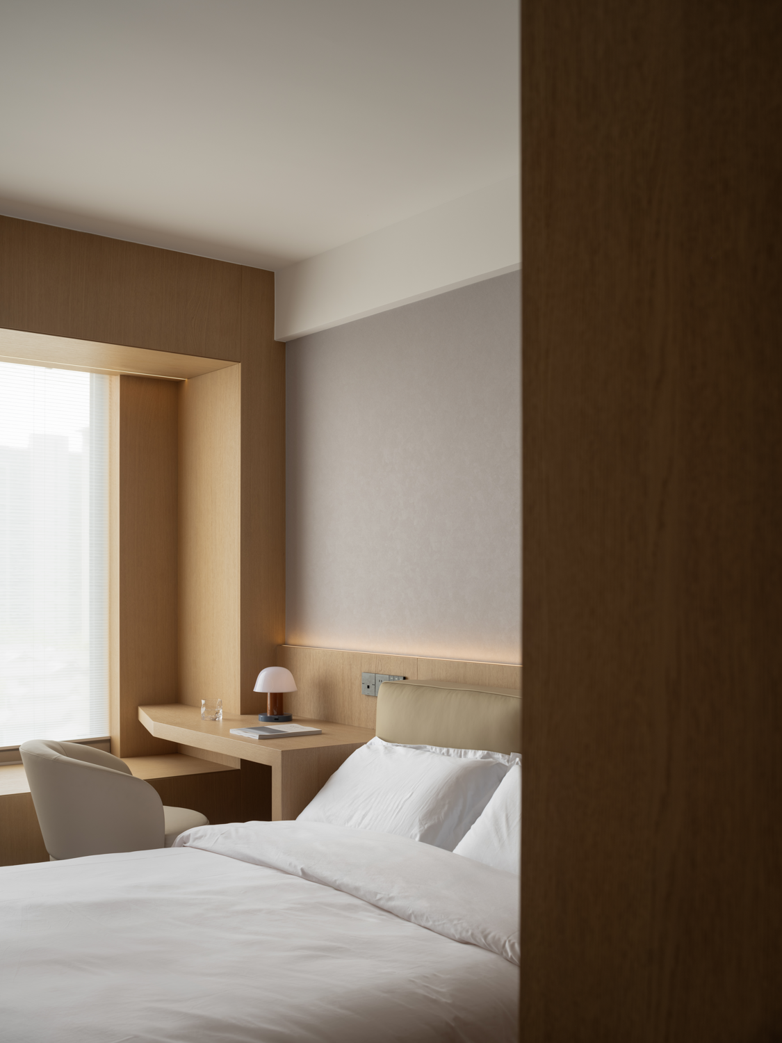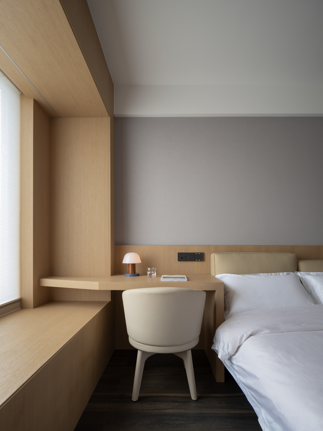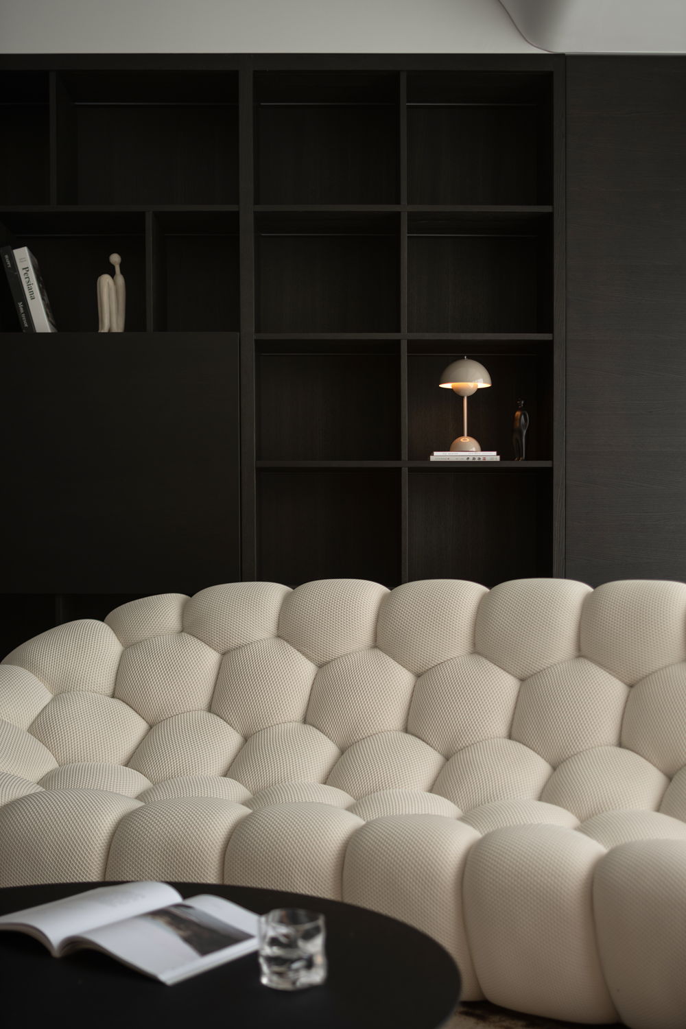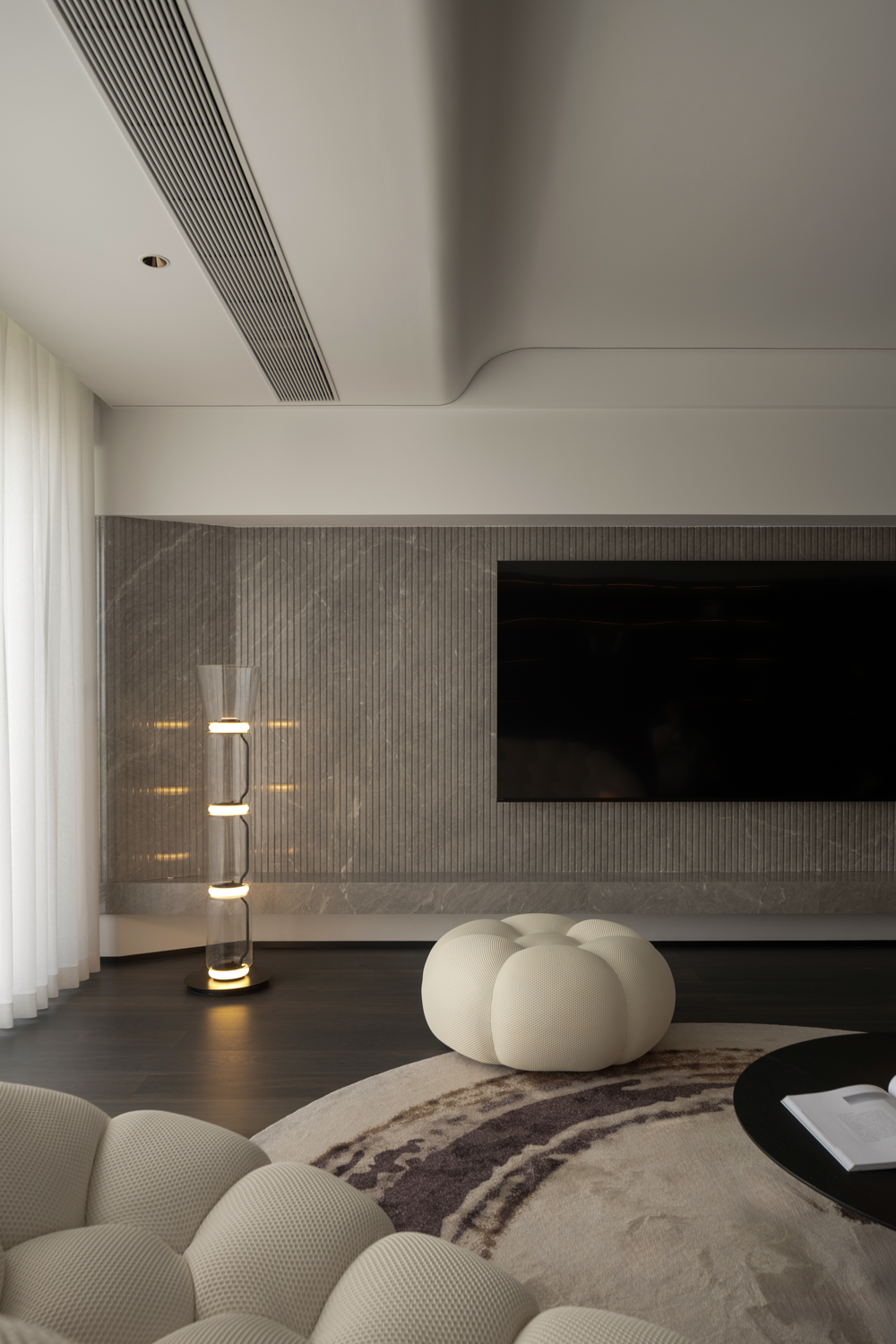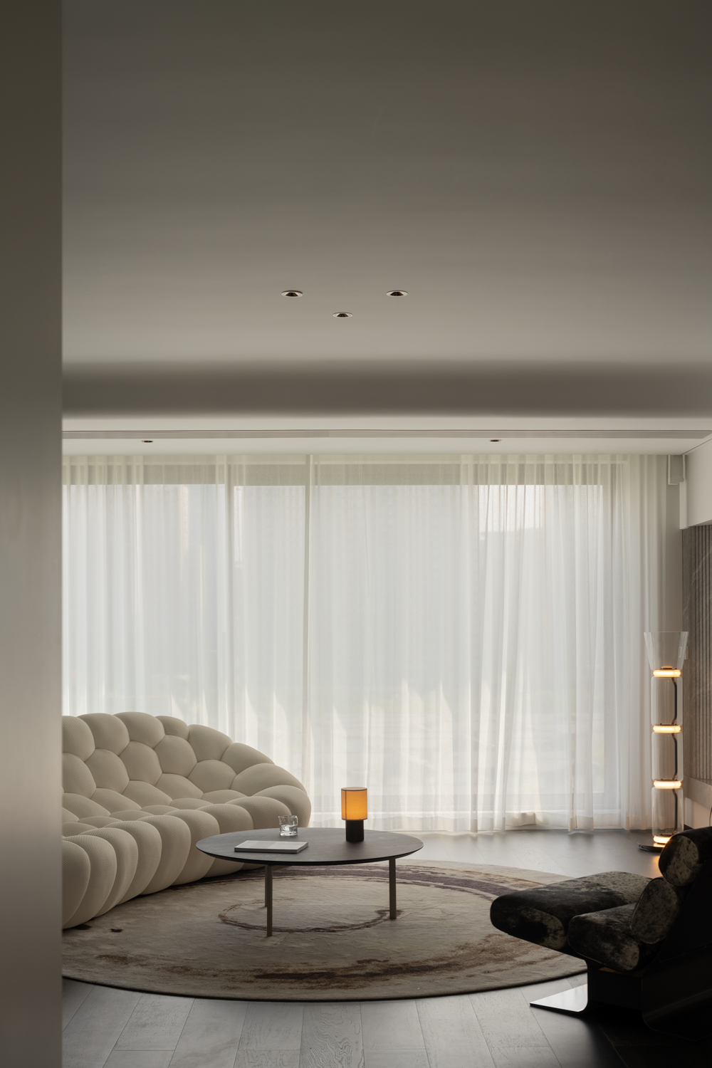 空间布局:纳入阳台,串联餐厅区域后,客厅汲取到来自两边的丰沛光照,但在设计看来,顶面无法避免的梁结构割裂了视觉关系,下一步要做的,是重建场域间的分离结构。设计通过弧形的线条,以及斜面的处理,带来自然的过渡效果,弱化梁柱的存在感,形成统一开放,明亮宽敞的布局。深色木饰面与白色墙体间形成分明的落差,一明一暗,一侧代表指引,一侧暗示转折,场景间不断穿插交替,却从未打断视线的延展,随着灯光亮起,归家的仪式感,在此刻形成完美闭环。设计,是让世界更接近我们的梦想。