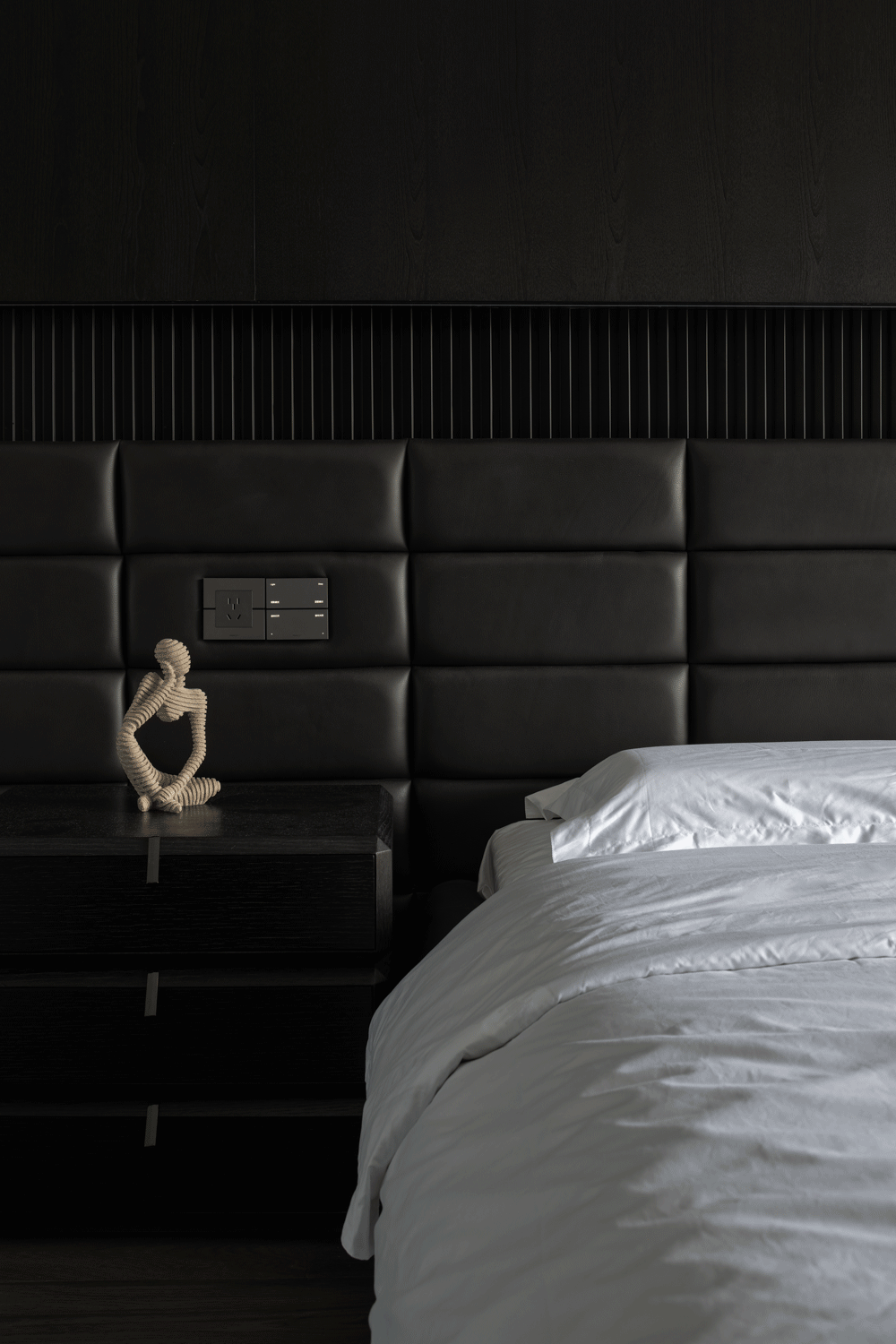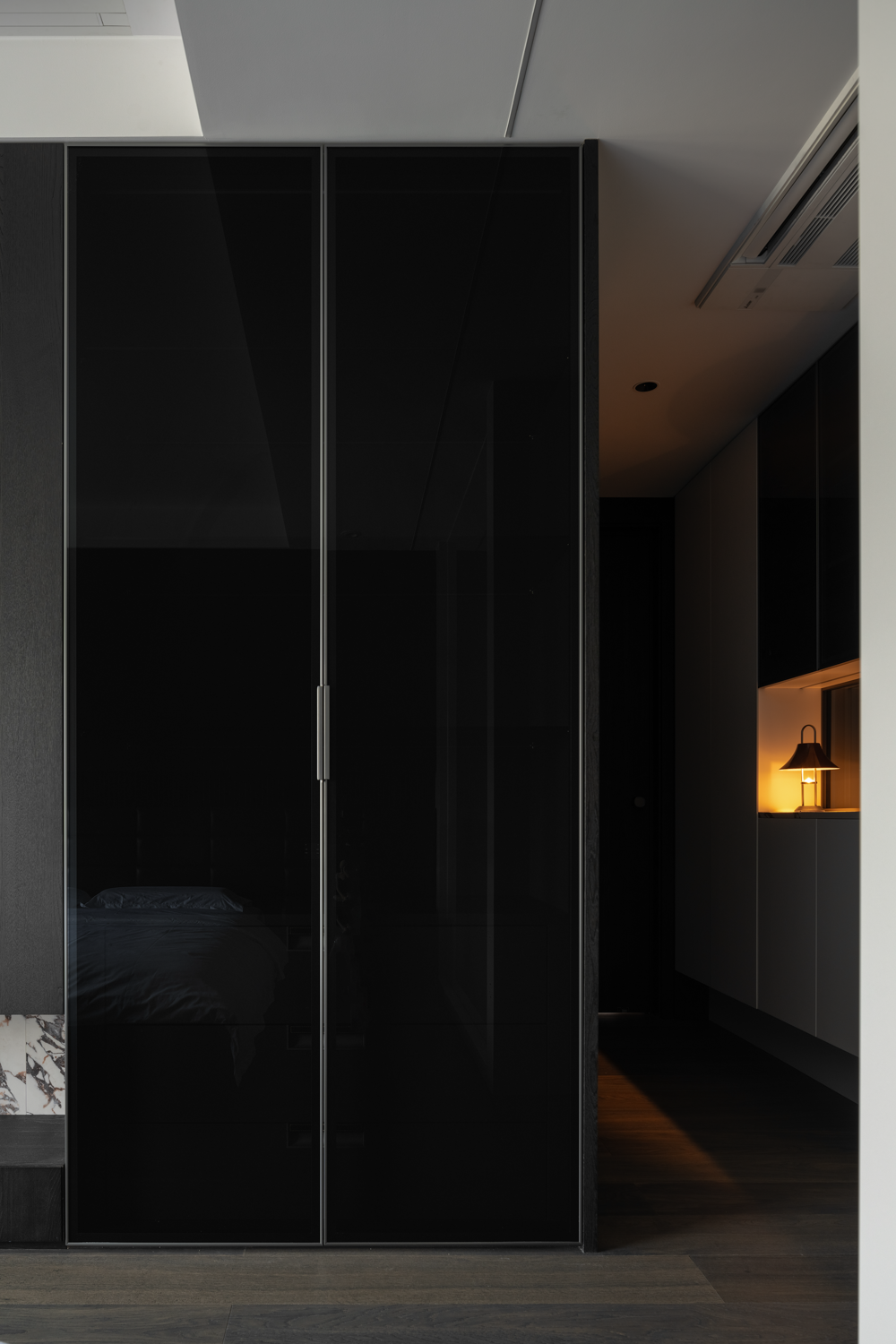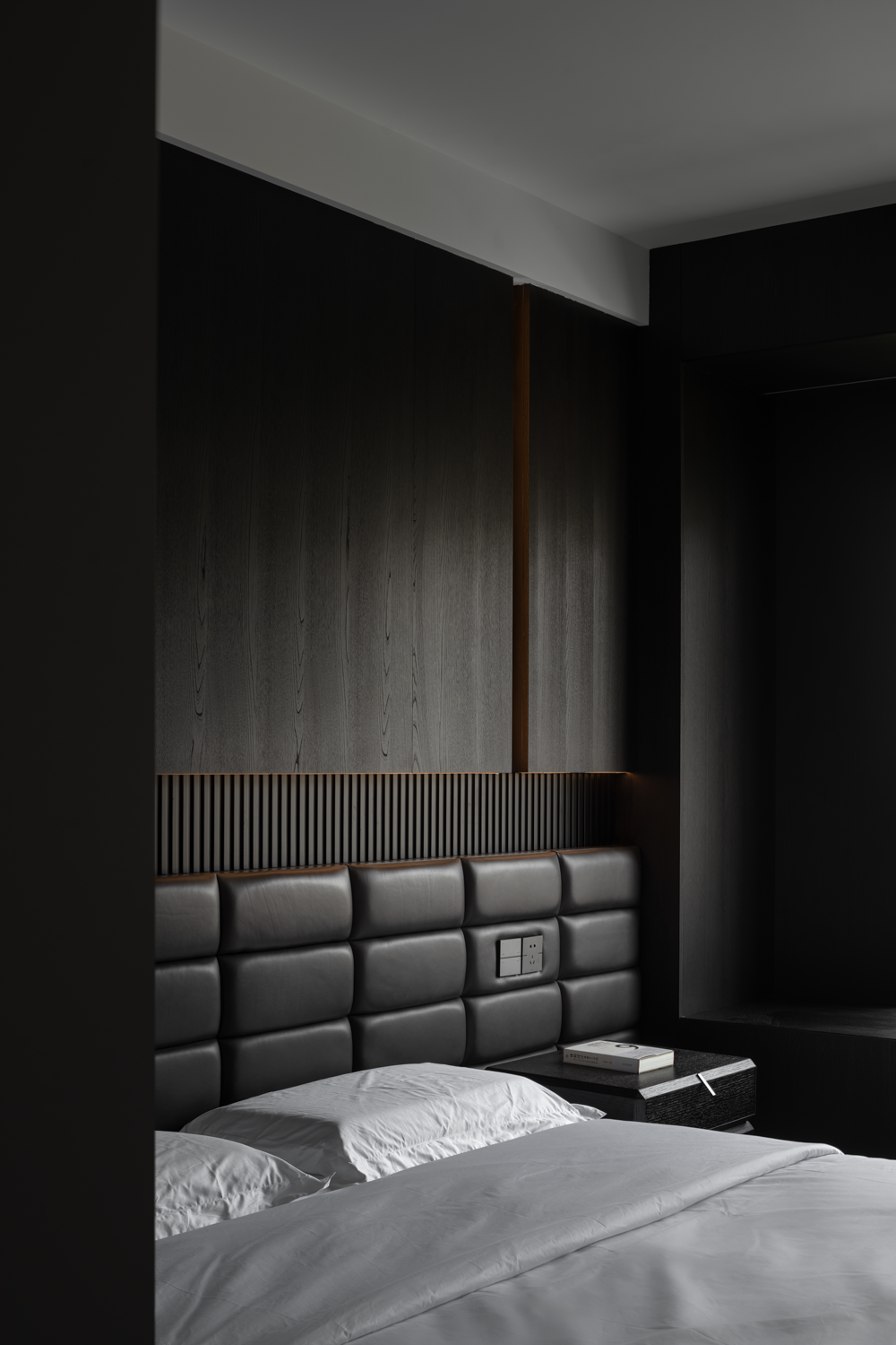 设计选材:来到家装空间,设计师希望能够在实用性的选择之余,尽可能贴近业主的心中所想,于是在最具个人倾向的主卧空间使用大量的暗色元素,并减少不必要的装饰,只通过材质间肌理质感的不同作为层次的区分。