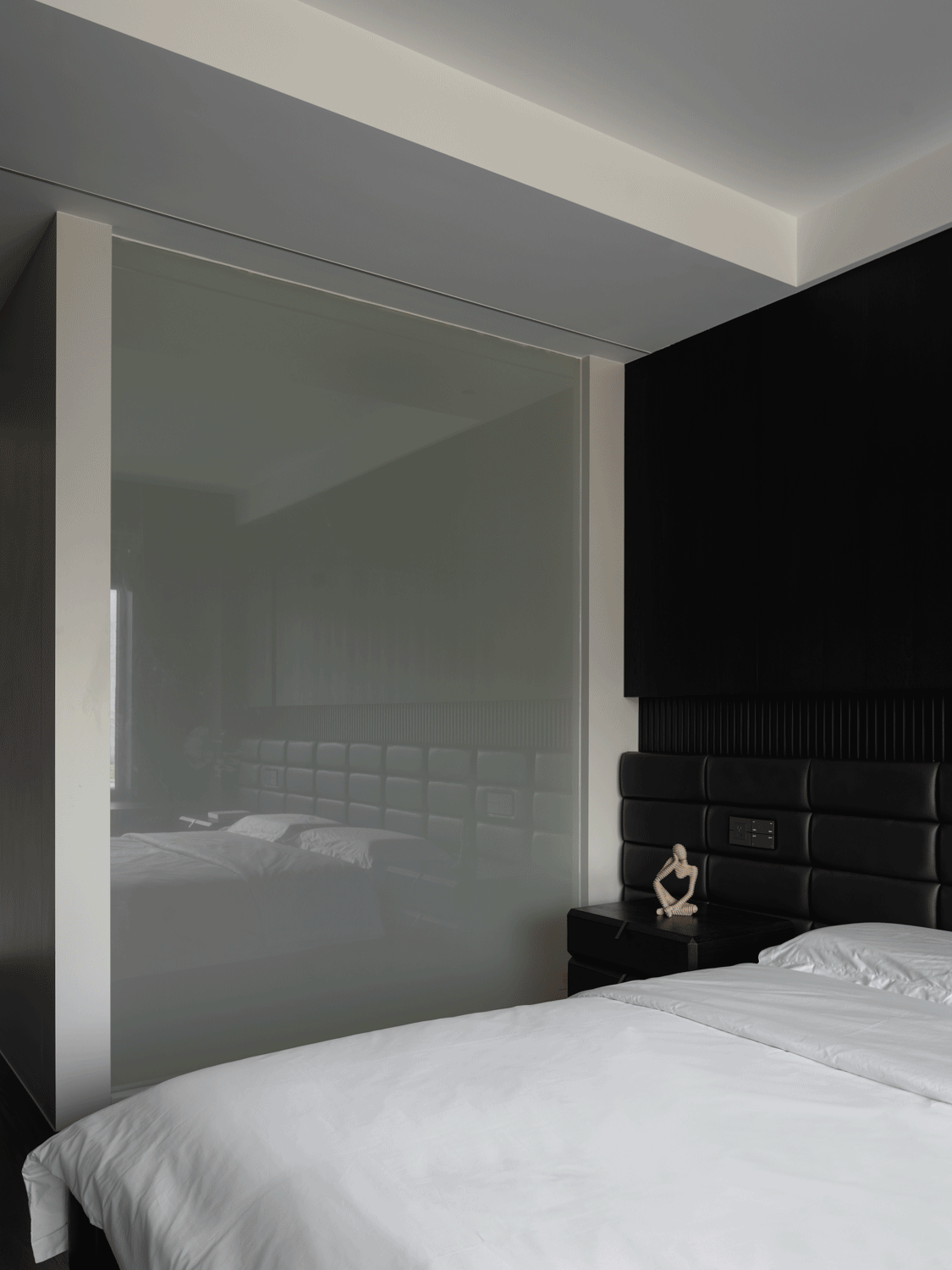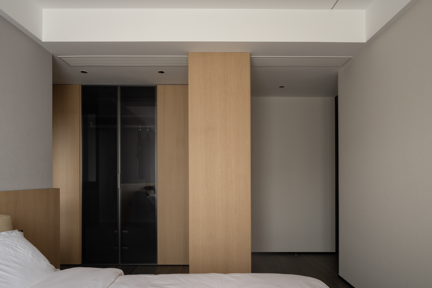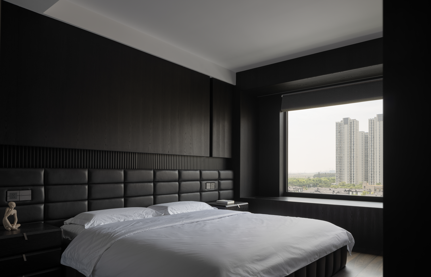 设计选材:来到家装空间,设计师希望能够在实用性的选择之余,尽可能贴近业主的心中所想,于是在最具个人倾向的主卧空间使用大量的暗色元素,并减少不必要的装饰,只通过材质间肌理质感的不同作为层次的区分。