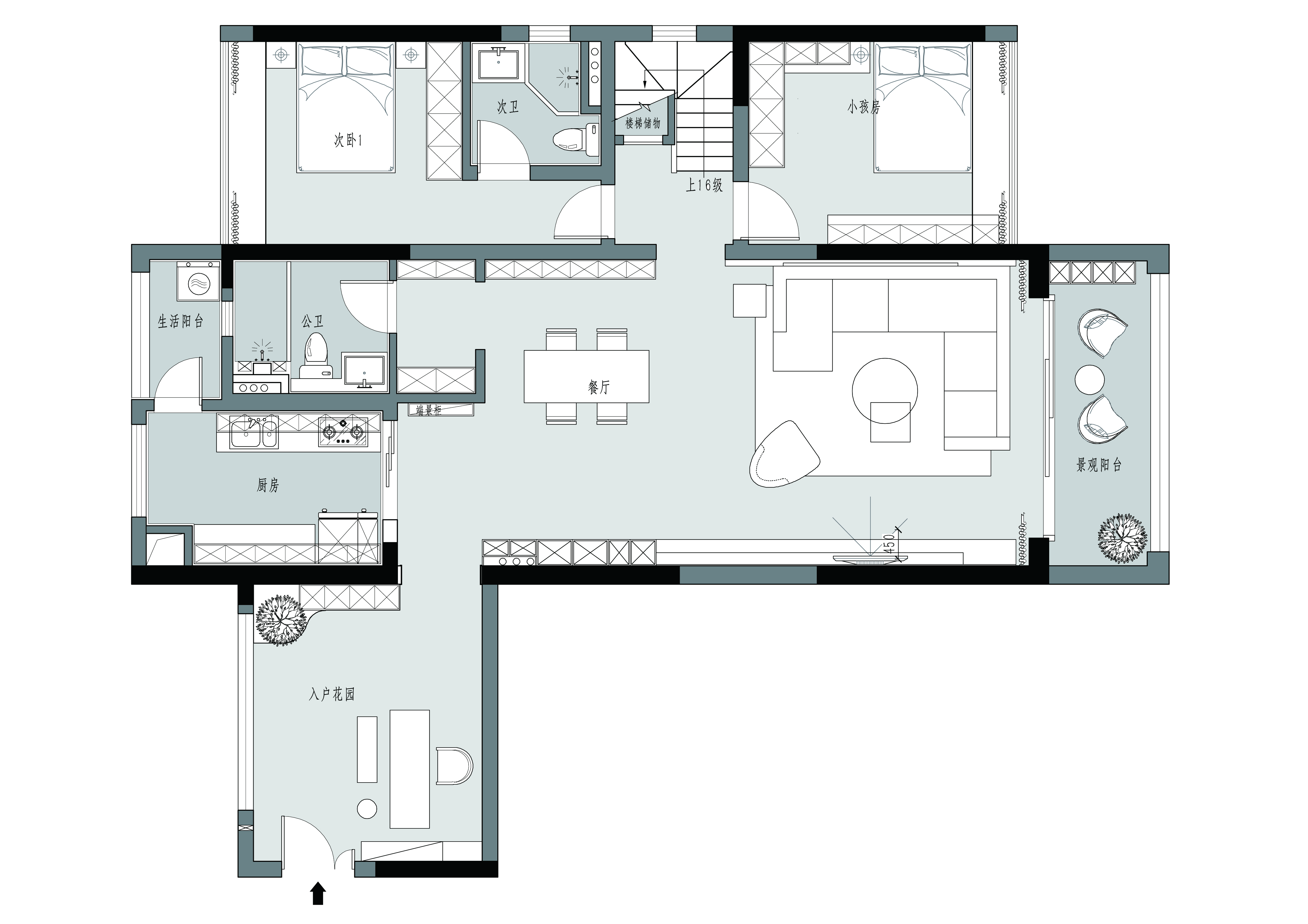 空间意境:因为本套案例在山边,景观非常好,在做规划的时候,就以景观为主,把室外景观通过规划,引入室内,坐着躺着都能欣赏风景。采光做到每个空间根据不同时段都有采光进入房间。