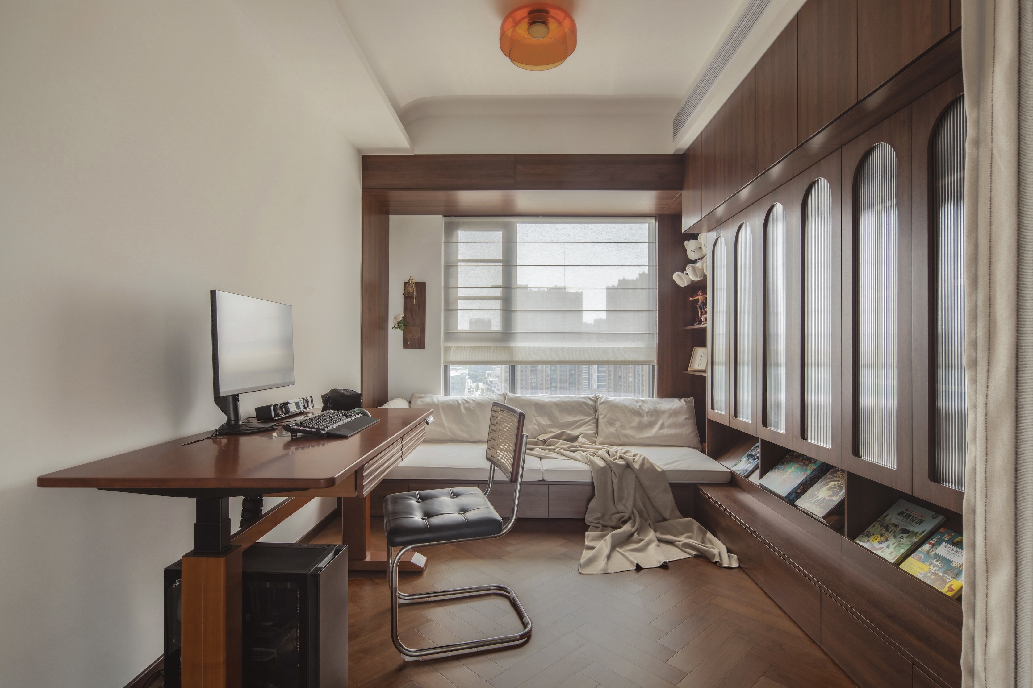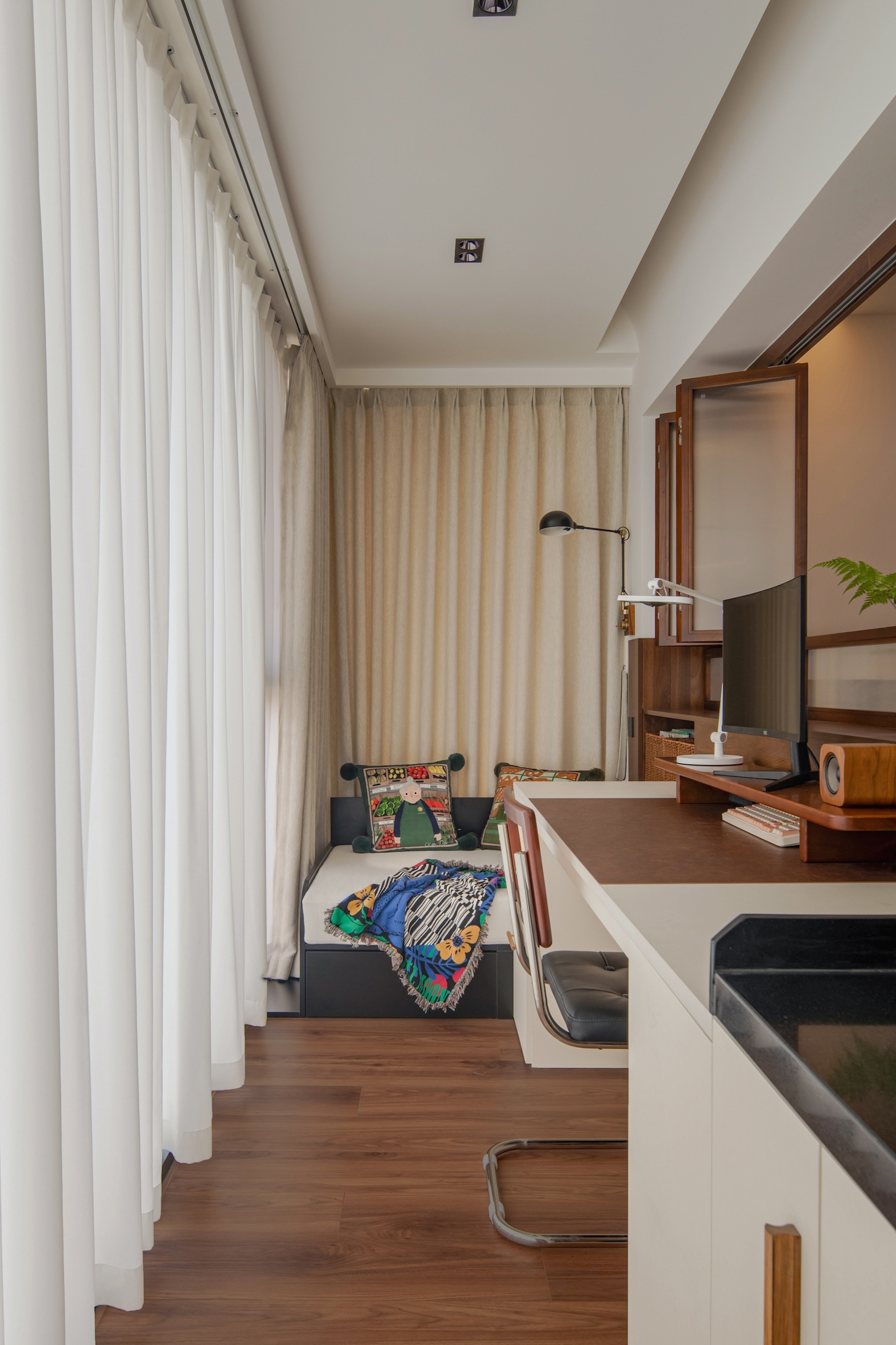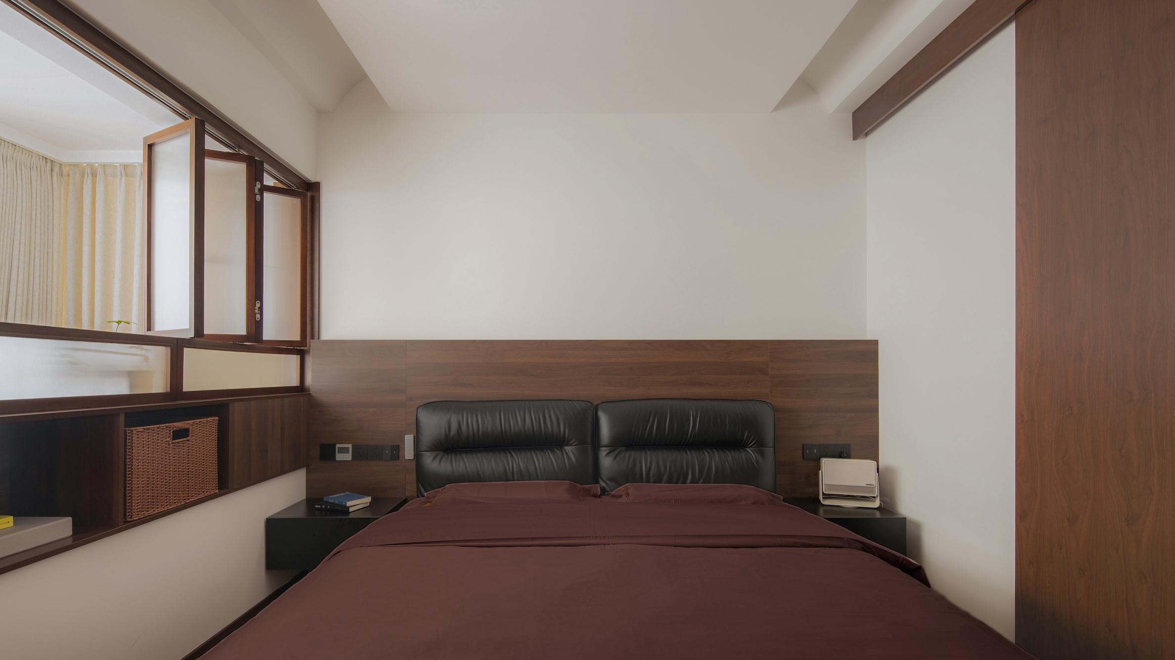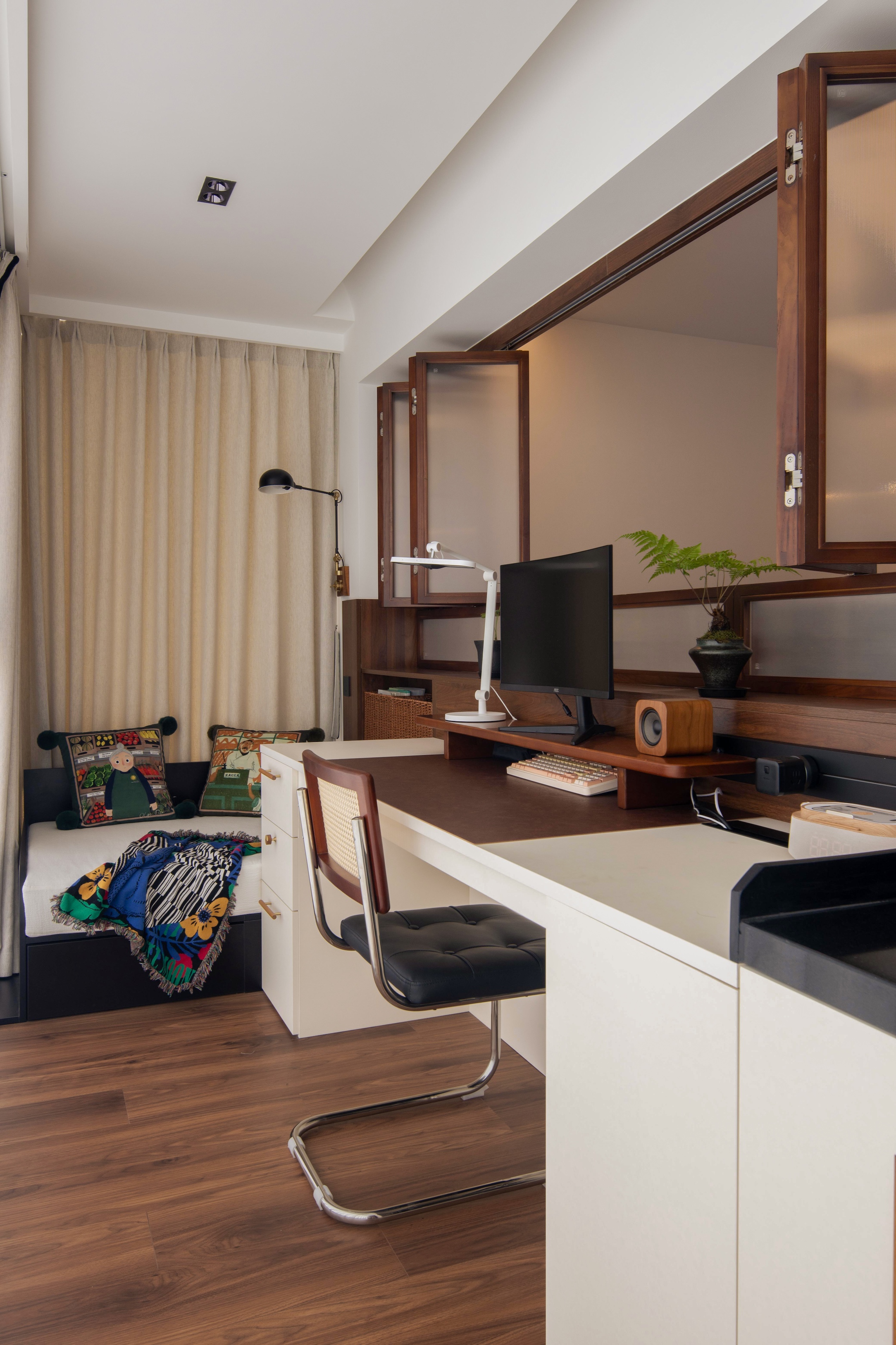 4、二楼是主卧室,原本有一块不大的阳台,阳台与主卧室之间的地面有一根高度50cm的过梁无法拆除,因此设计时我们以隔断书桌以及折叠窗的形式将两个空间联系到一起,业主可根据实际生活场景选择自由开合窗户。 -