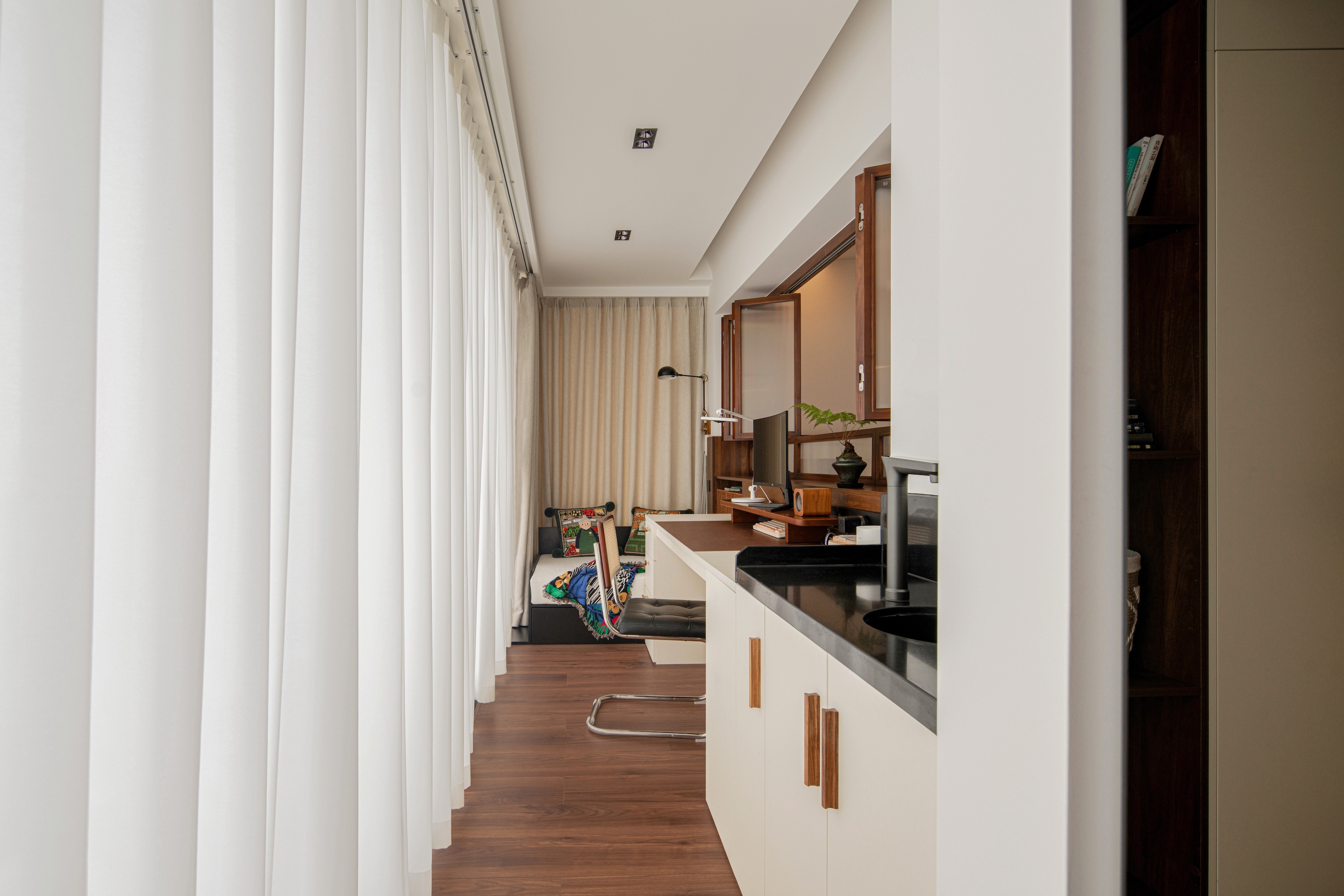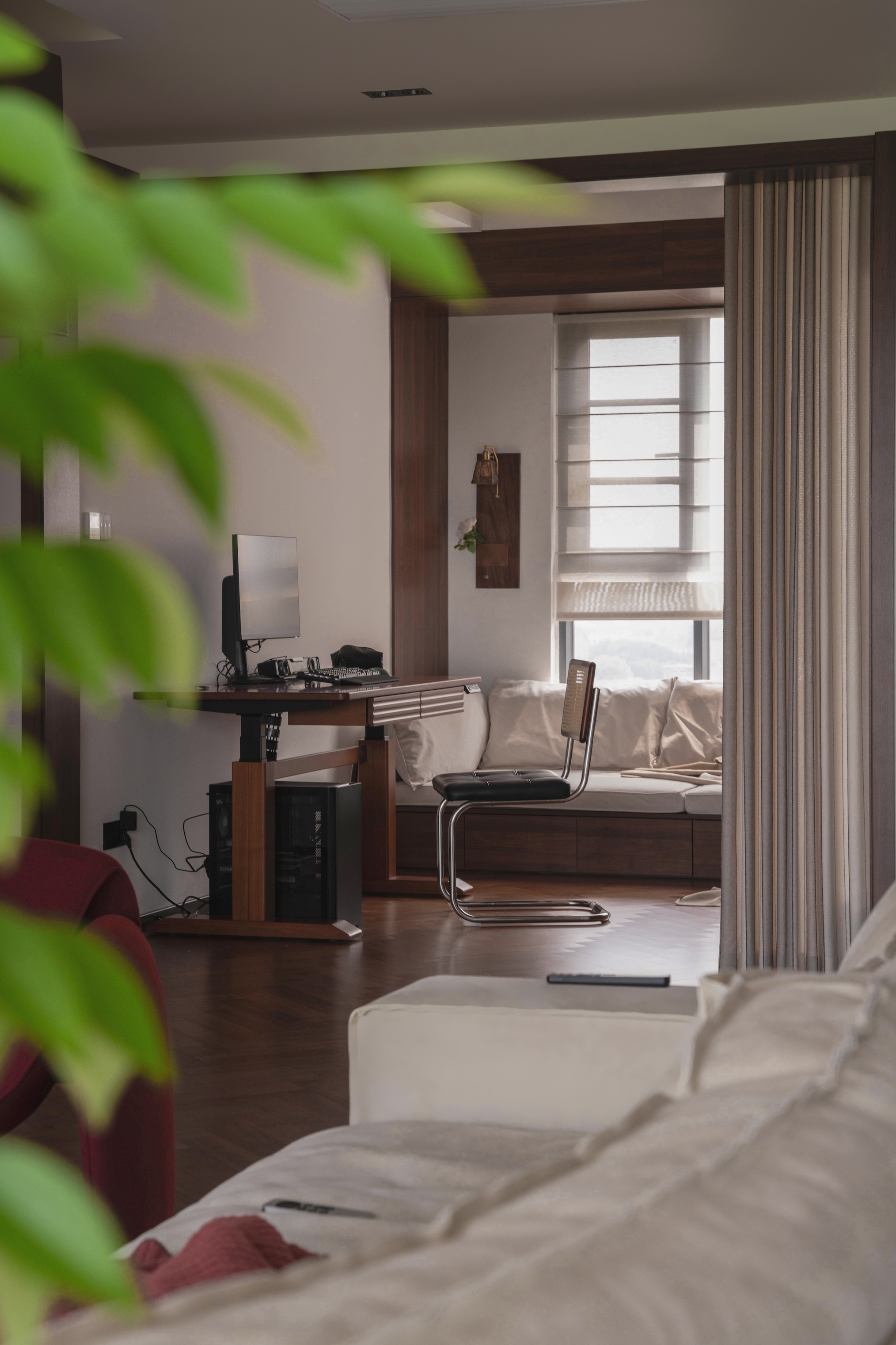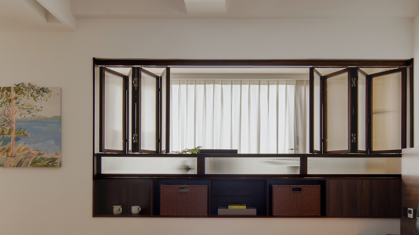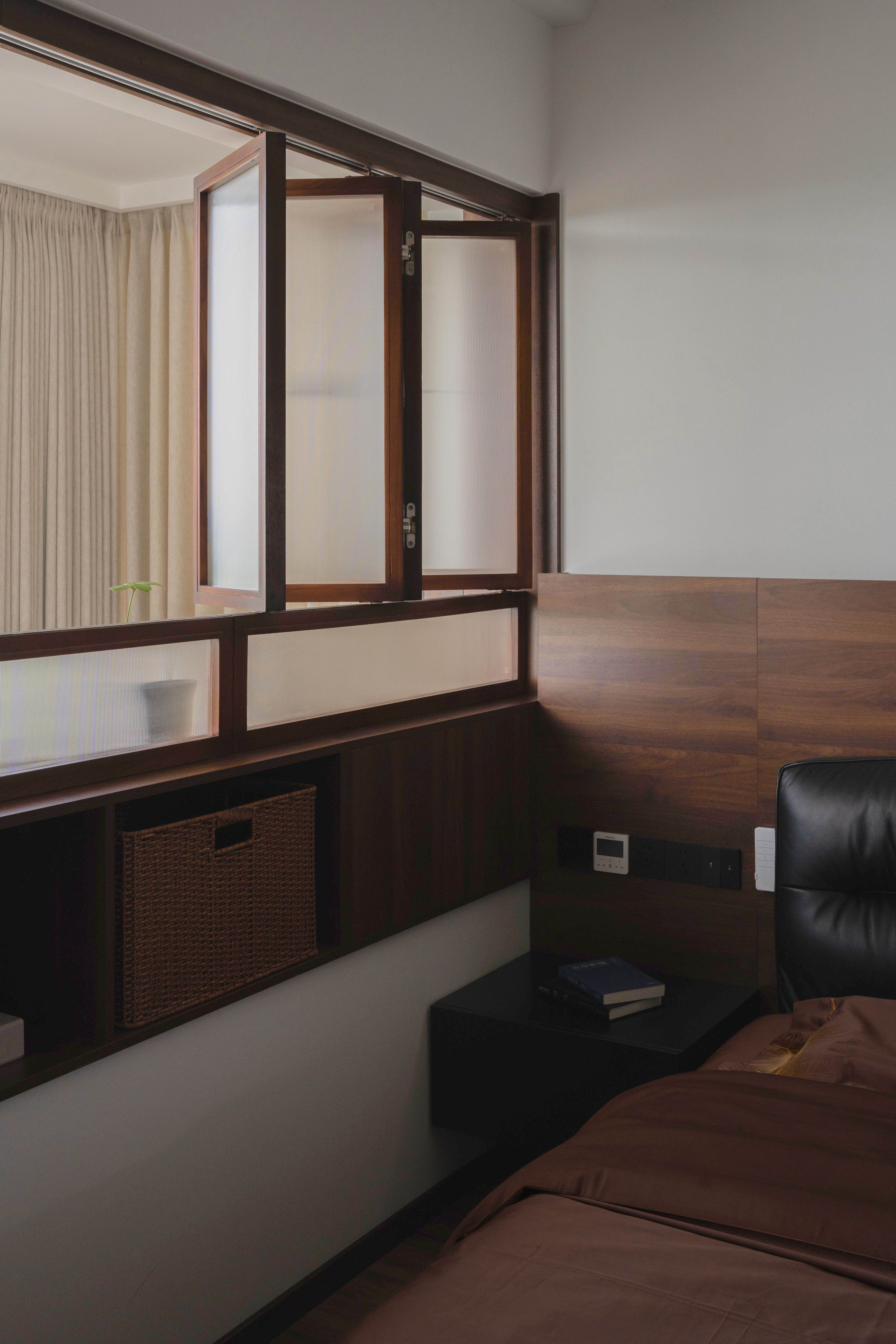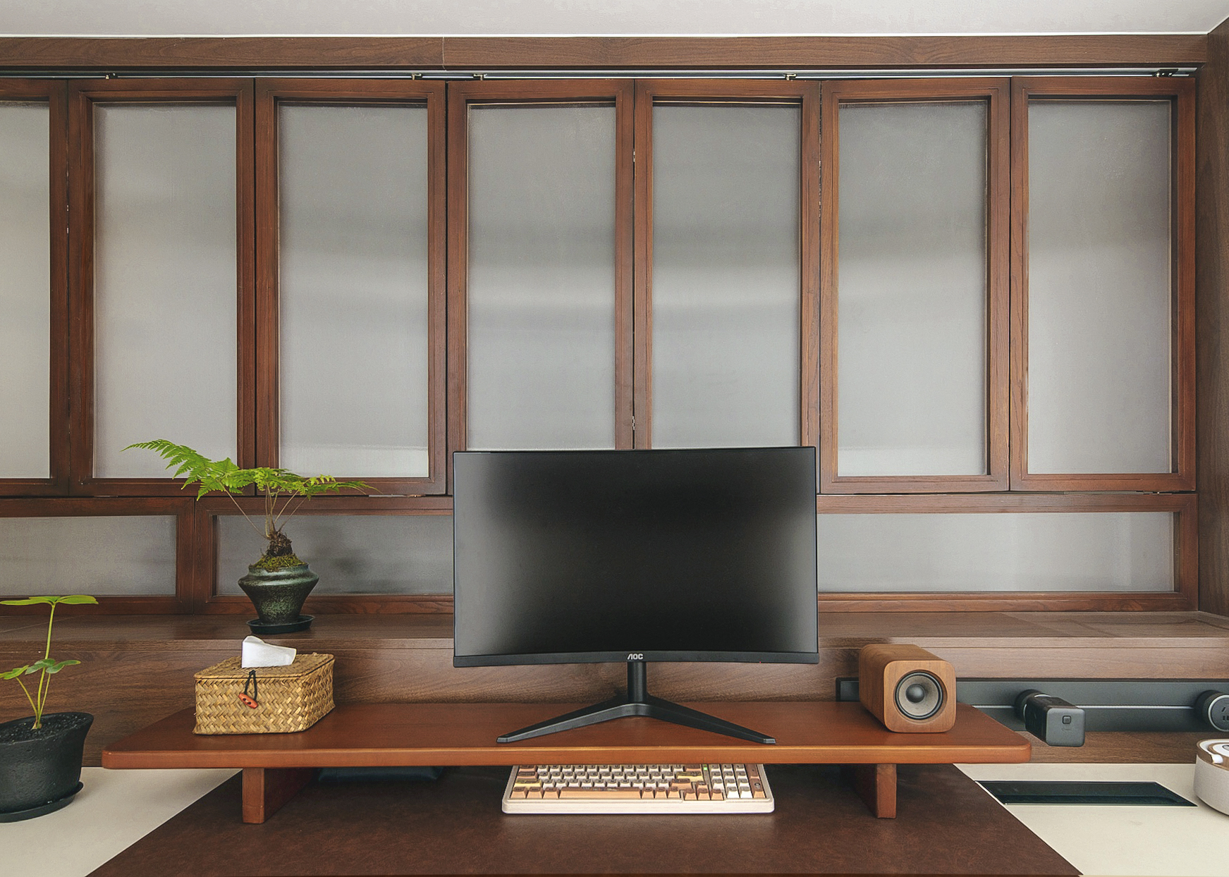 4、二楼是主卧室,原本有一块不大的阳台,阳台与主卧室之间的地面有一根高度50cm的过梁无法拆除,因此设计时我们以隔断书桌以及折叠窗的形式将两个空间联系到一起,业主可根据实际生活场景选择自由开合窗户。 -