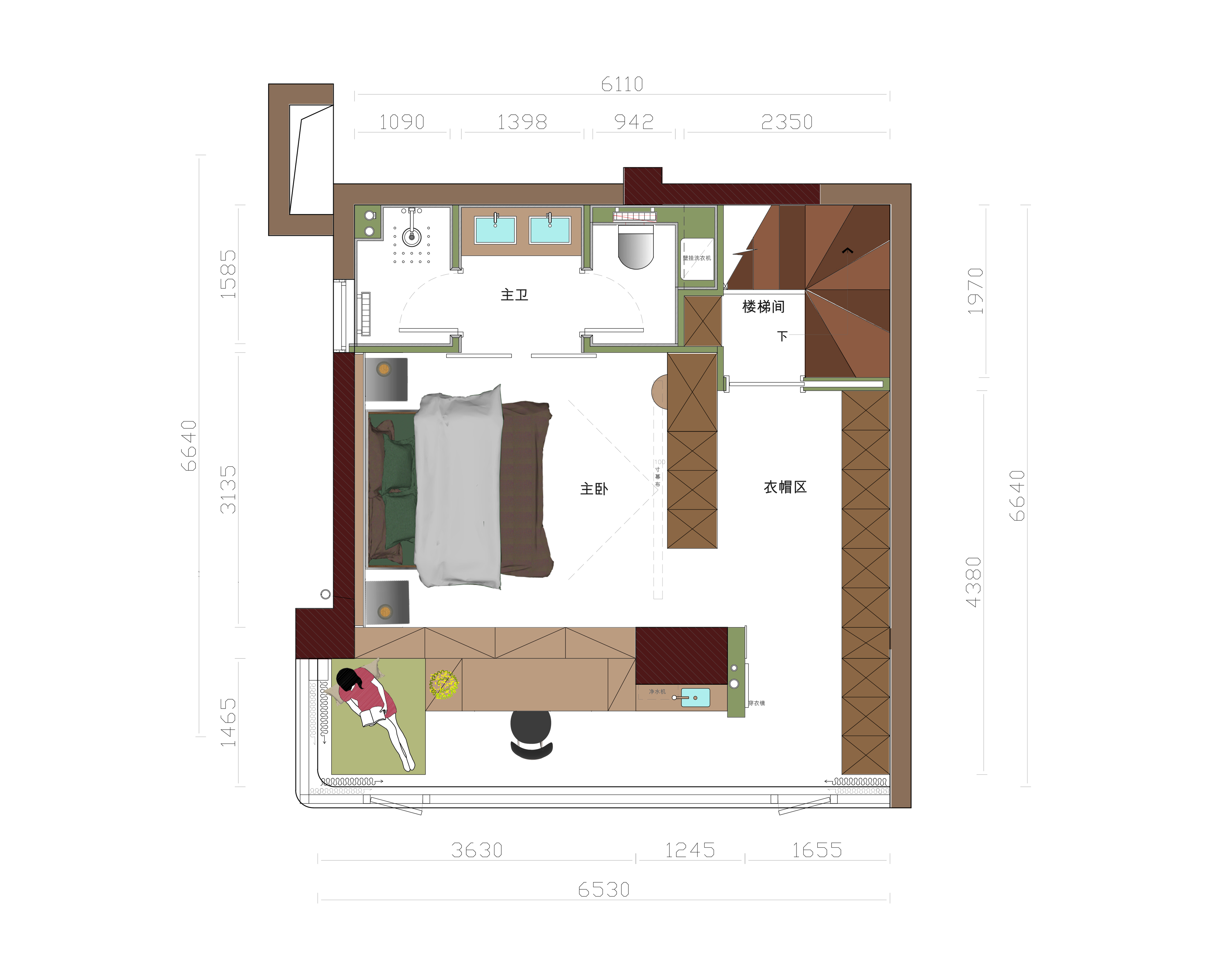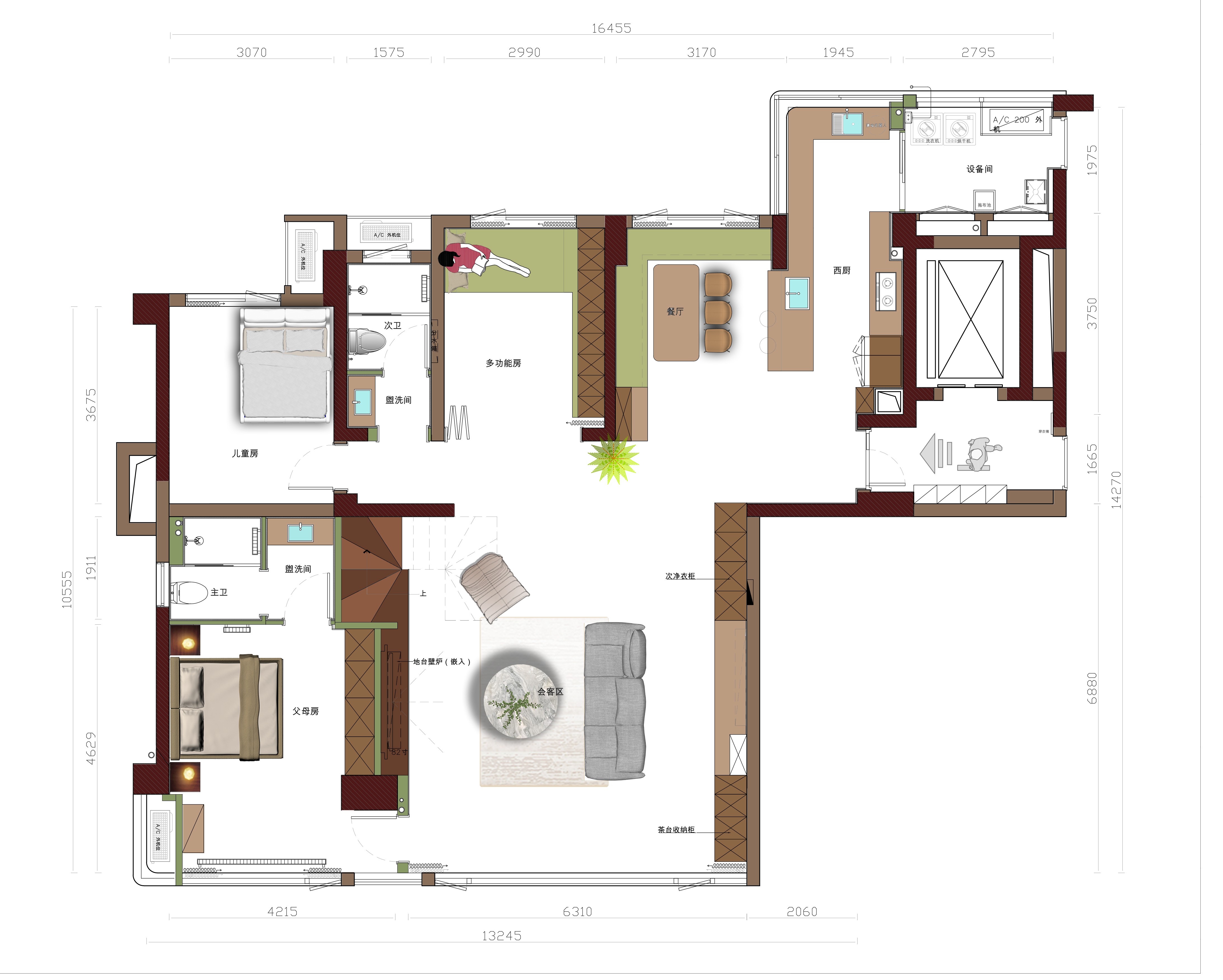 空间布局:本案户型是常见的复式四居室,结构上我们做了如下规划: