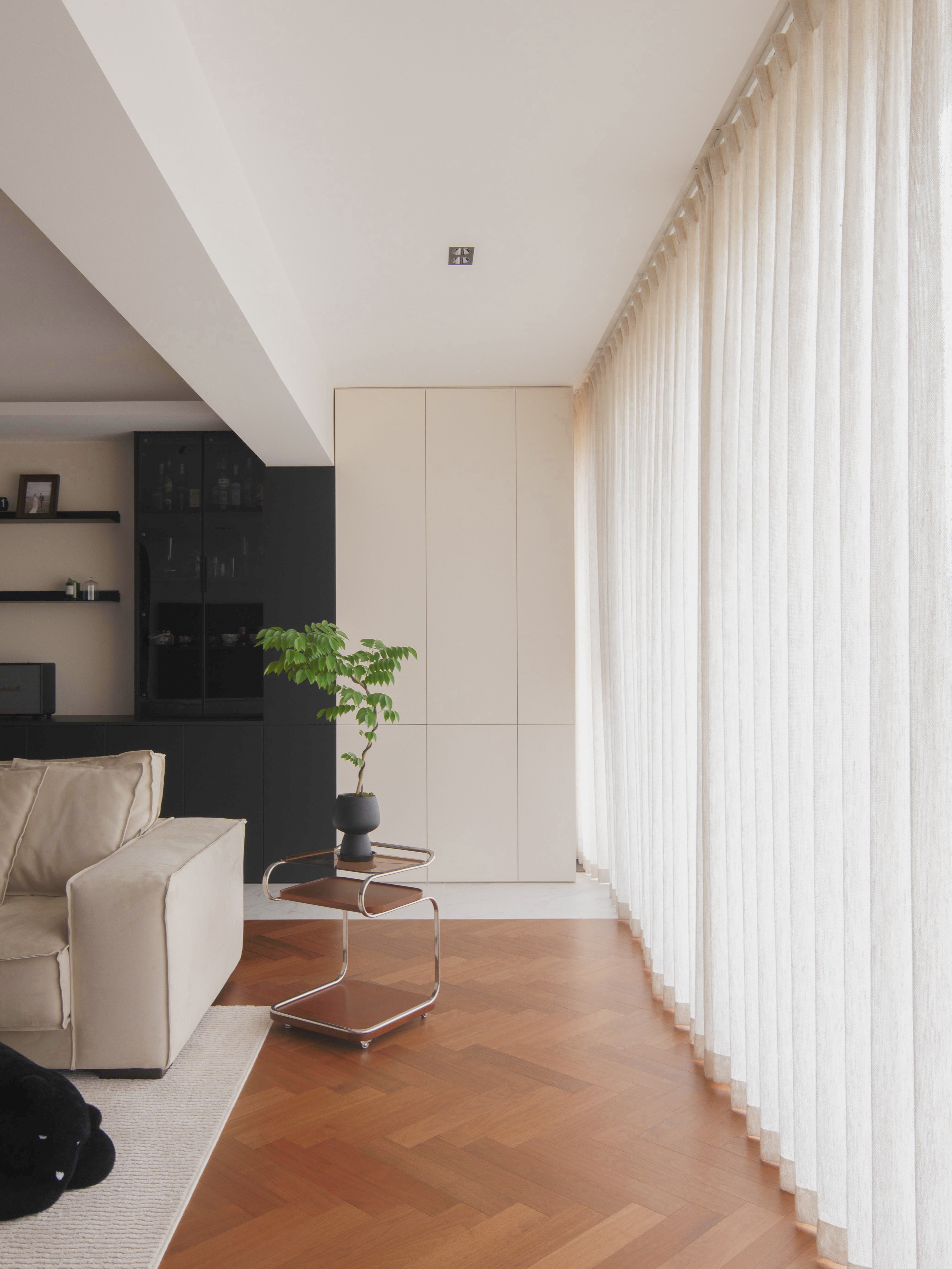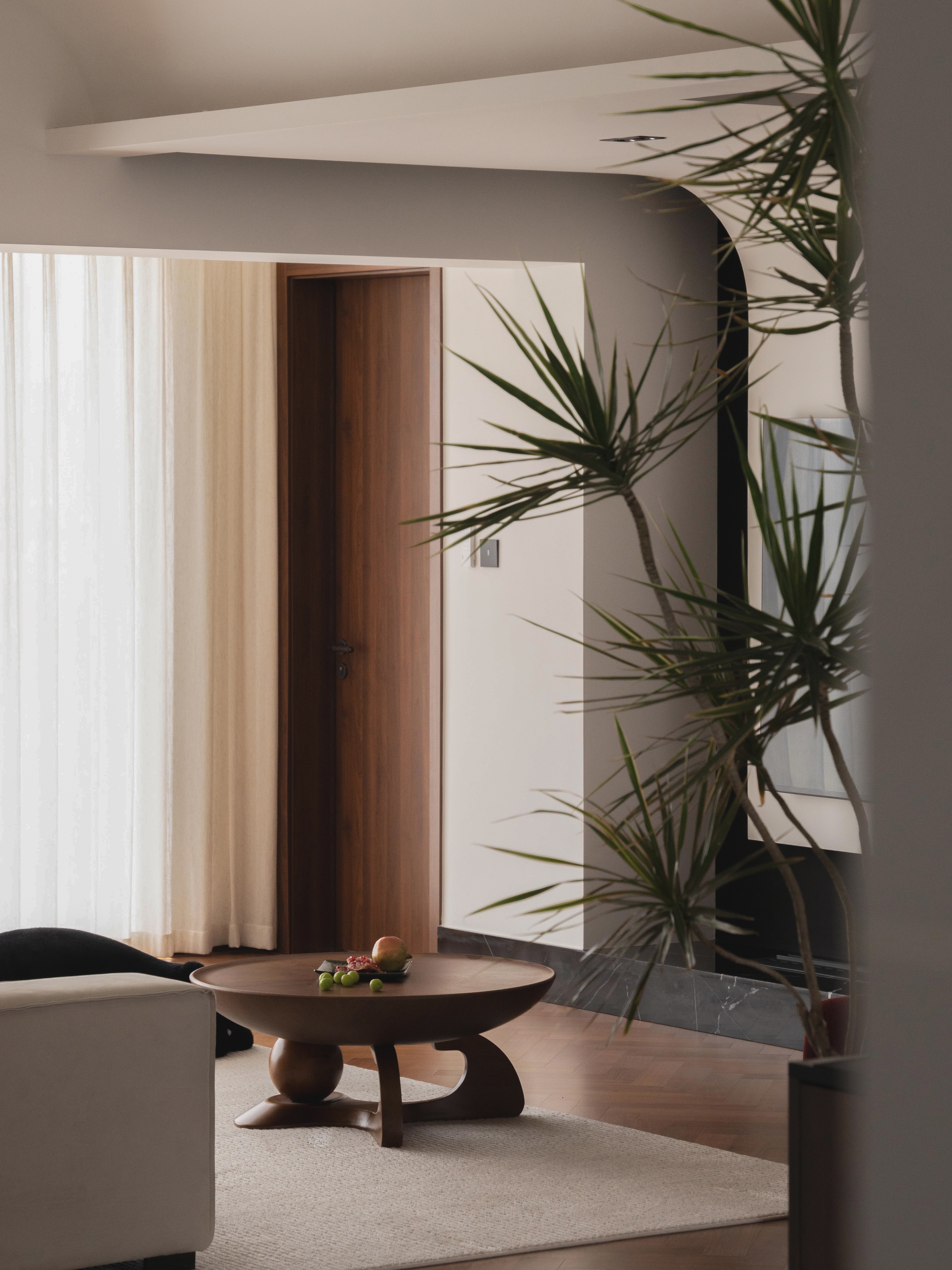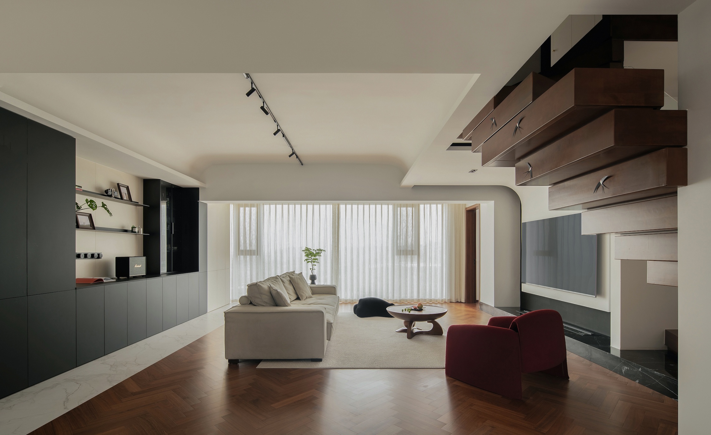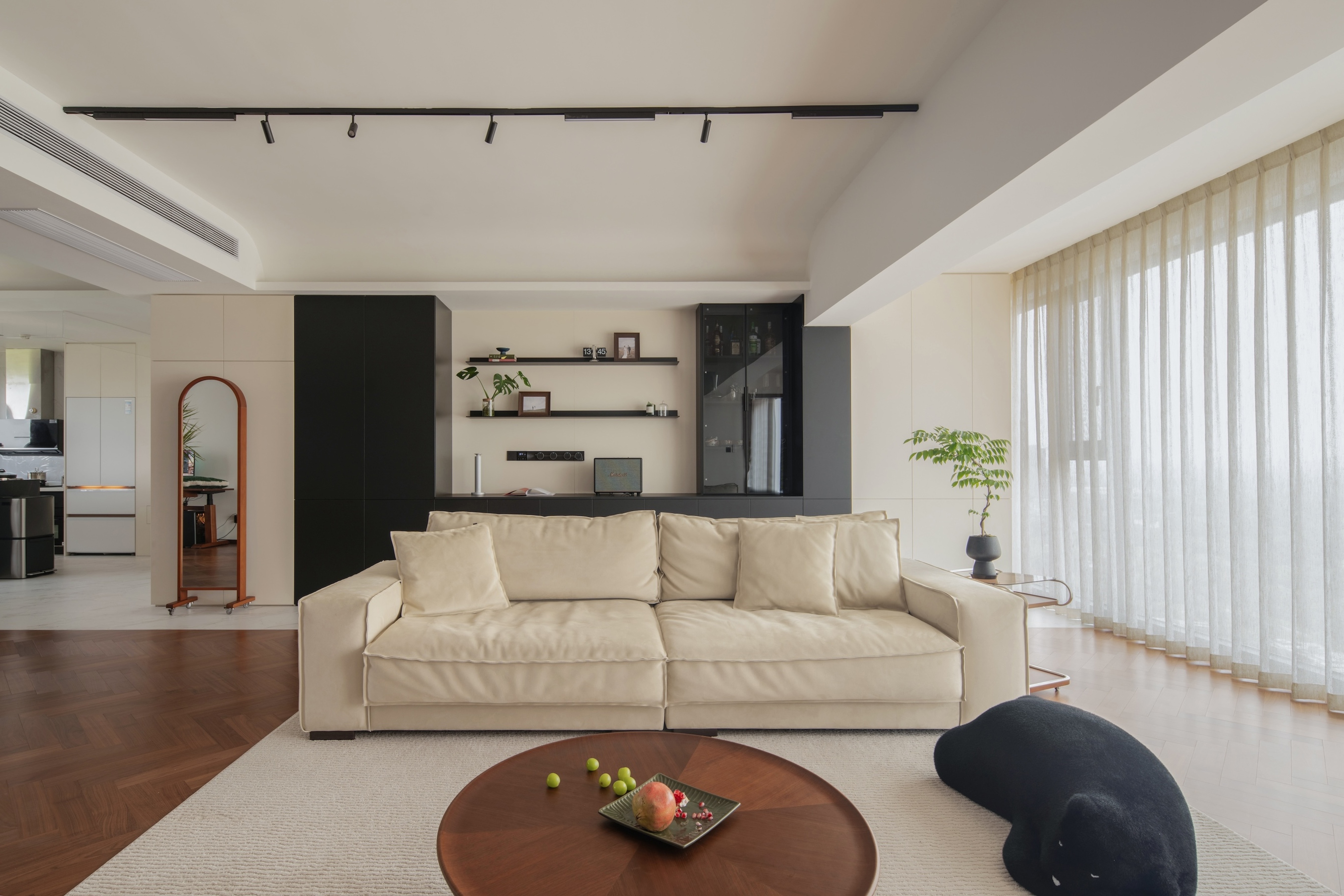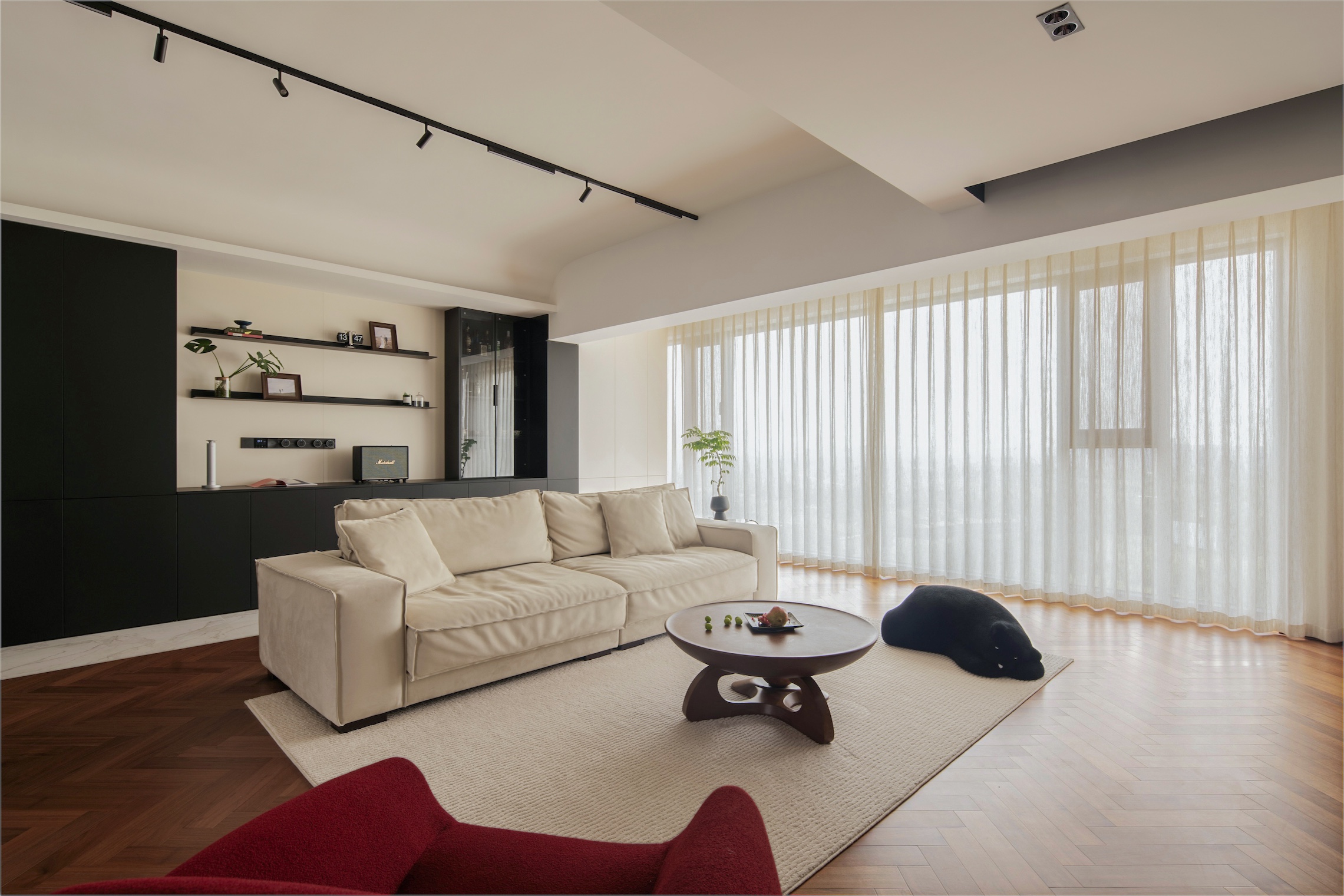 2、落地窗边的大横厅是整个房子的亮点,宽大的客厅在弧形电视墙的柔和烘托下氛围感拉满。