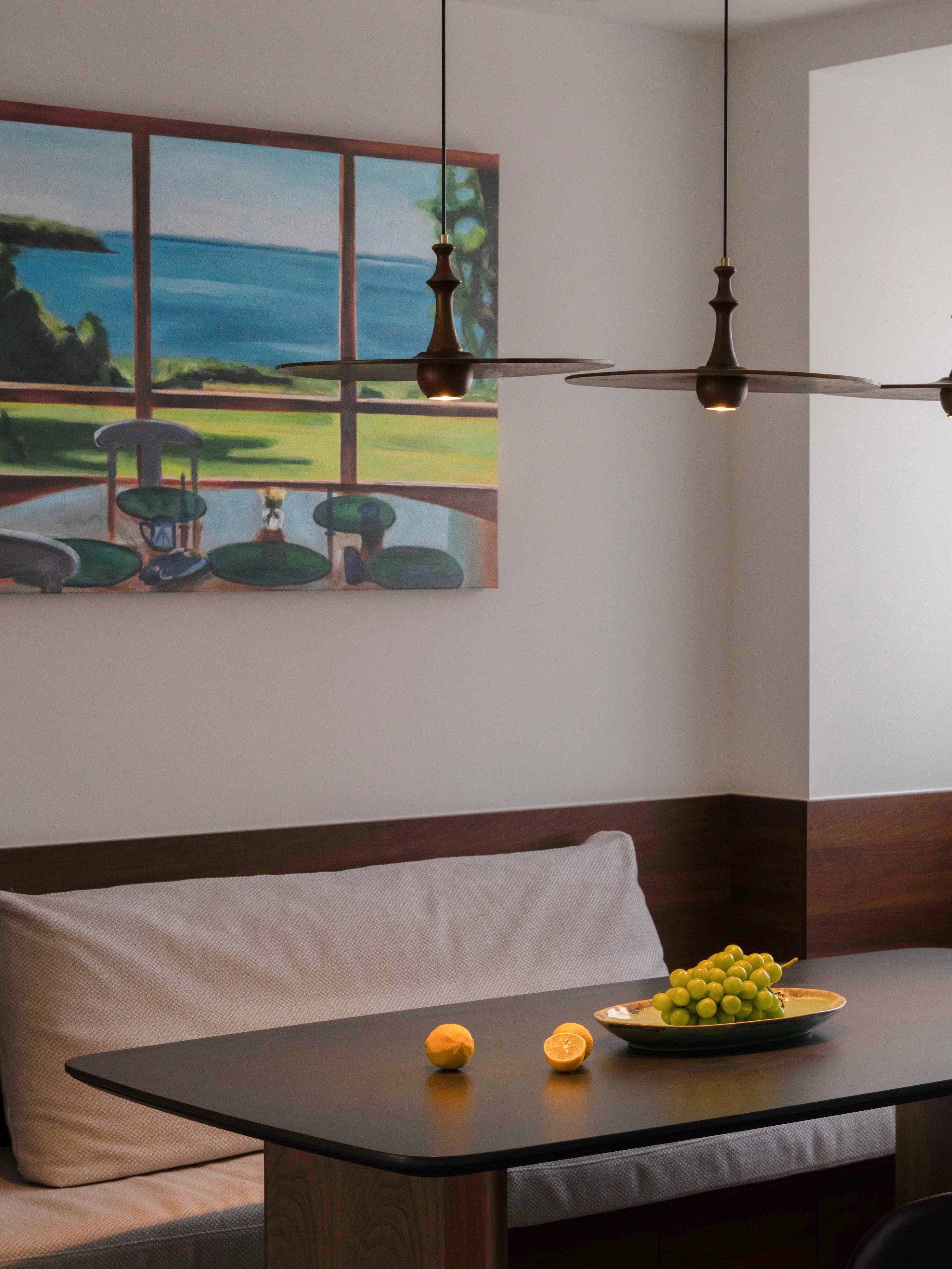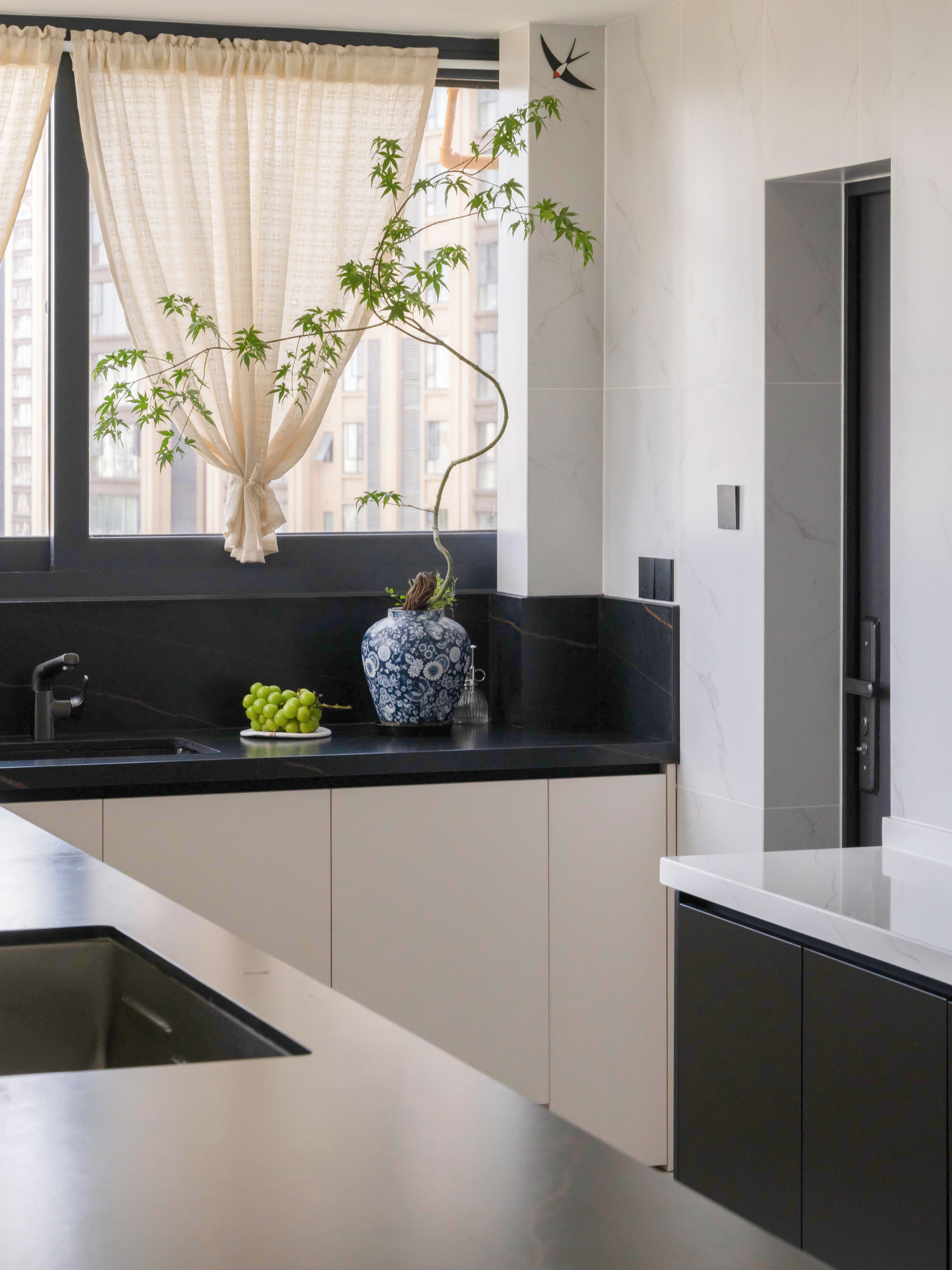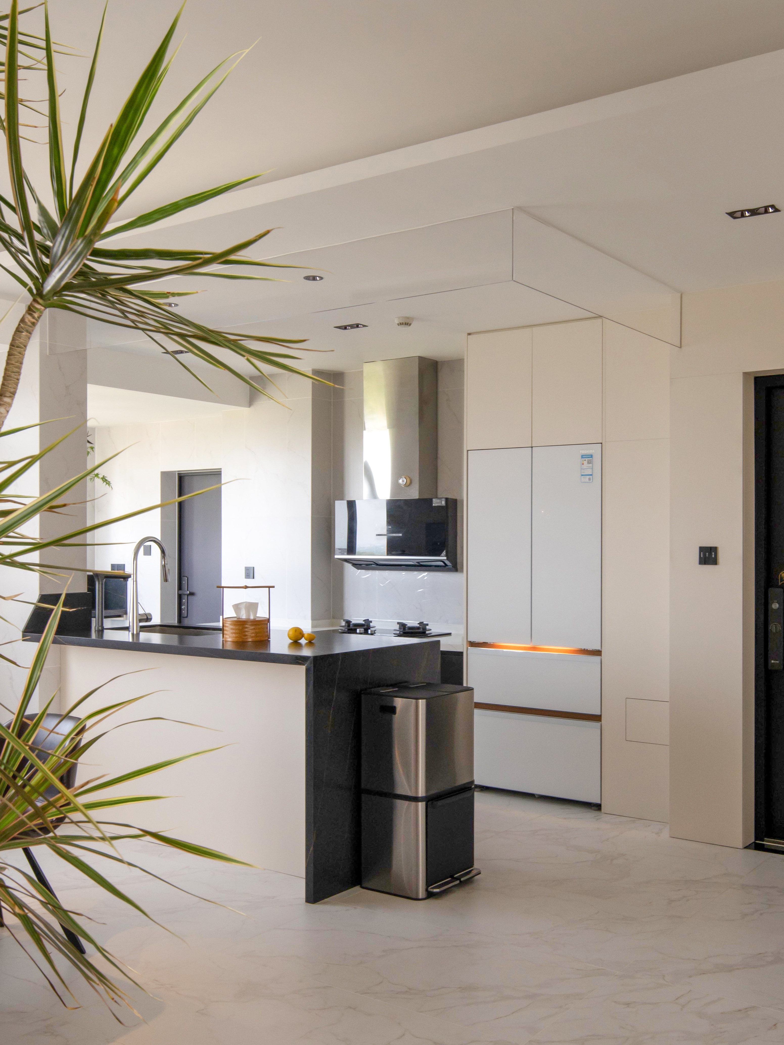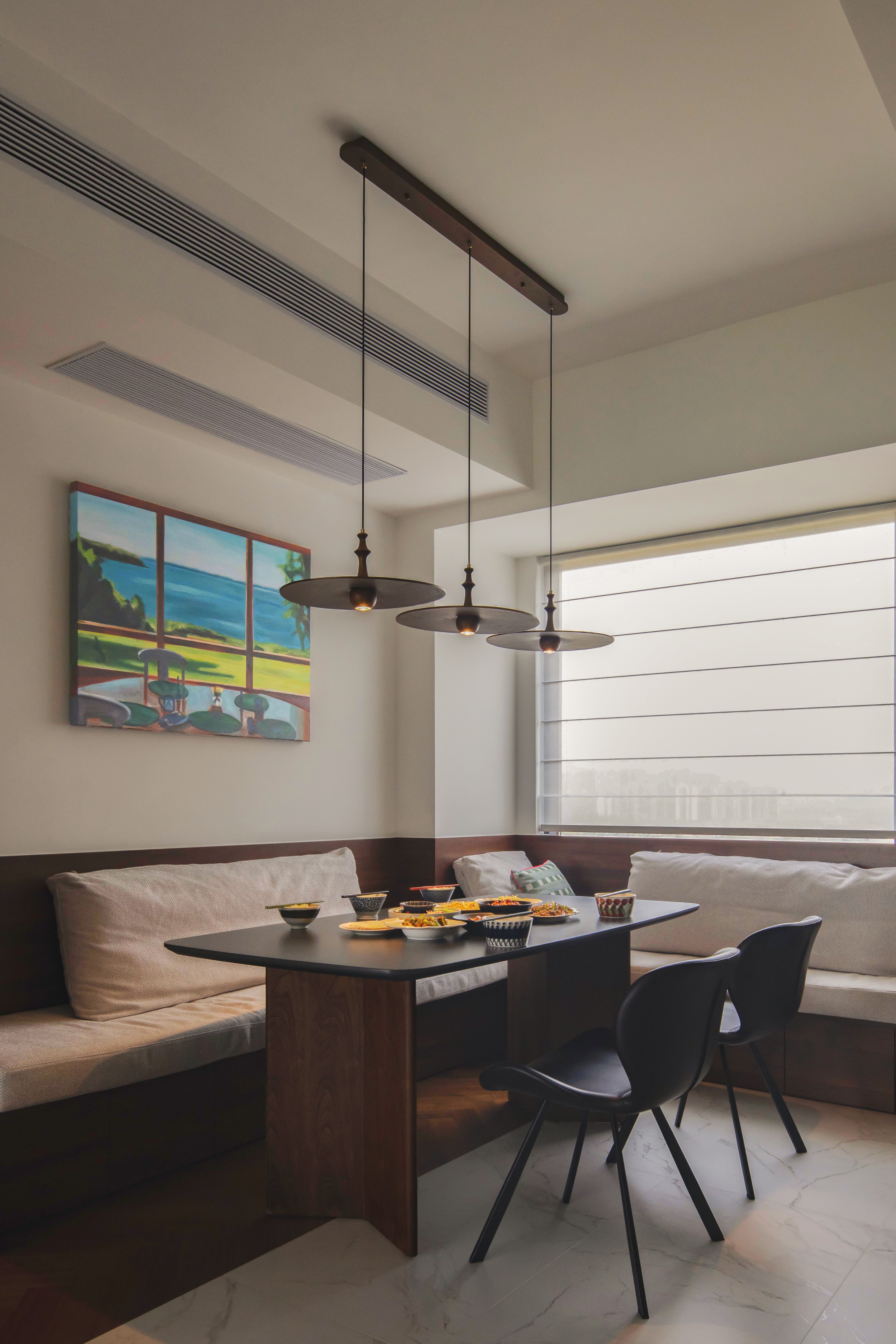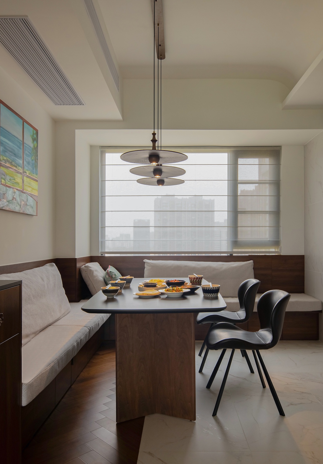 1、设计了一个开放式的厨房,同时将原来的客卧室墙体拆除,形成奢阔的餐厨空间;偶尔有聚餐需求,因此餐桌是被转角卡座以及独立餐椅围合起来,目的是可以容纳更多人一起用餐。