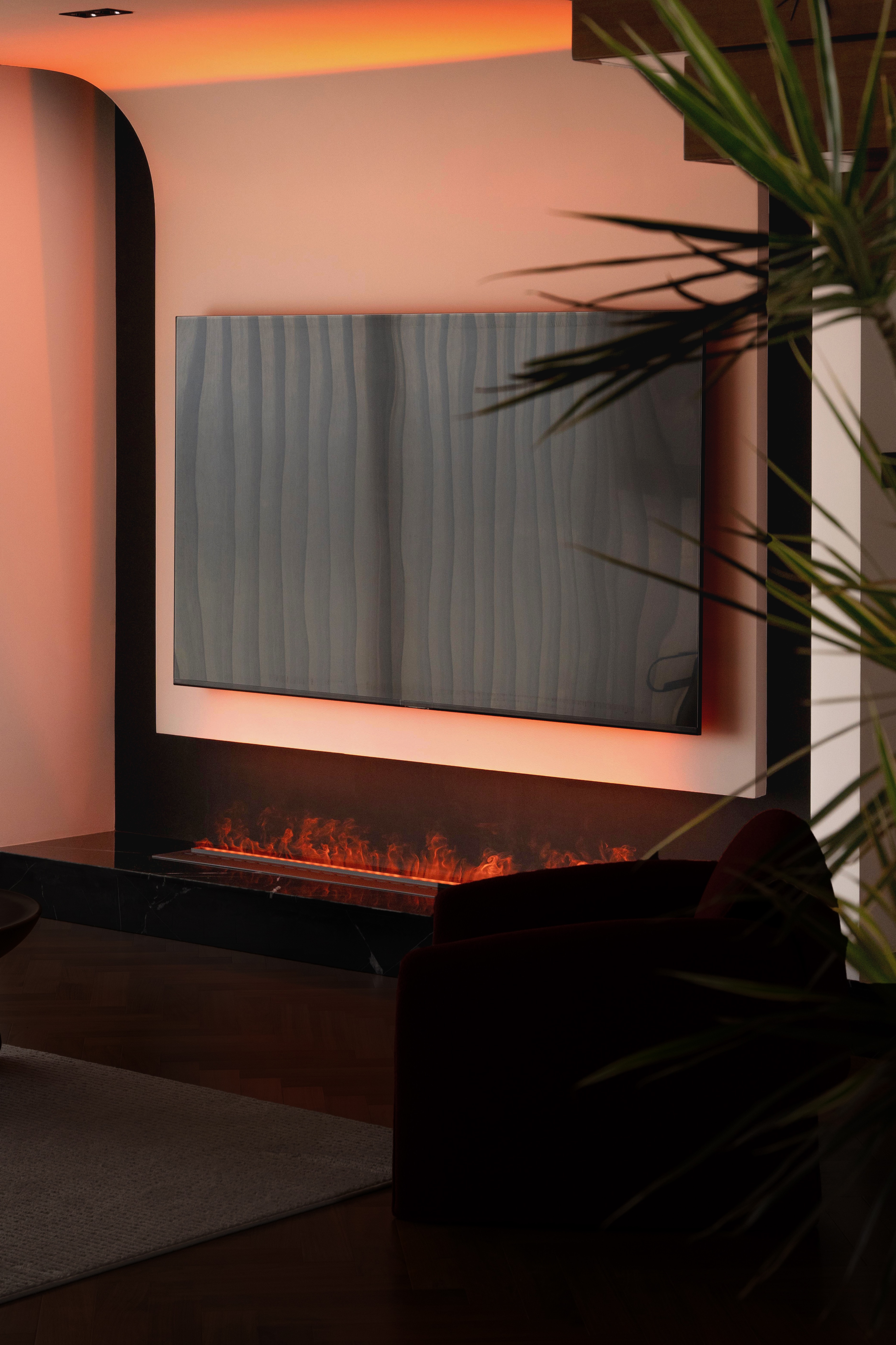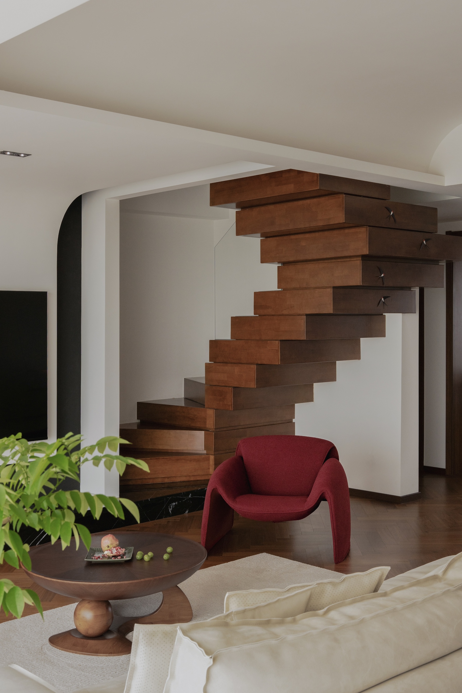 3、为了最大程度保证电视墙的完整性,设计了一款旋转而上的叠步楼梯作为一楼和二楼之间的通道,楼梯的第一步台阶自然延伸满整个电视墙,形成一个完整的空间模块。