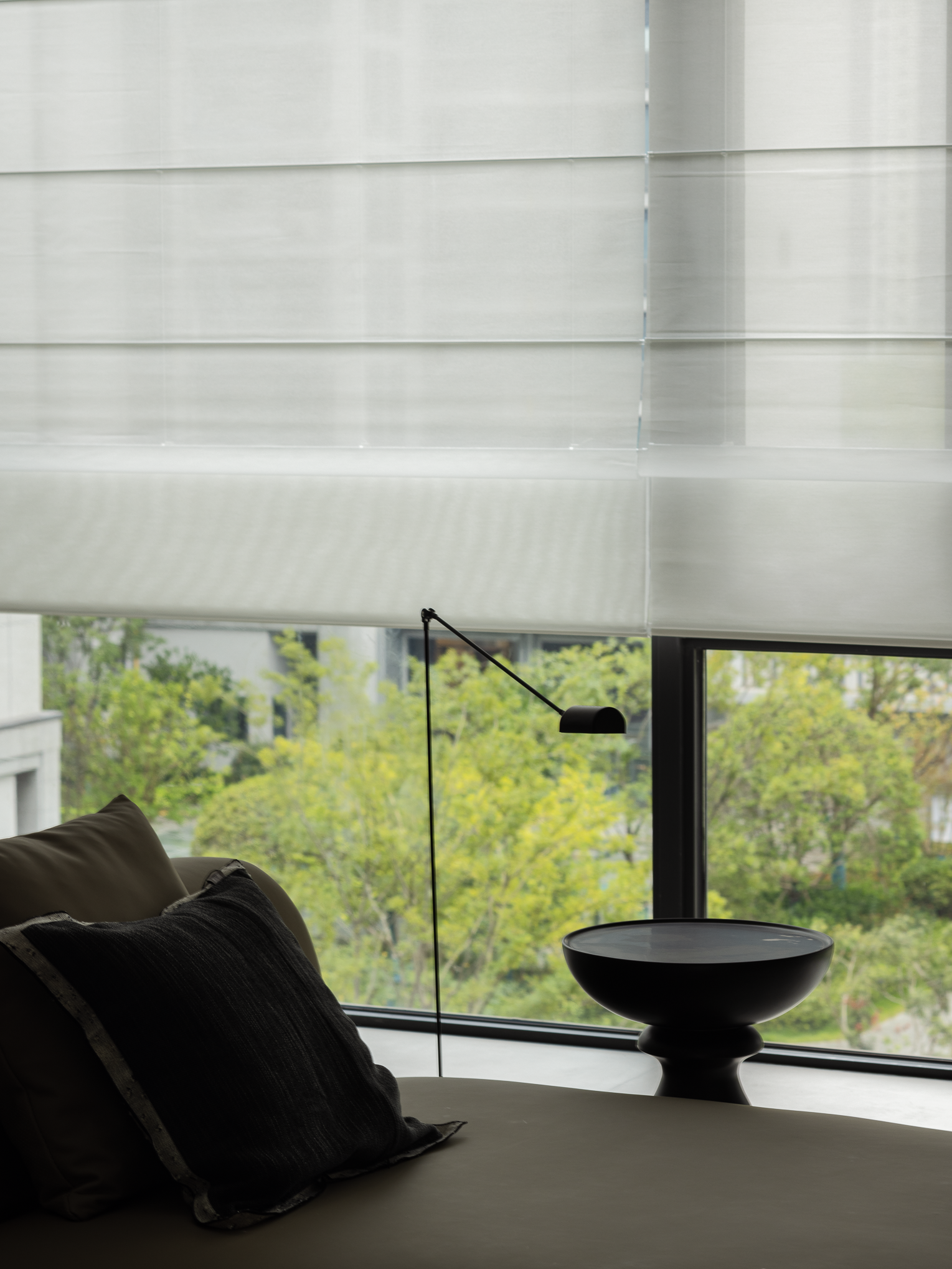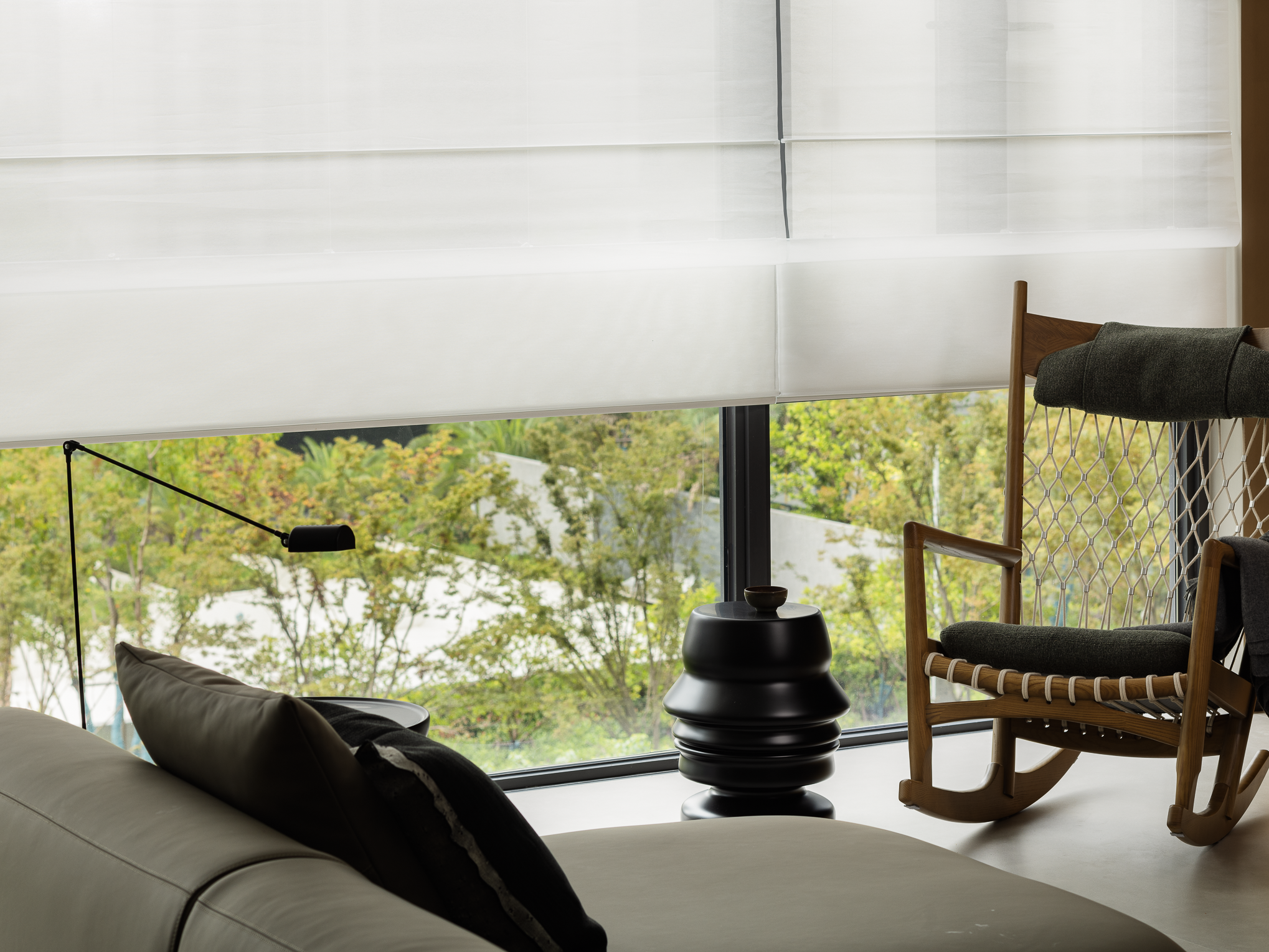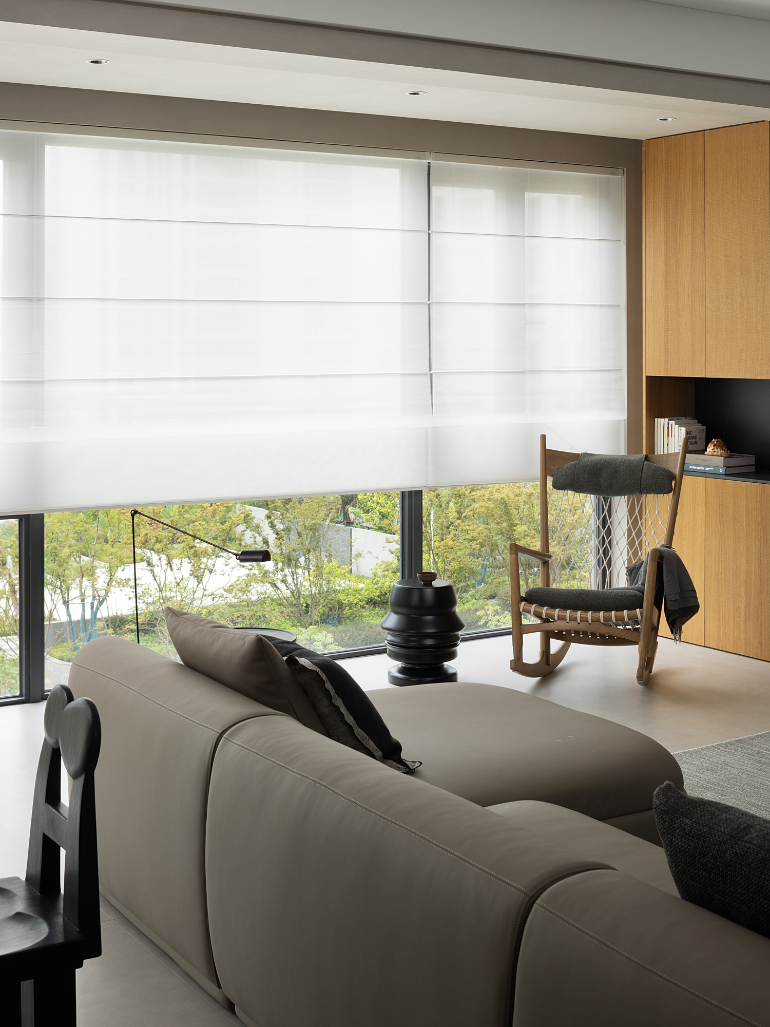 让艺术成为生活的载体,融合大落地窗与窗外美景,实现空间之美与功能需求的无缝融合。既强化了无敌窗景,又模糊了室内外关系,让空间得以极大的舒展、延伸……暖灰色皮质沙发与不规则黑色茶几相结合的组合方式,异形的边几搭配,立式台灯,网织单椅...多重角度思考并塑造动态表现形式,实现空间的一致性魅力,满足不同功能和情感需求。
