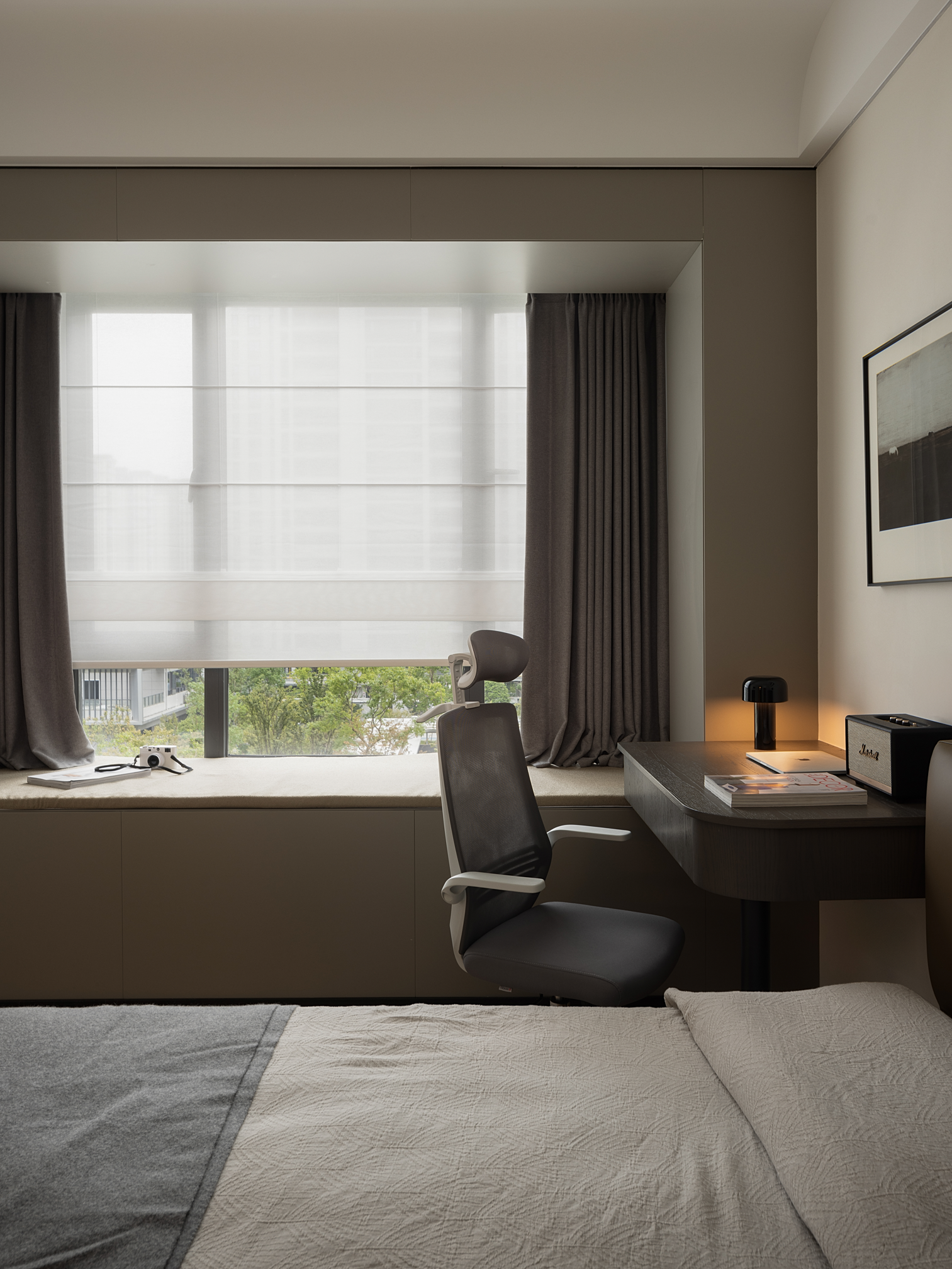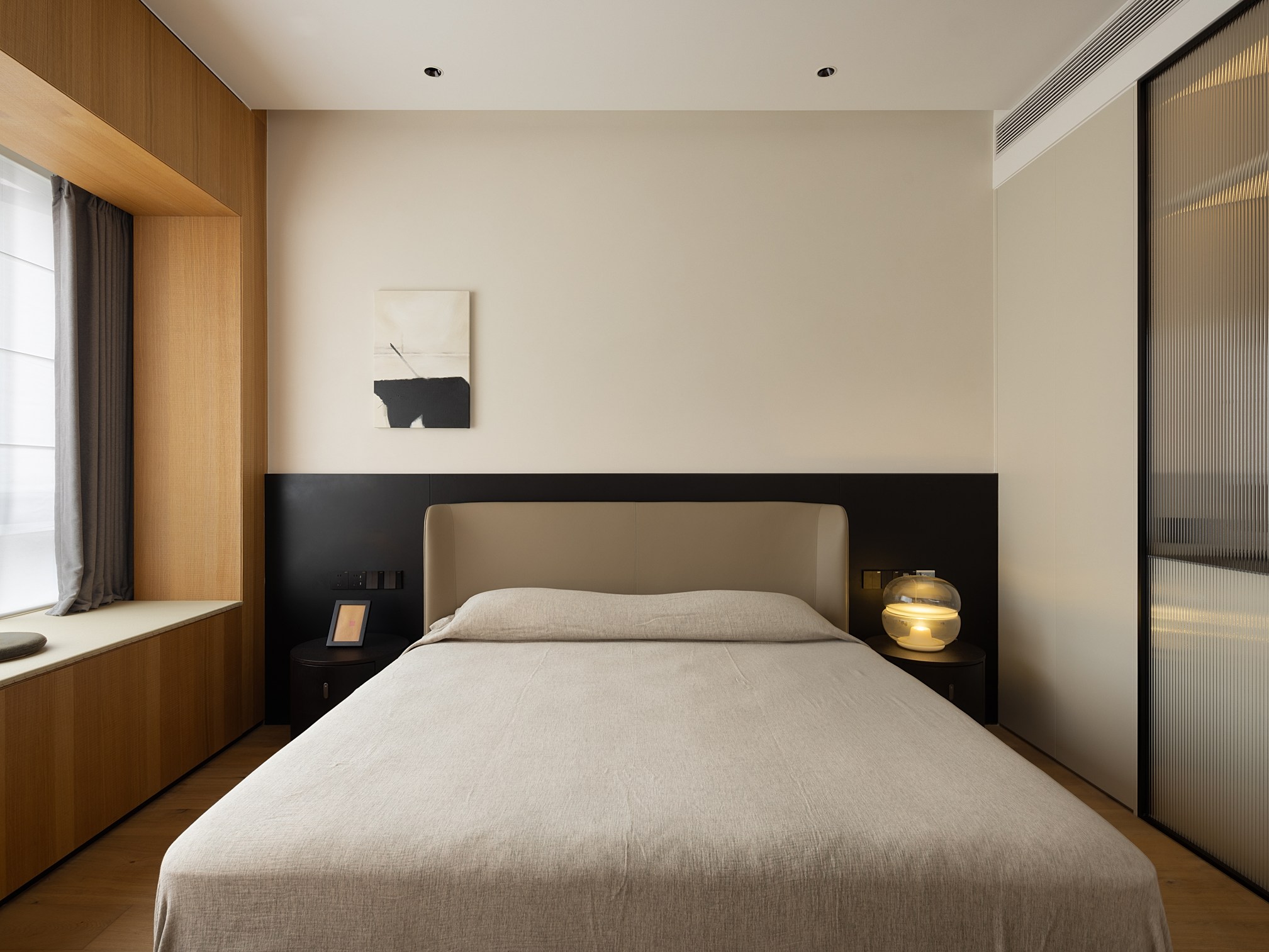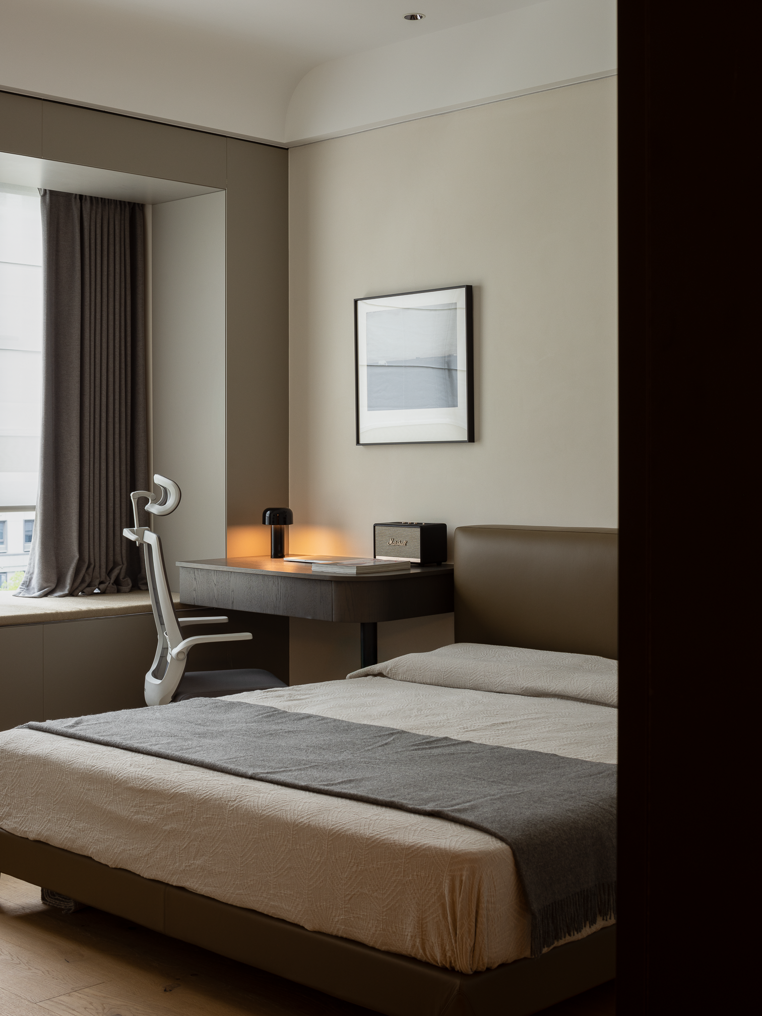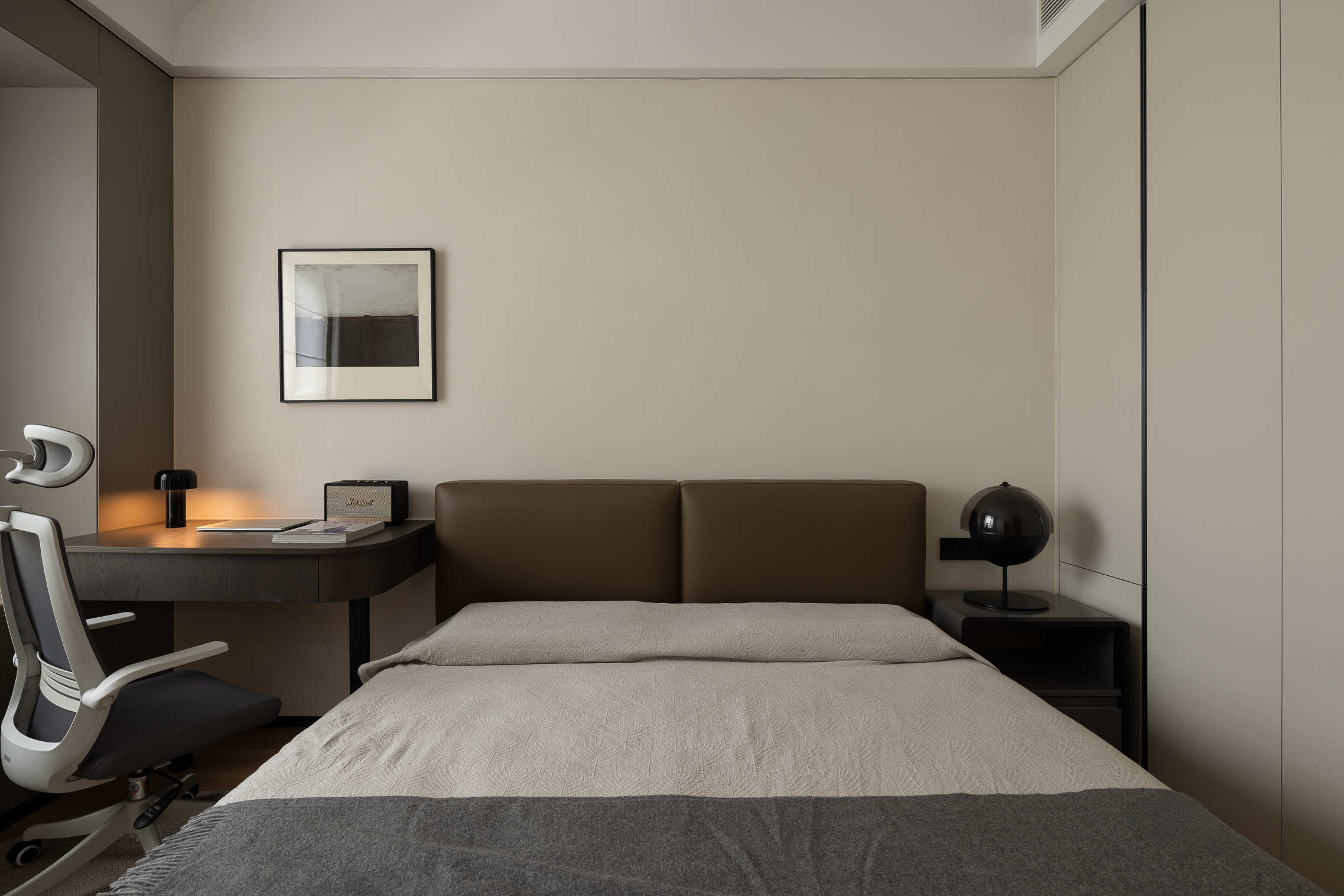 次卧空间以暖灰色调为主基调,整个空间安静又有质感,简单的装饰画点缀丰富了整个空间的层次感。