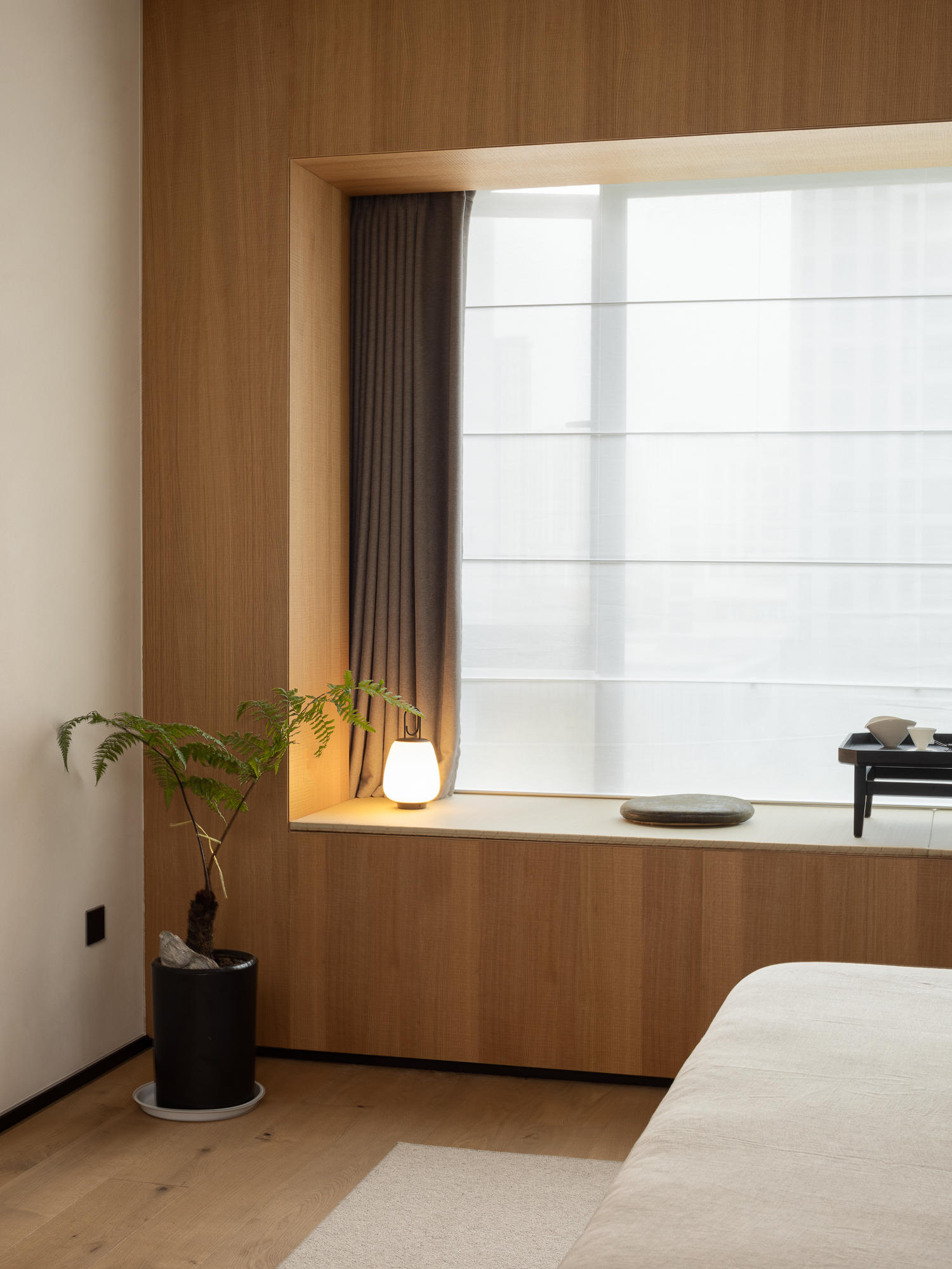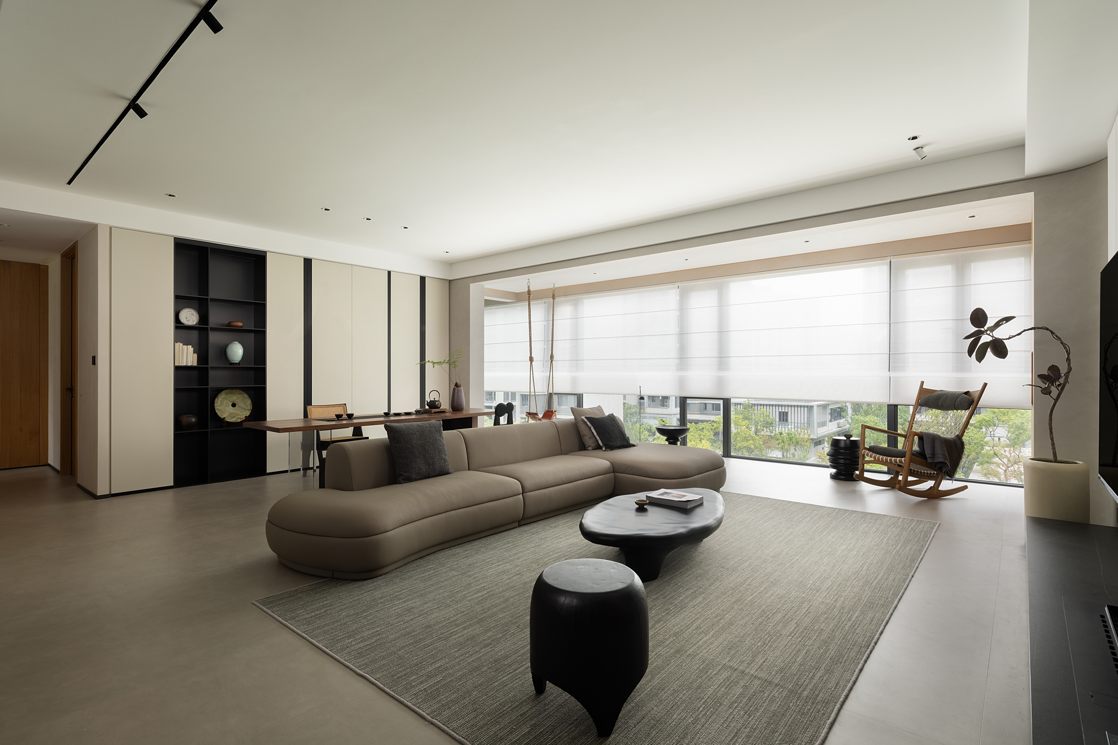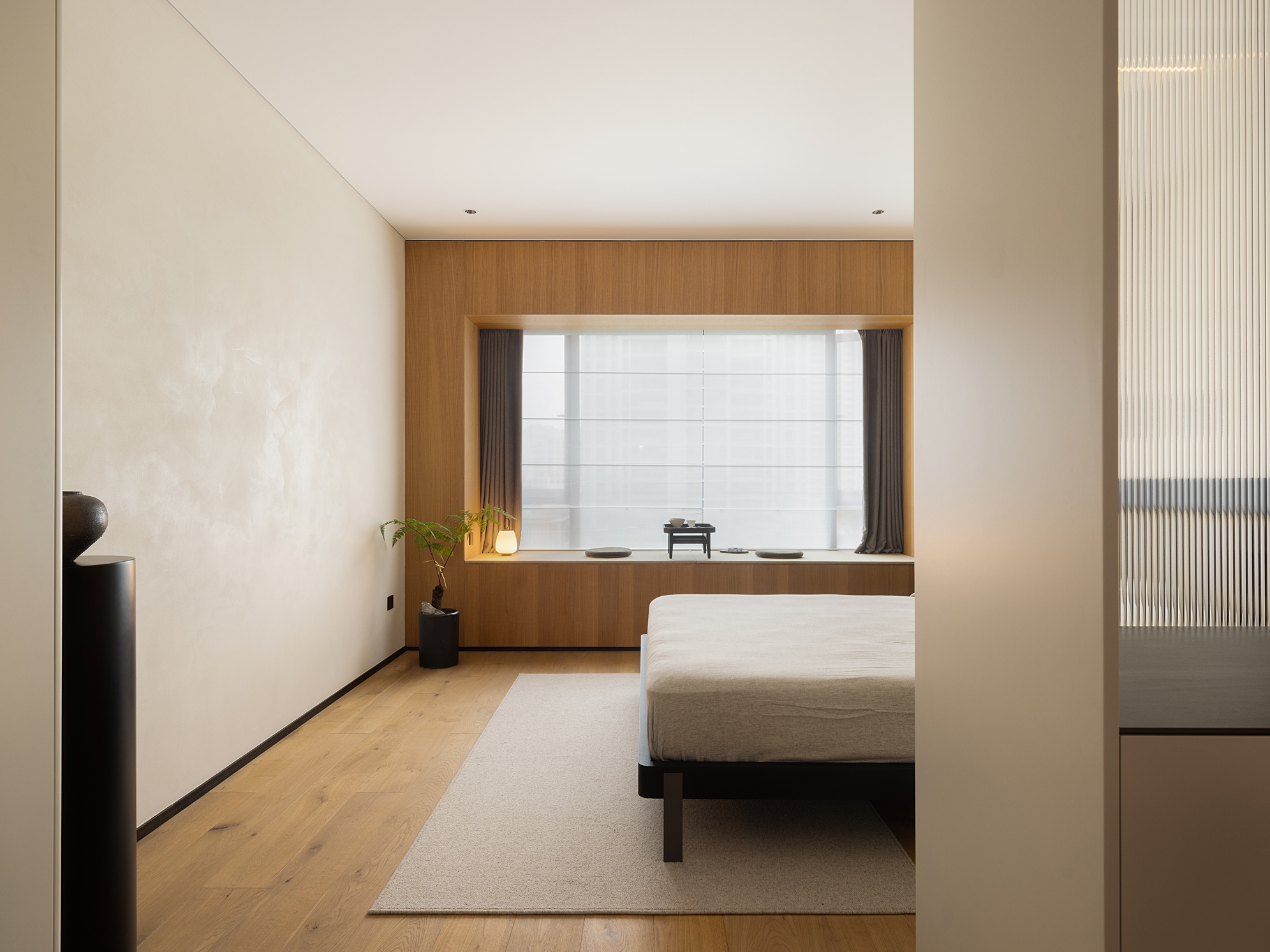 空间意境:中性色调的简约风,令空间温婉亦不失稳重;局部空间的深色规划增加空间的层次与体验