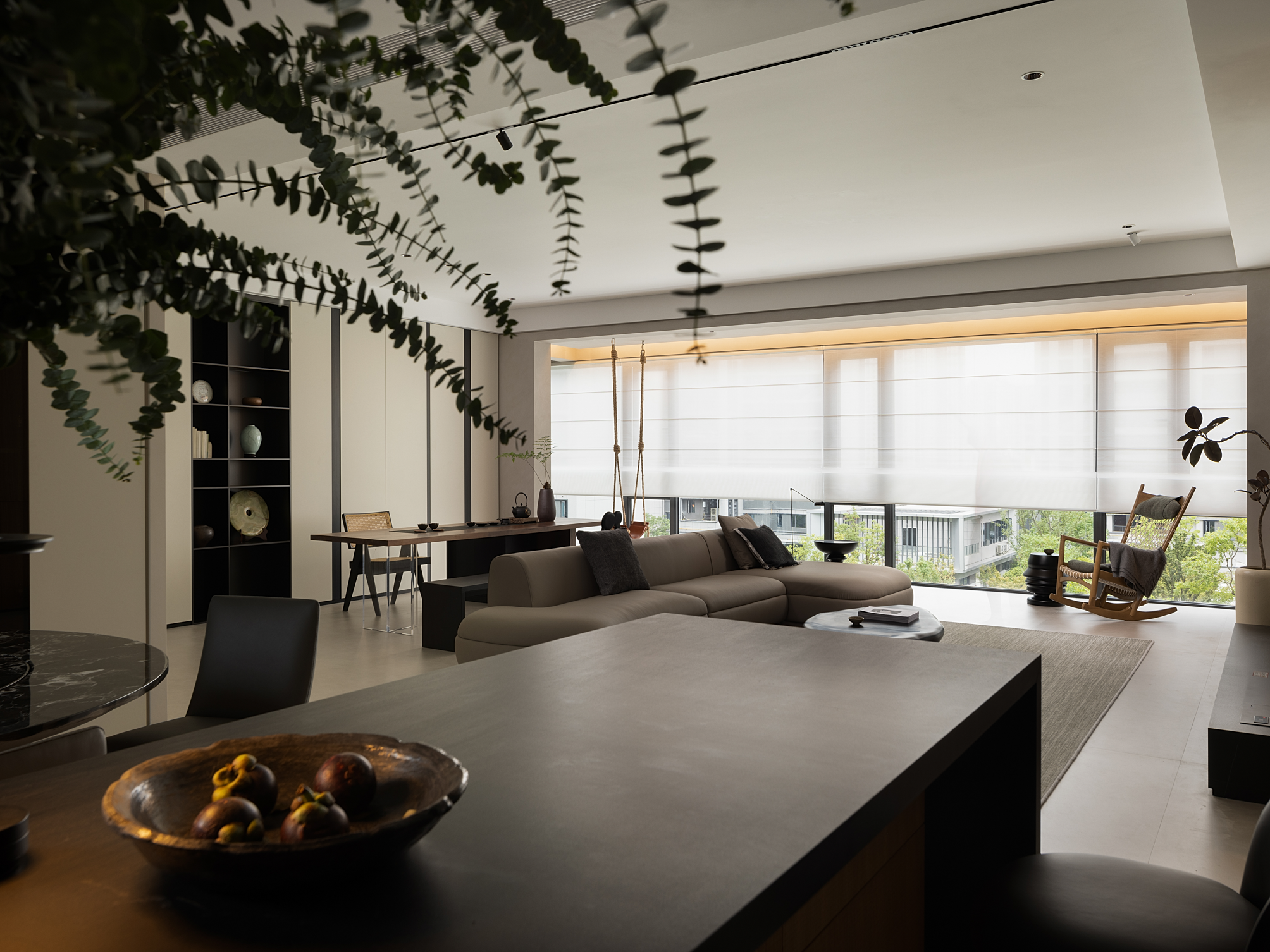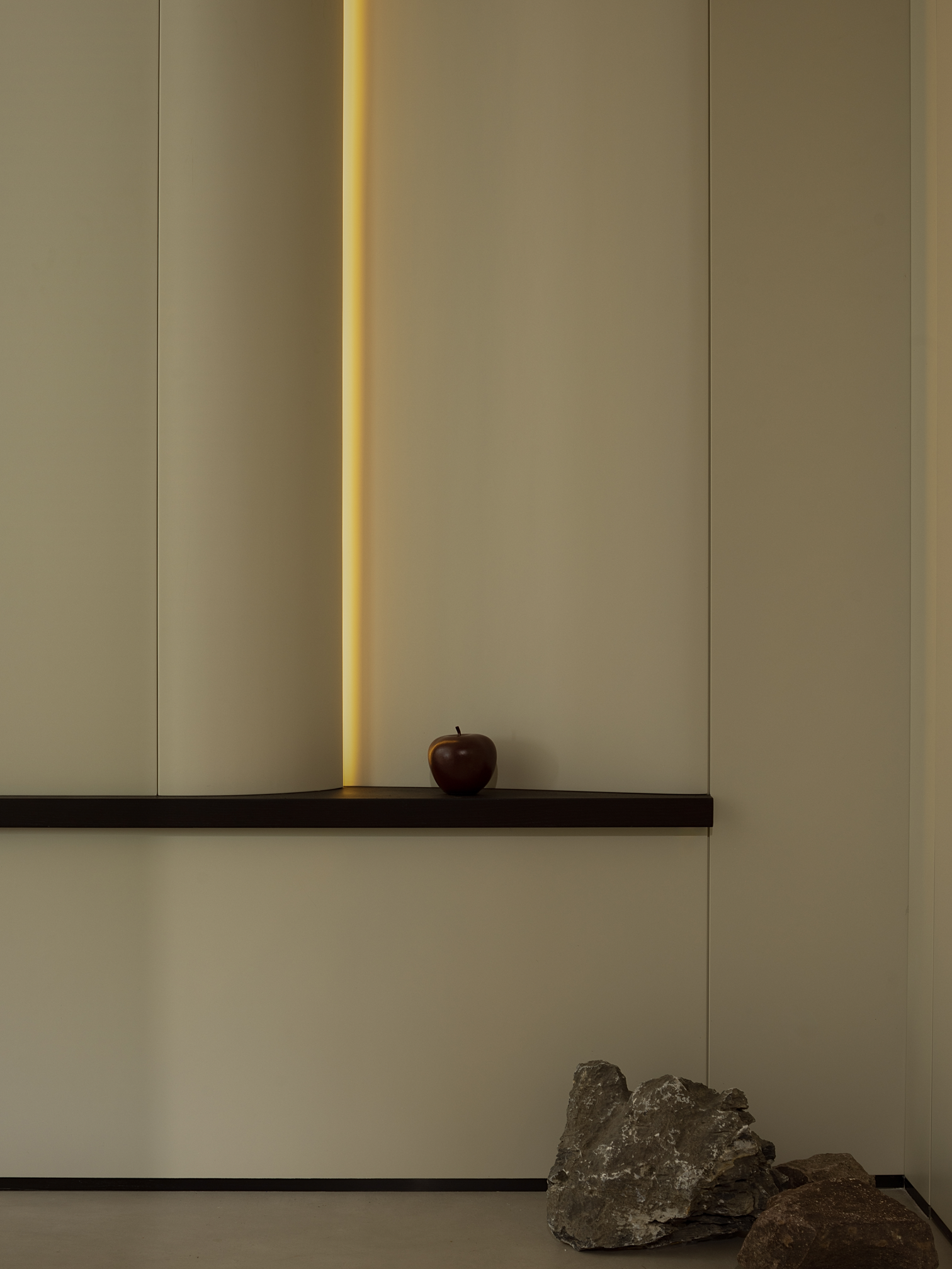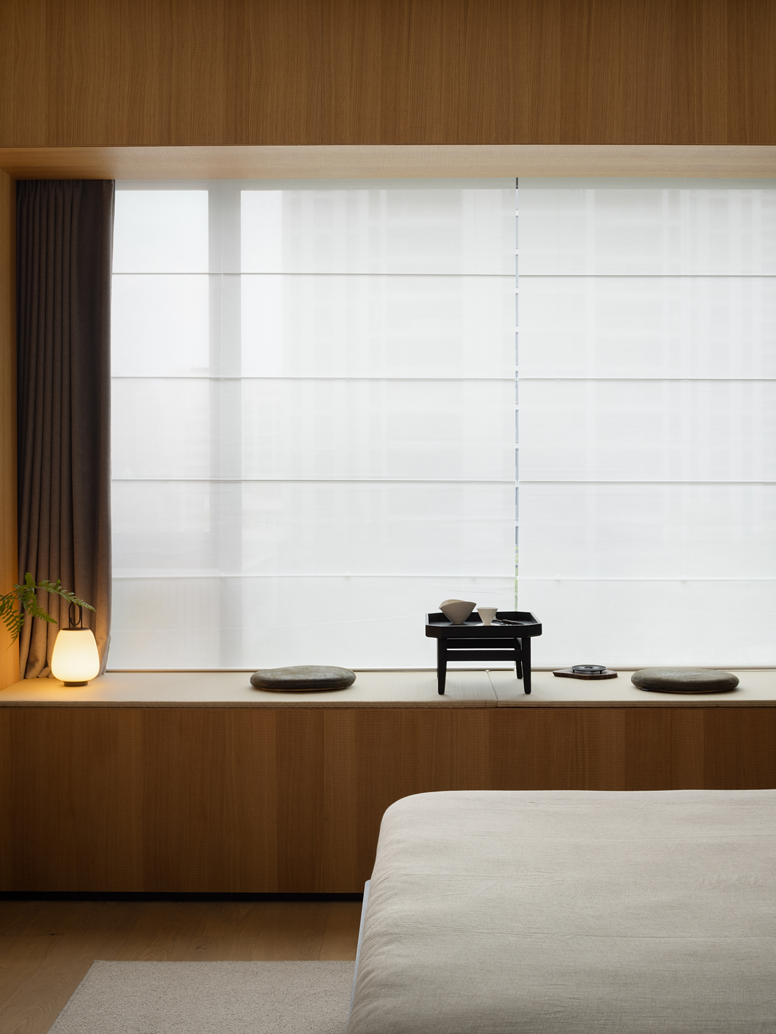 空间意境:中性色调的简约风,令空间温婉亦不失稳重;局部空间的深色规划增加空间的层次与体验