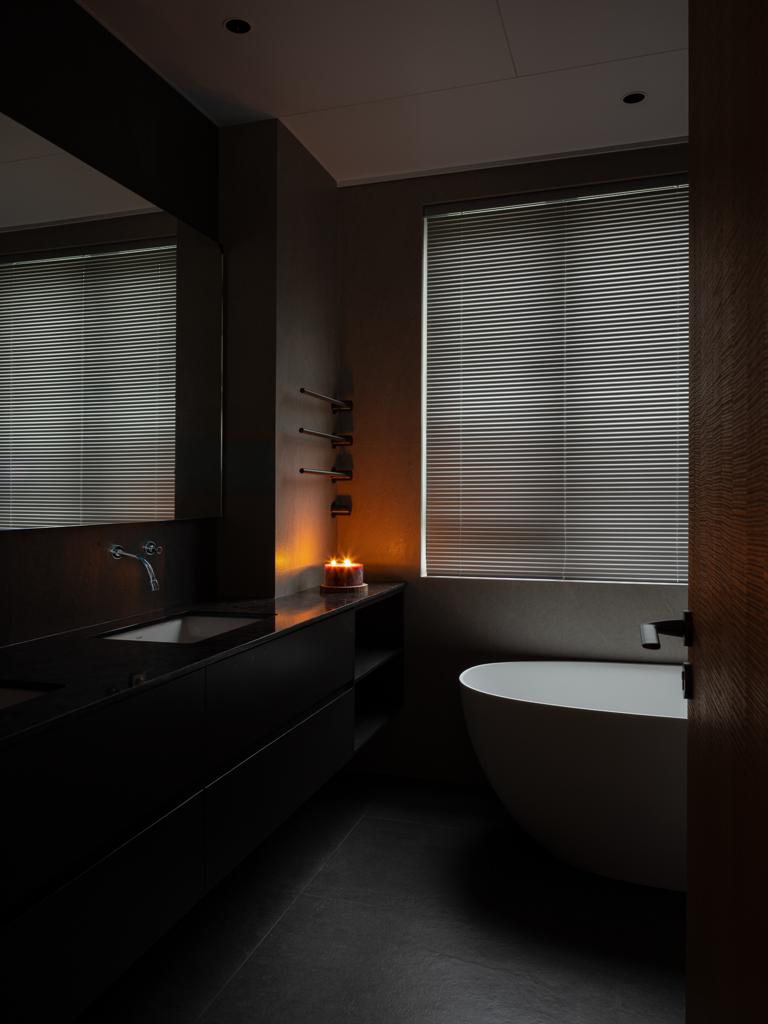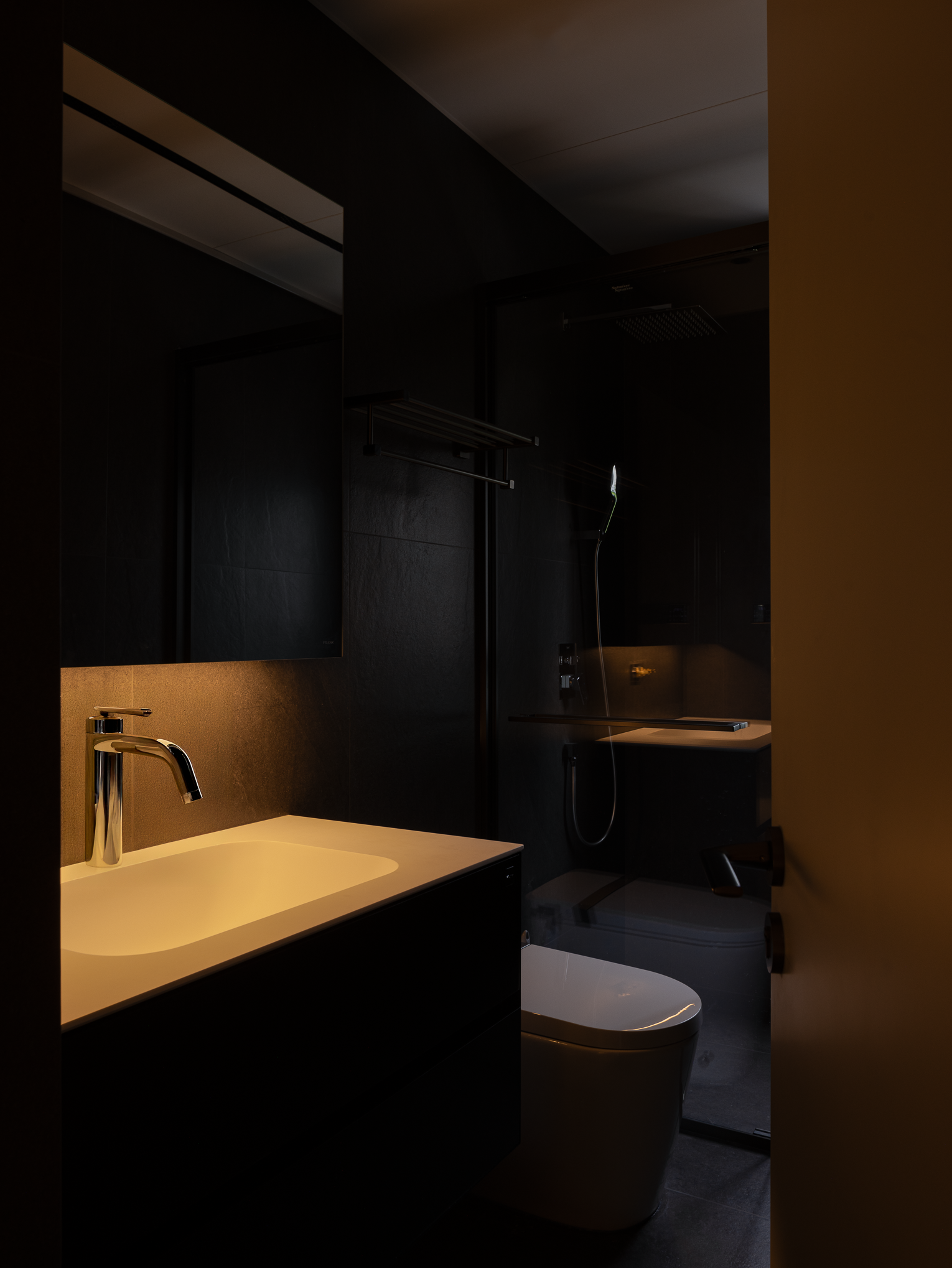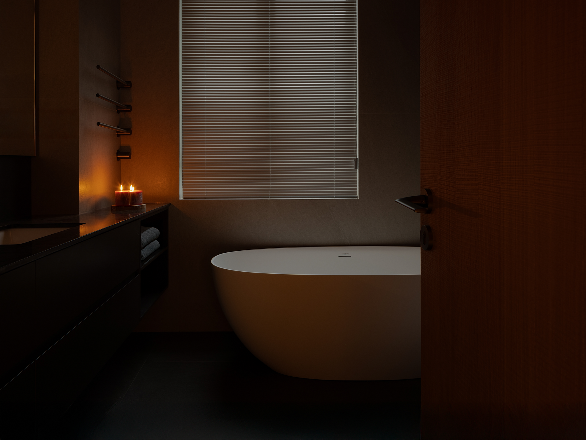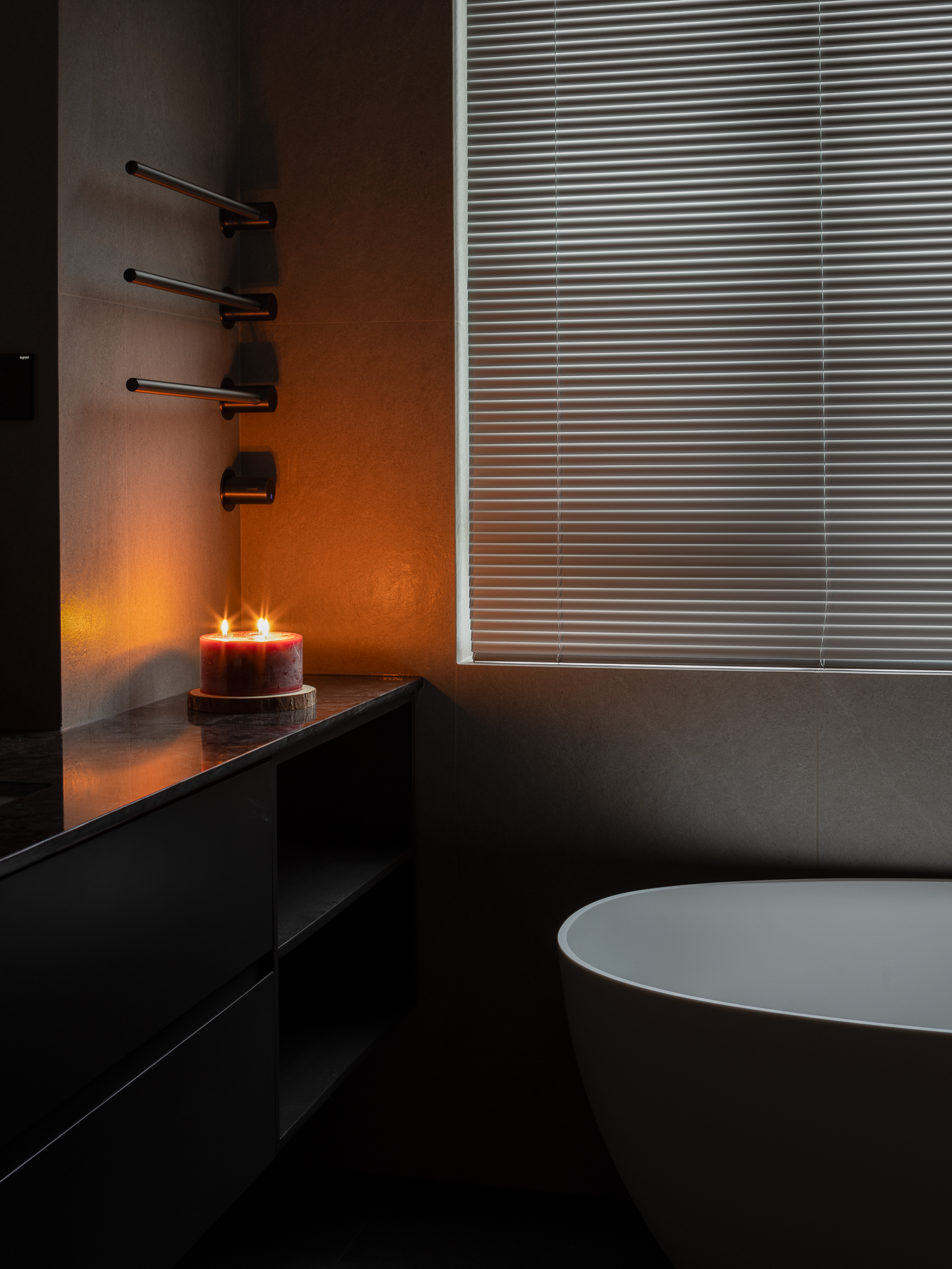 主卧以暖色调沉淀了家居的考究气质,温润的原木铺叙,浅色的地毯,稳重的装饰品,其独特的组合方式体现空灵的流动意象,润物无声,让每一次呼吸都充满自然的气息。黑色调的卫浴空间在烛光的影映下,盈满了轻松的气息,卸下一身疲惫,时光在此静止……