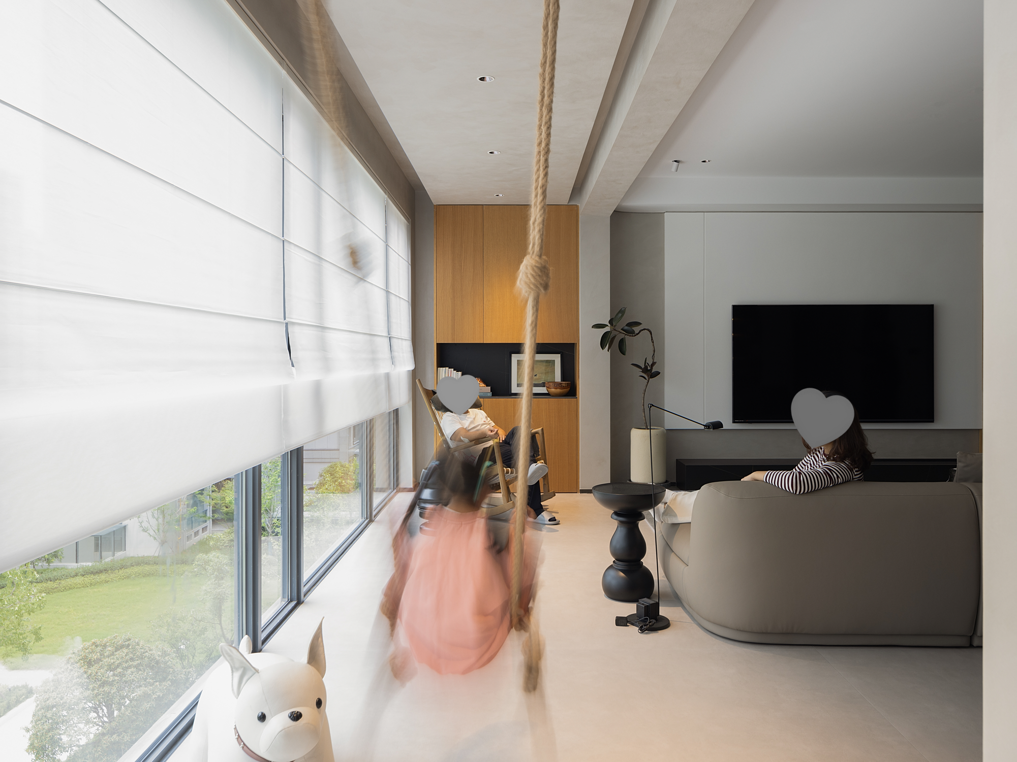 10米长廊的设计,将阳台空间纳入客厅,光与气在此得到更好的流转,与自然的触碰如一首颂歌,礼赞生命中的美妙时光。同时增加了亲子活动区,小朋友拥有足够的空间休息玩耍看书。长者沐浴在阳光下,或闲聊或逗趣,促进不同代际之间的互动,感受家的温暖。