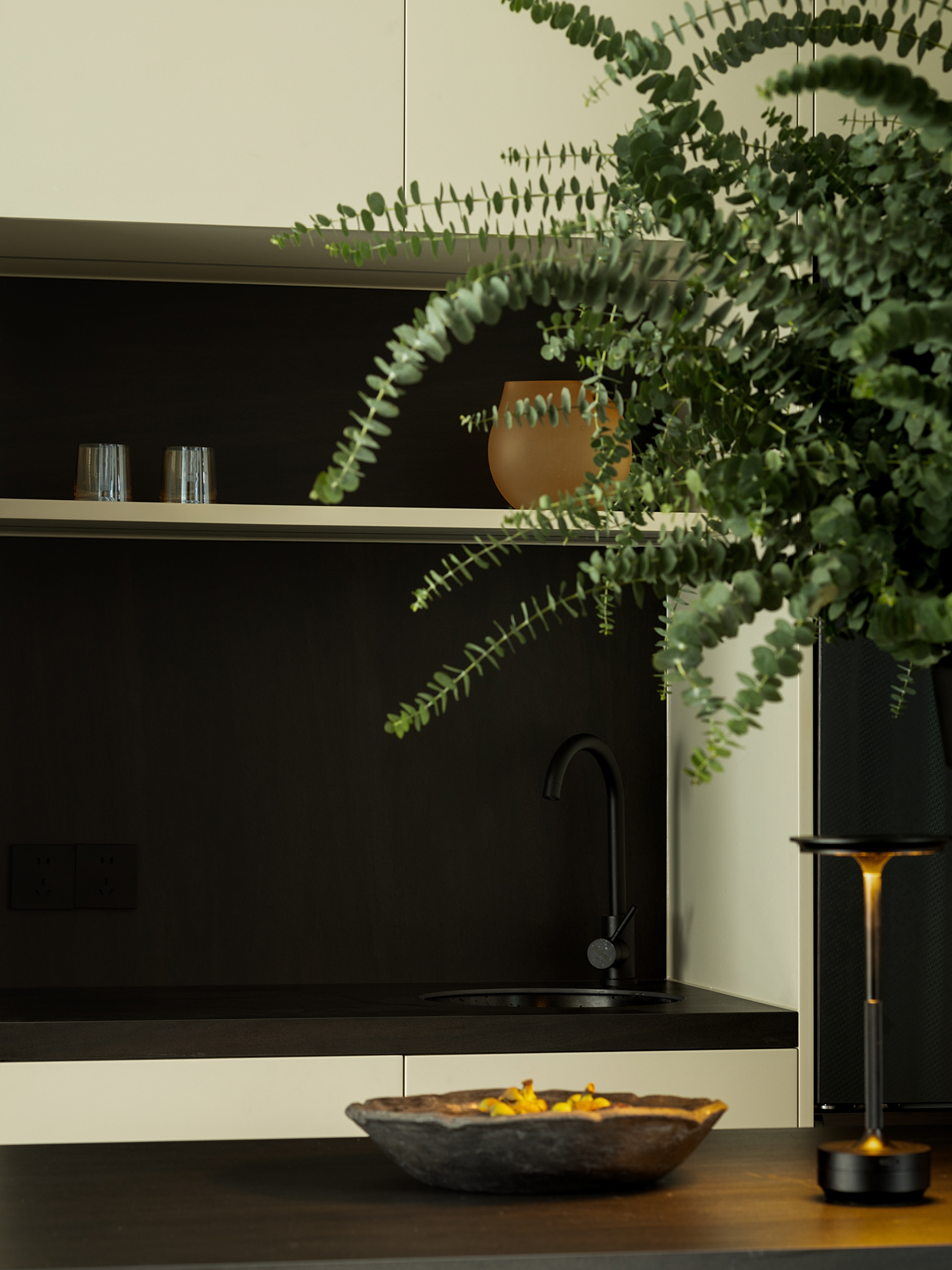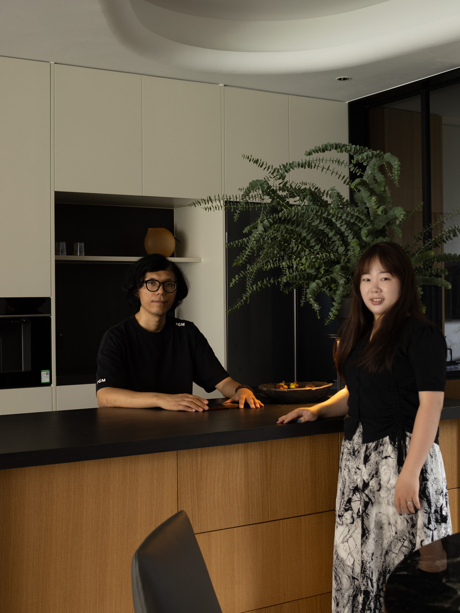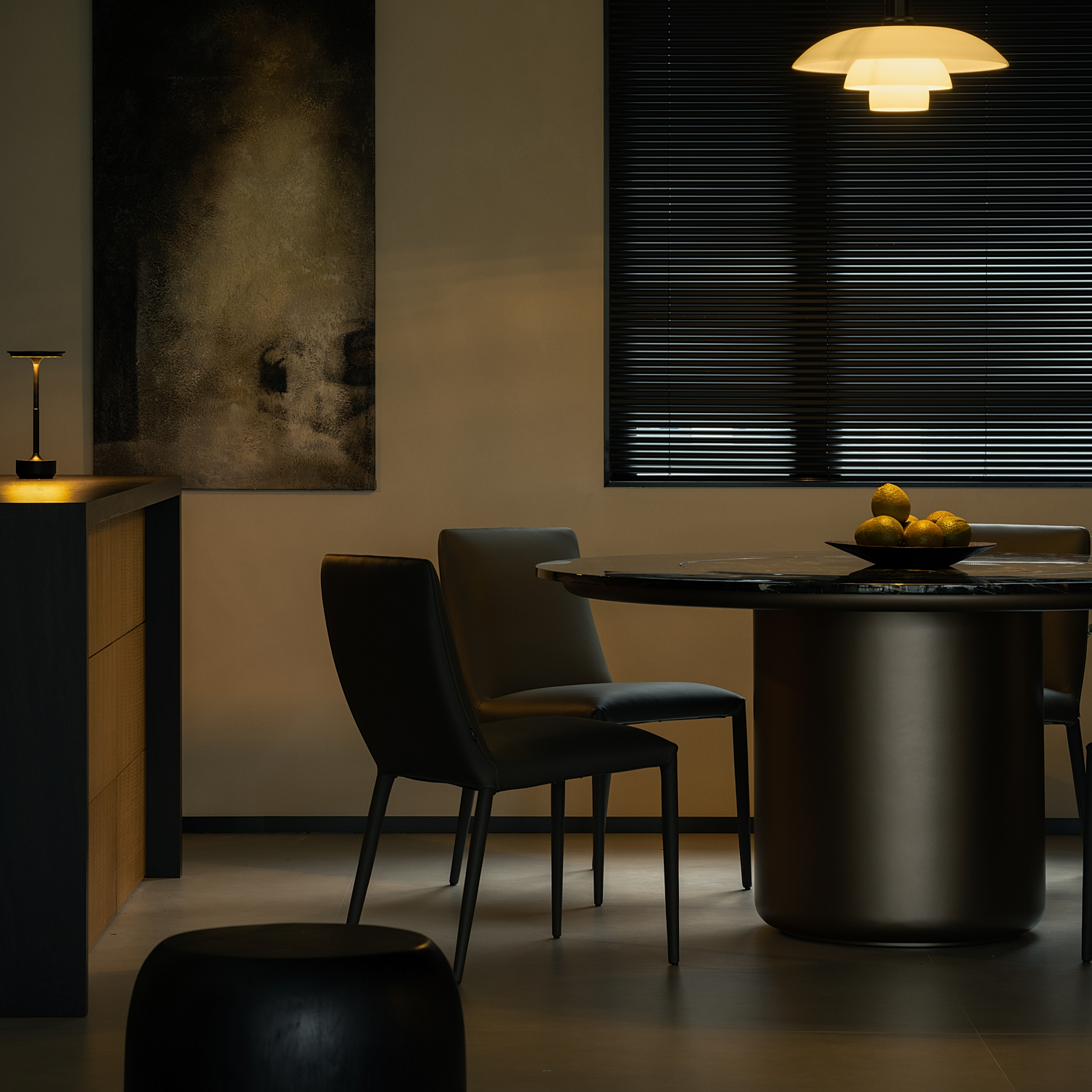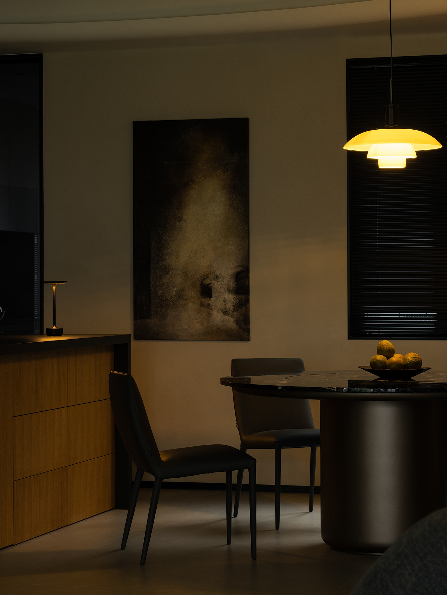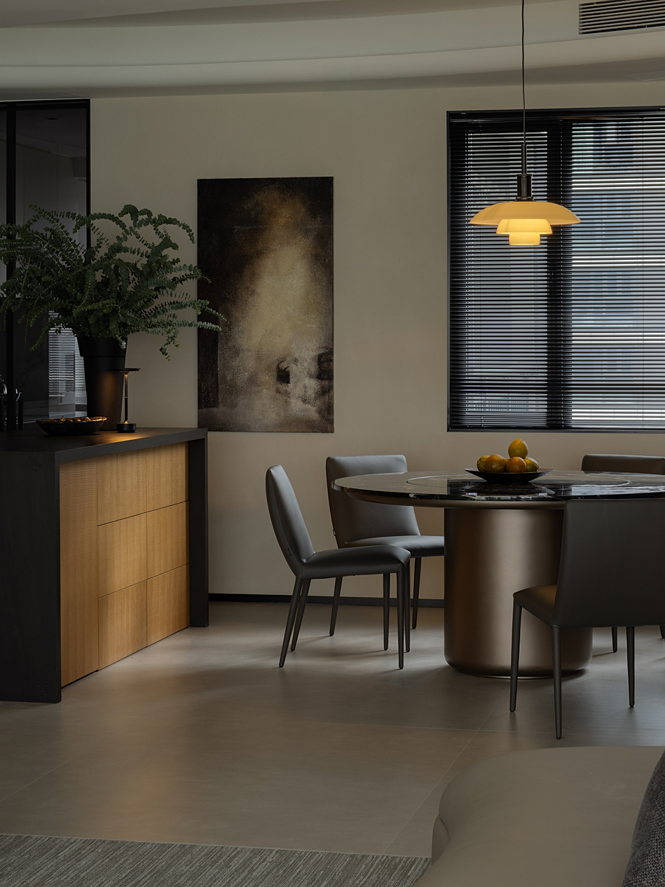 百叶窗光影婆娑,暖黄的灯光映照下的餐区传递出温暖而醇厚的就餐氛围,大理石材的桌面与现代皮质餐椅章法有致的搭配让餐厅别有韵味。 沉稳克制的磨砂黑岛台透出大气的清冷感,搭配绿植让柴米油盐的琐碎转变成一种生活艺术。