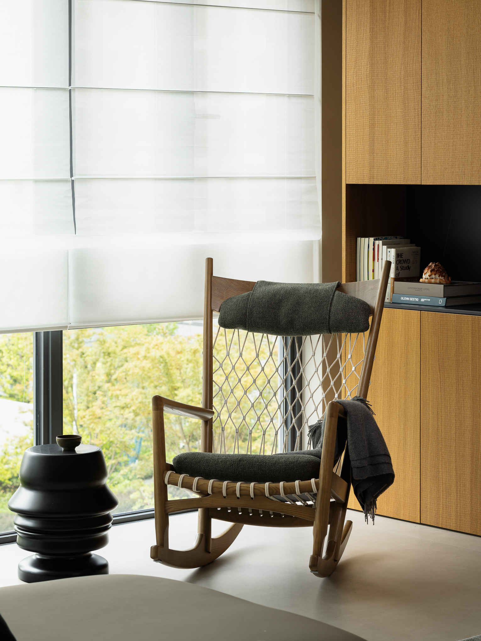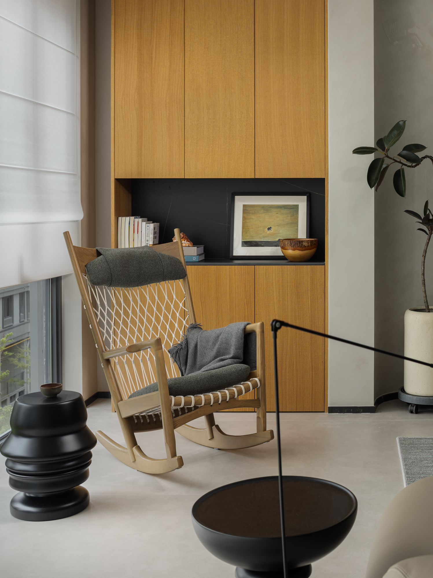 设计选材:采用开放透气的肌理漆面材料与木材,让空间自呼吸,亦节约