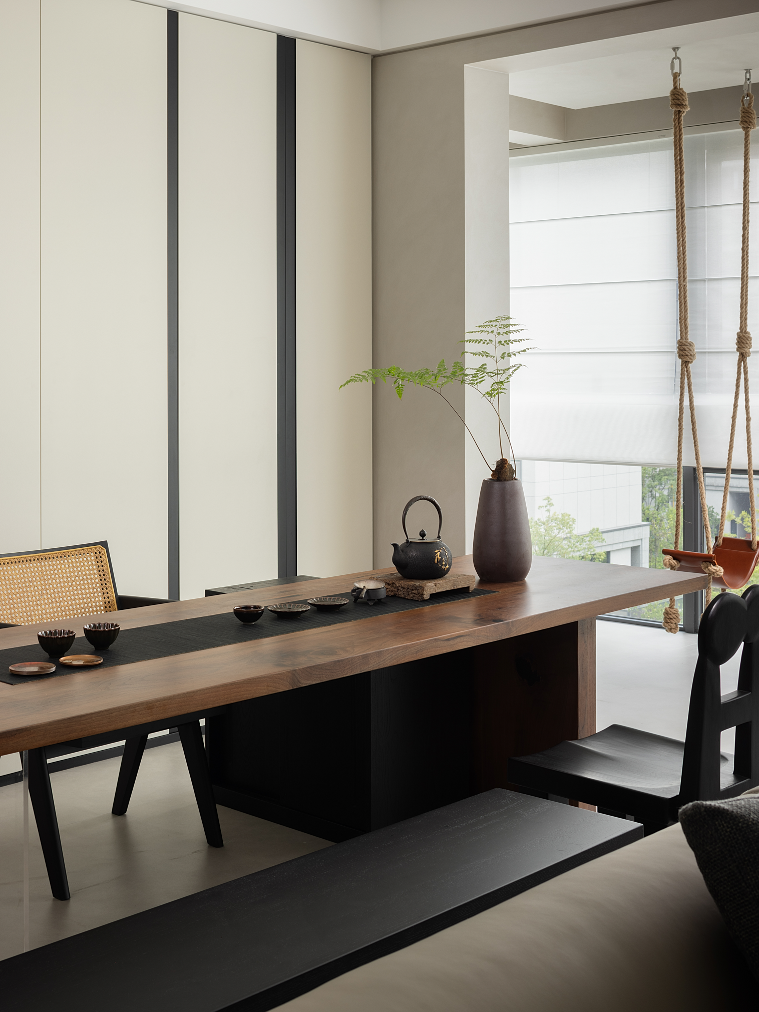 茶区不仅是品茗的场所,更是家的温暖延伸。质感温润的实木茶桌与各个形制的典雅茶椅组合搭配,闲适的午后,茶香氤氲,时光仿佛也慢了下来,体验一段宁静而美好的时光。