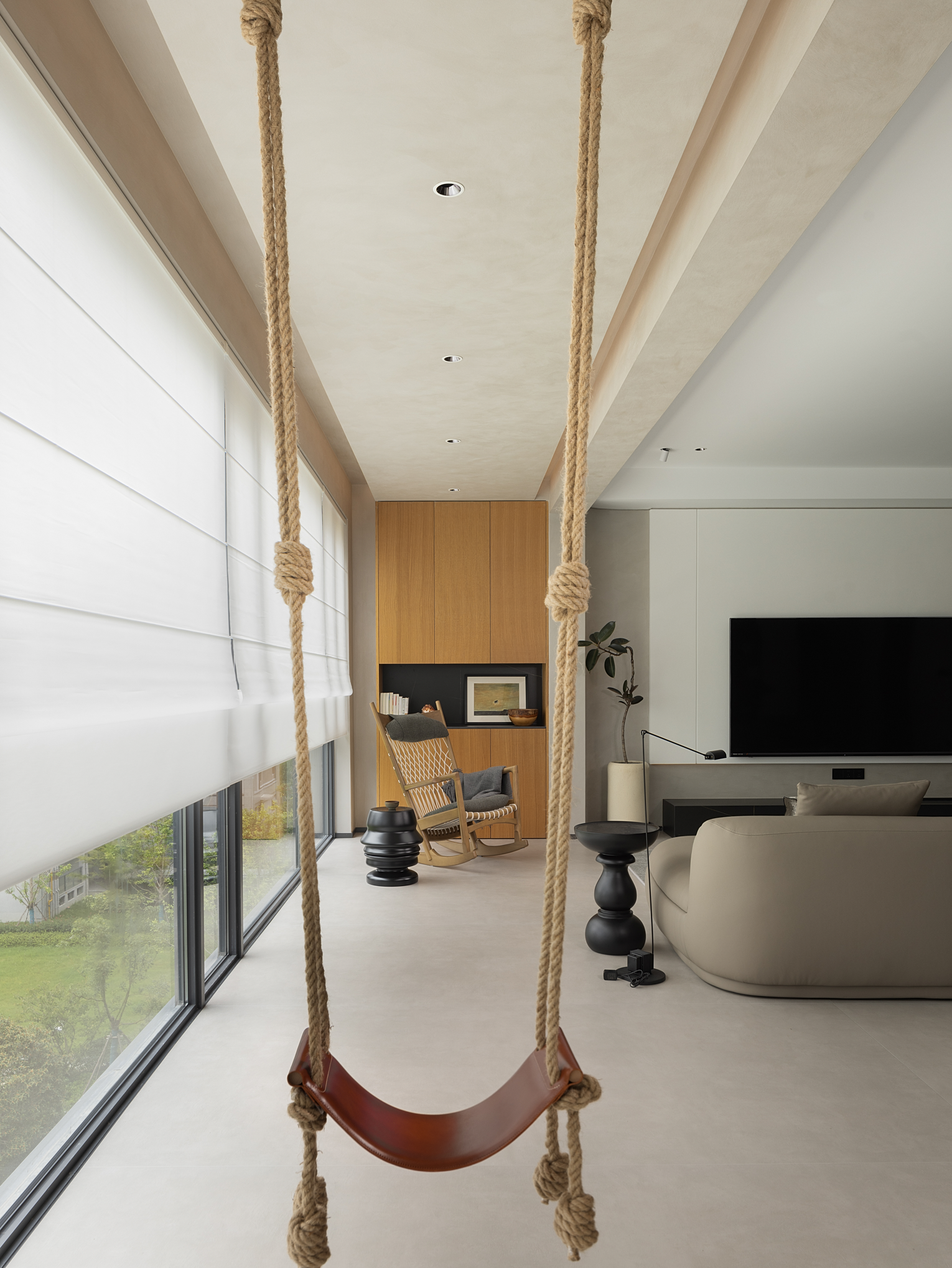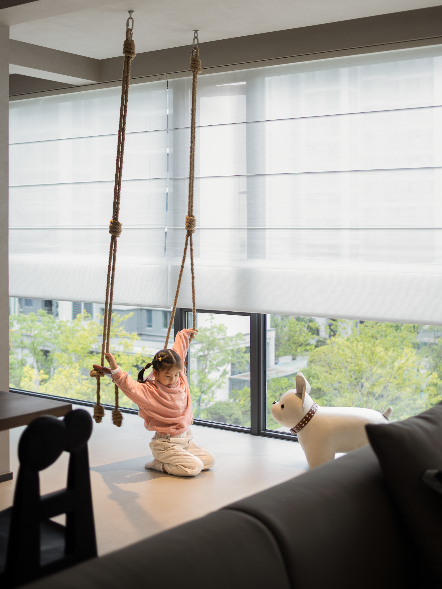 10米长廊的设计,将阳台空间纳入客厅,光与气在此得到更好的流转,与自然的触碰如一首颂歌,礼赞生命中的美妙时光。同时增加了亲子活动区,小朋友拥有足够的空间休息玩耍看书。沐浴在阳光下,或闲聊或逗趣,促进不同代际之间的互动,感受家的温暖。