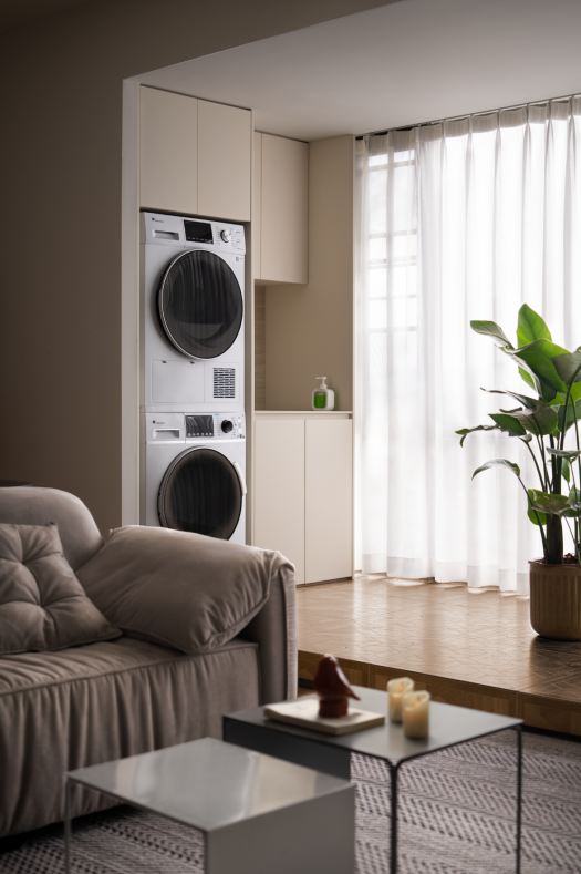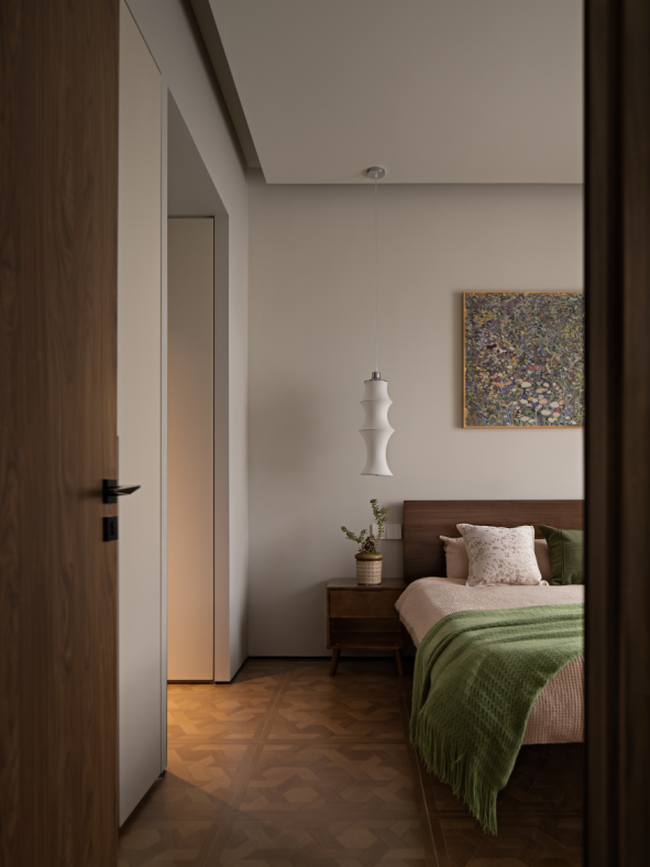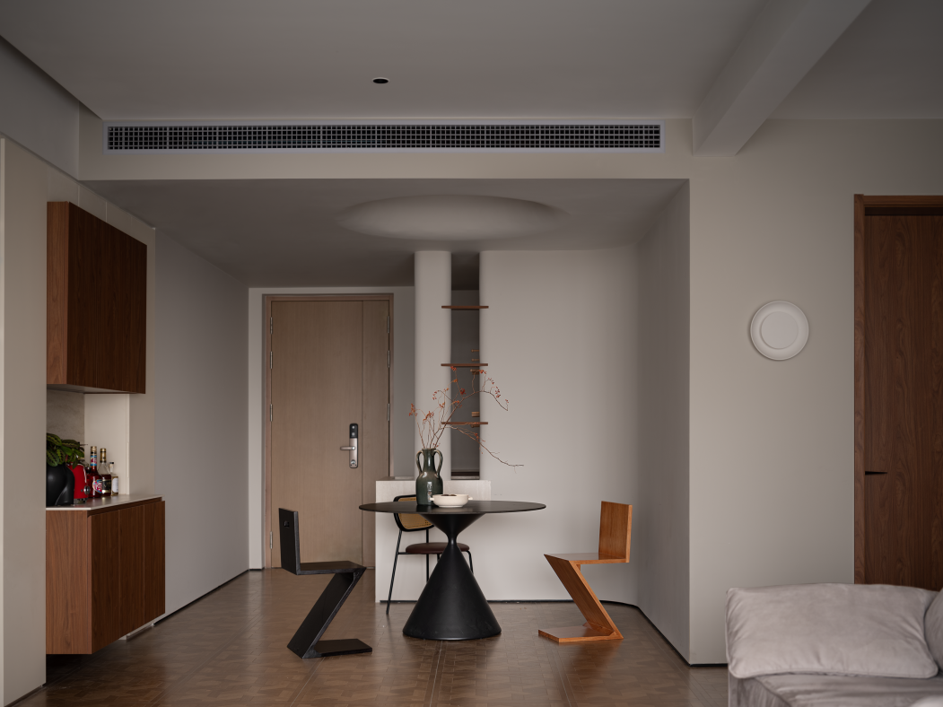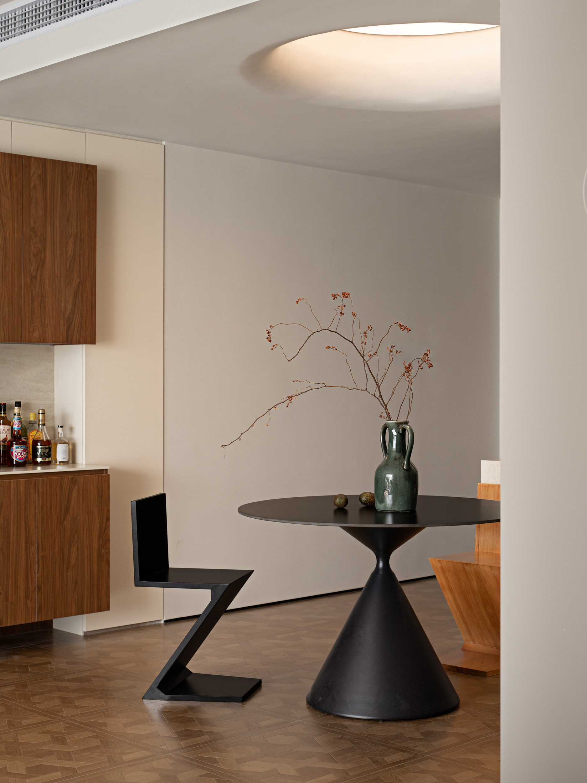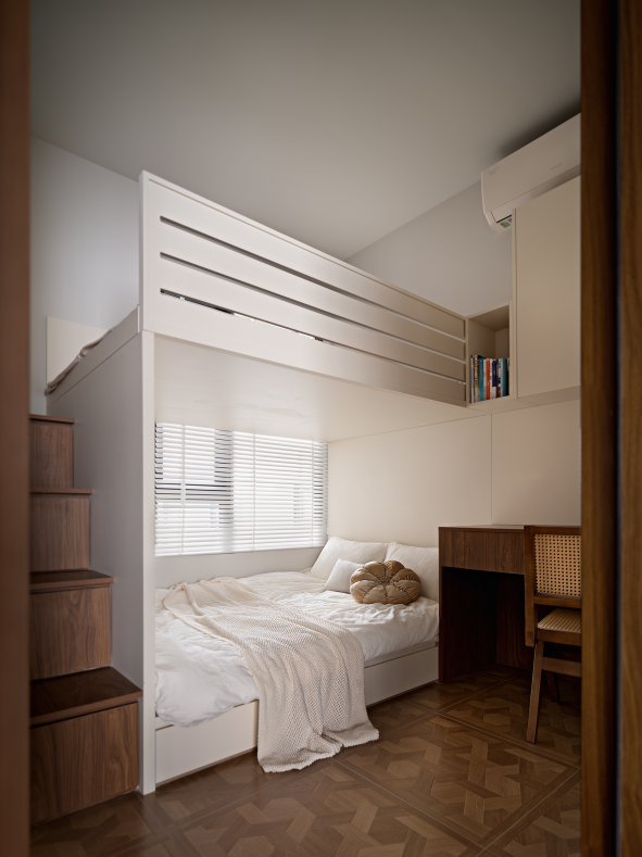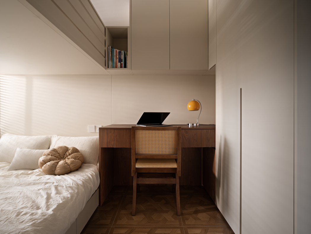 空间布局:拆除玄关与生活阳台墙体,打通三个空间做L字型开放厨房。冰箱与盥洗区向餐厅借位,餐厨空间尺度都恰到好处。拆除阳台墙体,并入客厅,抬高地台,同时形成一个大方厅,屋主也就拥有了一个“植物园”。书房融入客厅,增设书桌,让公区拥有更多的功能,客餐书房LDS一体化设计,整个餐厅与客厅、书房形成高效互动交流。儿童房向主卧借位做一字型衣橱,与书桌连接上下床,满足孩子的衣物收纳与生活居住。
