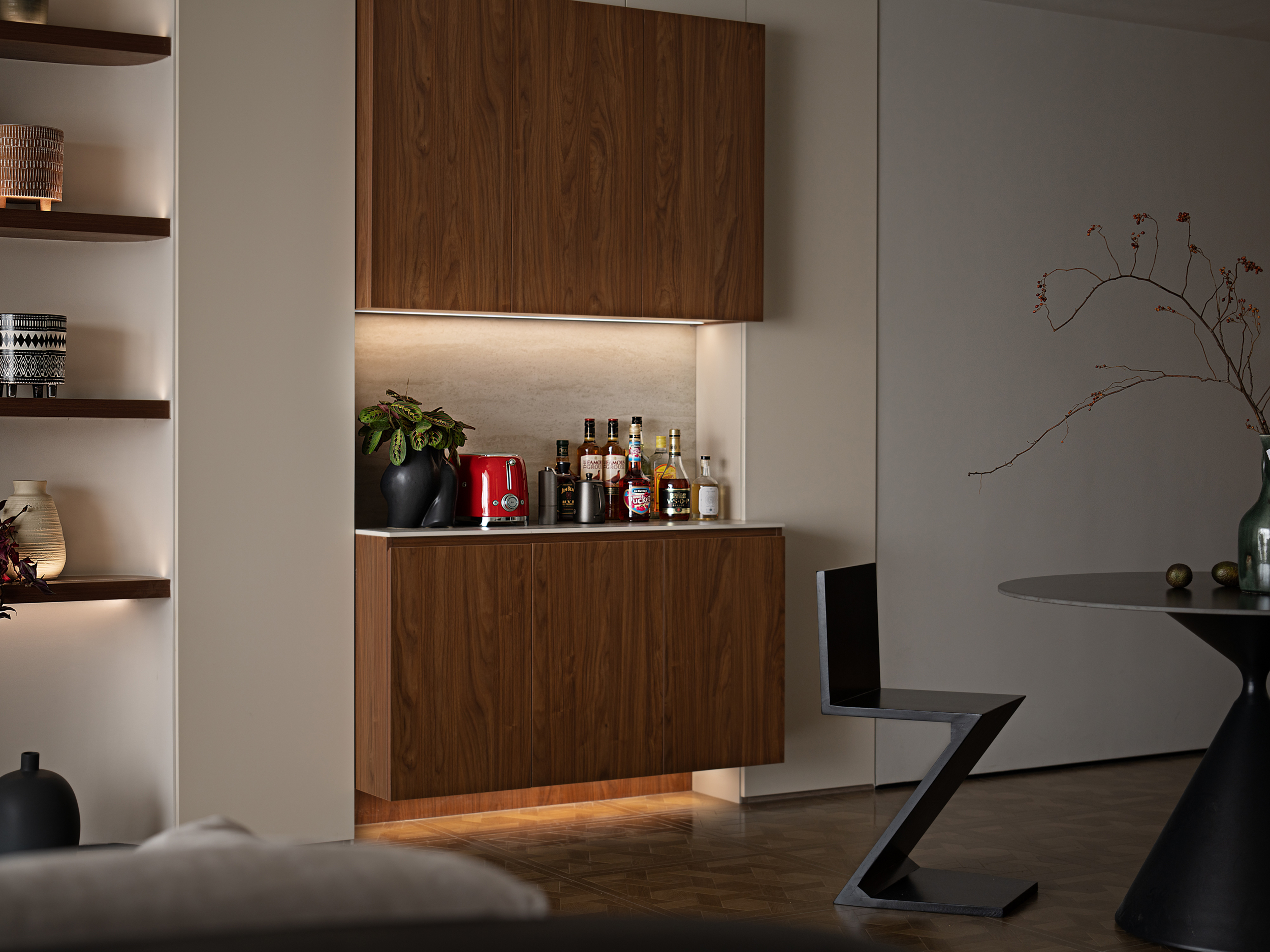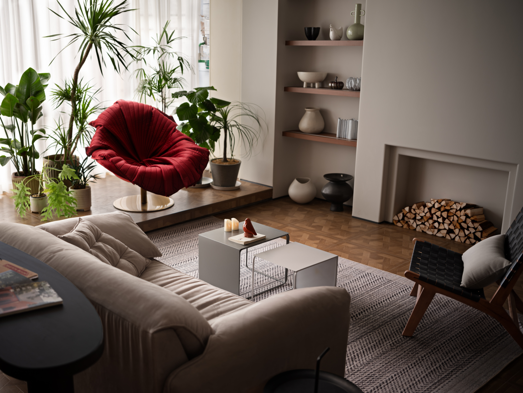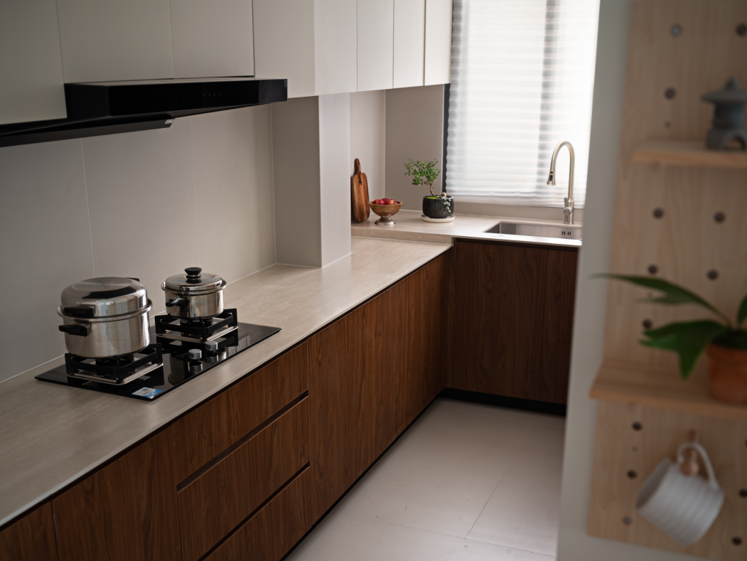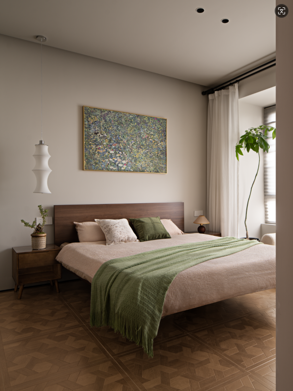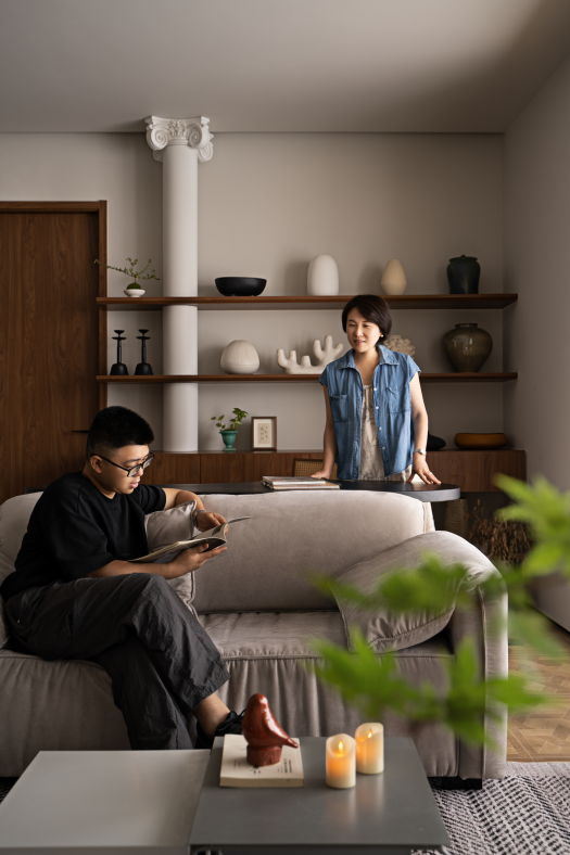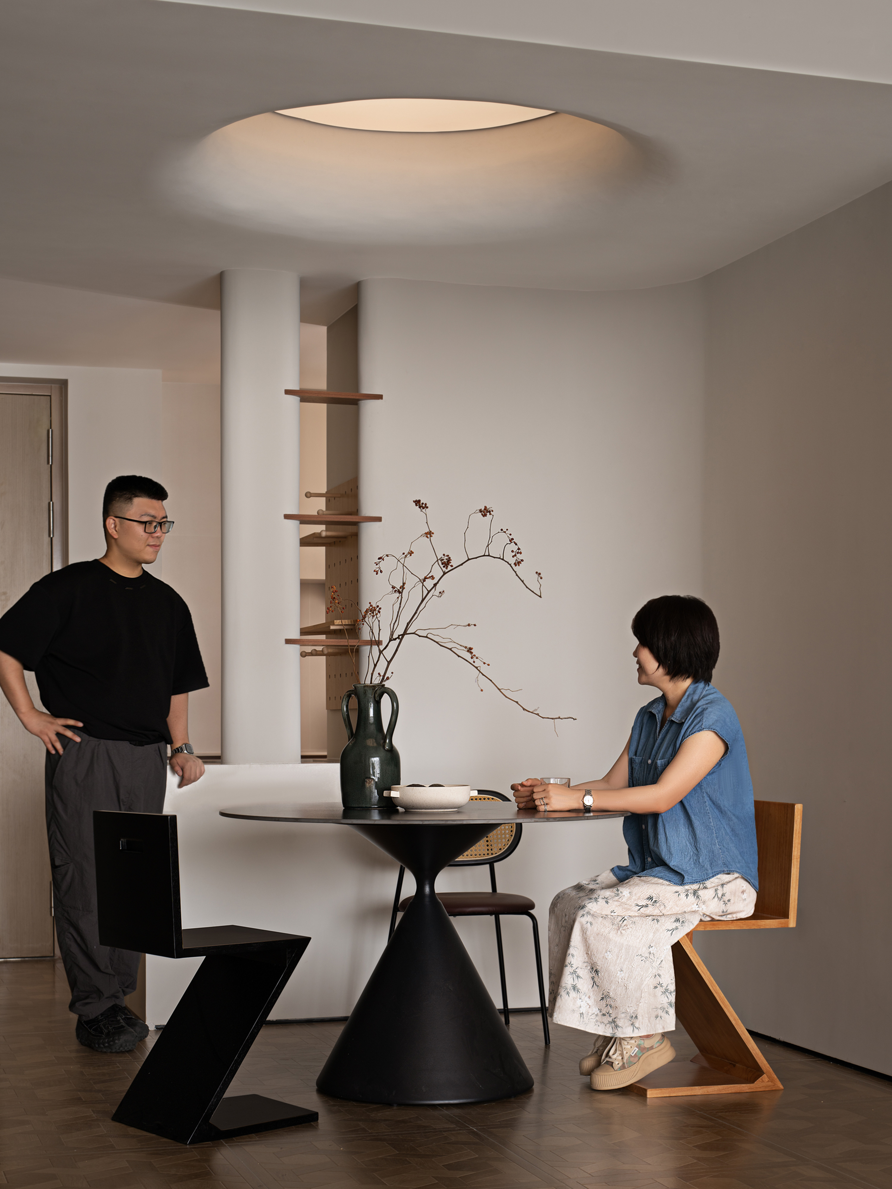 空间布局:拆除玄关与生活阳台墙体,打通三个空间做L字型开放厨房。冰箱与盥洗区向餐厅借位,餐厨空间尺度都恰到好处。拆除阳台墙体,并入客厅,抬高地台,同时形成一个大方厅,屋主也就拥有了一个“植物园”。书房融入客厅,增设书桌,让公区拥有更多的功能,客餐书房LDS一体化设计,整个餐厅与客厅、书房形成高效互动交流。儿童房向主卧借位做一字型衣橱,与书桌连接上下床,满足孩子的衣物收纳与生活居住。