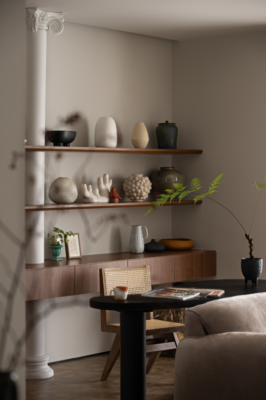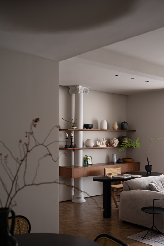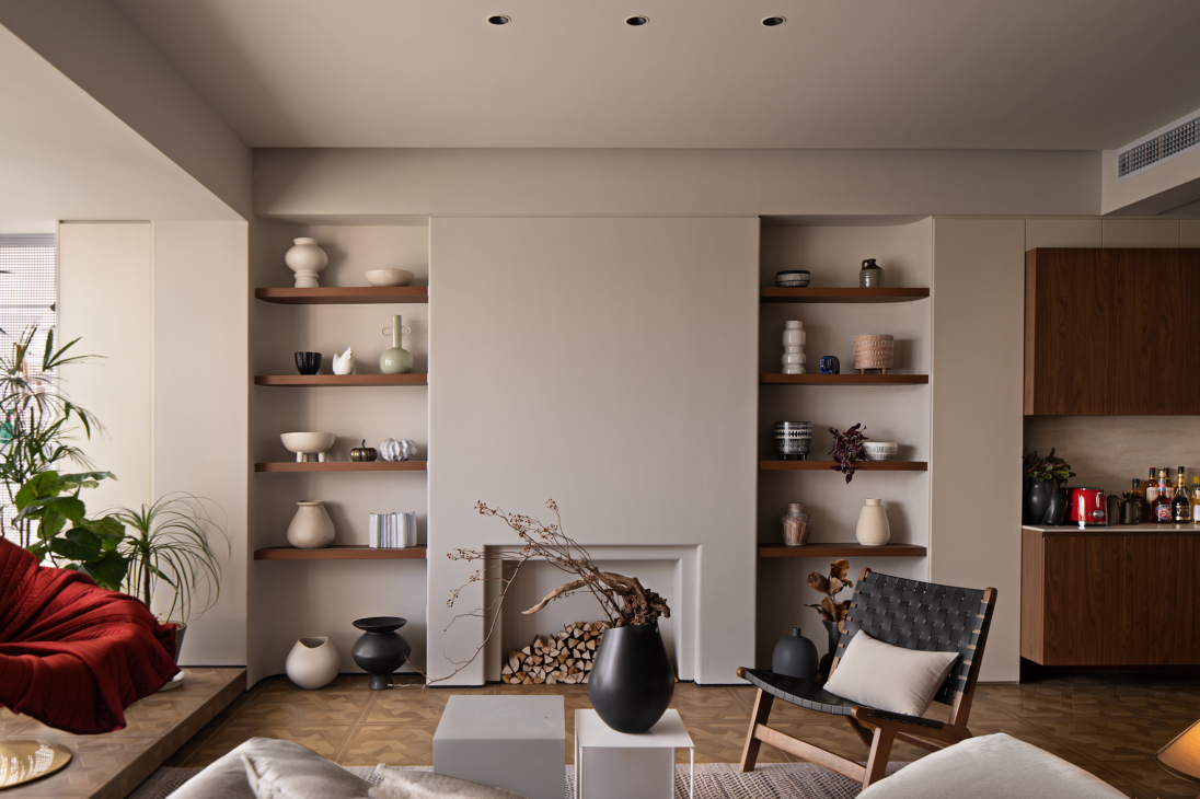 设计选材:本案选材选取了艺术漆、仿古砖,因为业主是名花艺师,柜体以展示柜为主。