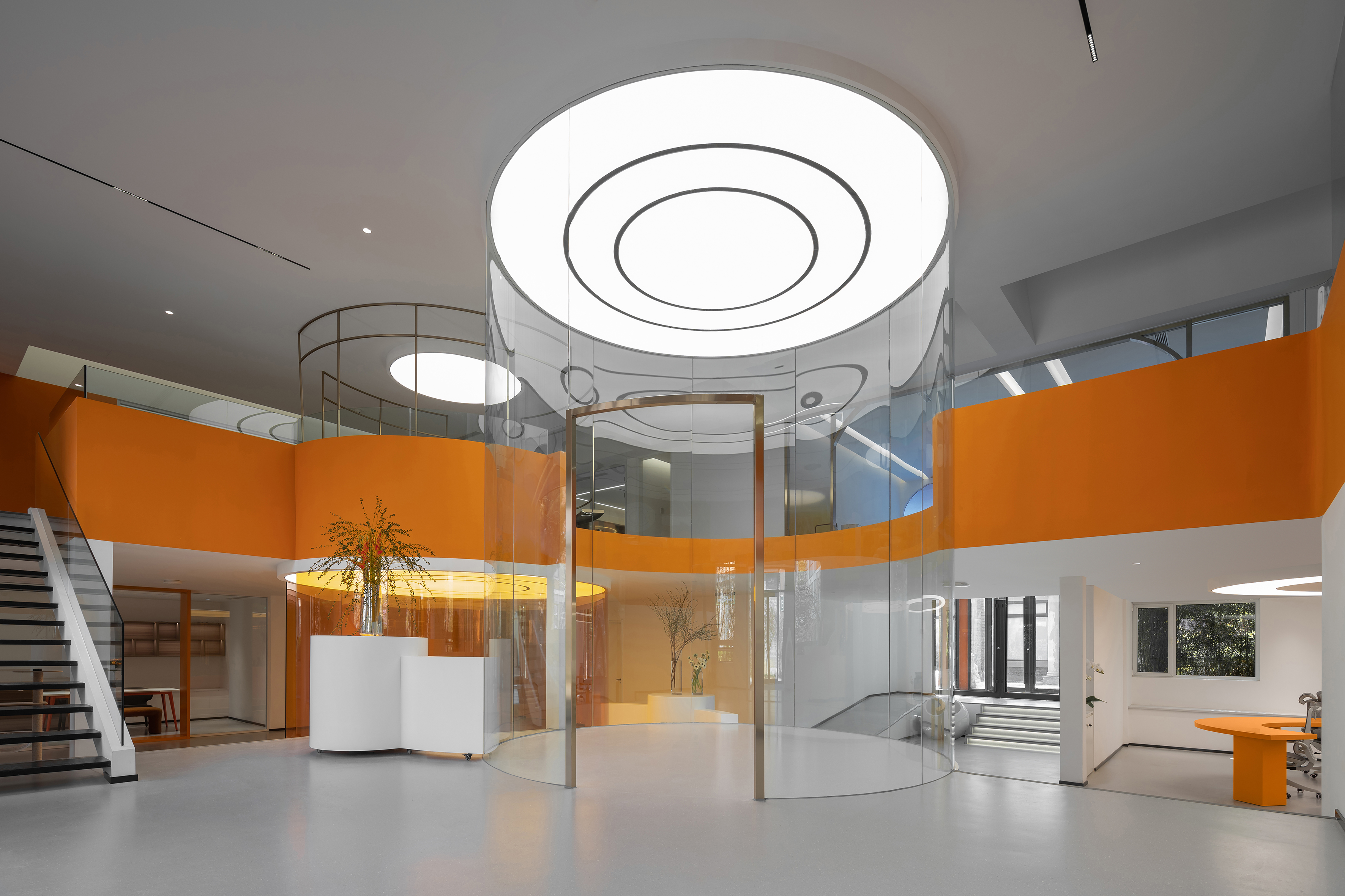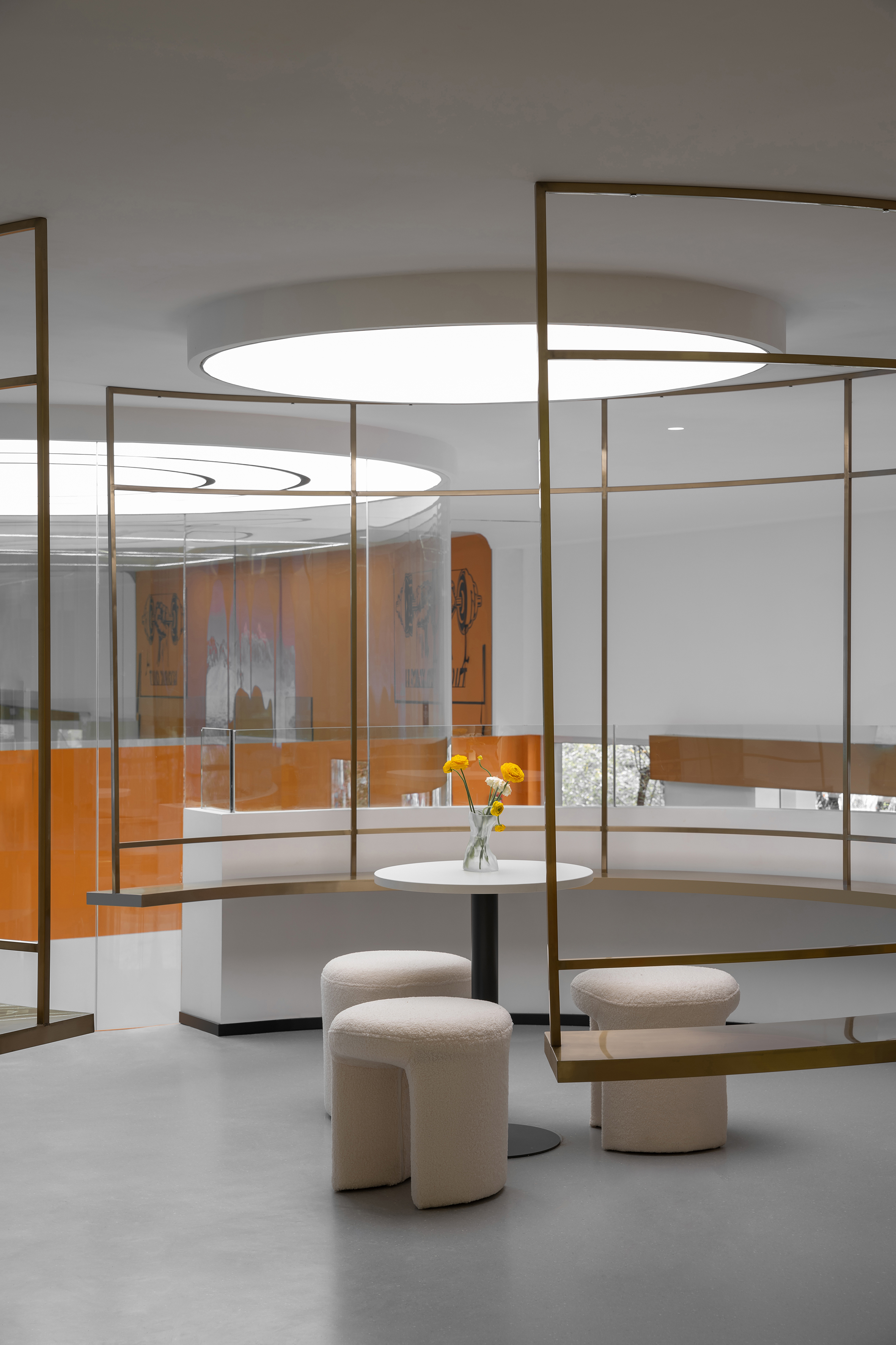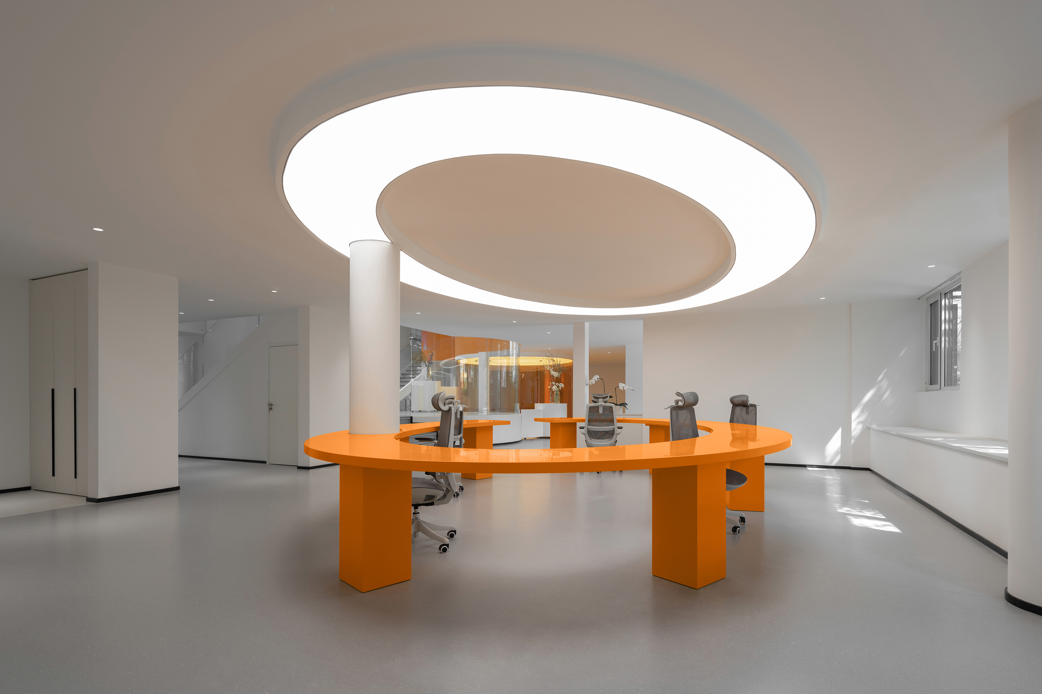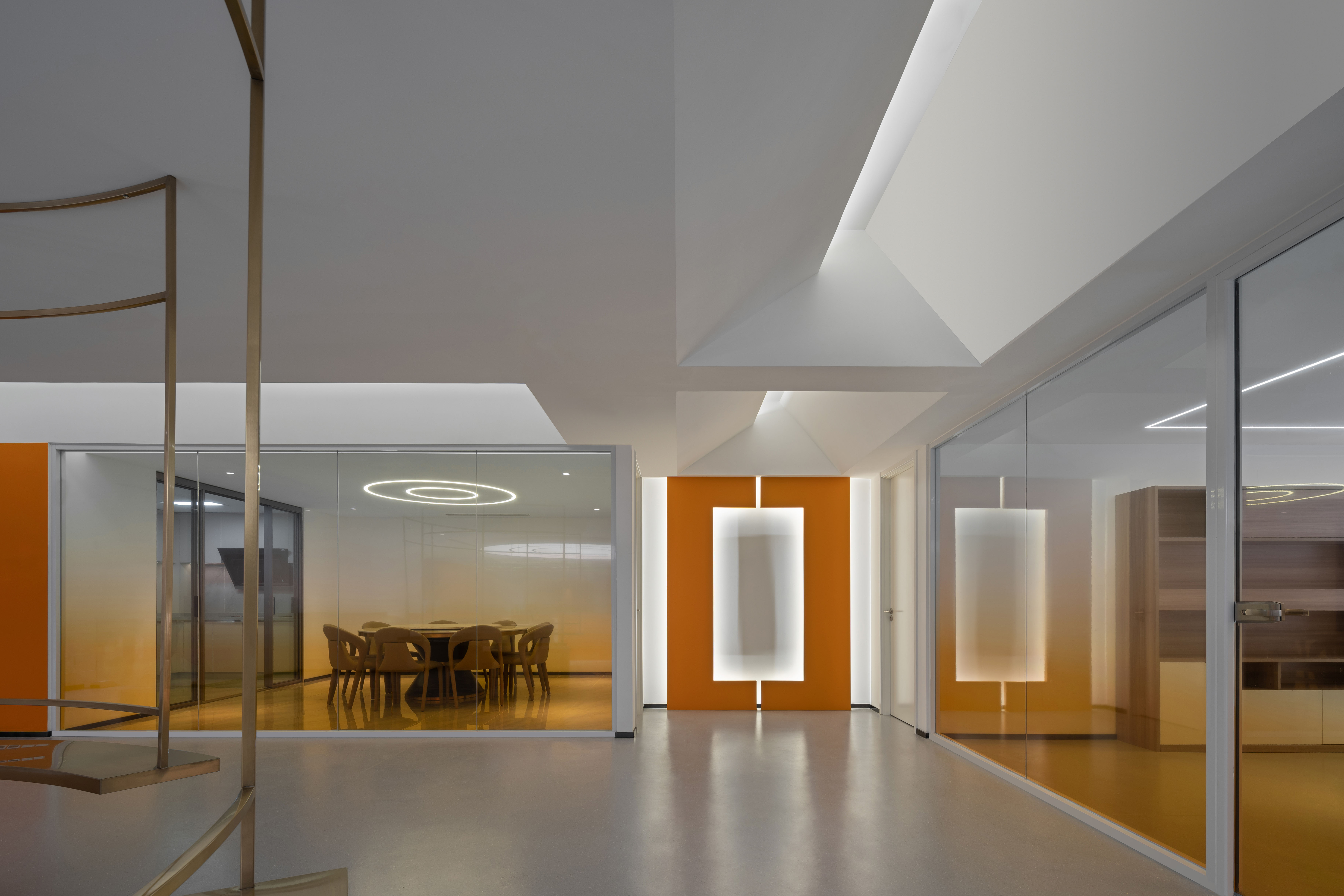 在空间的材质和色彩上都是采用减法,来最大程度的还原空间的尺度和自由。从墙面的白色肌理漆到亚克力到玻璃到家具的白色烤漆和橘色烤漆,都是以干净纯粹为标准的选择。色彩的规划就是橘色跳进了白色的梦境中,通过通高又穿透的玻璃和层高错位来完成一场橘色梦境乐园的仪式。