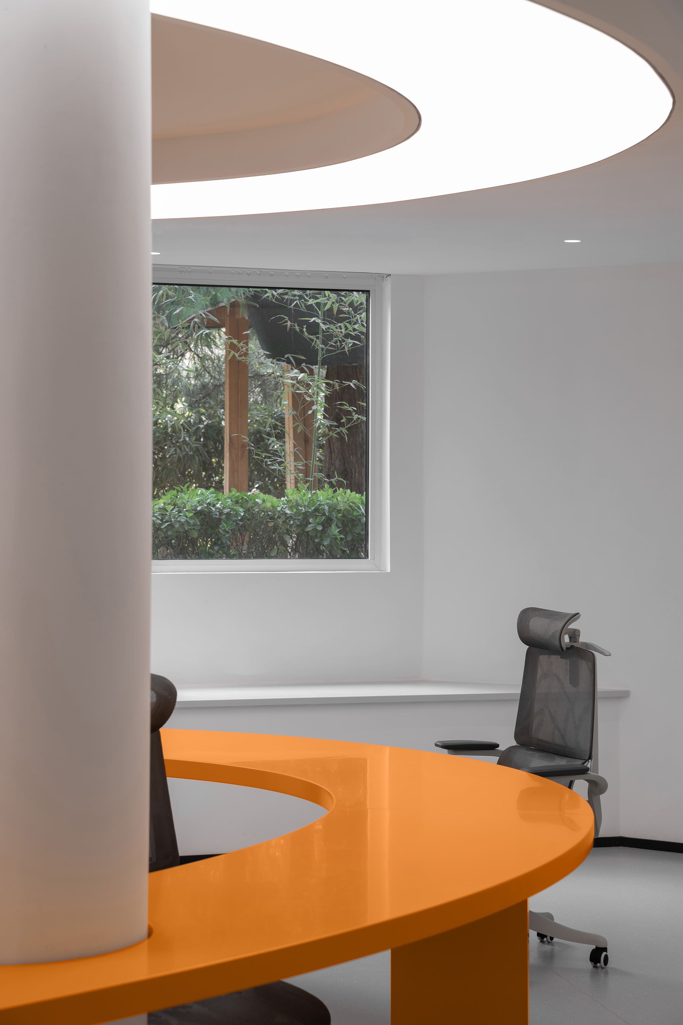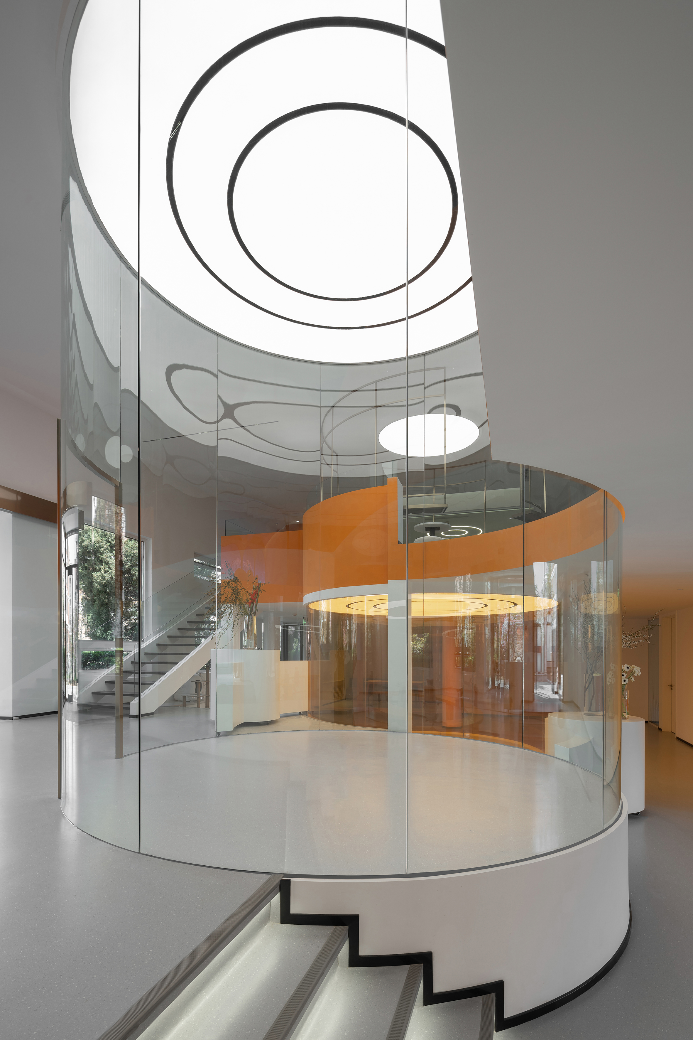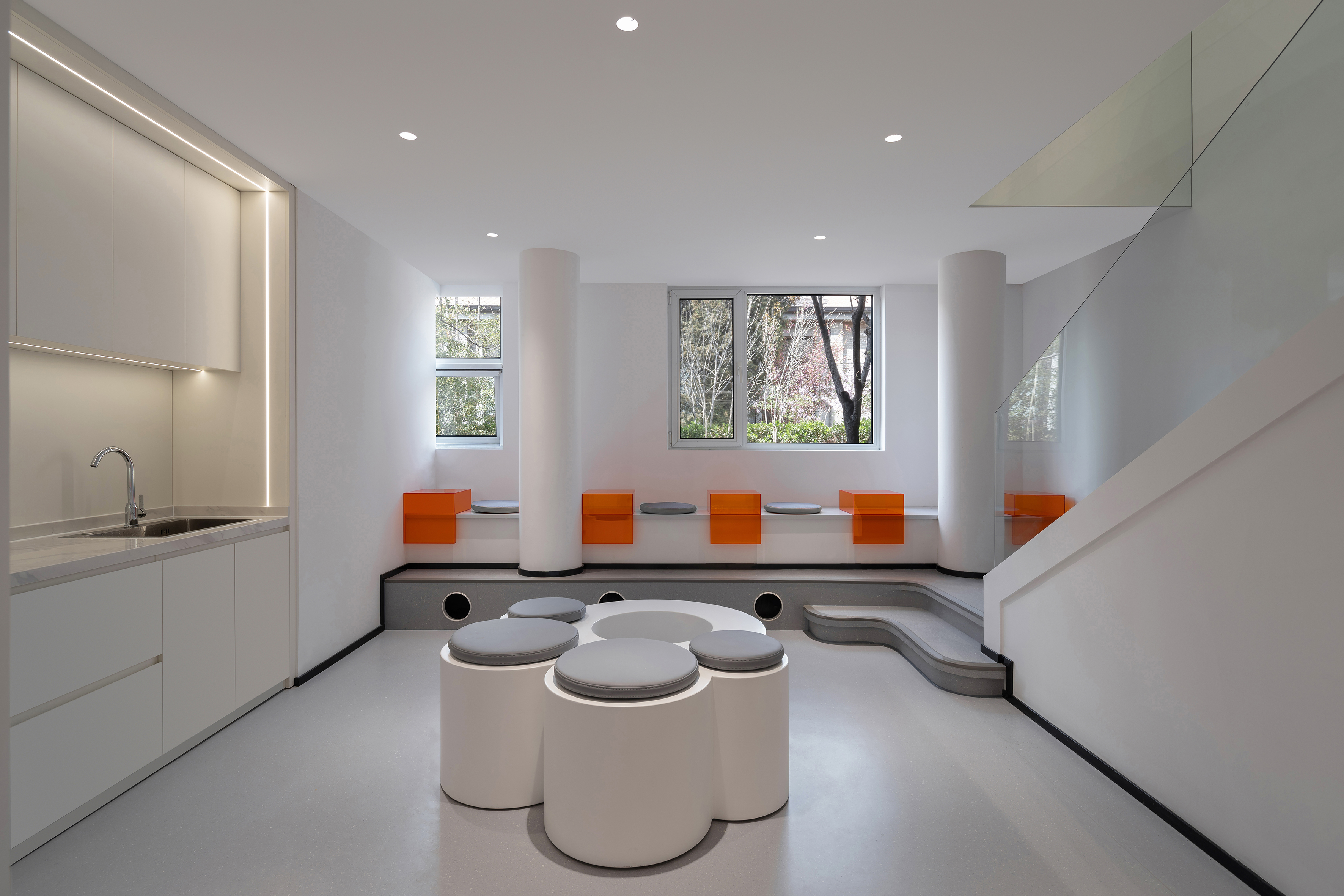 在空间的材质和色彩上都是采用减法,来最大程度的还原空间的尺度和自由。从墙面的白色肌理漆到亚克力到玻璃到家具的白色烤漆和橘色烤漆,都是以干净纯粹为标准的选择。色彩的规划就是橘色跳进了白色的梦境中,通过通高又穿透的玻璃和层高错位来完成一场橘色梦境乐园的仪式。