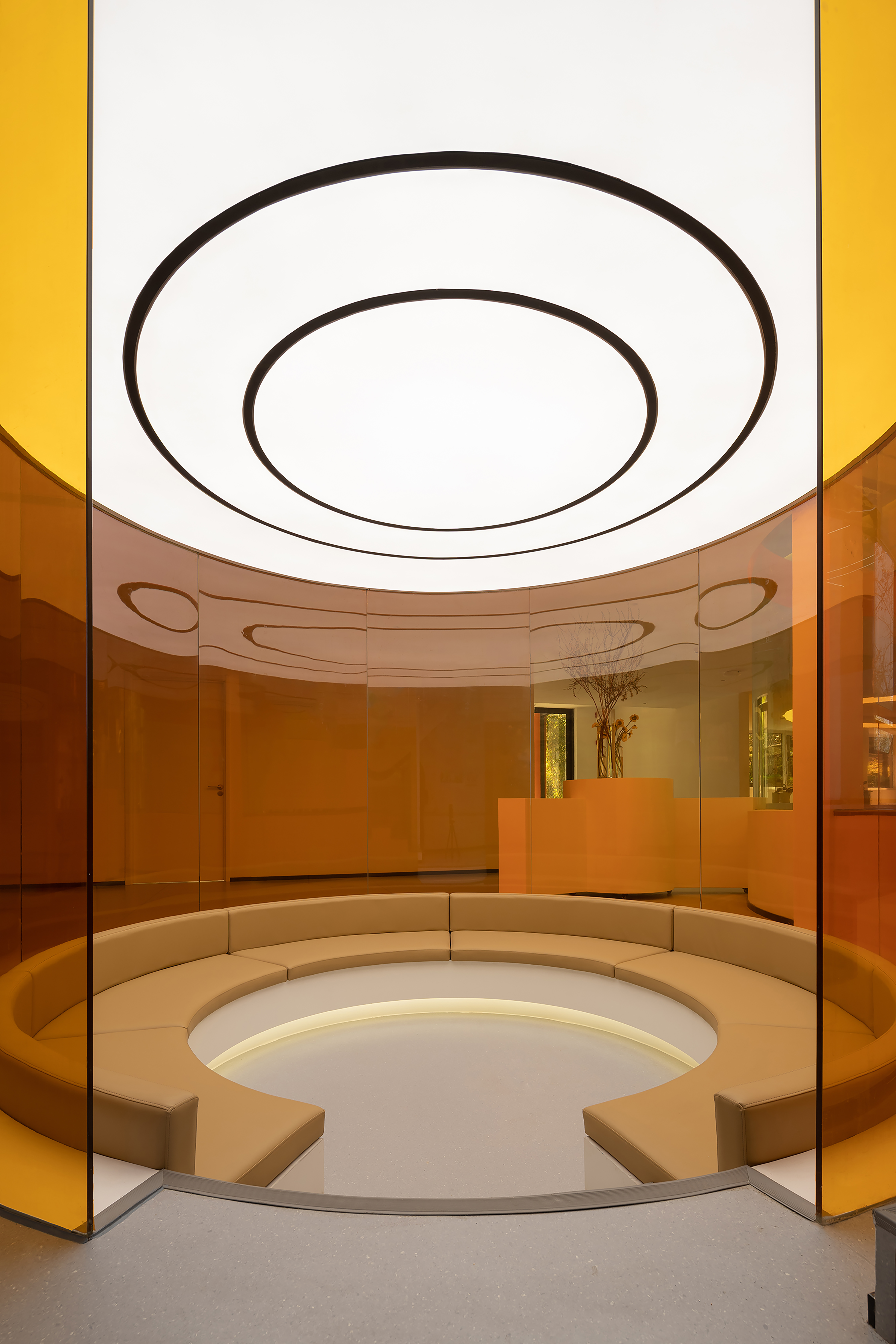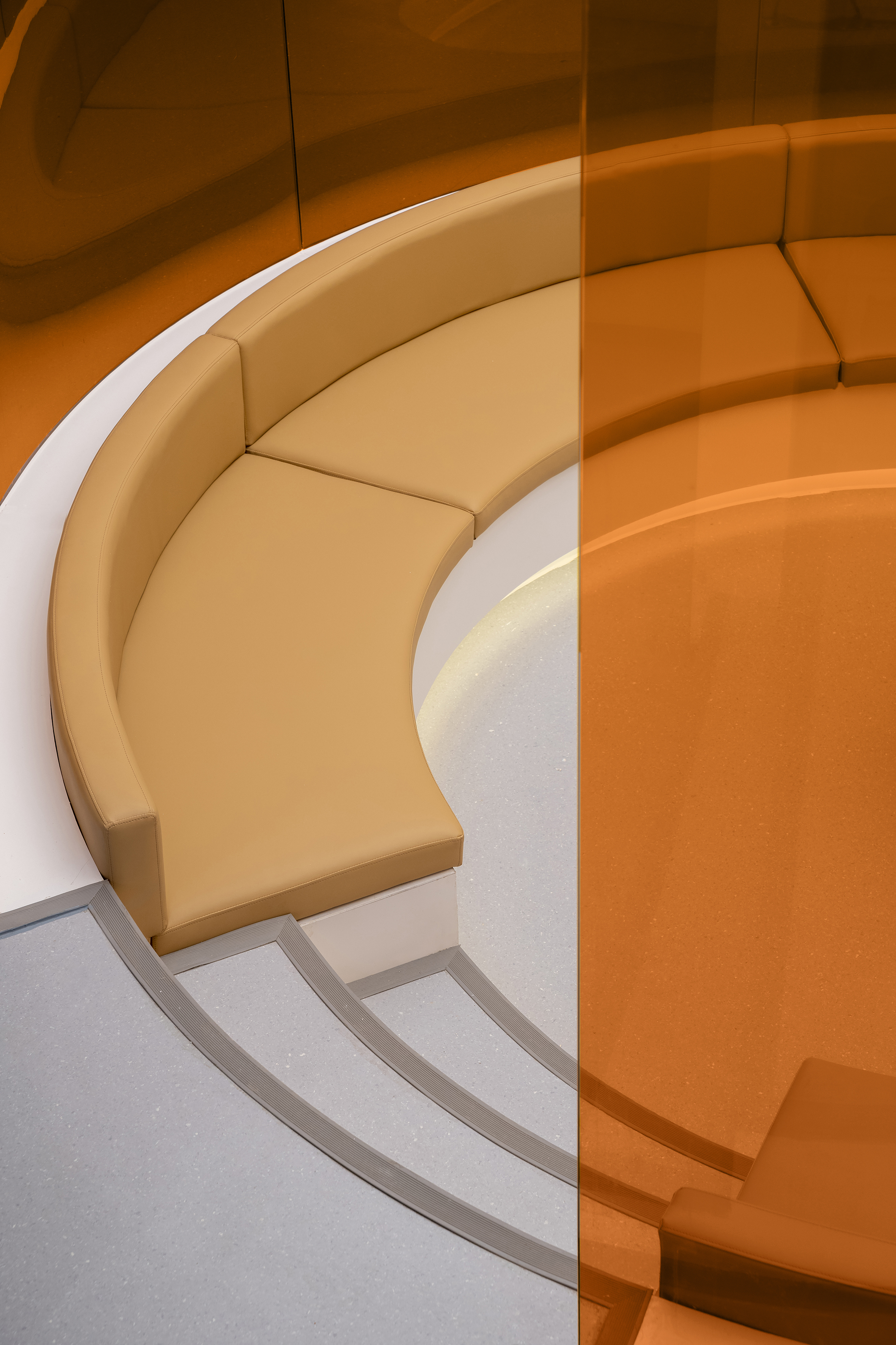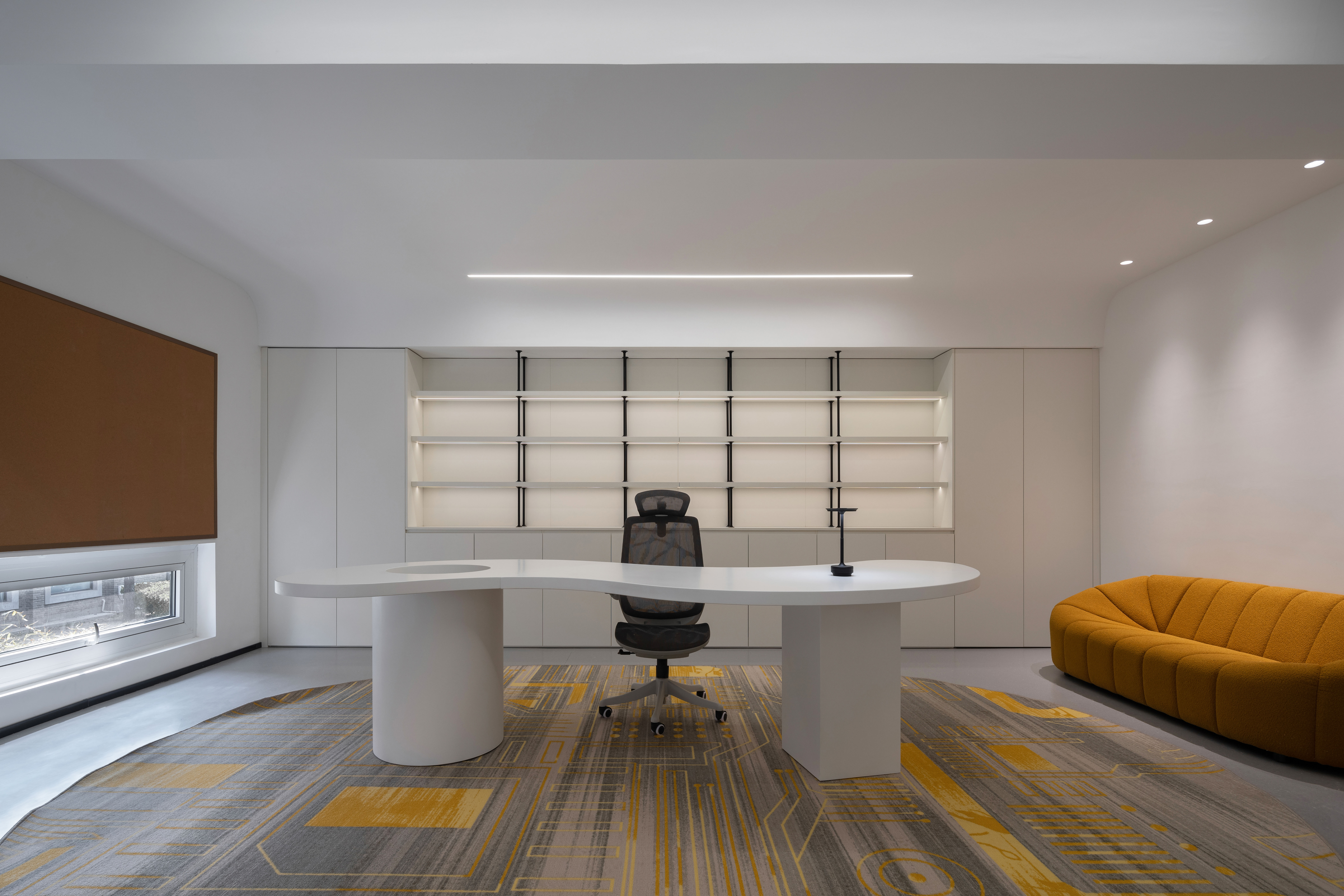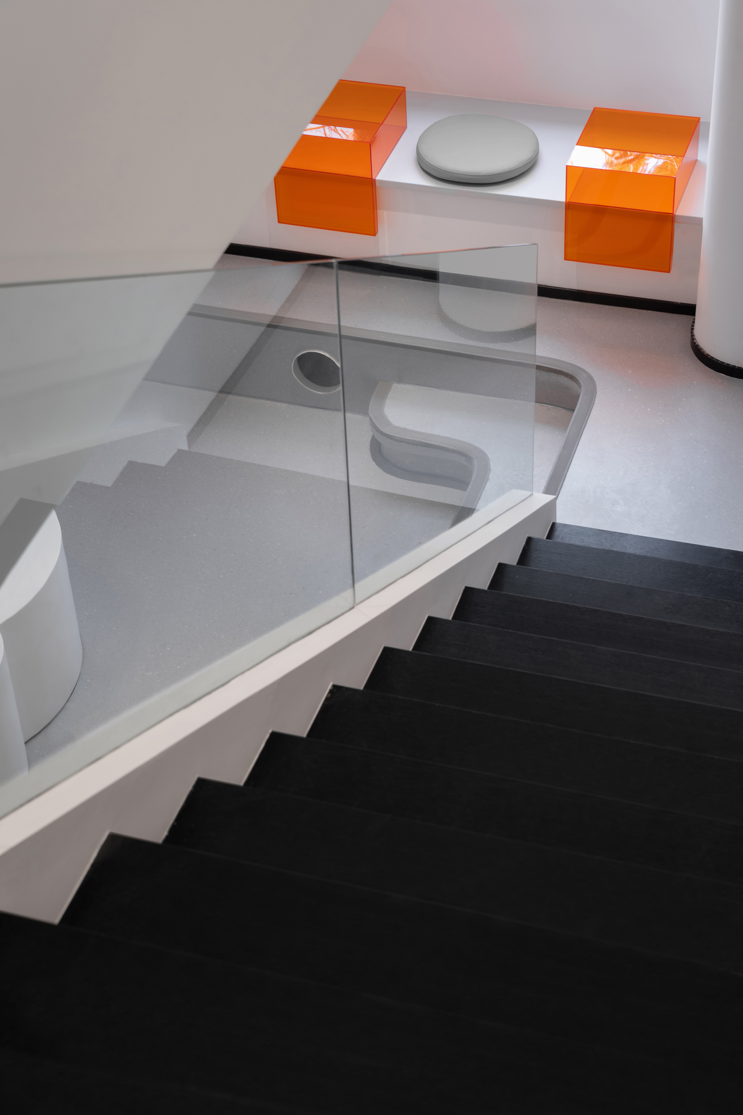 在空间的材质和色彩上都是采用减法,来最大程度的还原空间的尺度和自由。从墙面的白色肌理漆到亚克力到玻璃到家具的白色烤漆和橘色烤漆,都是以干净纯粹为标准的选择。色彩的规划就是橘色跳进了白色的梦境中,通过通高又穿透的玻璃和层高错位来完成一场橘色梦境乐园的仪式。