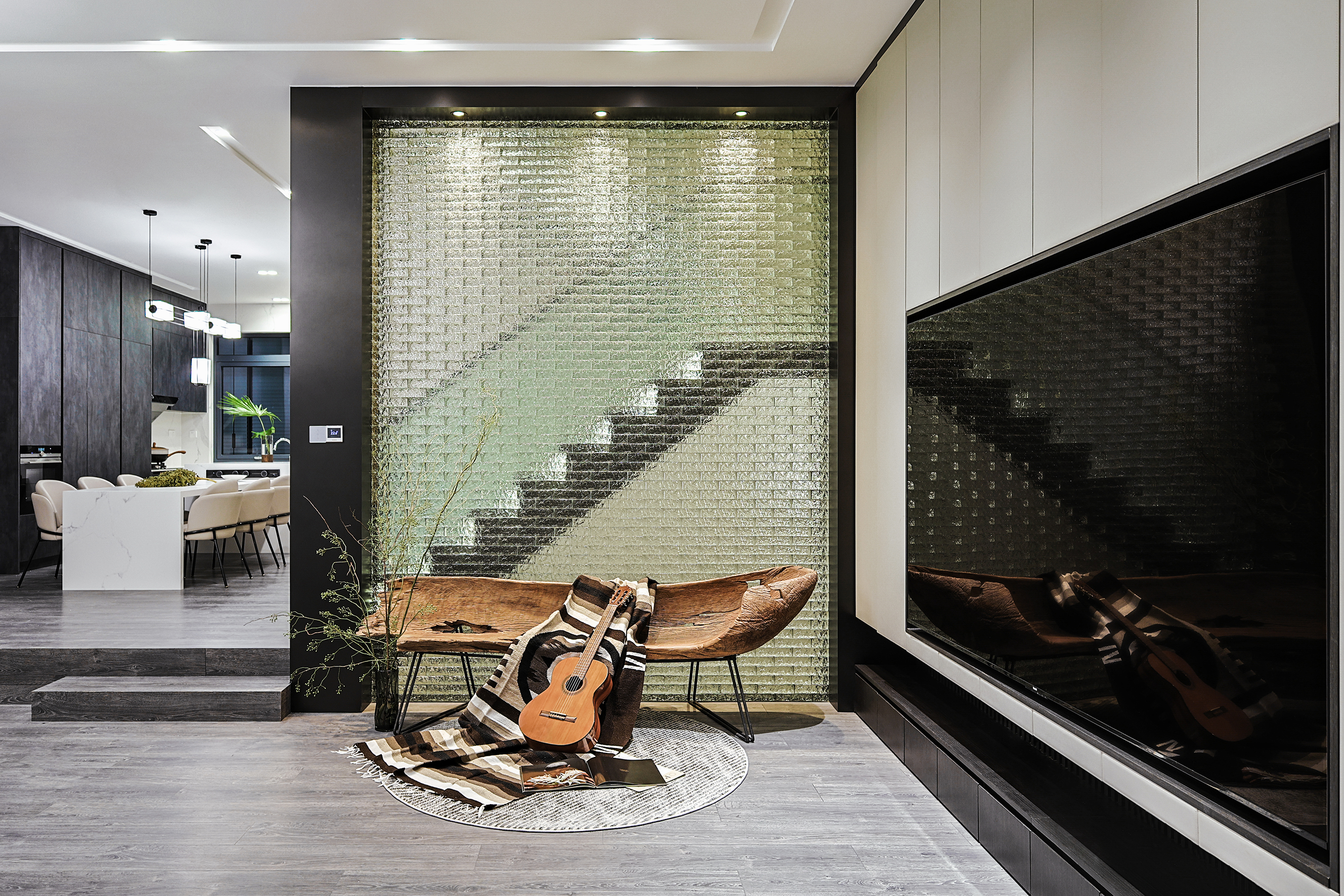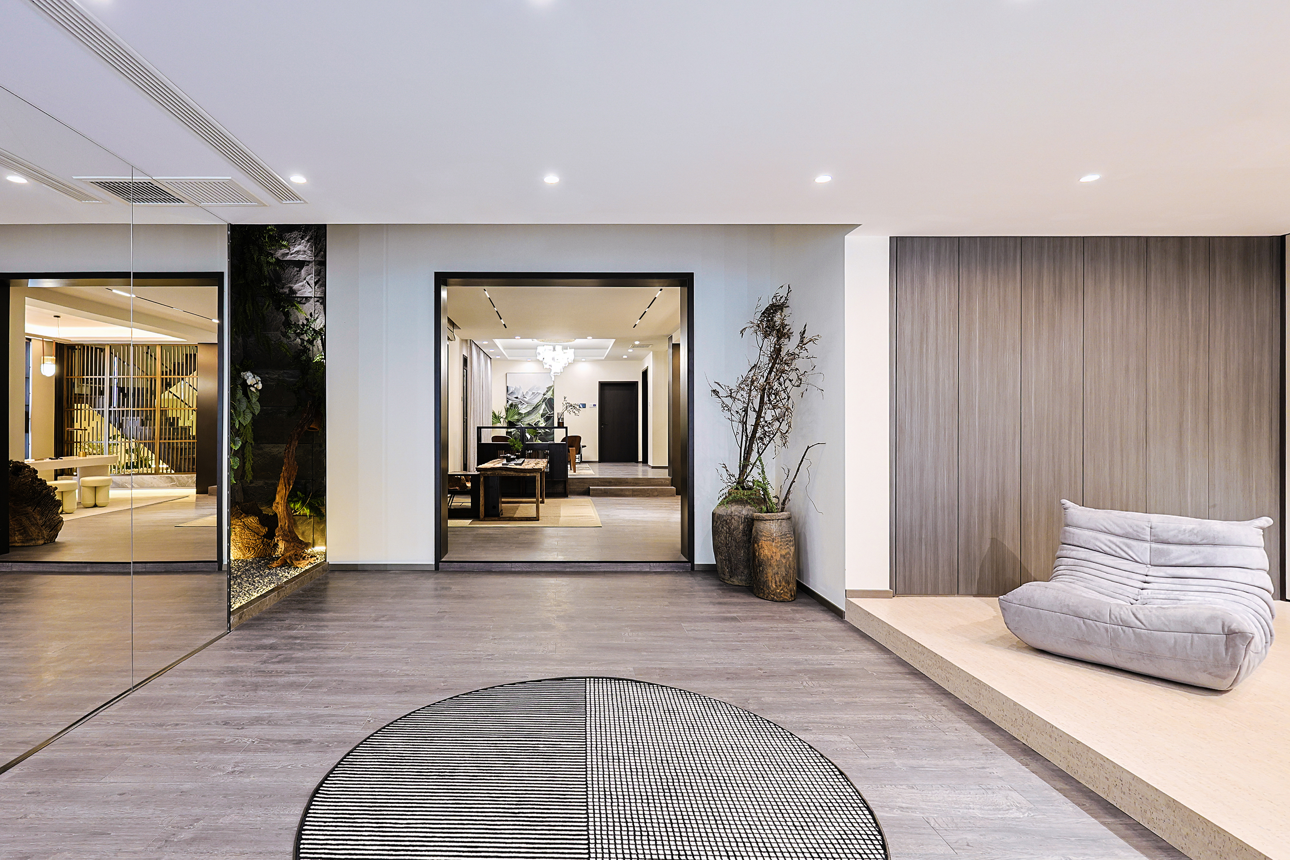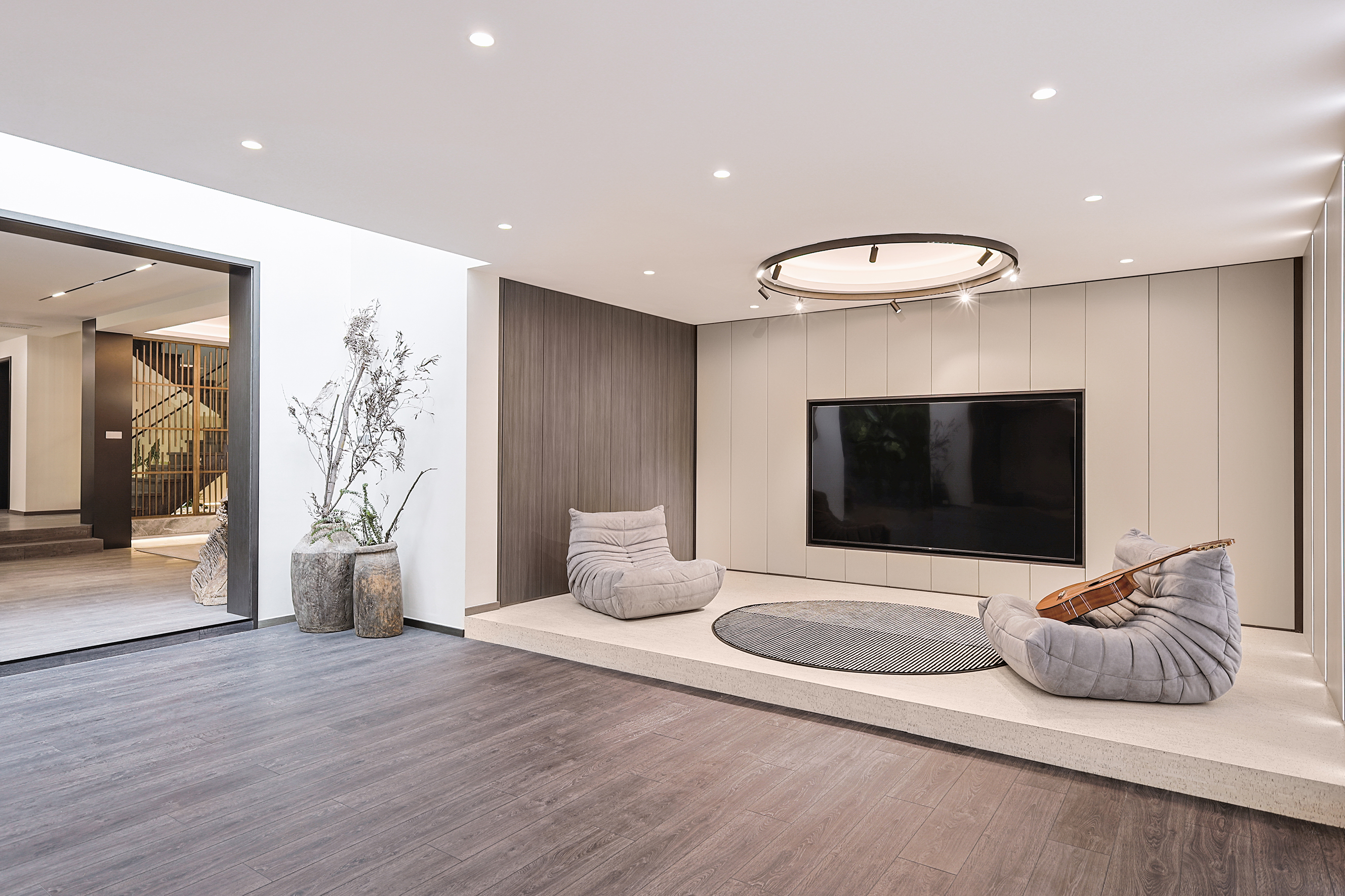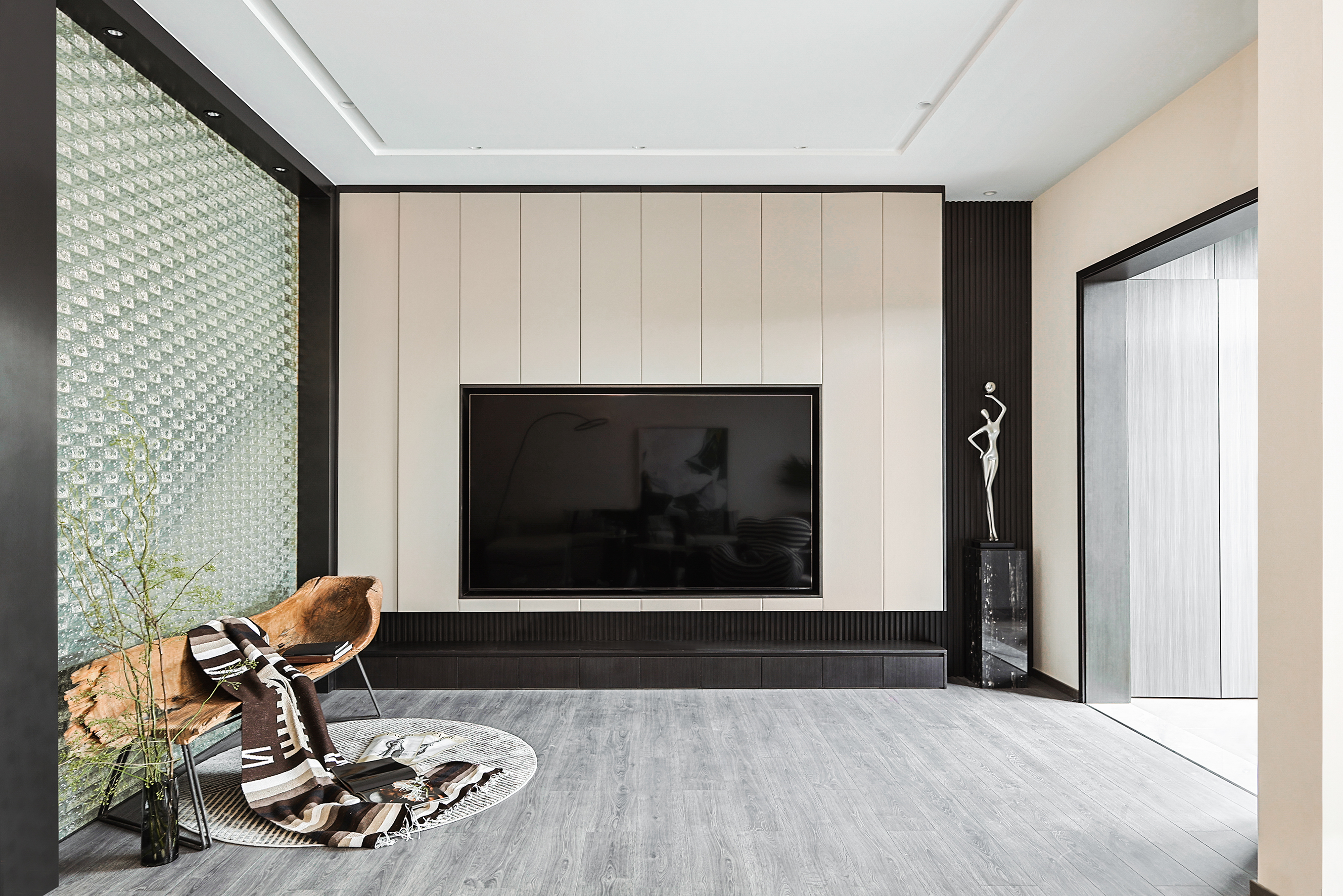 项目定位:本项目位于北京密云水库附近,整个小区被5座公园环绕,一条河流横穿,天然森系氧吧。这是客户的第二居所,疫情之后希望成为整个家庭放松度假的合家欢会所。整体空间的调性以黑白灰三色为主的现代休闲风格,搭配从丽江古城淘回来的根雕,仿佛被古老时光、自然植物和现代生活亲吻般充满爱意。女主人喜欢空间的开阔和原木的包围感,特别排斥大理石的冰冷。所以整个项目一层的餐厨和客厅,地下的休闲娱乐空间全是打通,视野特别的开阔;同时地面通铺了木地板,包括地下一层选了防潮木地板。在玄关和走廊以及休闲区都专门设置了展示台,为了后期女主人从公园采撷花植做插花提供了便利。