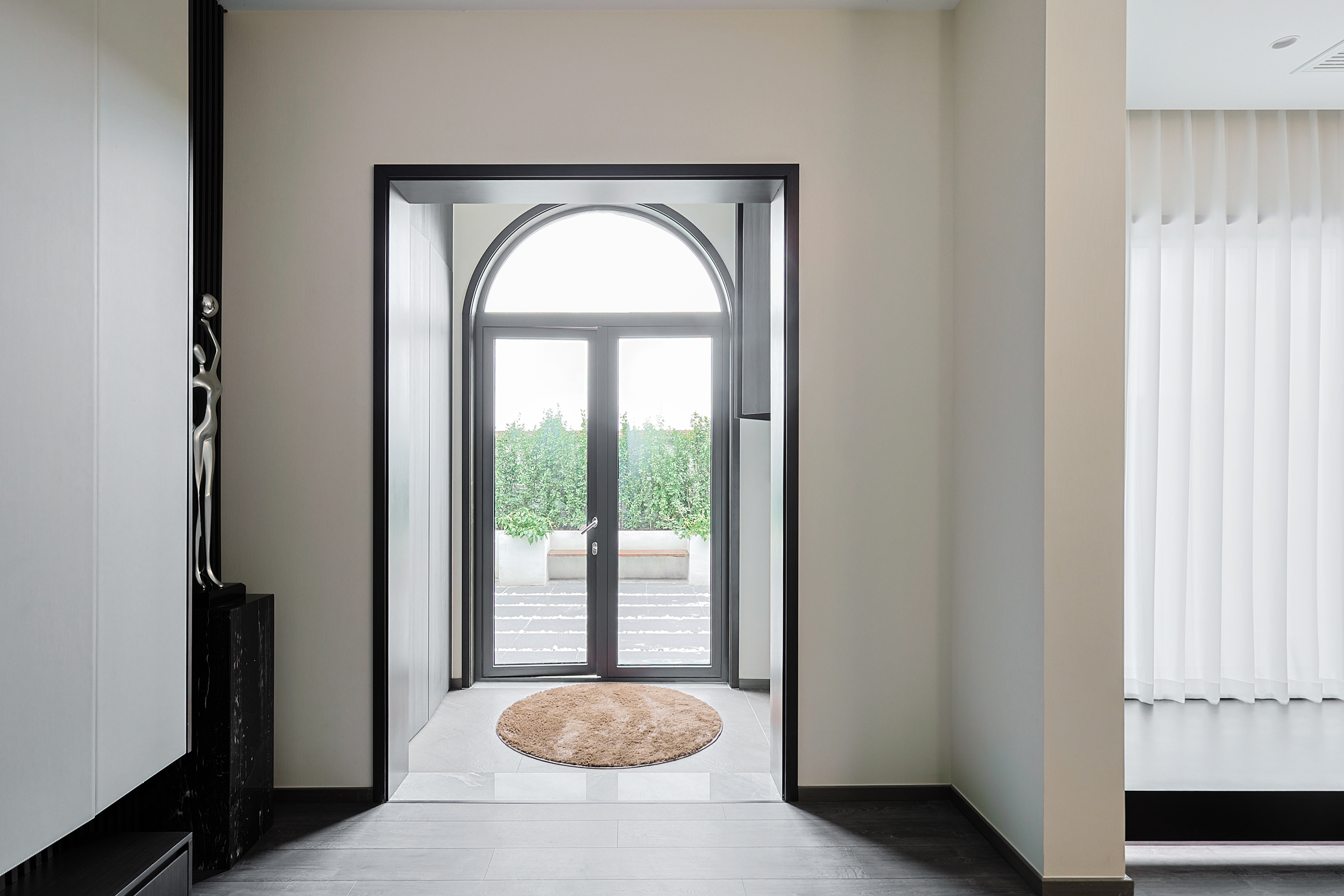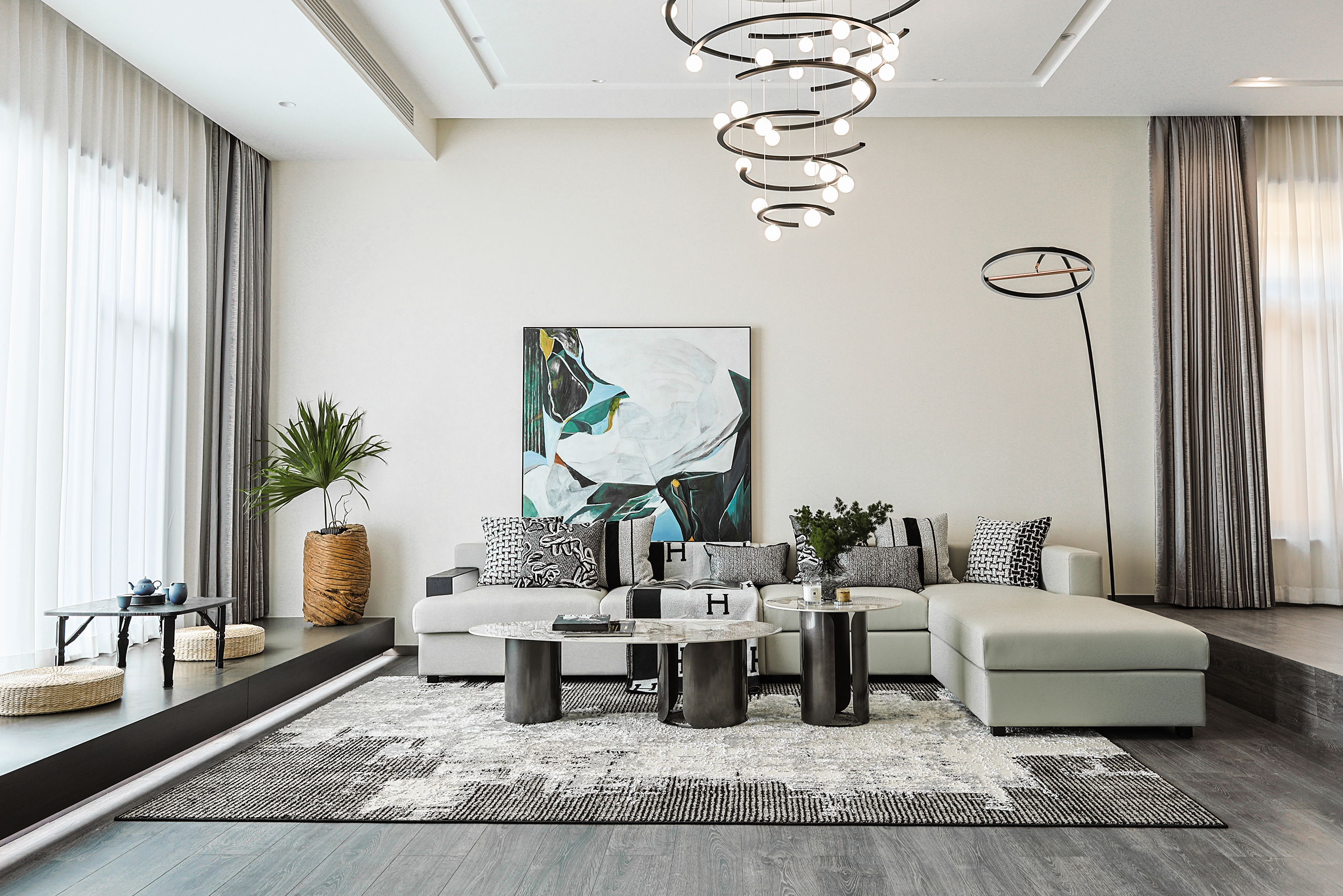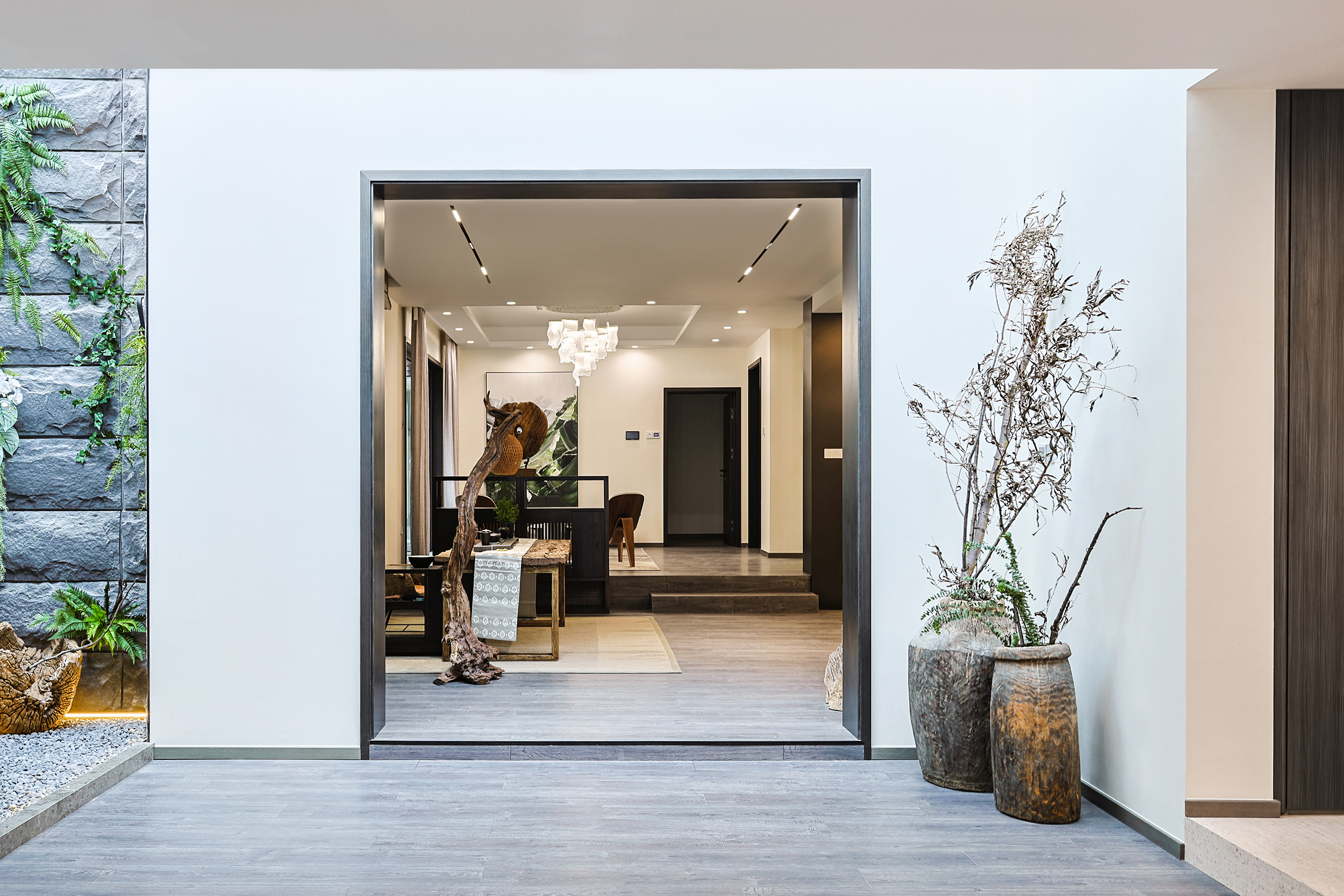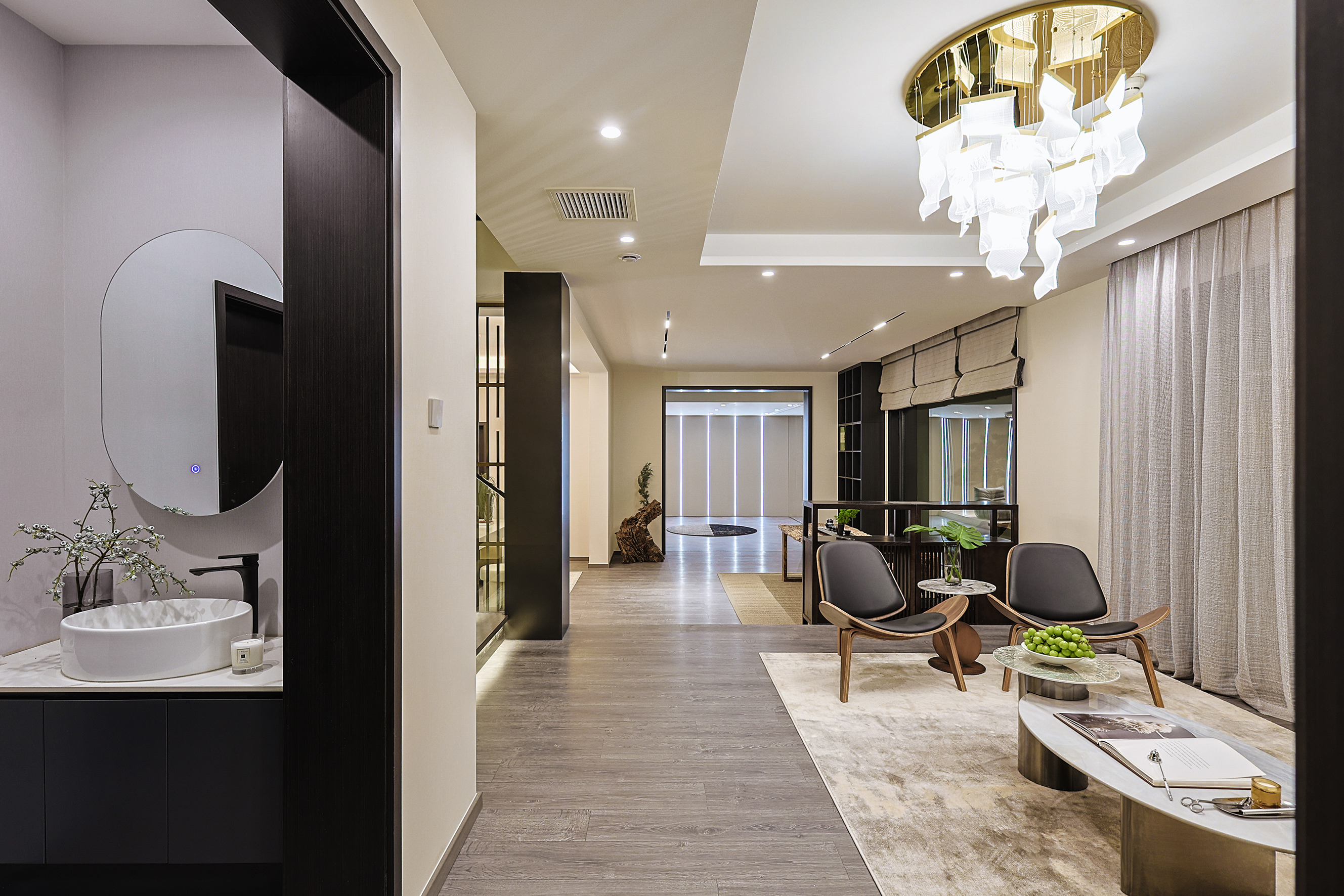 项目定位:本项目位于北京密云水库附近,整个小区被5座公园环绕,一条河流横穿,天然森系氧吧。这是客户的第二居所,疫情之后希望成为整个家庭放松度假的合家欢会所。整体空间的调性以黑白灰三色为主的现代休闲风格,搭配从丽江古城淘回来的根雕,仿佛被古老时光、自然植物和现代生活亲吻般充满爱意。女主人喜欢空间的开阔和原木的包围感,特别排斥大理石的冰冷。所以整个项目一层的餐厨和客厅,地下的休闲娱乐空间全是打通,视野特别的开阔;同时地面通铺了木地板,包括地下一层选了防潮木地板。在玄关和走廊以及休闲区都专门设置了展示台,为了后期女主人从公园采撷花植做插花提供了便利。