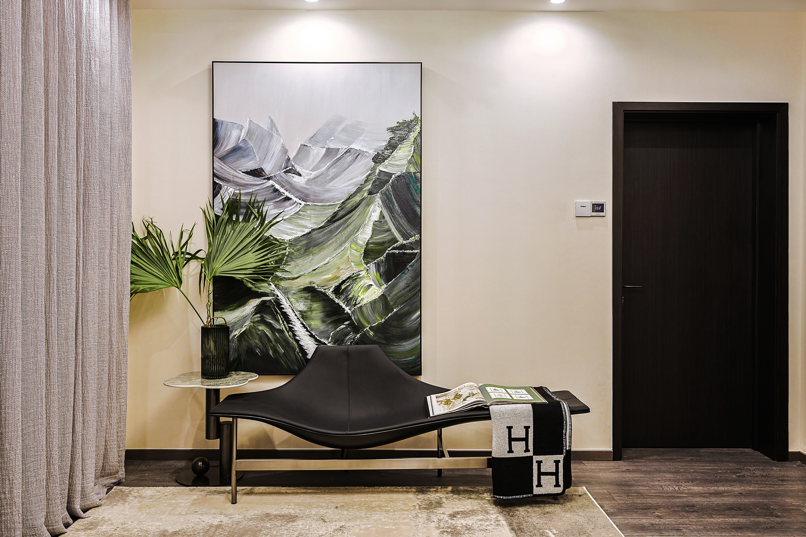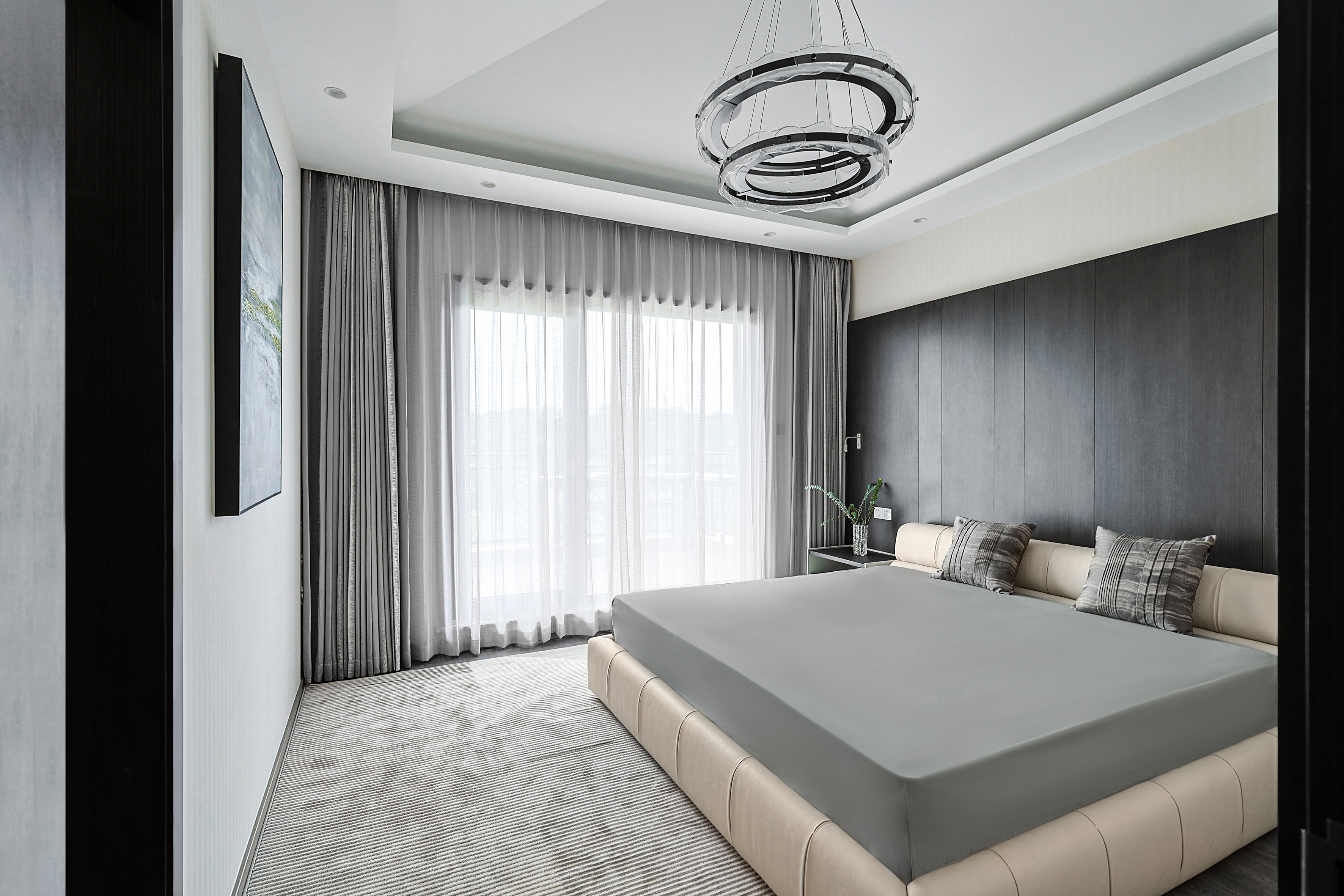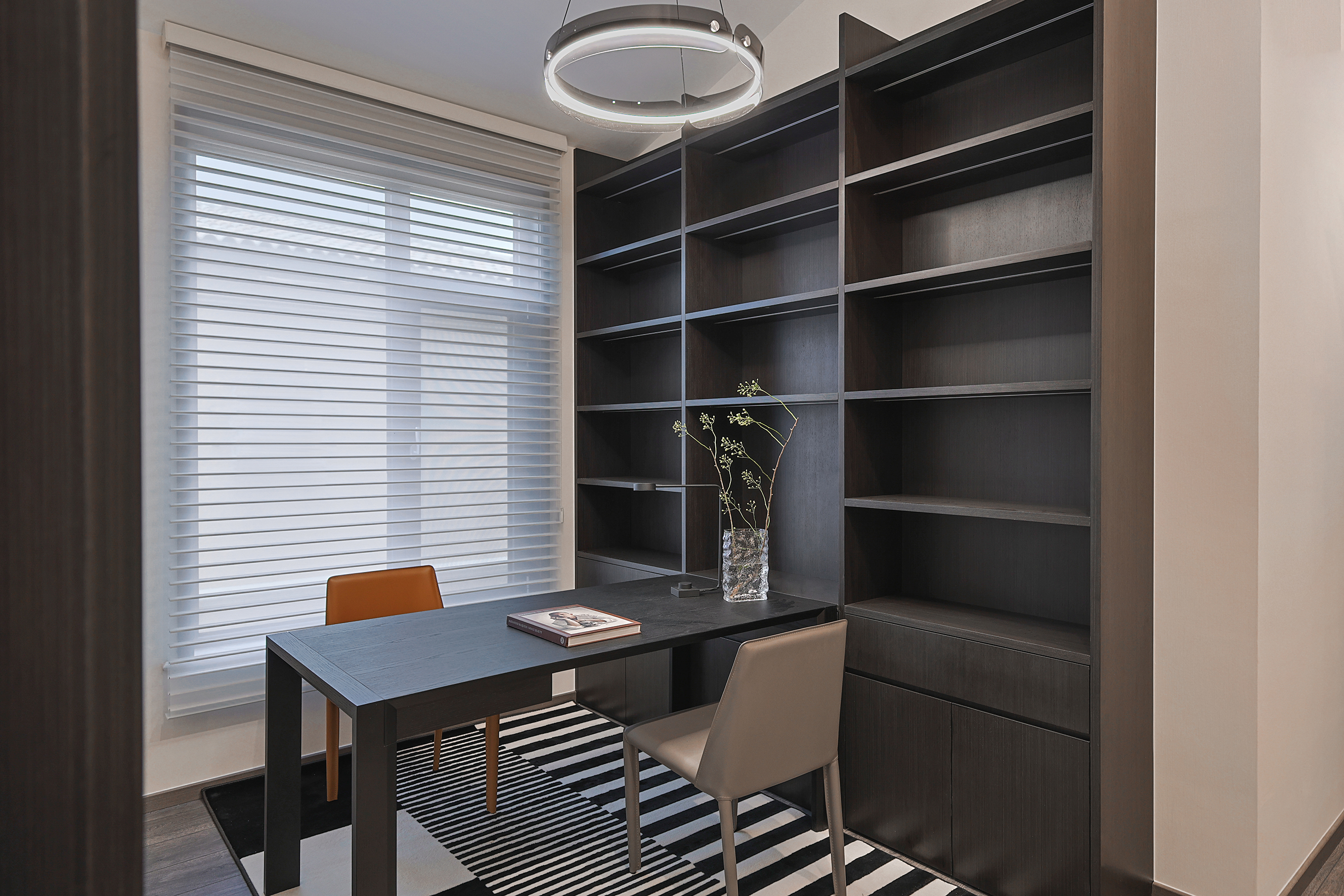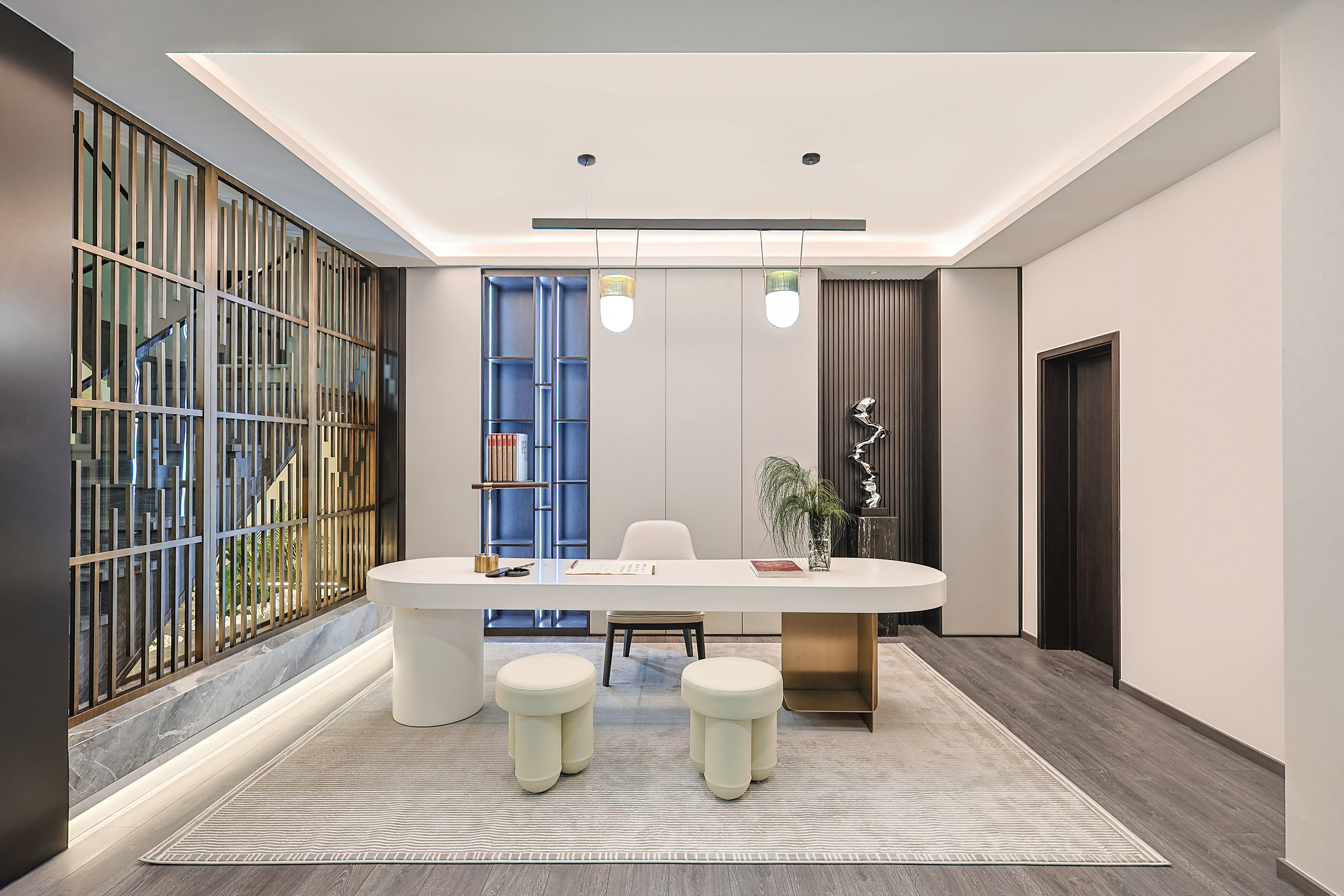 项目定位:本项目位于北京密云水库附近,整个小区被5座公园环绕,一条河流横穿,天然森系氧吧。这是客户的第二居所,疫情之后希望成为整个家庭放松度假的合家欢会所。整体空间的调性以黑白灰三色为主的现代休闲风格,搭配从丽江古城淘回来的根雕,仿佛被古老时光、自然植物和现代生活亲吻般充满爱意。女主人喜欢空间的开阔和原木的包围感,特别排斥大理石的冰冷。所以整个项目一层的餐厨和客厅,地下的休闲娱乐空间全是打通,视野特别的开阔;同时地面通铺了木地板,包括地下一层选了防潮木地板。在玄关和走廊以及休闲区都专门设置了展示台,为了后期女主人从公园采撷花植做插花提供了便利。