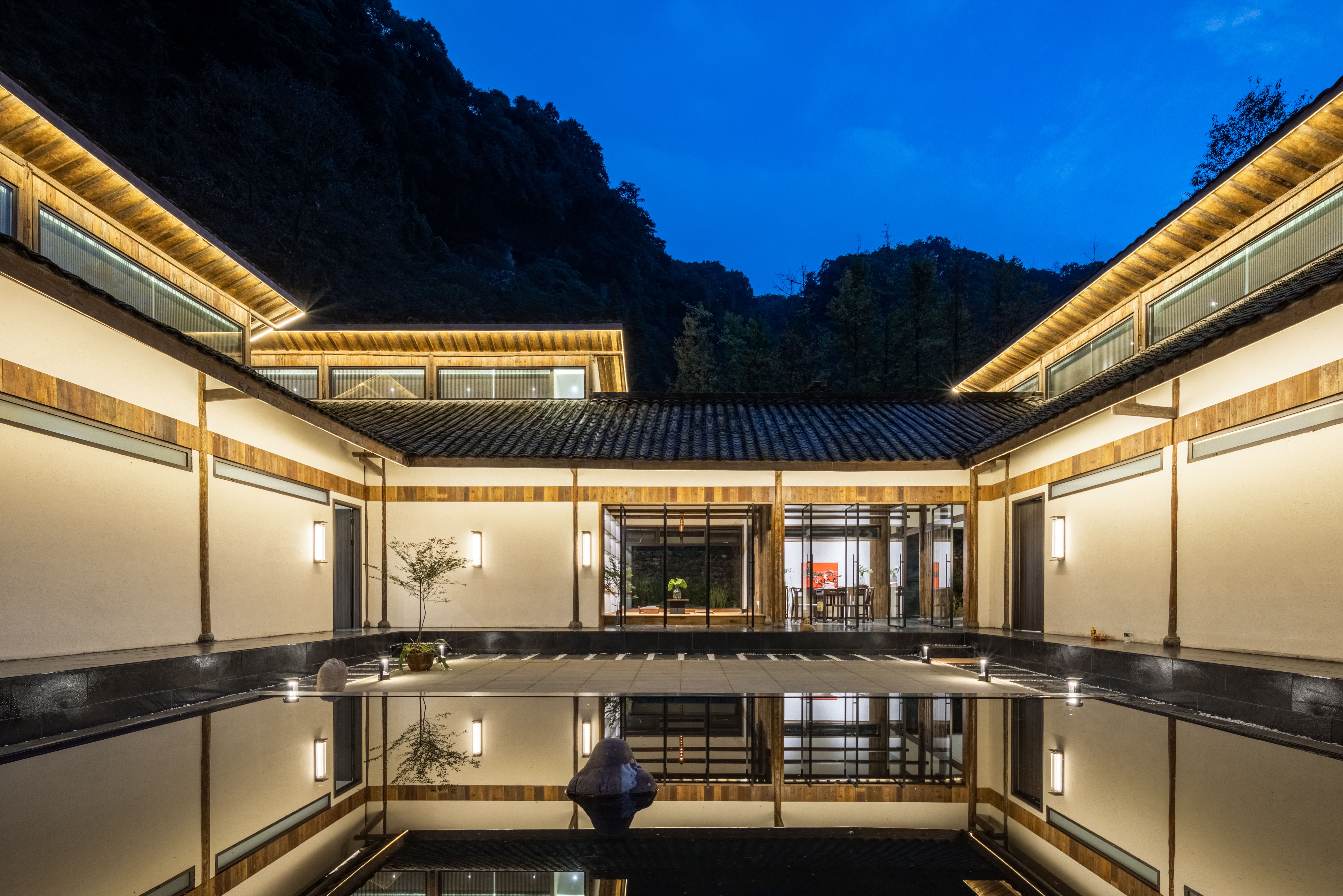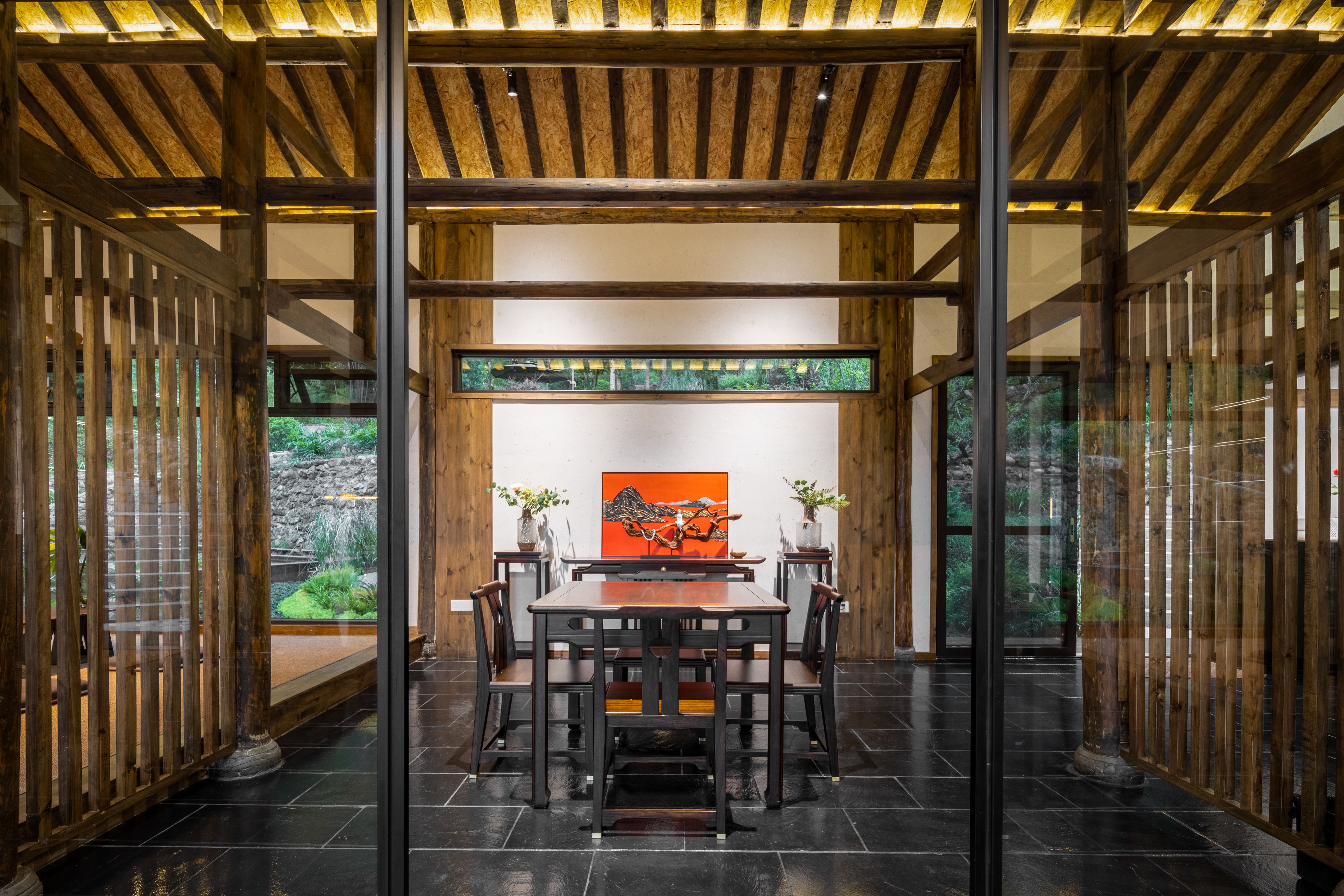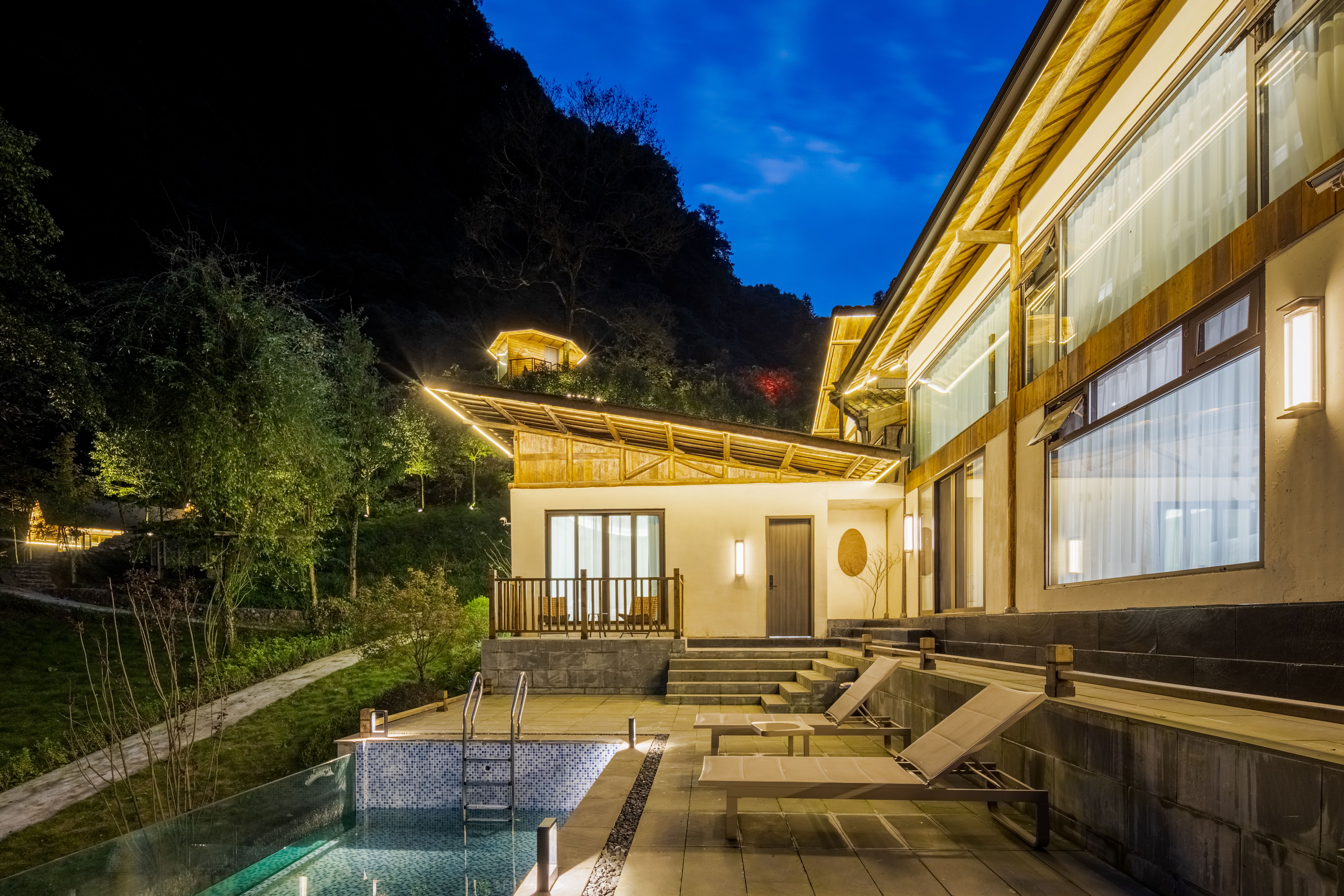 该民宿的设计首先是要尊重自然,与自然环境相融合。在建筑风格上,采用传统的川西民居特色,结合当地的文化元素,修旧如旧。一个好的民宿应该是一个让人与人之间交流互动的场所。不管是家人、朋友,还是陌生人。在设计过程中,注重公共区域的设置,如设置书房、亭子、温泉泡池、无边泳池等公共区域,让旅客在这里可以互相交谈、互通情感。