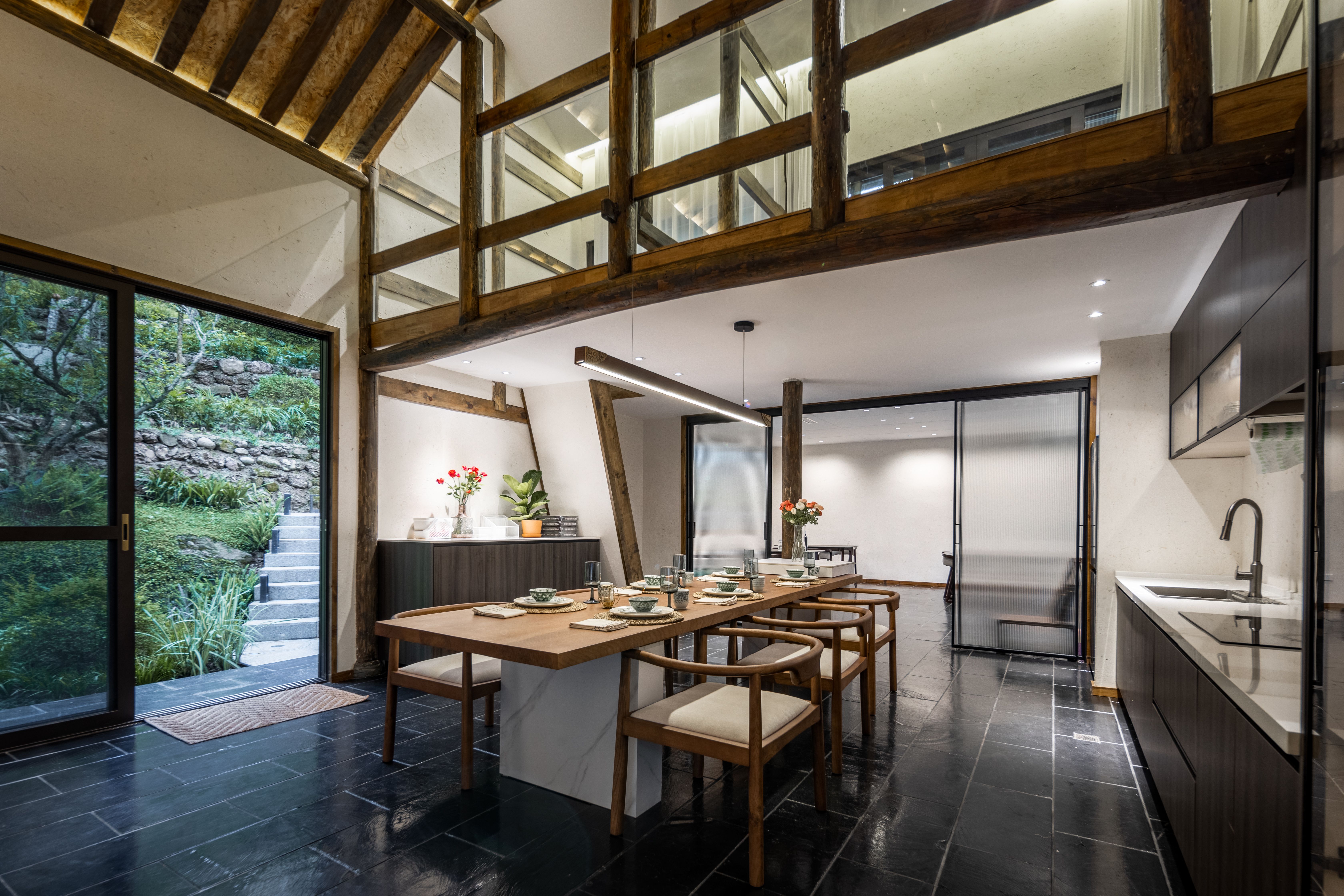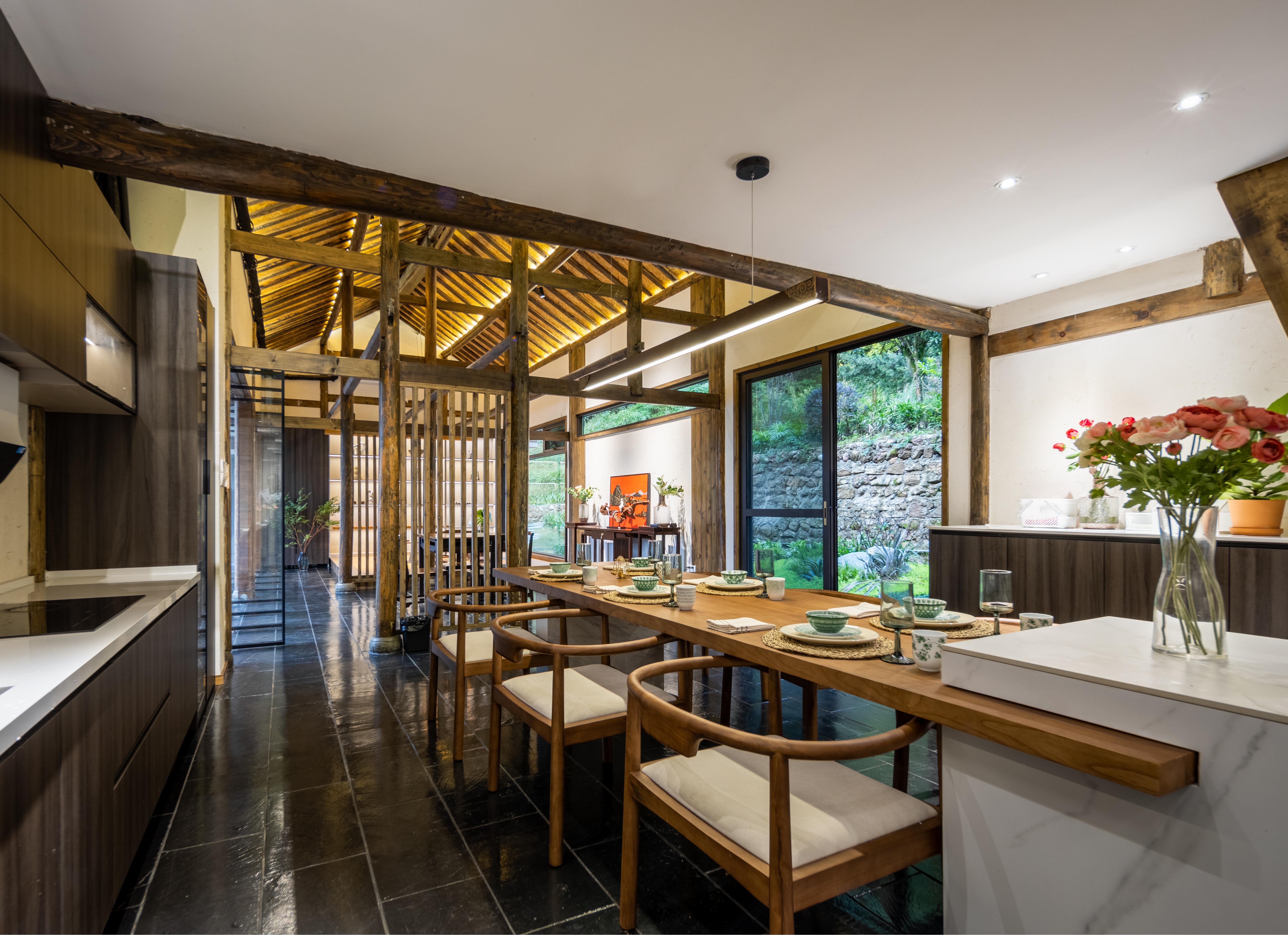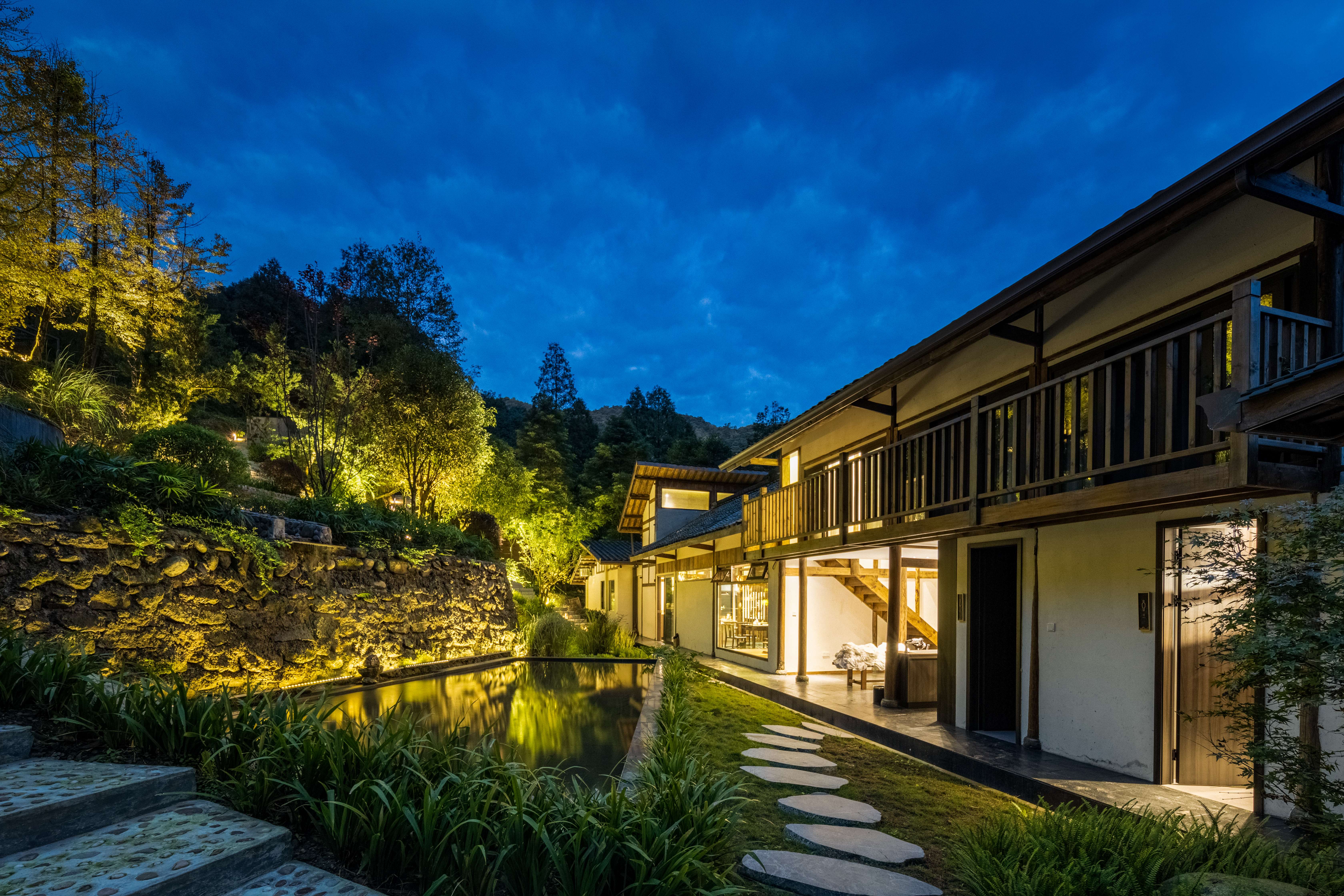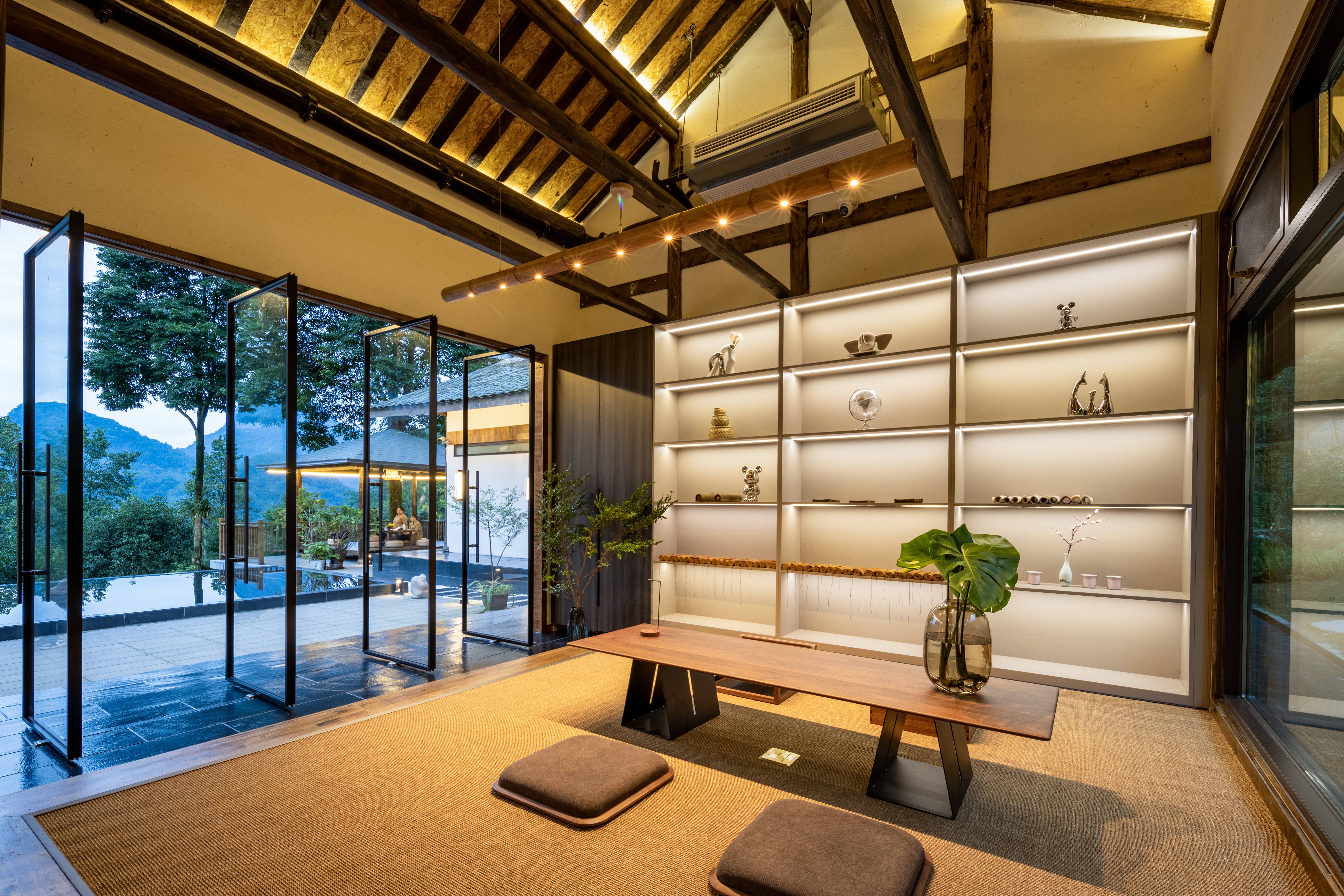 该民宿的设计首先是要尊重自然,与自然环境相融合。在建筑风格上,采用传统的川西民居特色,结合当地的文化元素,修旧如旧。一个好的民宿应该是一个让人与人之间交流互动的场所。不管是家人、朋友,还是陌生人。在设计过程中,注重公共区域的设置,如设置书房、亭子、温泉泡池、无边泳池等公共区域,让旅客在这里可以互相交谈、互通情感。