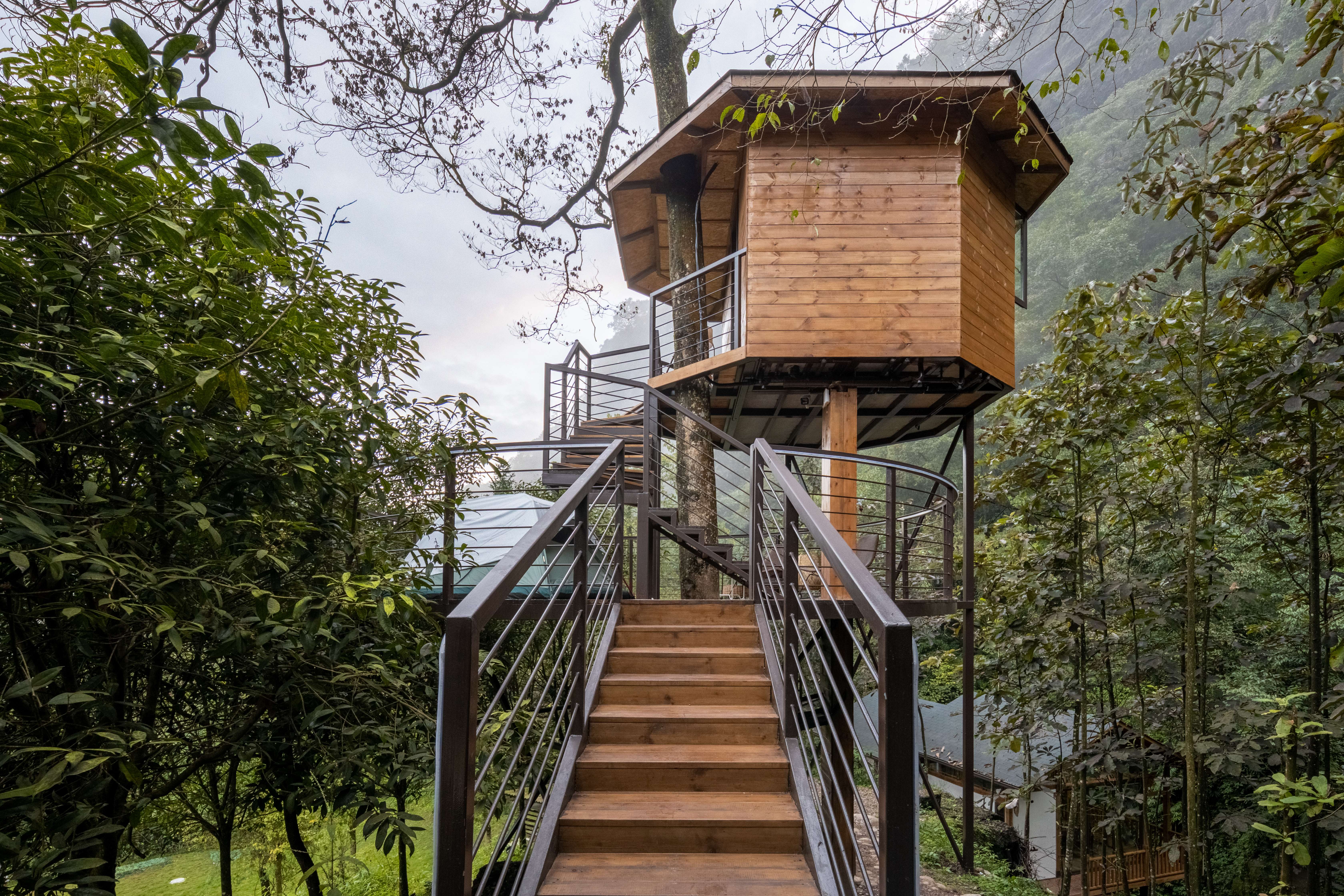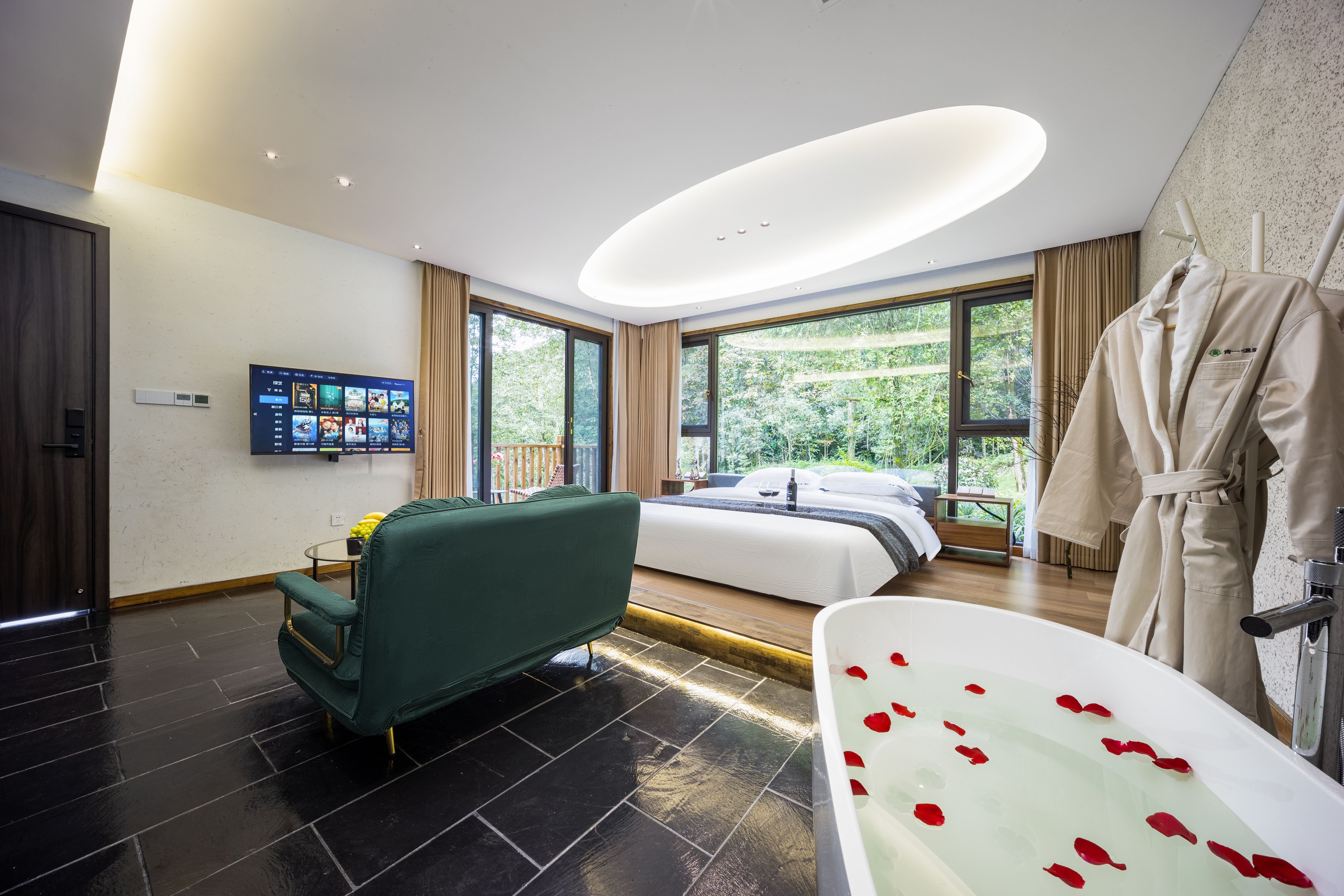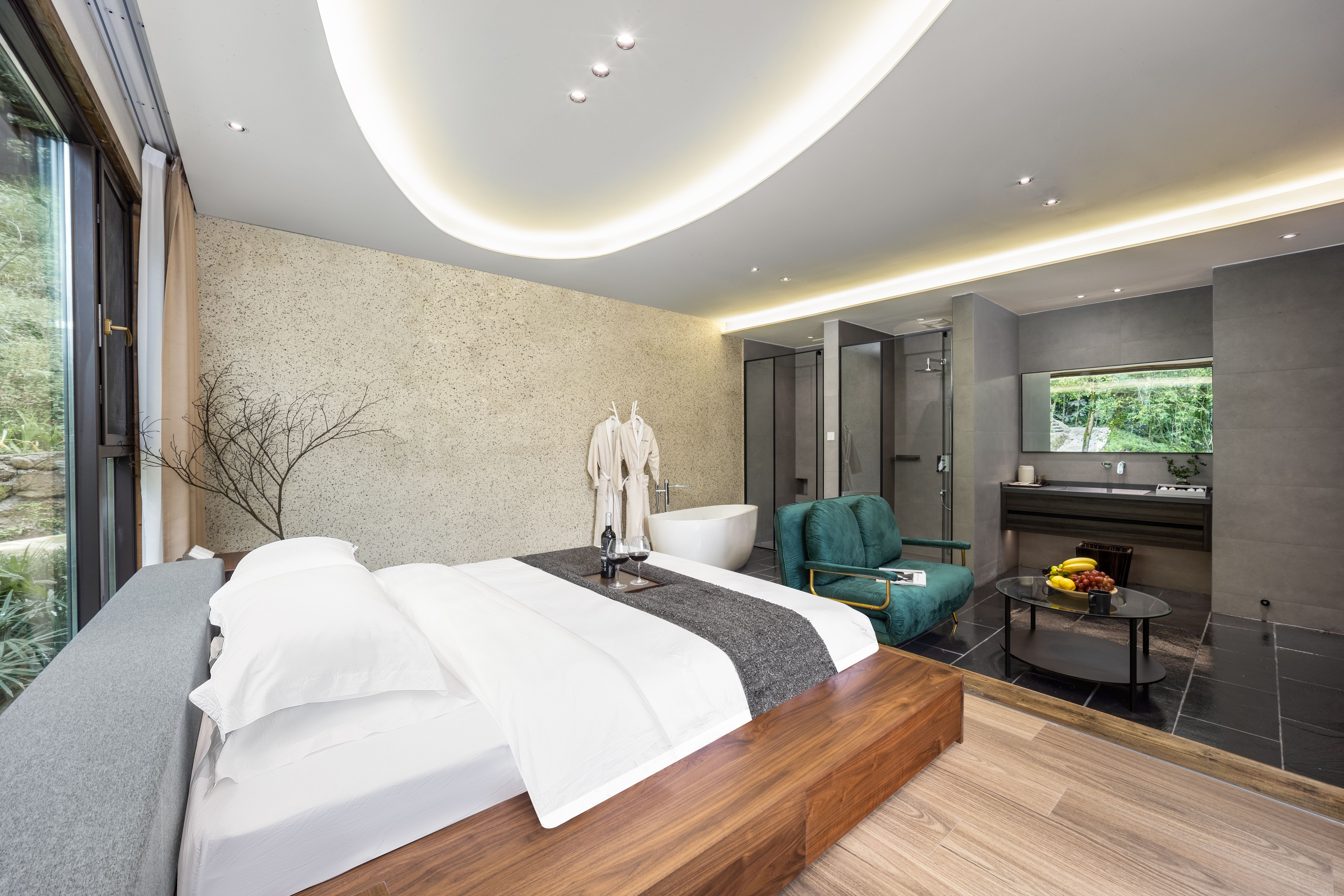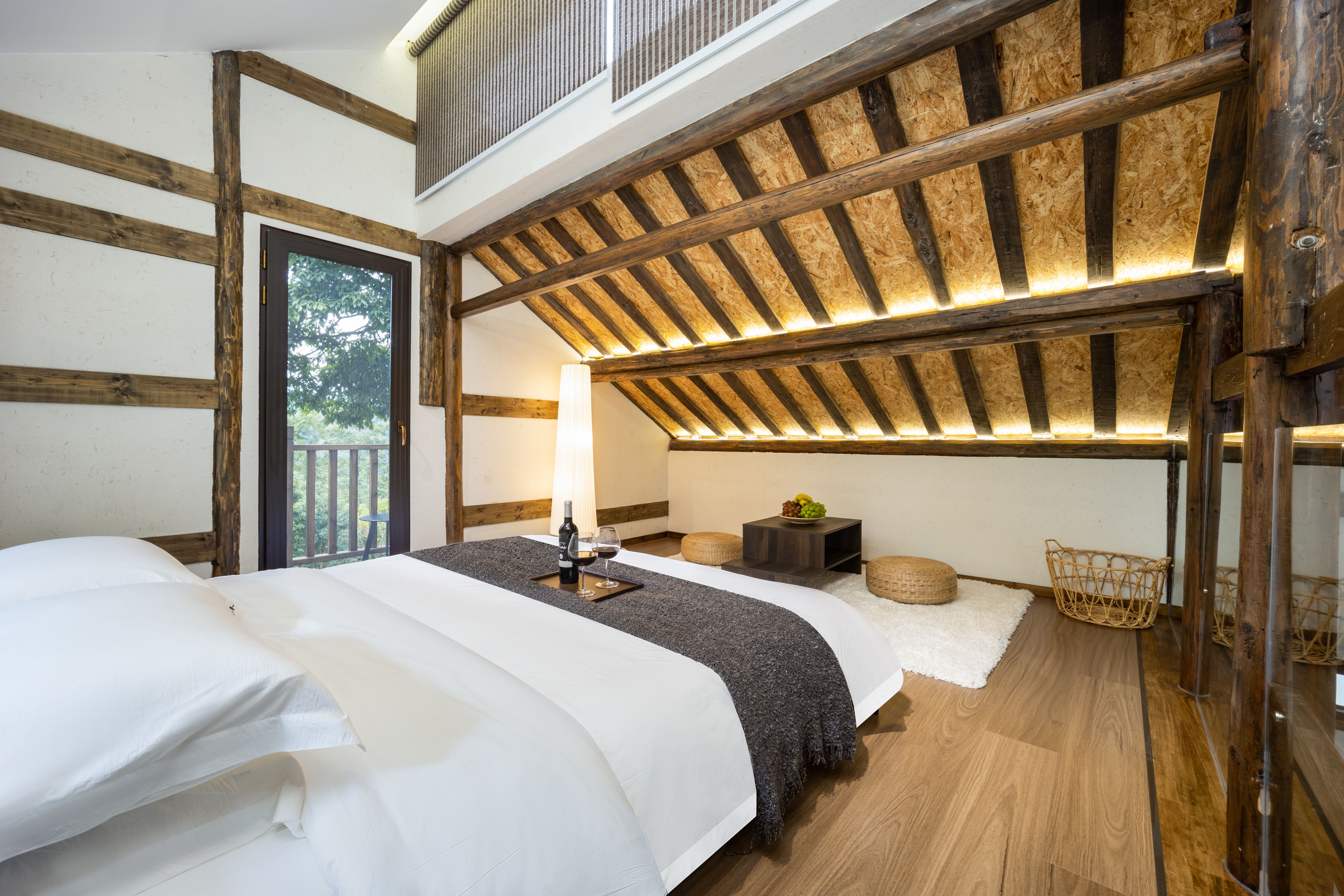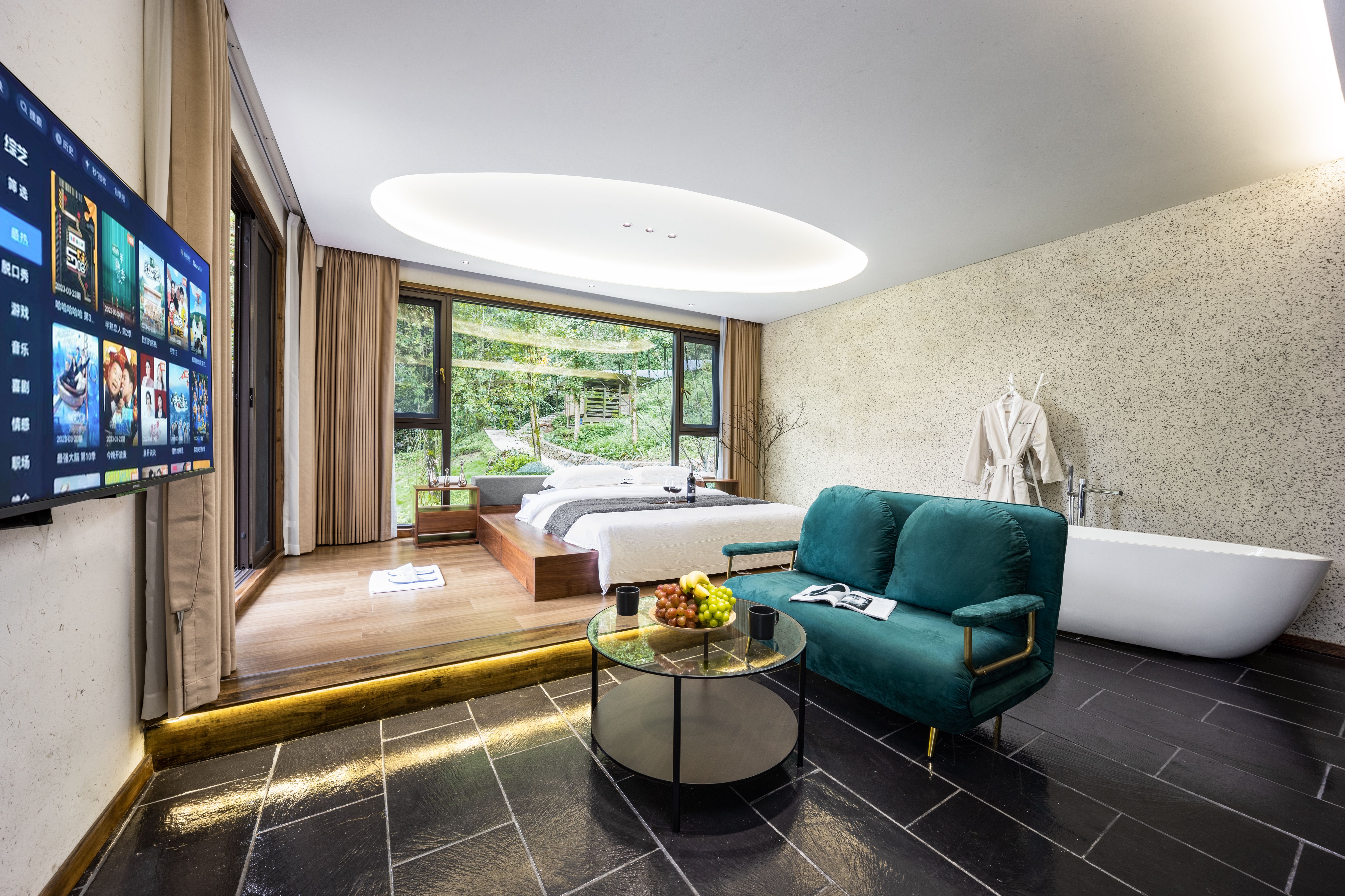 该民宿酒店客房规划有亲子房、大床房、阁楼、树屋,以满足游客的不同需求。房间的舒适性是设计考虑的内核,本案采用五恒空气系统,以保证山区中适宜的室内温度和湿度。房间内材质也回归自然,回归山野,就地取材。灯光设计上,更注重舒适性、引导性和温馨自然的感觉,为游客创造一个宜人的住宿环境。树屋,一种回归自然,与世无争的居住形态,把家安在山野之中,把生活引入密林深处,让人与自然和谐共生,倾听大自然的声音创造一种室外桃源般的恬静生活。树屋的设计,是对大自然的深深敬畏与融入。