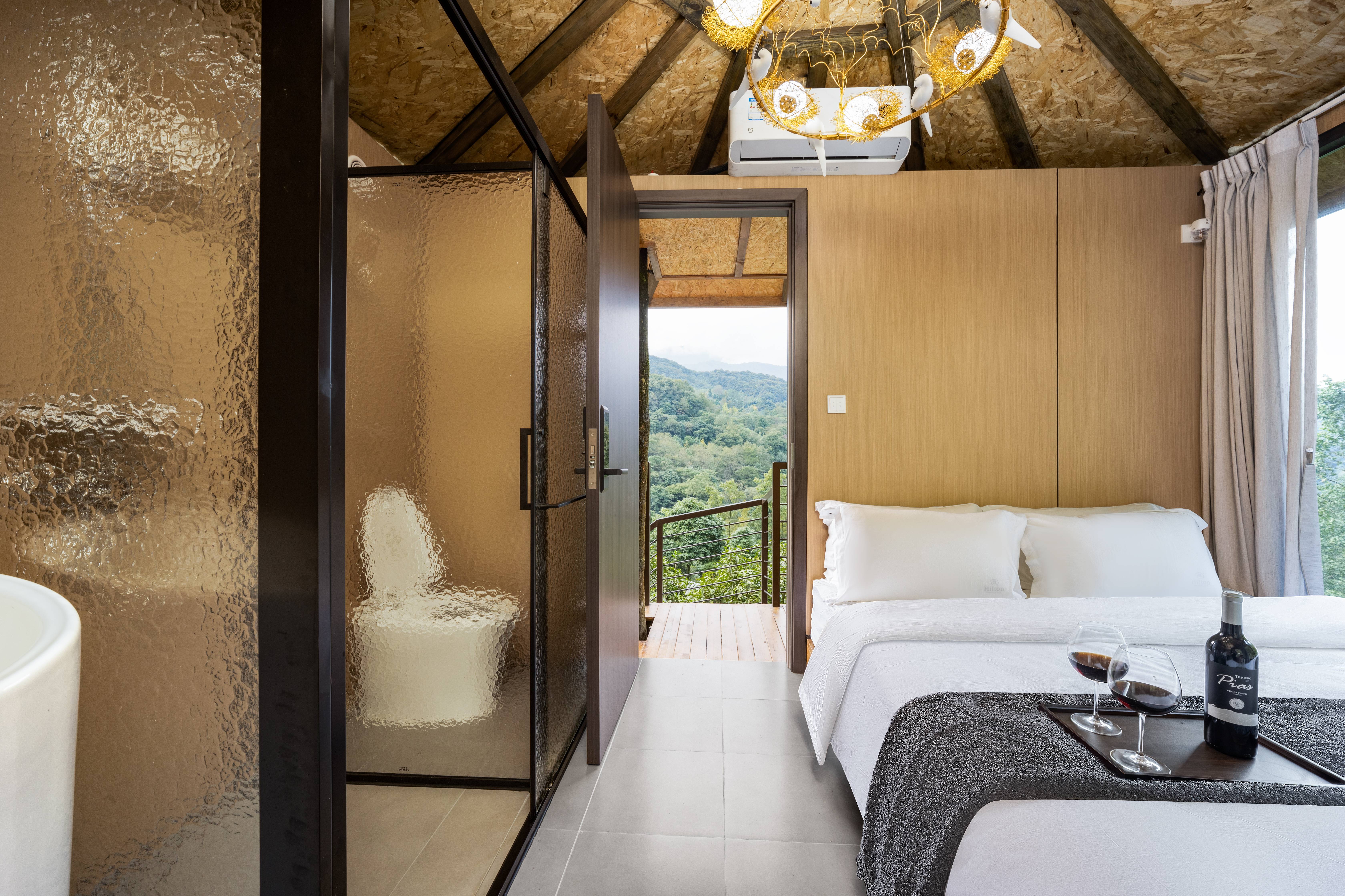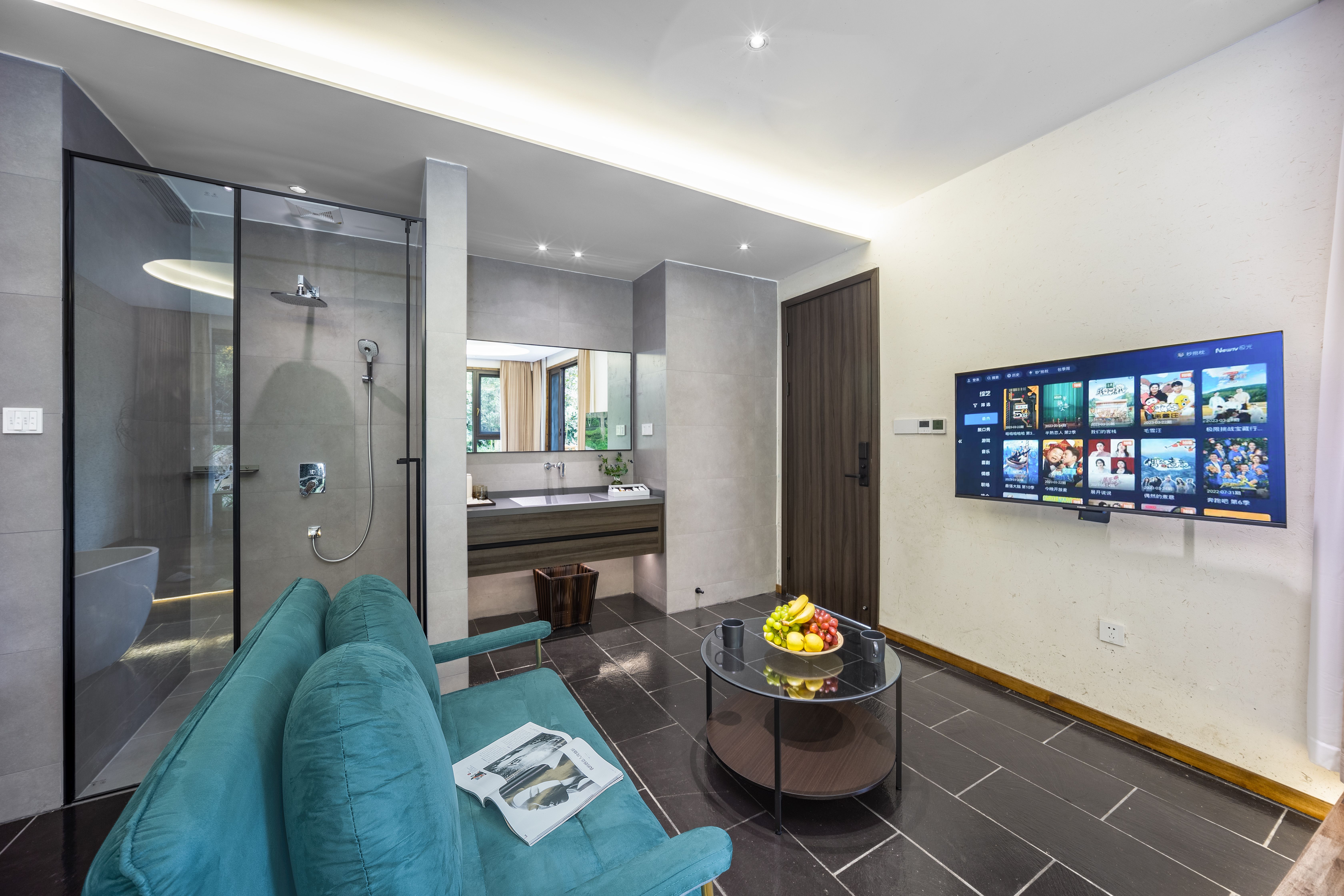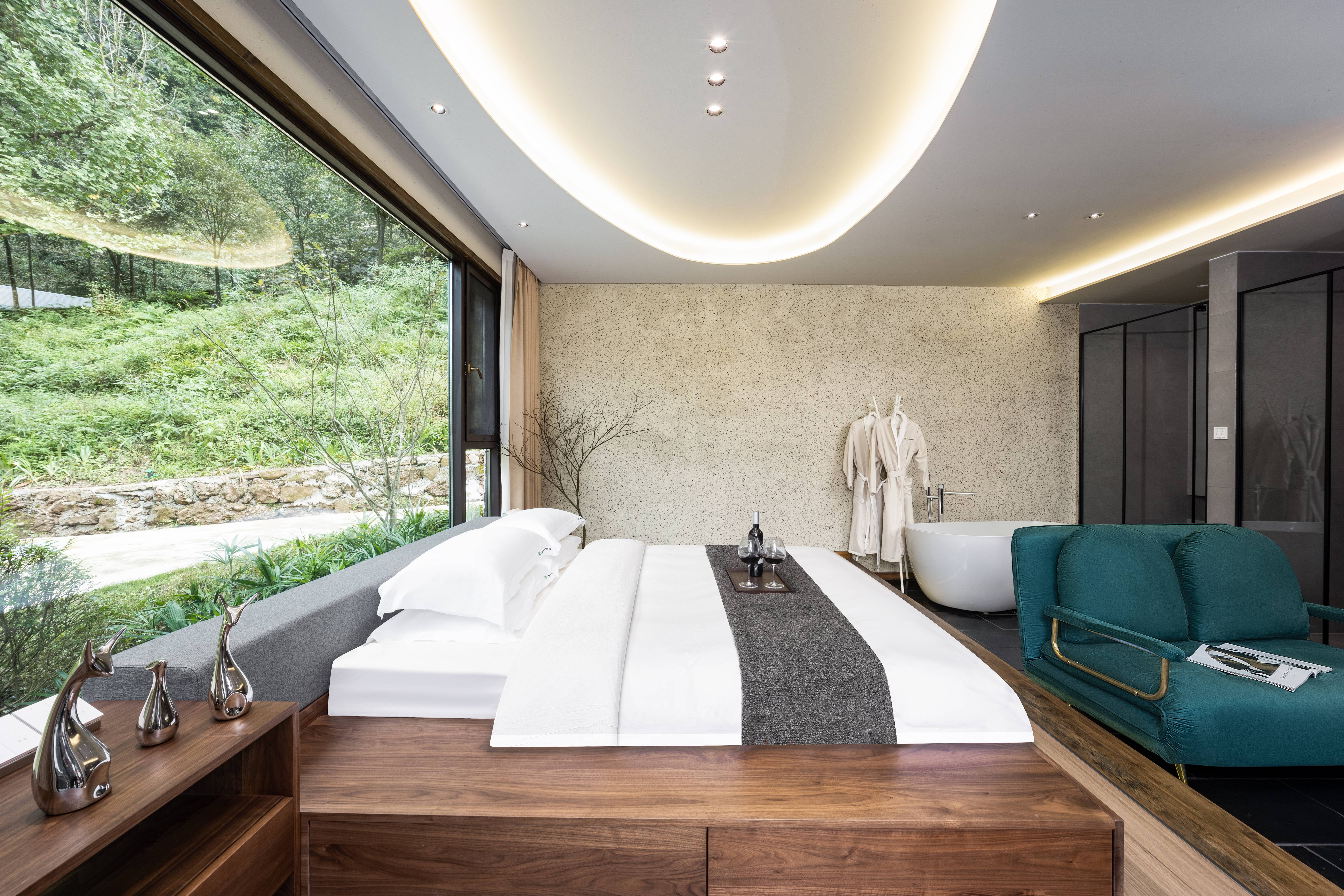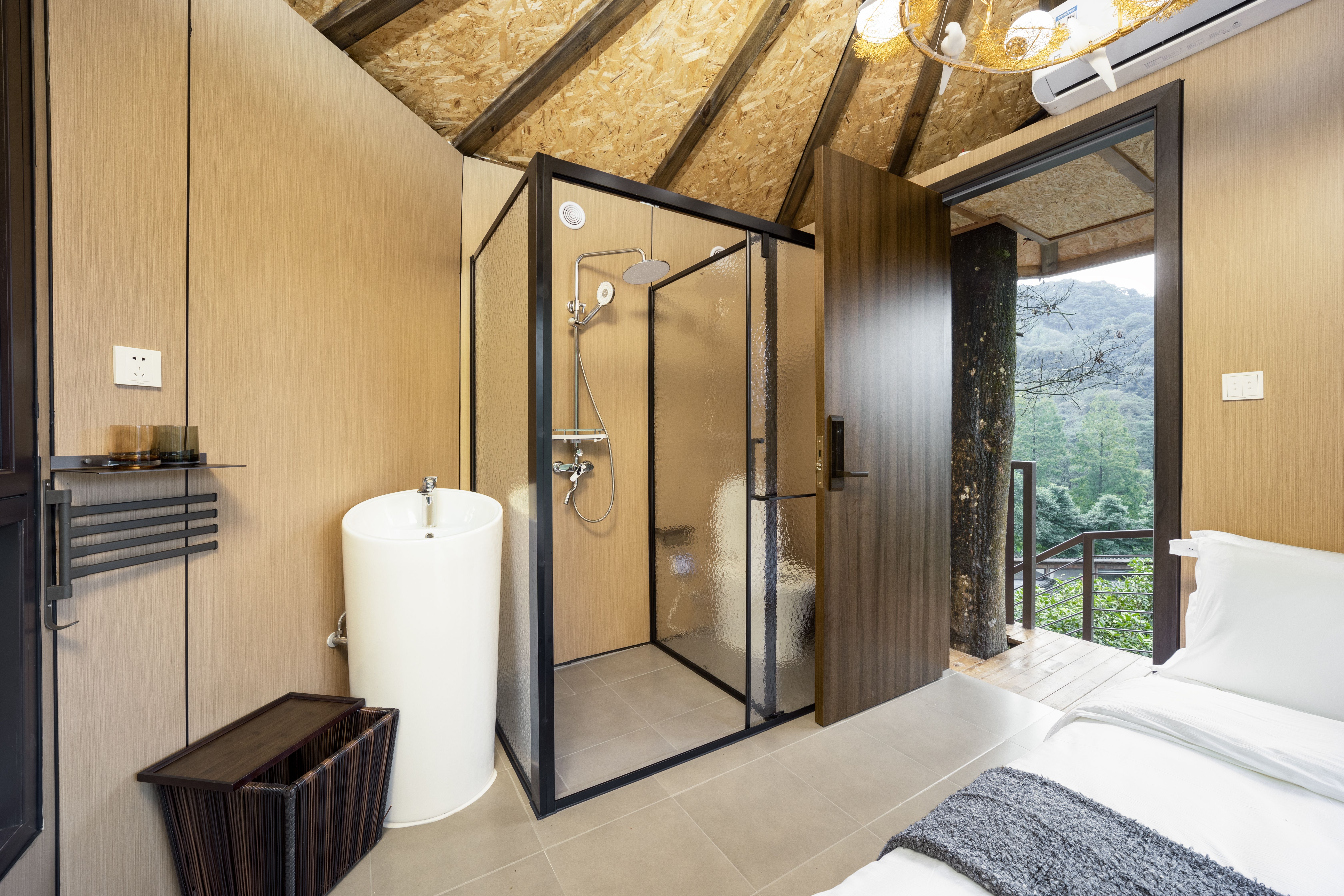 该民宿酒店客房规划有亲子房、大床房、阁楼、树屋,以满足游客的不同需求。房间的舒适性是设计考虑的内核,本案采用五恒空气系统,以保证山区中适宜的室内温度和湿度。房间内材质也回归自然,回归山野,就地取材。灯光设计上,更注重舒适性、引导性和温馨自然的感觉,为游客创造一个宜人的住宿环境。树屋,一种回归自然,与世无争的居住形态,把家安在山野之中,把生活引入密林深处,让人与自然和谐共生,倾听大自然的声音创造一种室外桃源般的恬静生活。树屋的设计,是对大自然的深深敬畏与融入。
