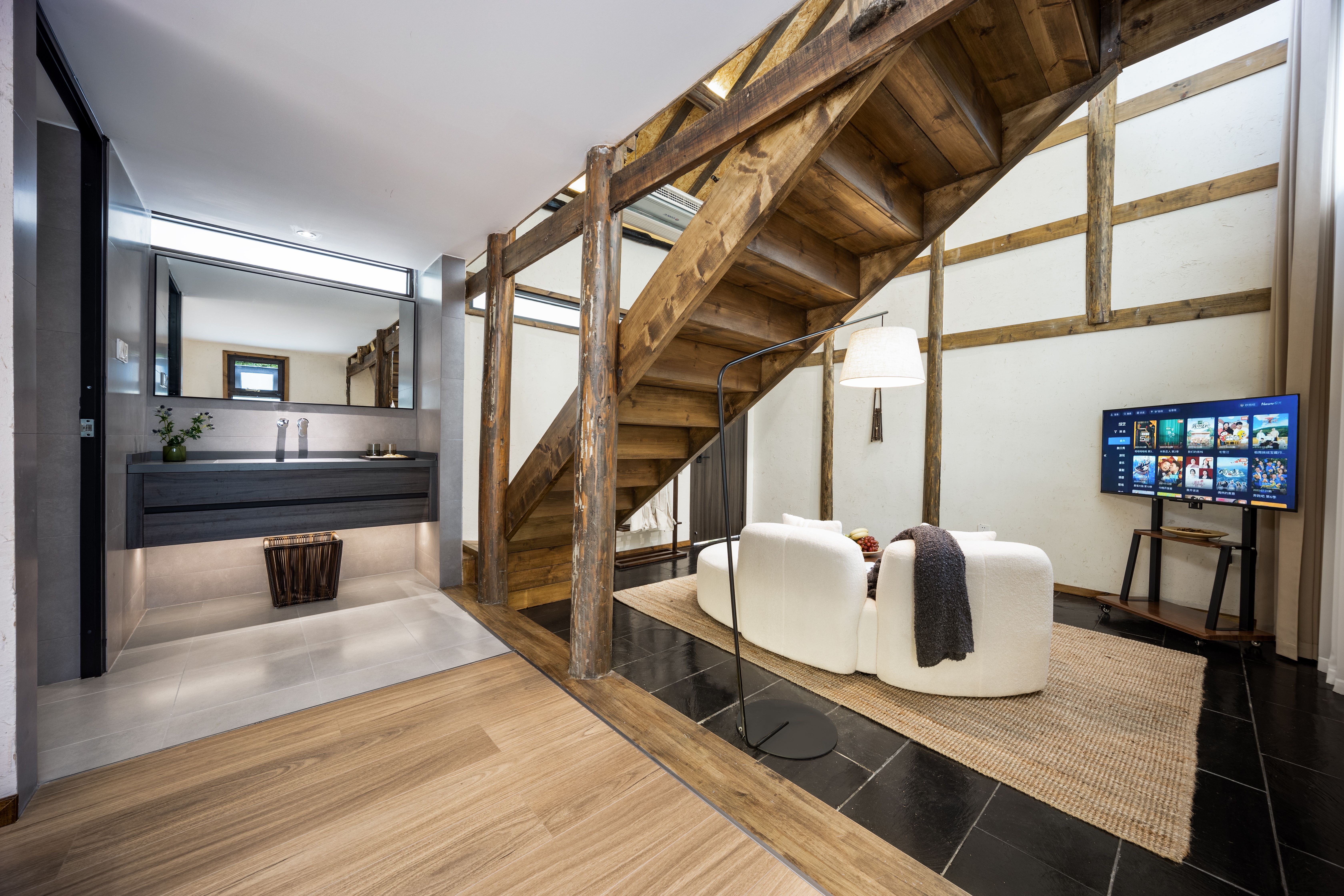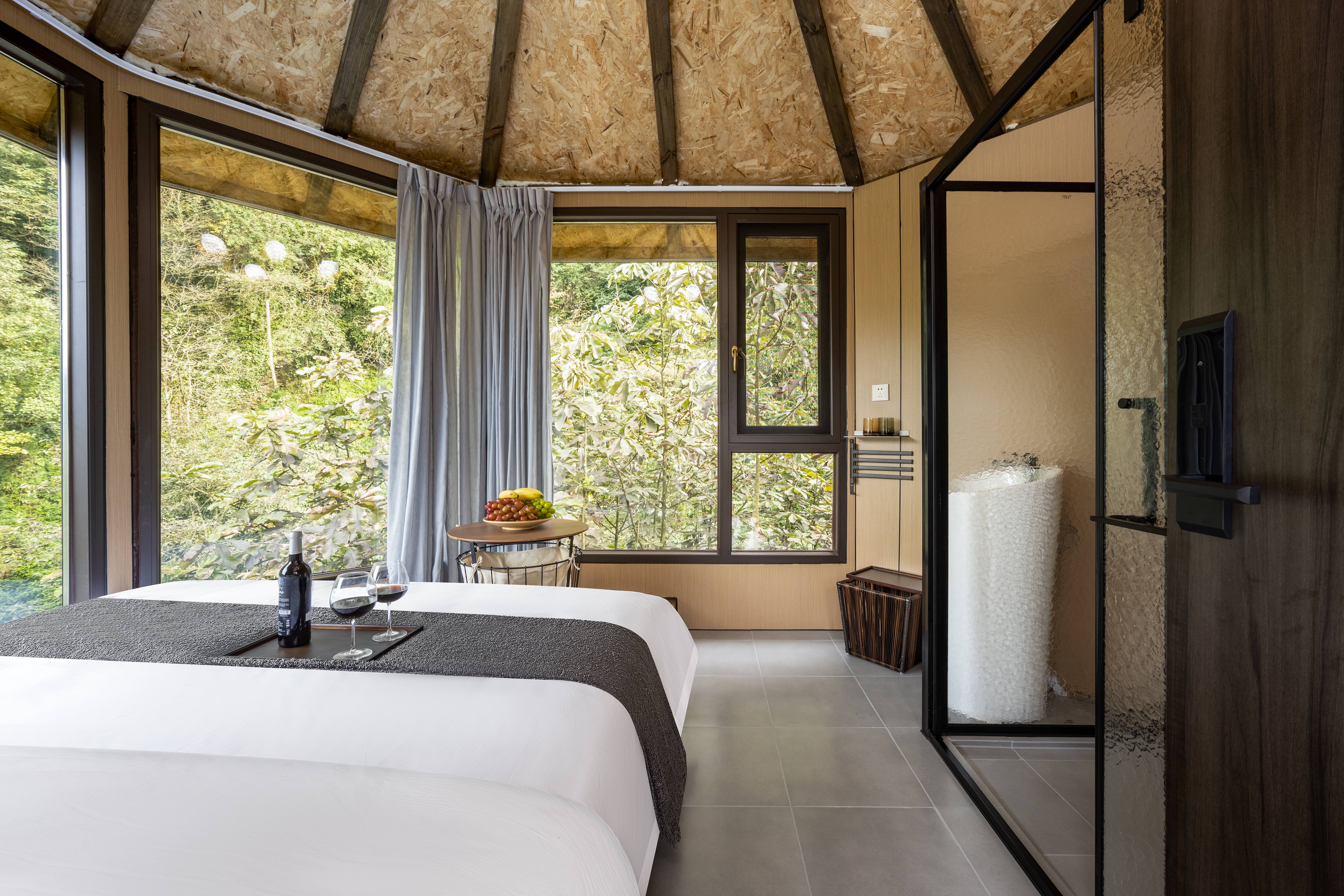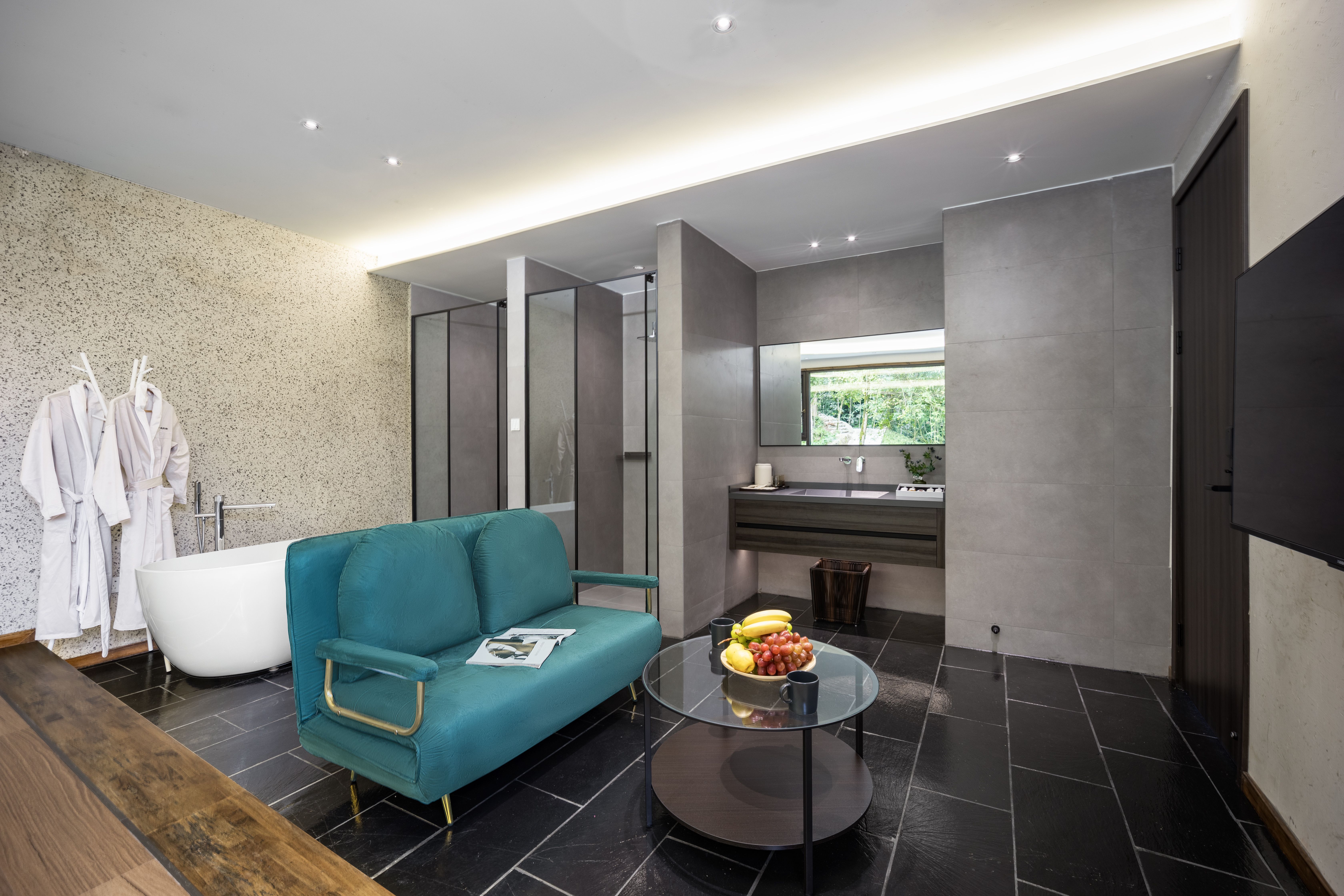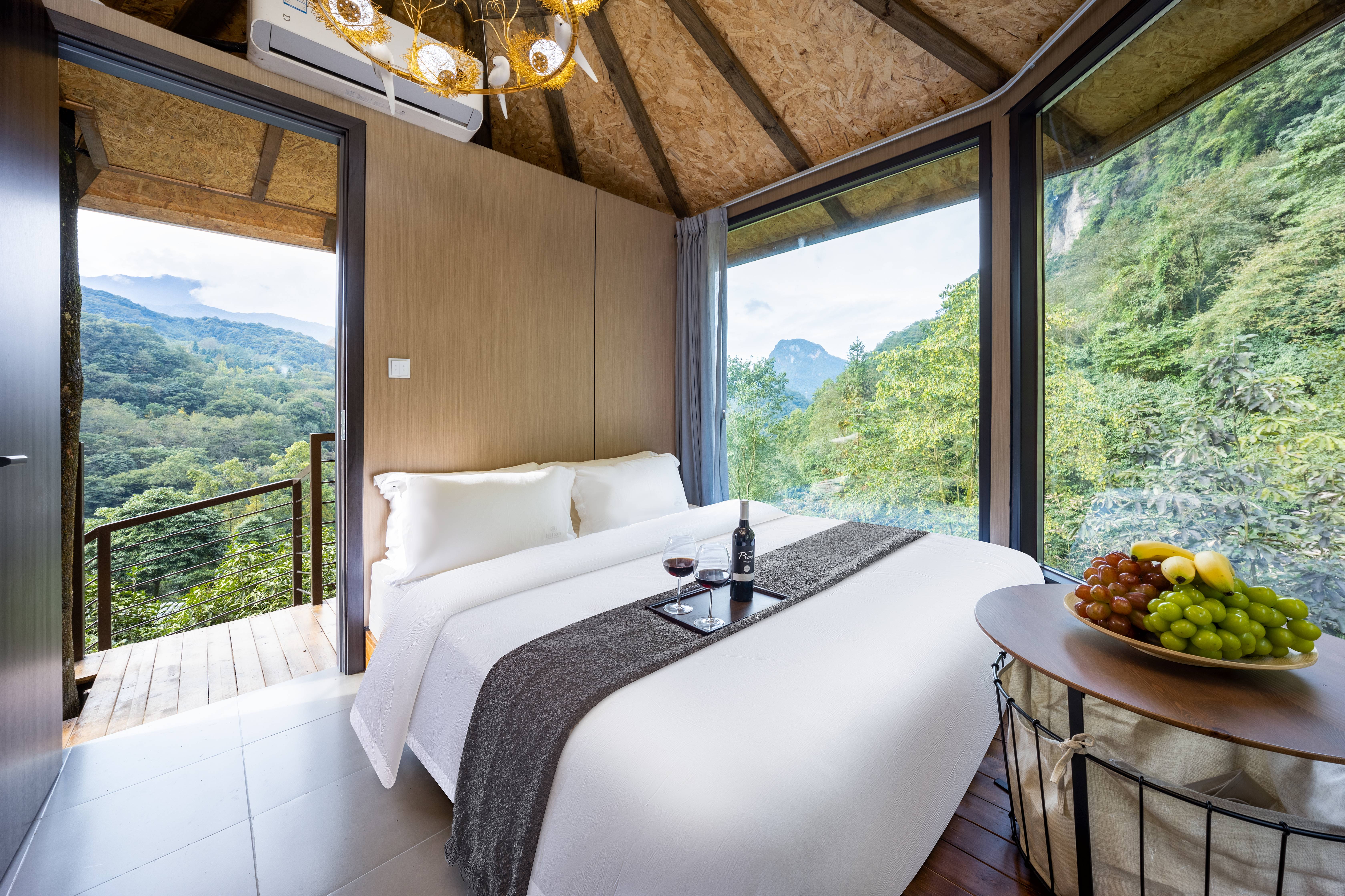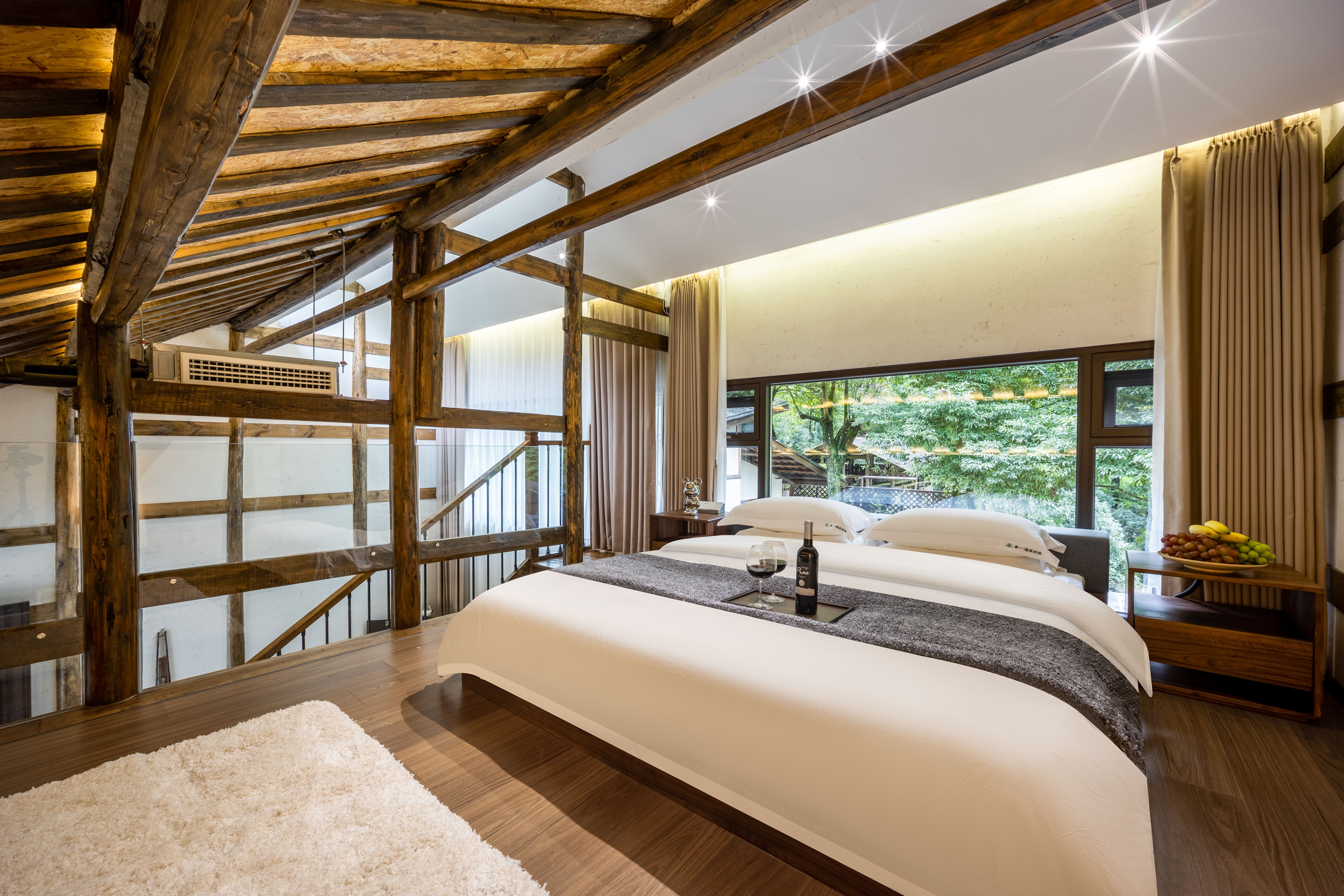 该民宿酒店客房规划有亲子房、大床房、阁楼、树屋,以满足游客的不同需求。房间的舒适性是设计考虑的内核,本案采用五恒空气系统,以保证山区中适宜的室内温度和湿度。房间内材质也回归自然,回归山野,就地取材。灯光设计上,更注重舒适性、引导性和温馨自然的感觉,为游客创造一个宜人的住宿环境。树屋,一种回归自然,与世无争的居住形态,把家安在山野之中,把生活引入密林深处,让人与自然和谐共生,倾听大自然的声音创造一种室外桃源般的恬静生活。树屋的设计,是对大自然的深深敬畏与融入。