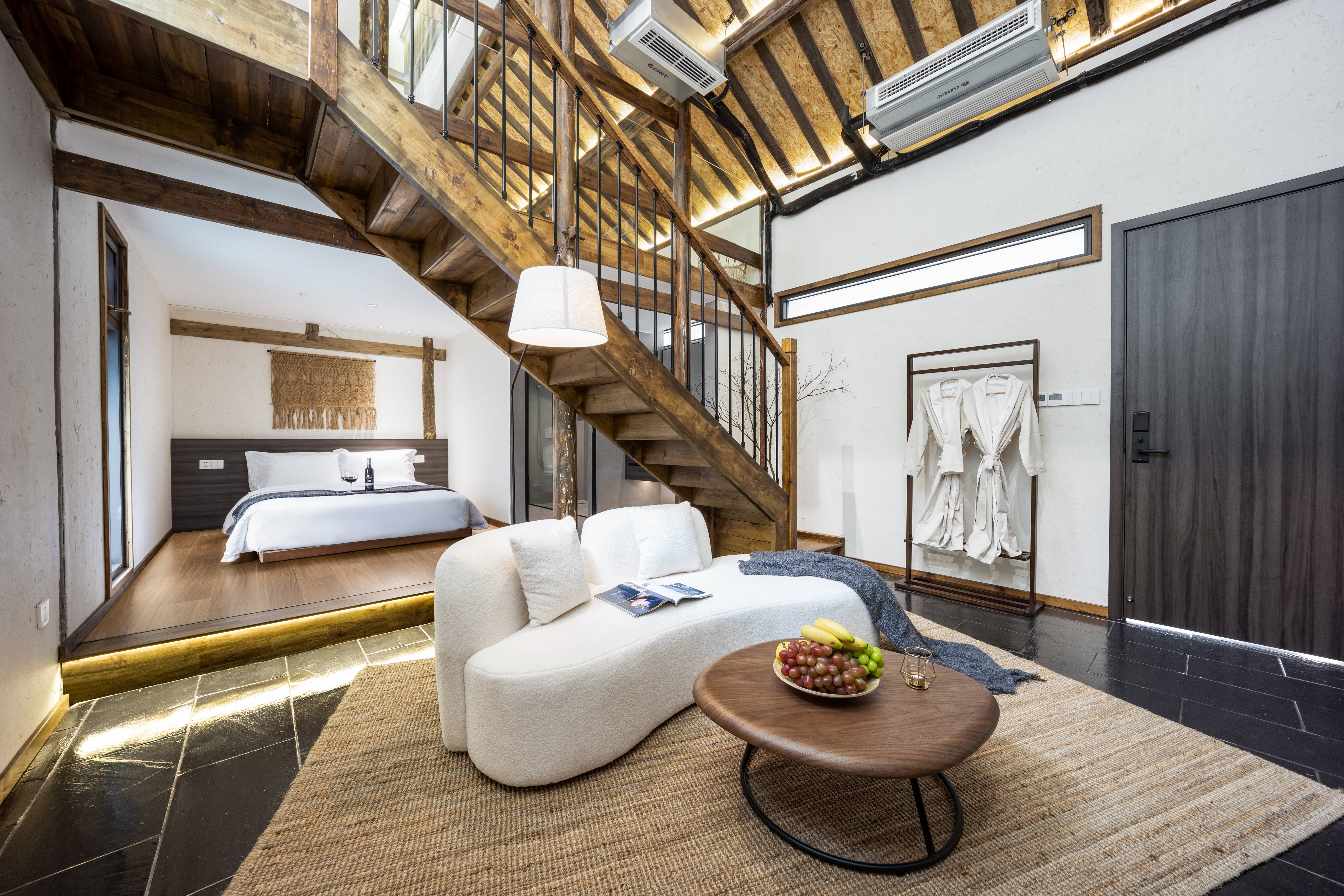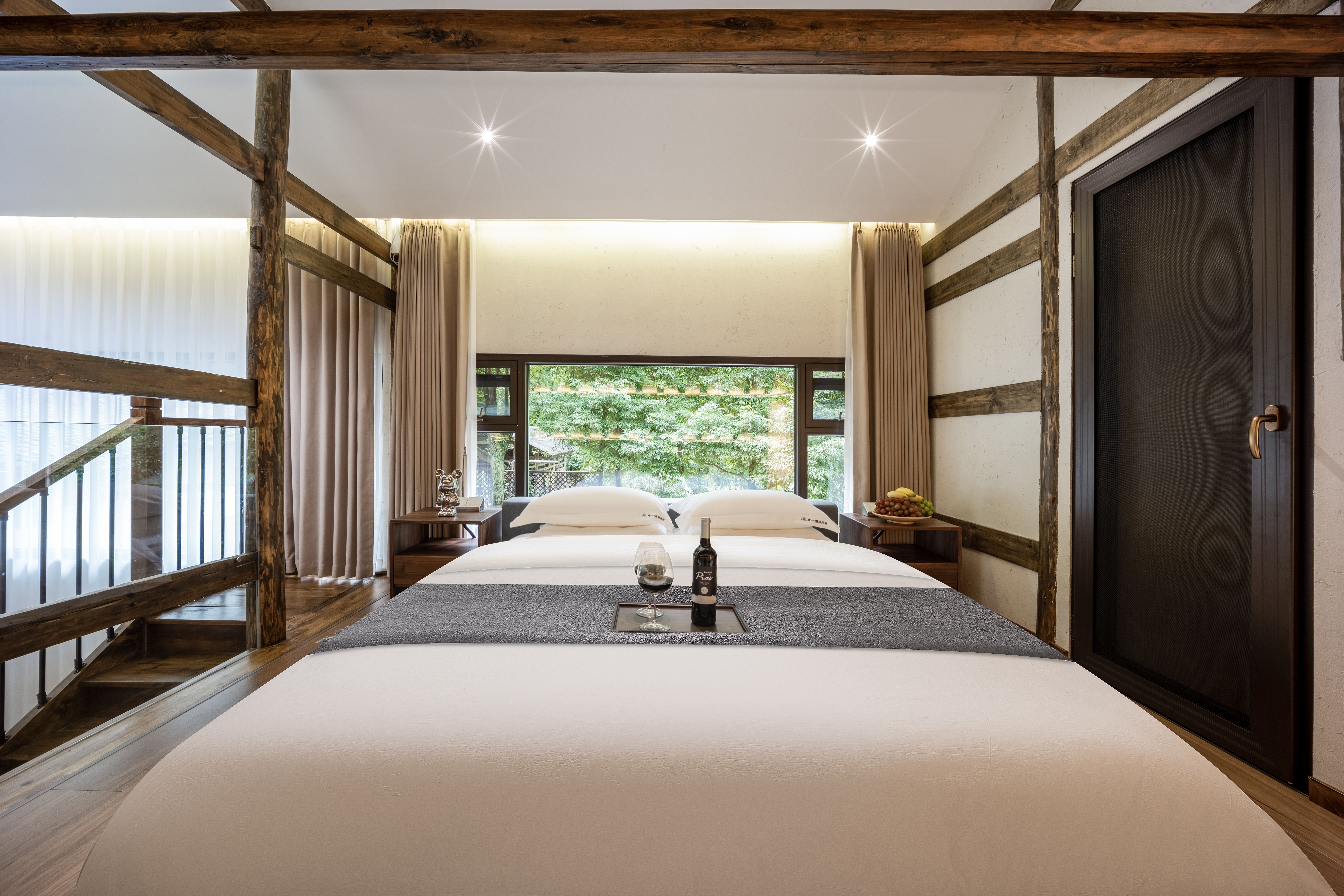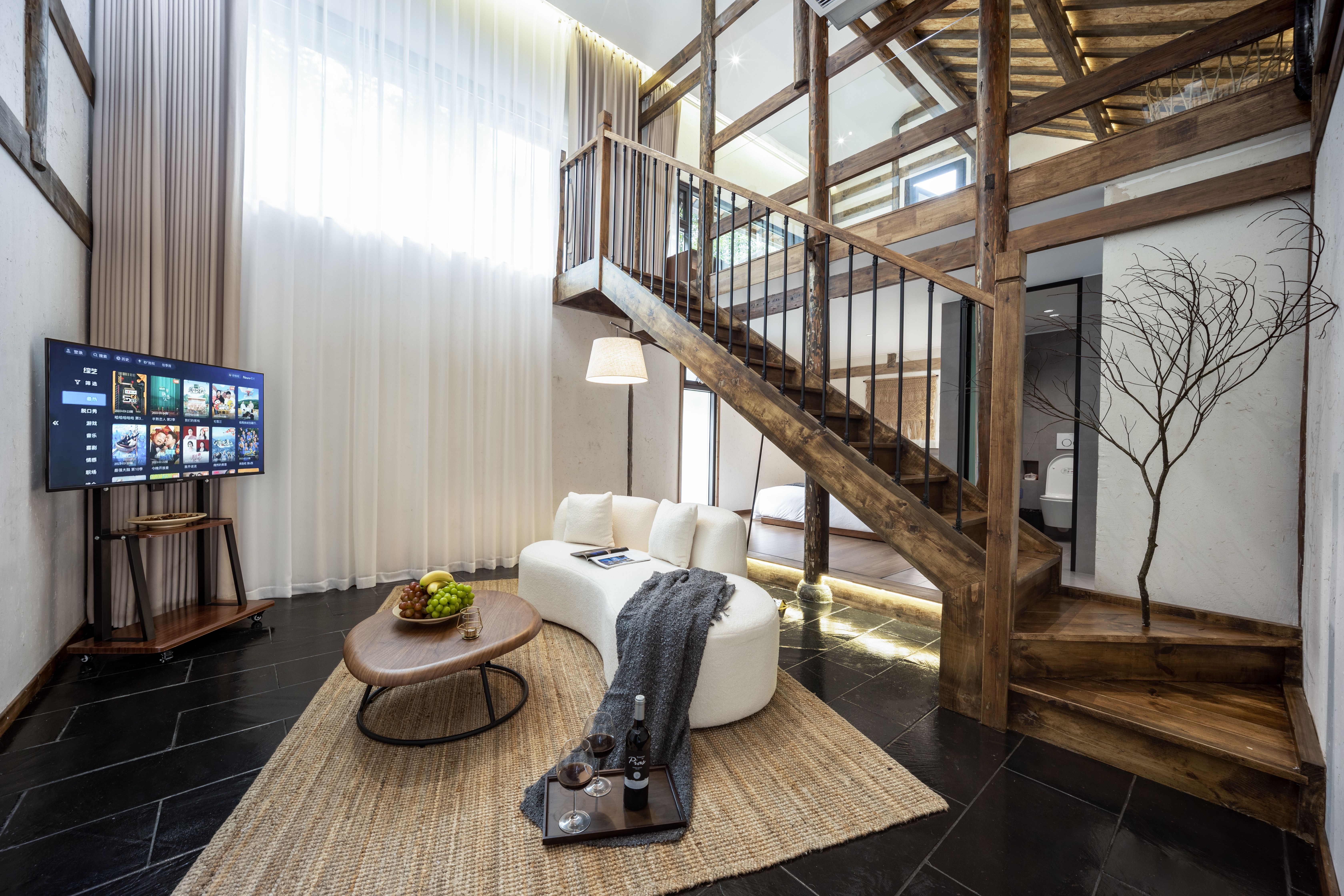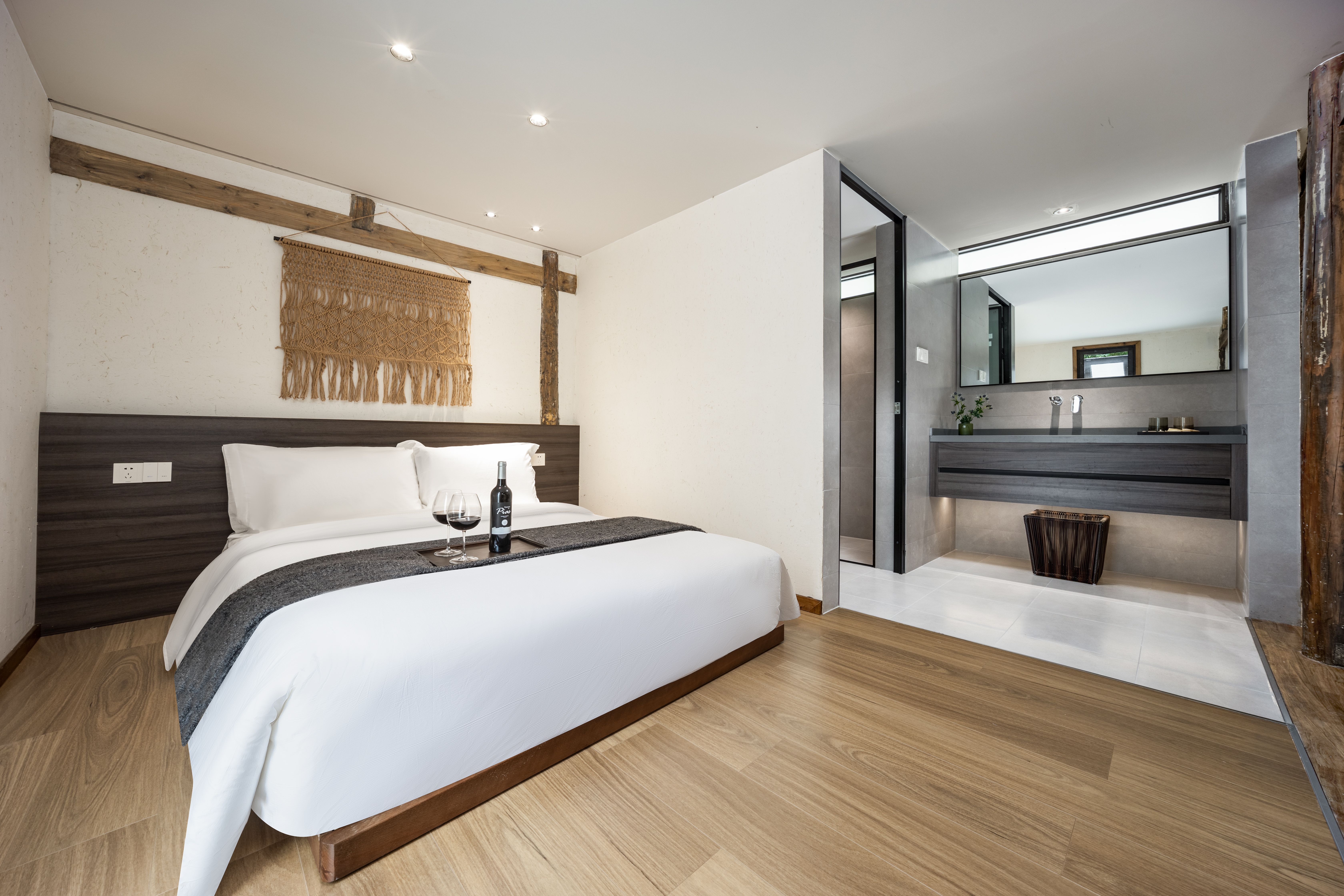 在装修材质上,使用老木头和青石板等天然材料,保留其原始风味。做旧涂料中选用稻谷壳材料元素,以体现本土特色。整体设计多采用亚麻元素,给人一种自然、温馨的感觉。在传统文化方面,在设计中融入非遗竹编、锦绣、长嘴茶壶等元素,让游客在度假放松心灵的同时也能感受传统文化的魅力。在房间布置上放置一些当地的文化特色装饰品或手工艺品,如:挂毯、干枝、陶瓷、挂画来凸显空间的韵味与设计感。
