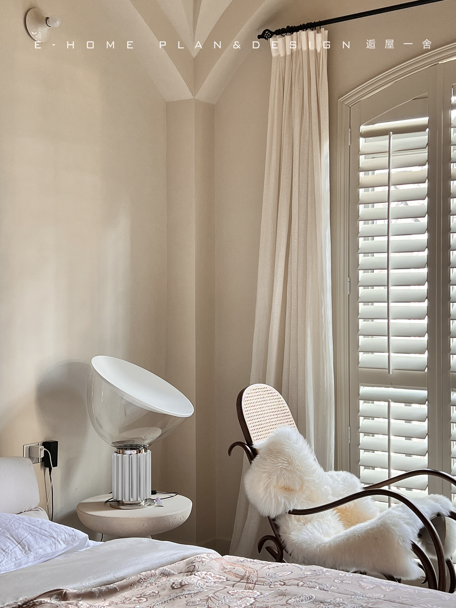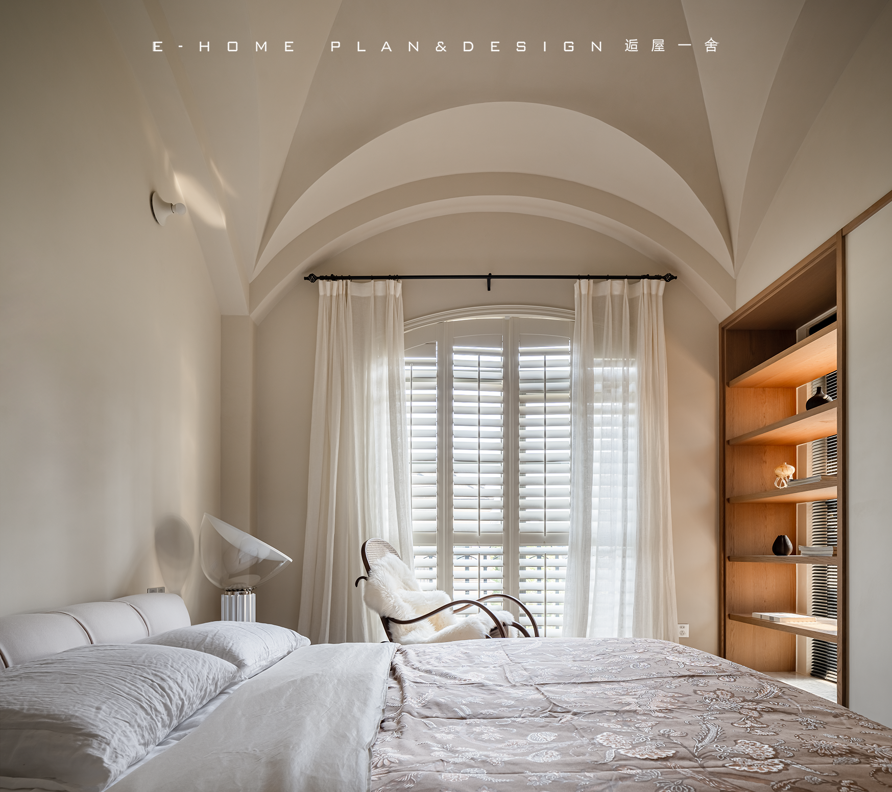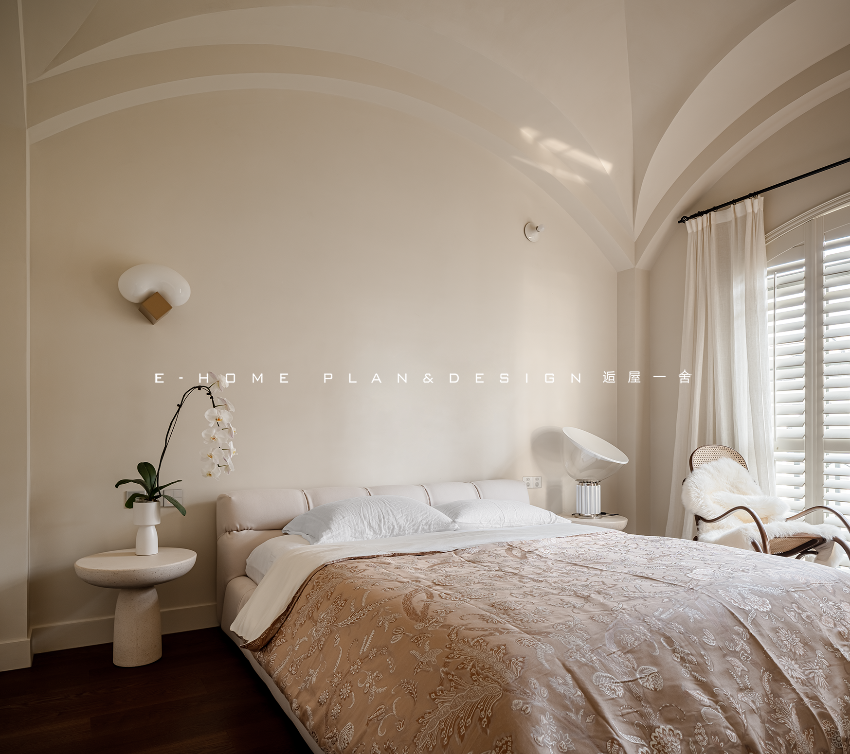 一个相当有戏剧观感的卧室,交叠的穹顶,使元素简单勾勒的卧室有了丰富的层次,薄雾气息的大地色,带来蒙太奇般的遐想。