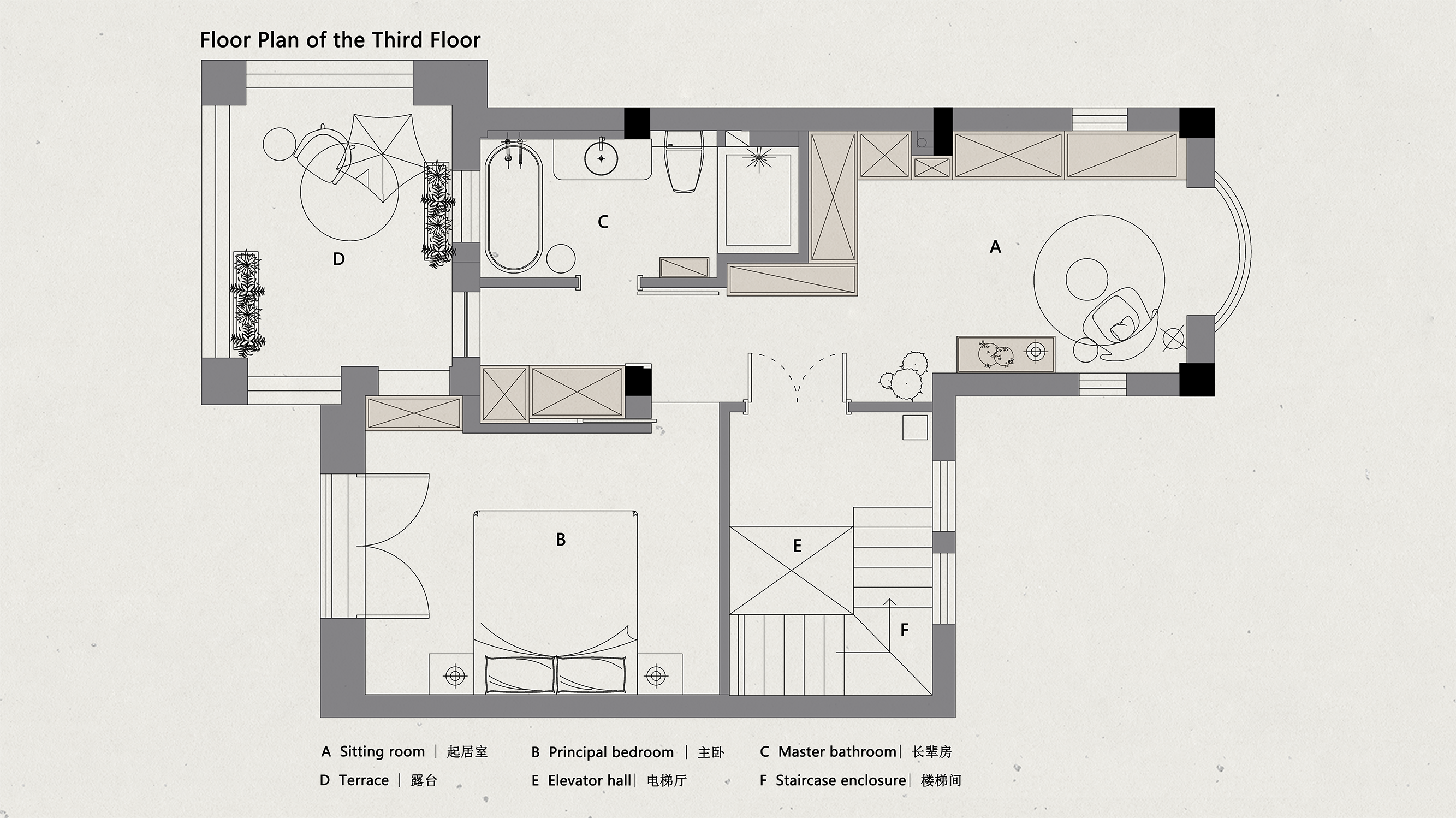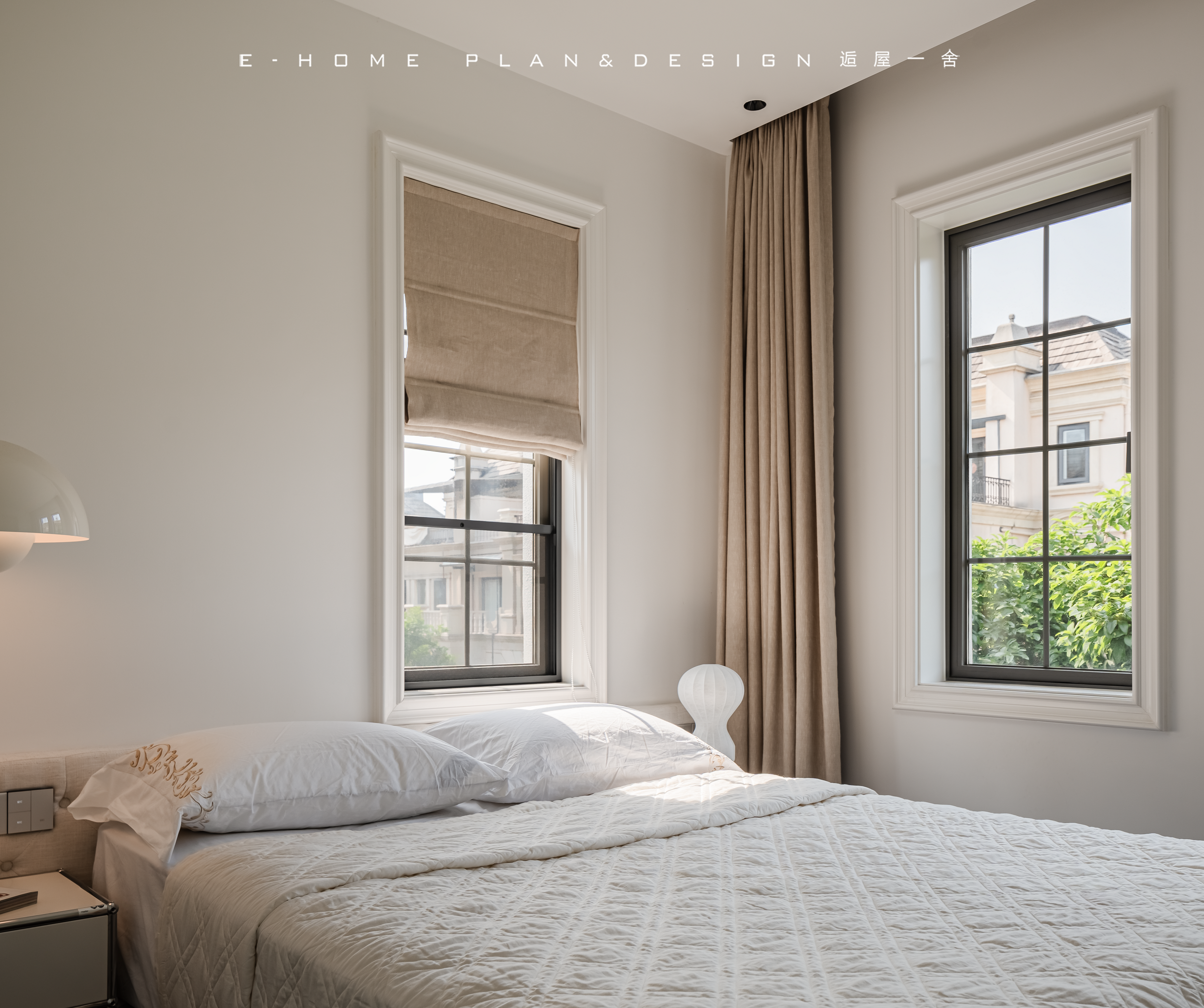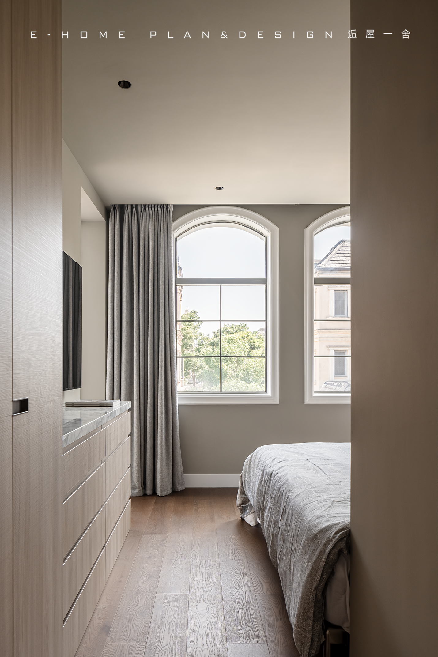 一个相当有戏剧观感的卧室,交叠的穹顶,使元素简单勾勒的卧室有了丰富的层次,薄雾气息的大地色,带来蒙太奇般的遐想。