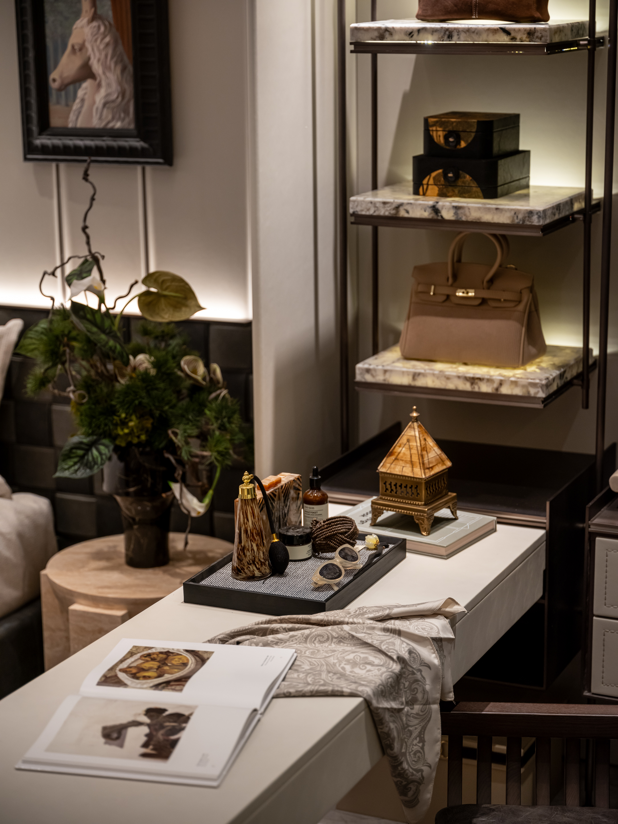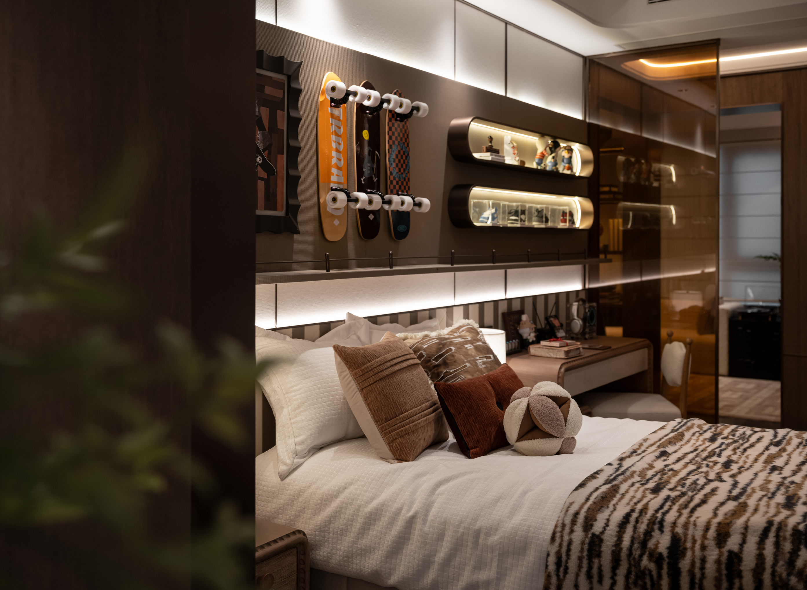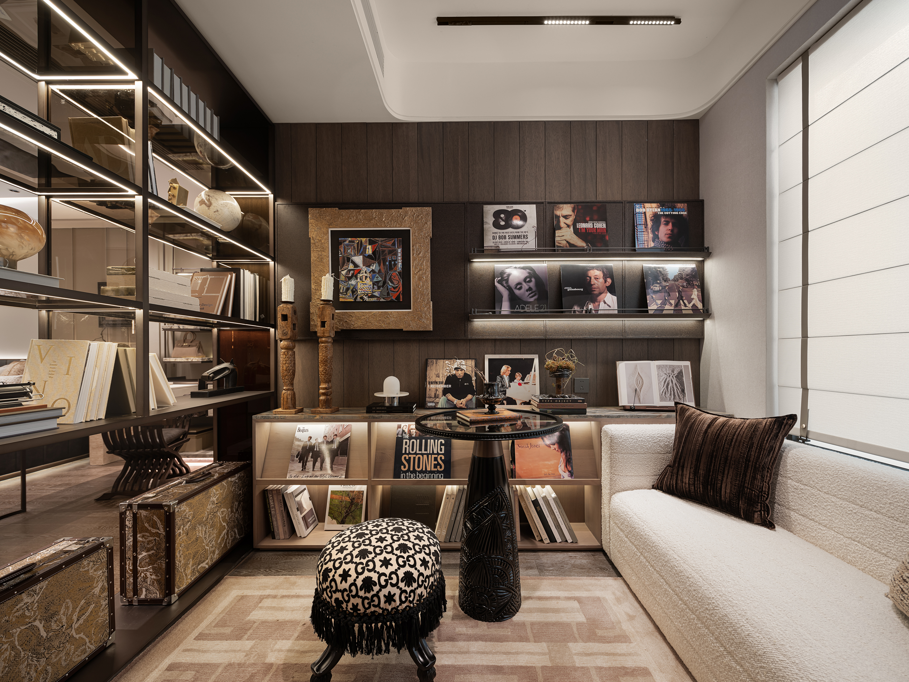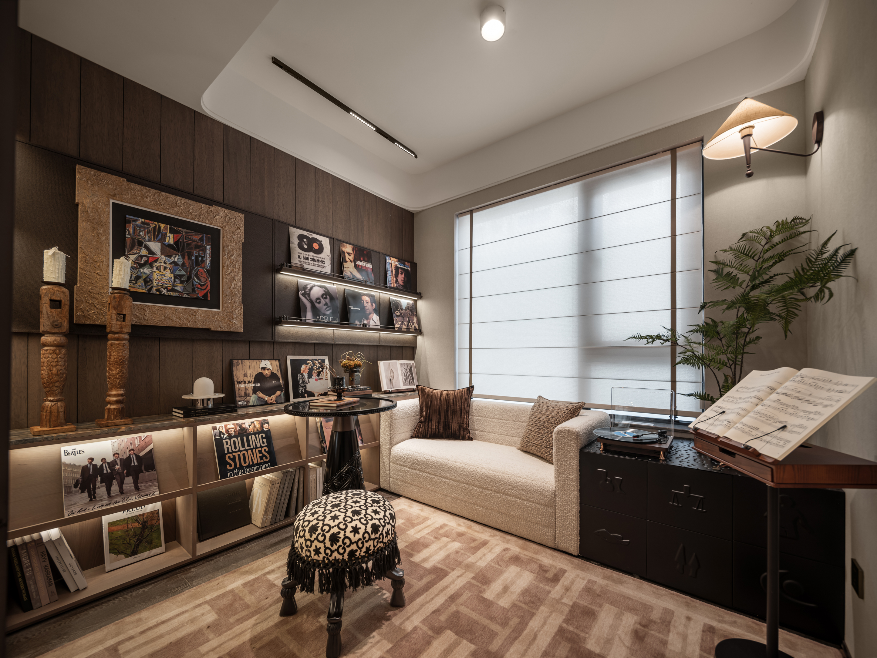 设计选材:为了契合中古风的氛围,在材质上选用了丝绒、麂皮,暗纹提花等精致又带有厚重质感的面料,不仅如此,通过近十种不同的木饰面,来点题中古的那种混搭、精致的调性