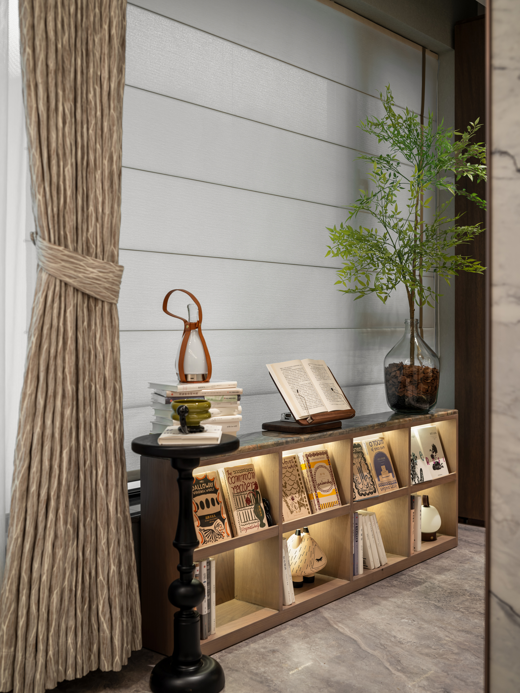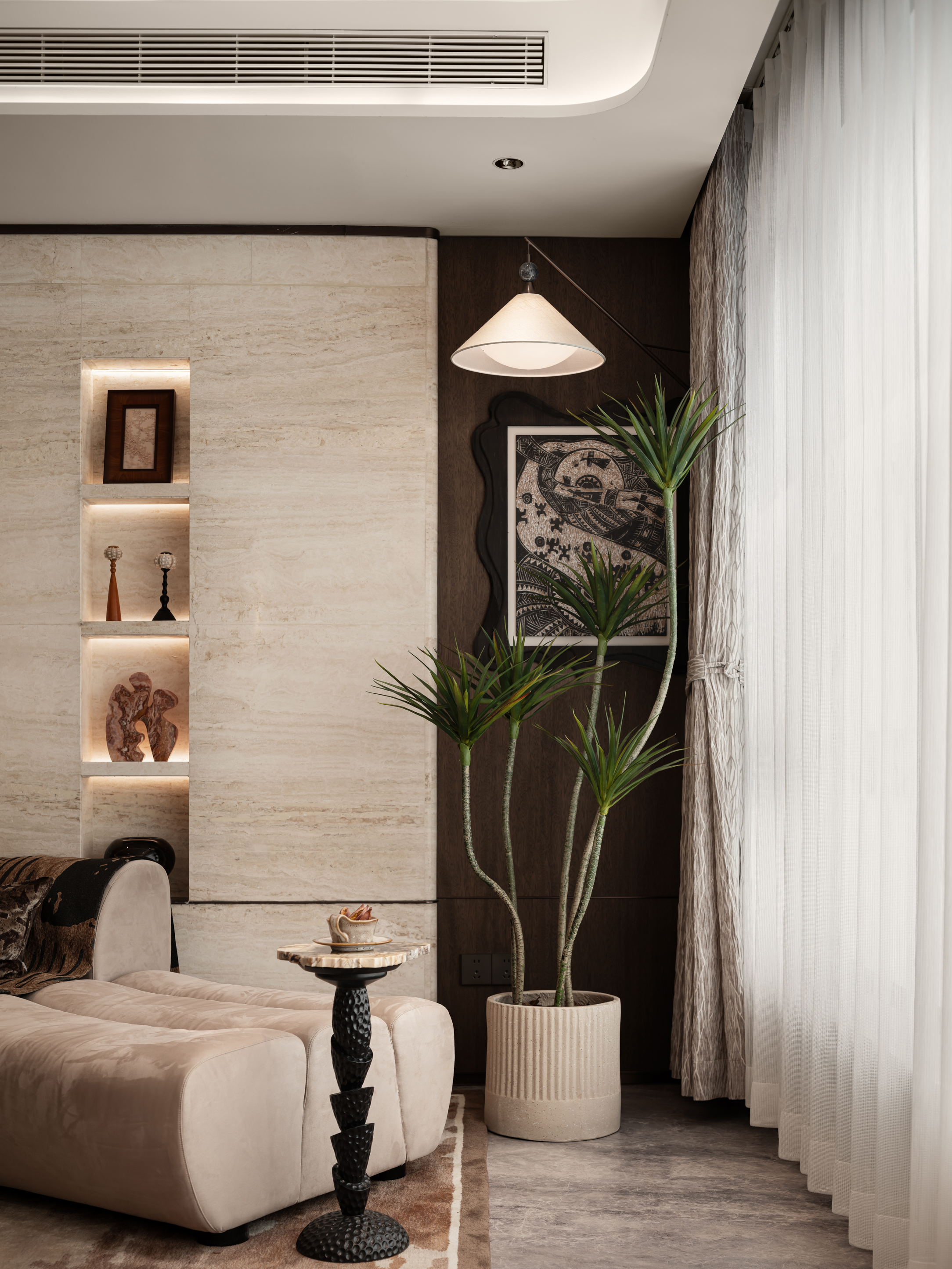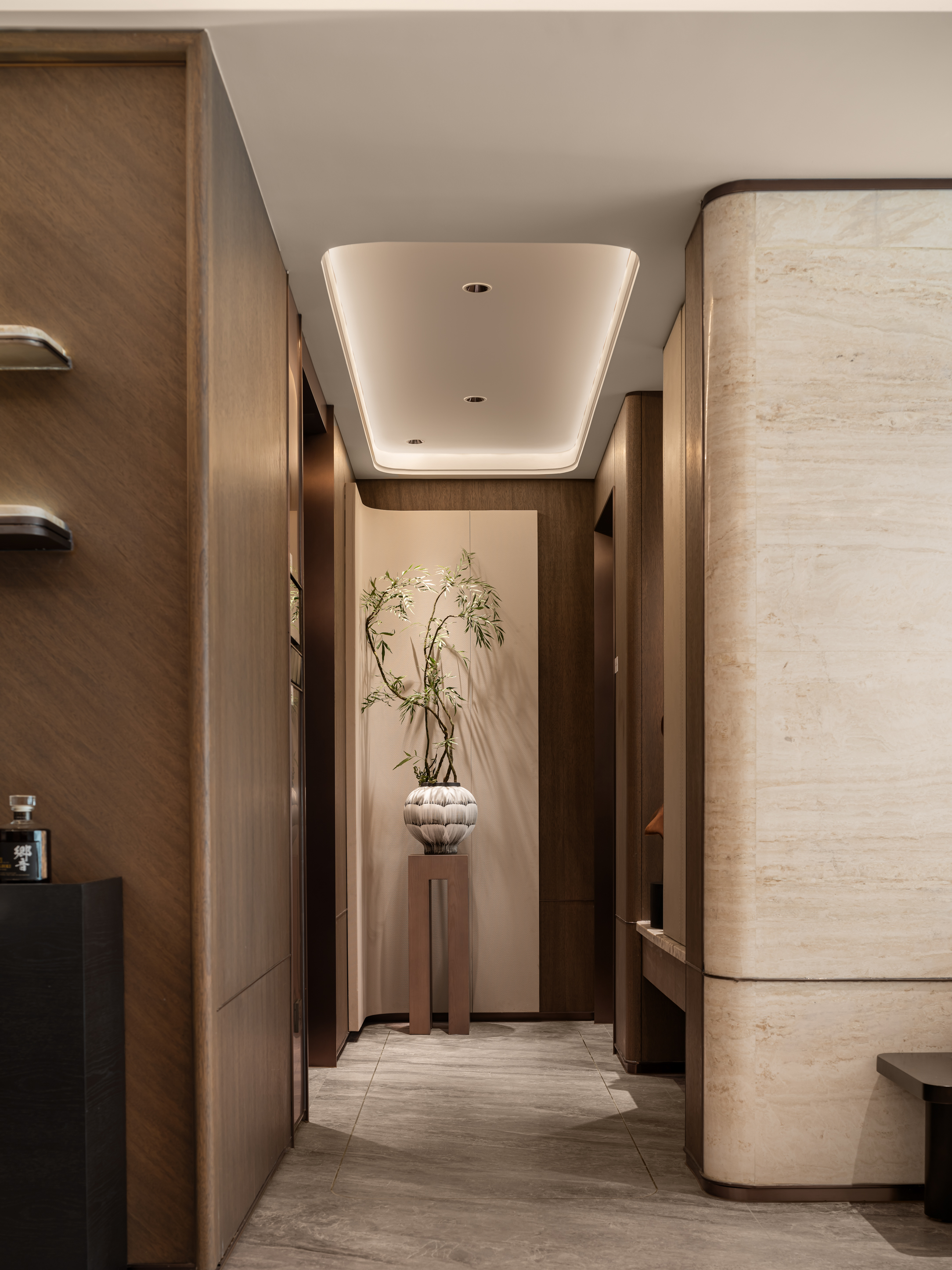 空间意境:该室内空间的设计风格是“新自然主义”的诗意栖居。它融合了自然元素的纯净与质朴,以木材、石材等天然材质为基调,搭配温暖而柔和的自然色调,营造出一种仿佛置身于大自然怀抱中的温馨与宁静。空间中巧妙地穿插着绿植与花卉,它们不仅是装饰,更是连接室内与外界的桥梁,让清新的空气与生机盎然的绿意流淌于每个角落。